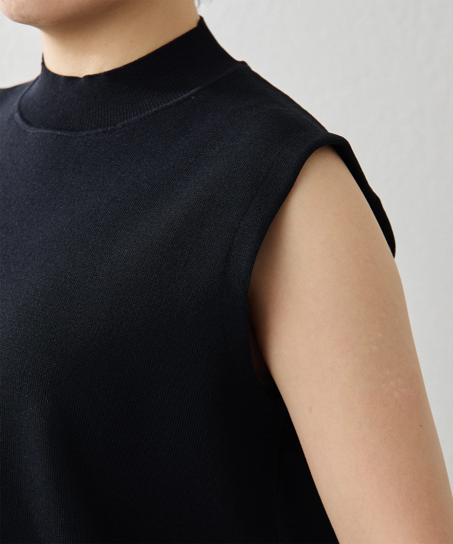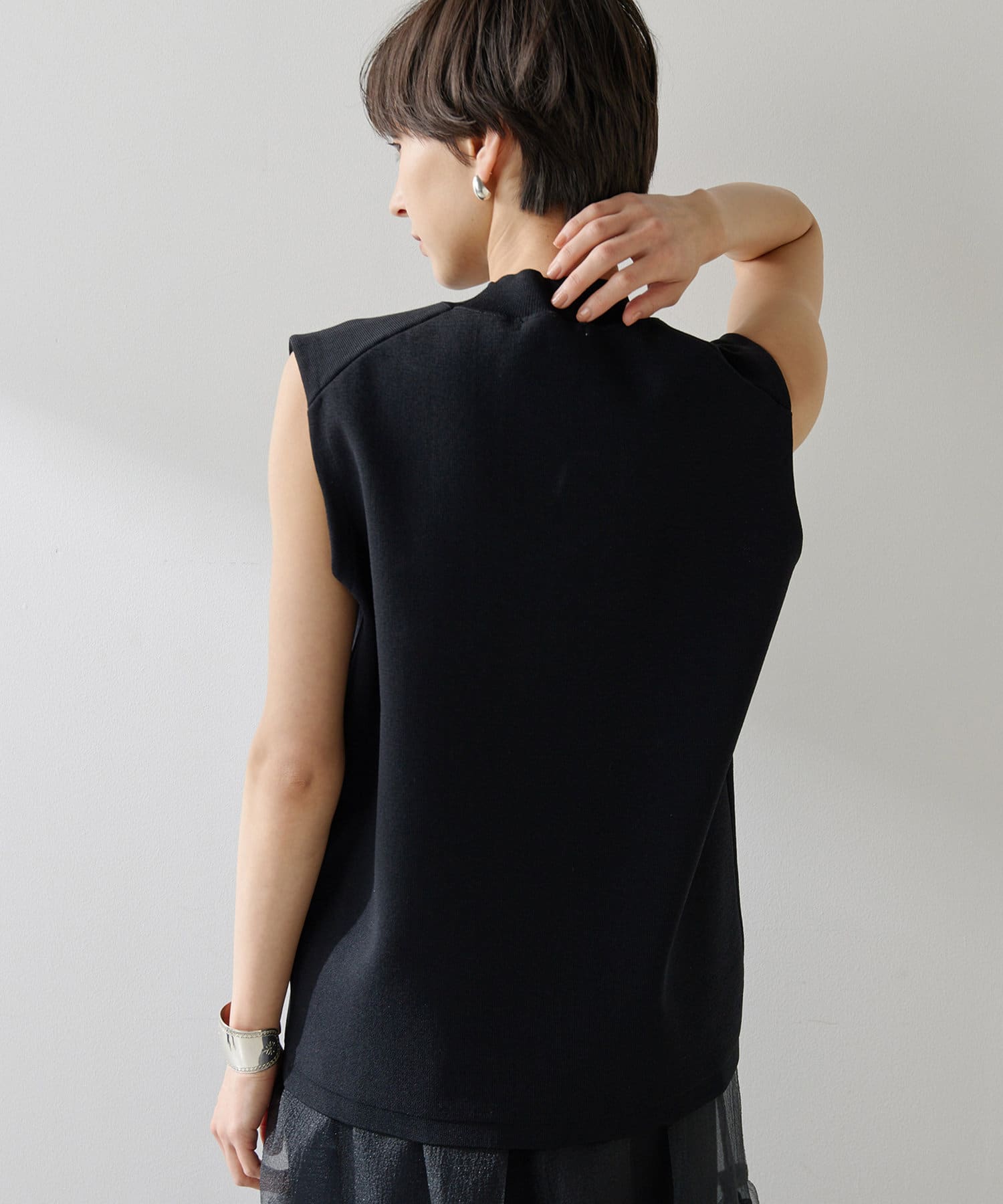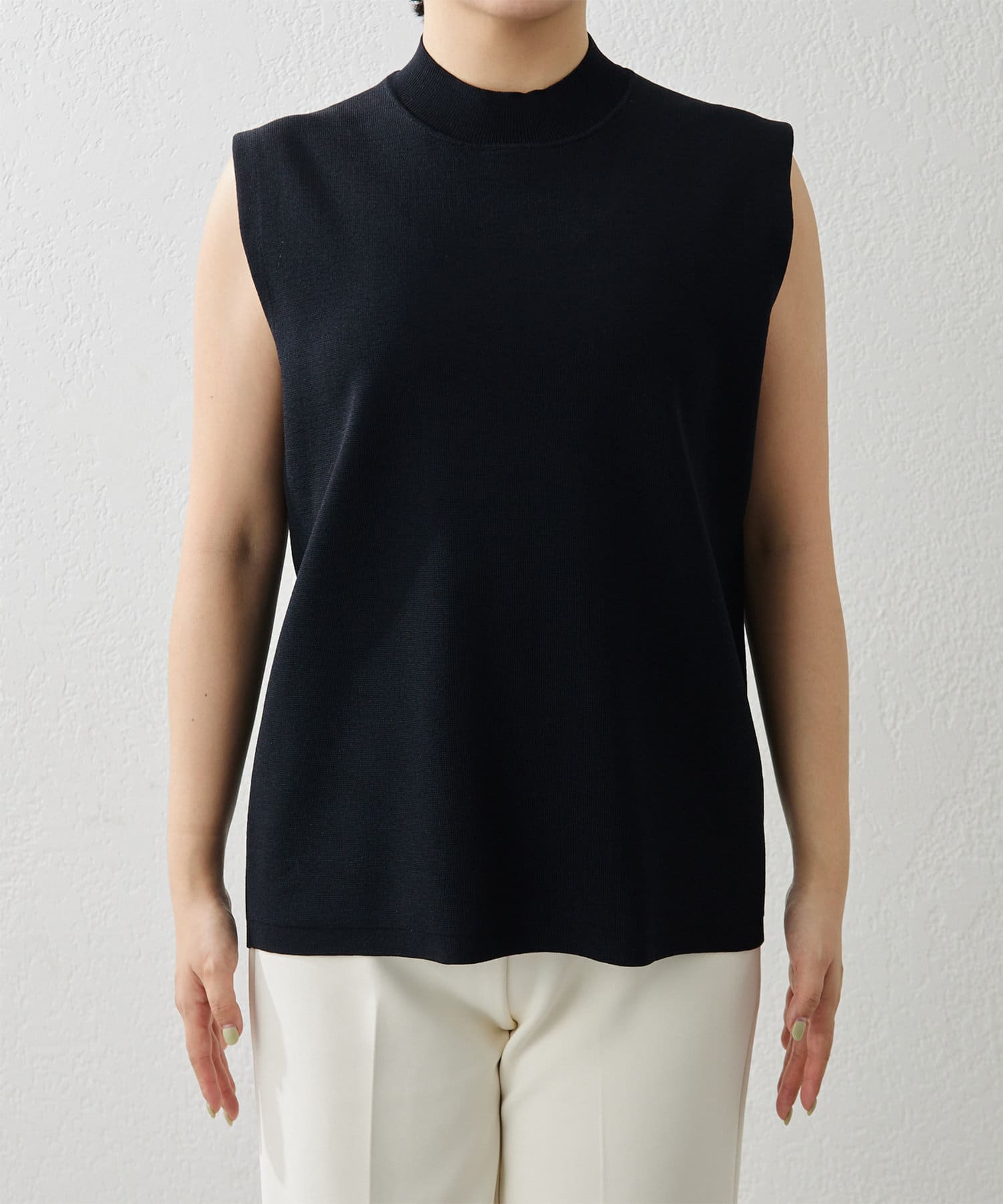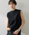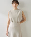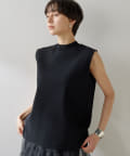 ■肩先の隠れるボックスシルエットがリラクシーなノースリーブニット。