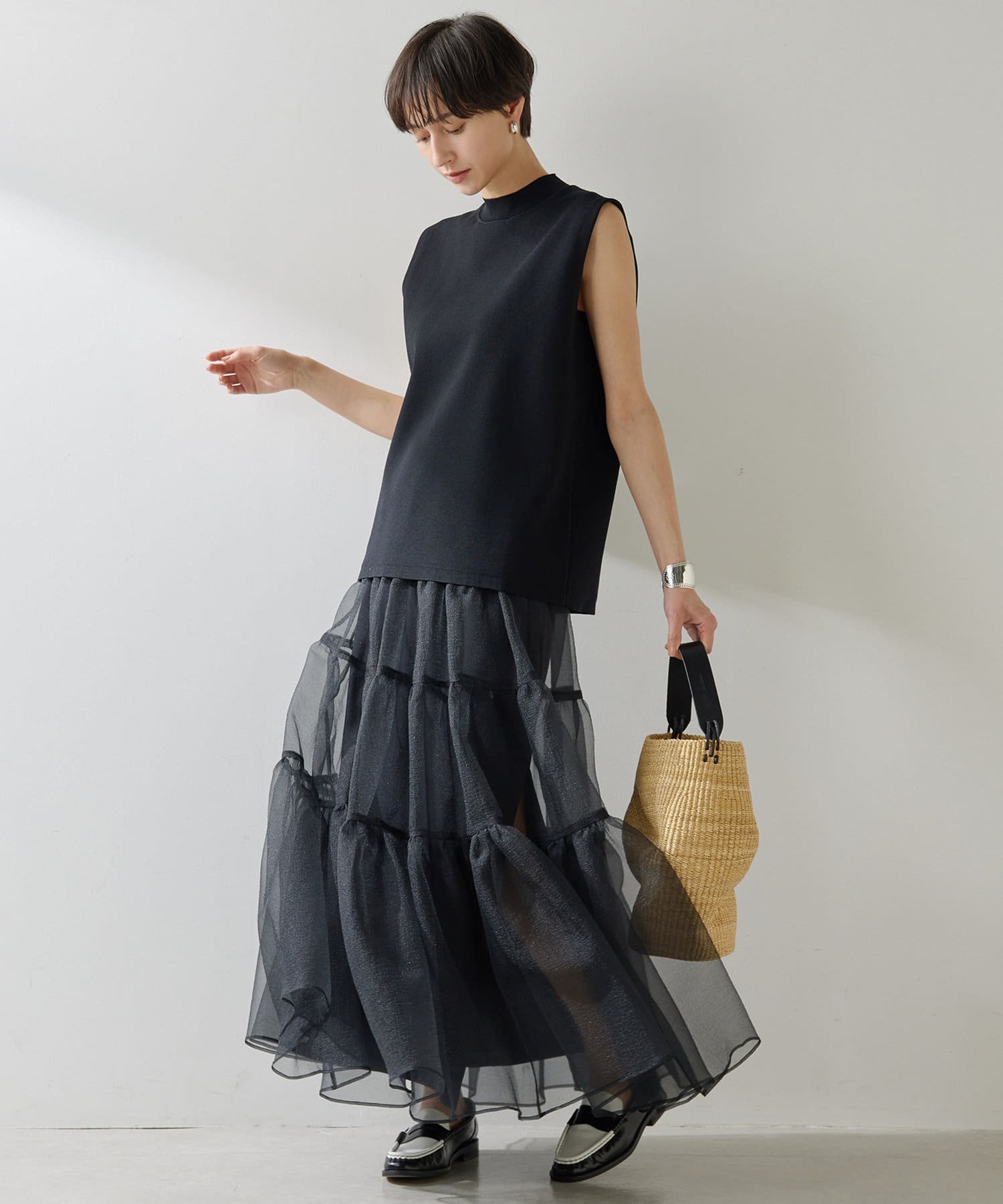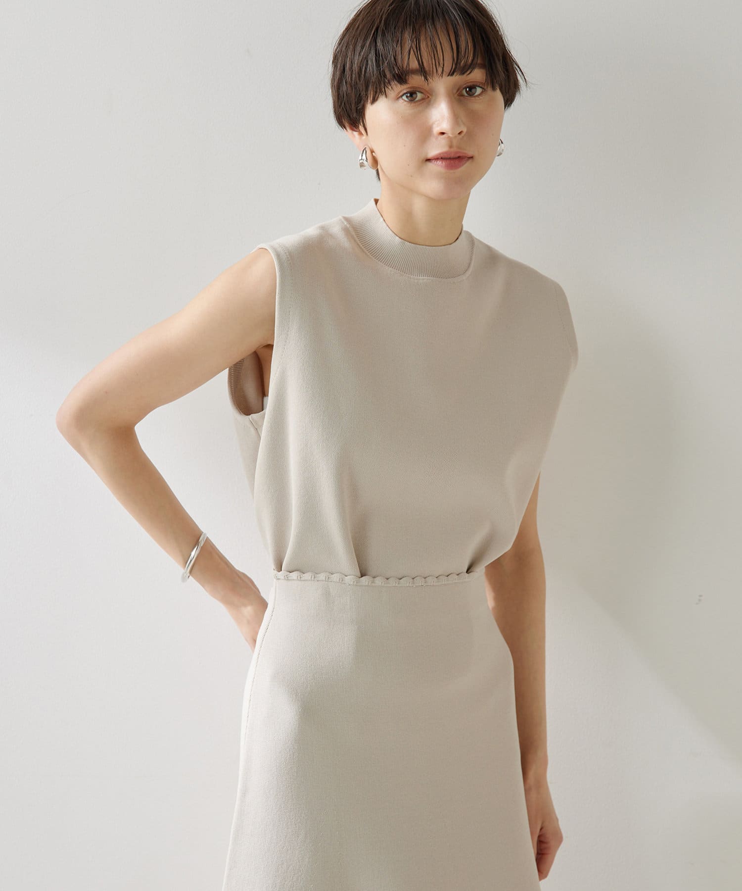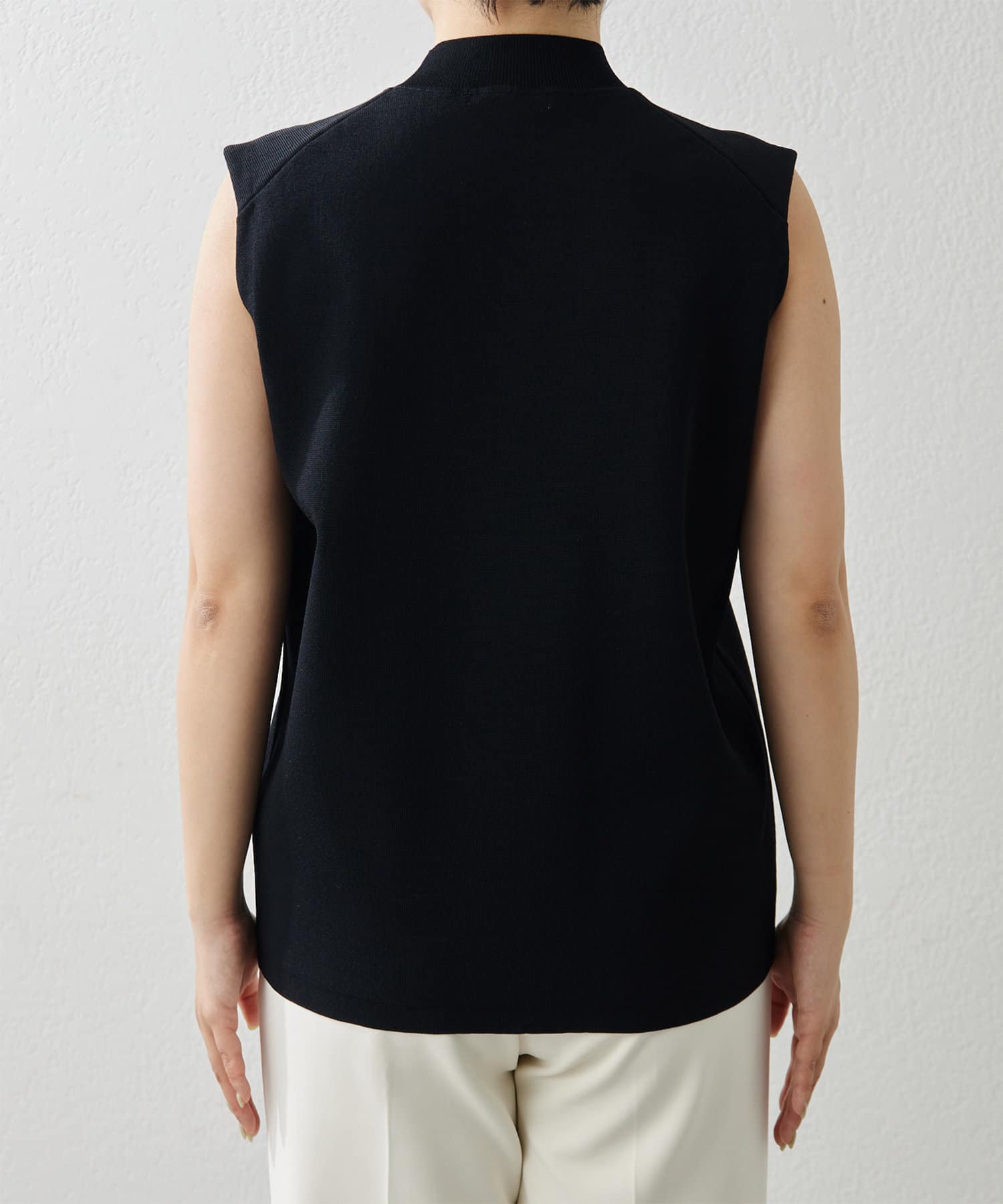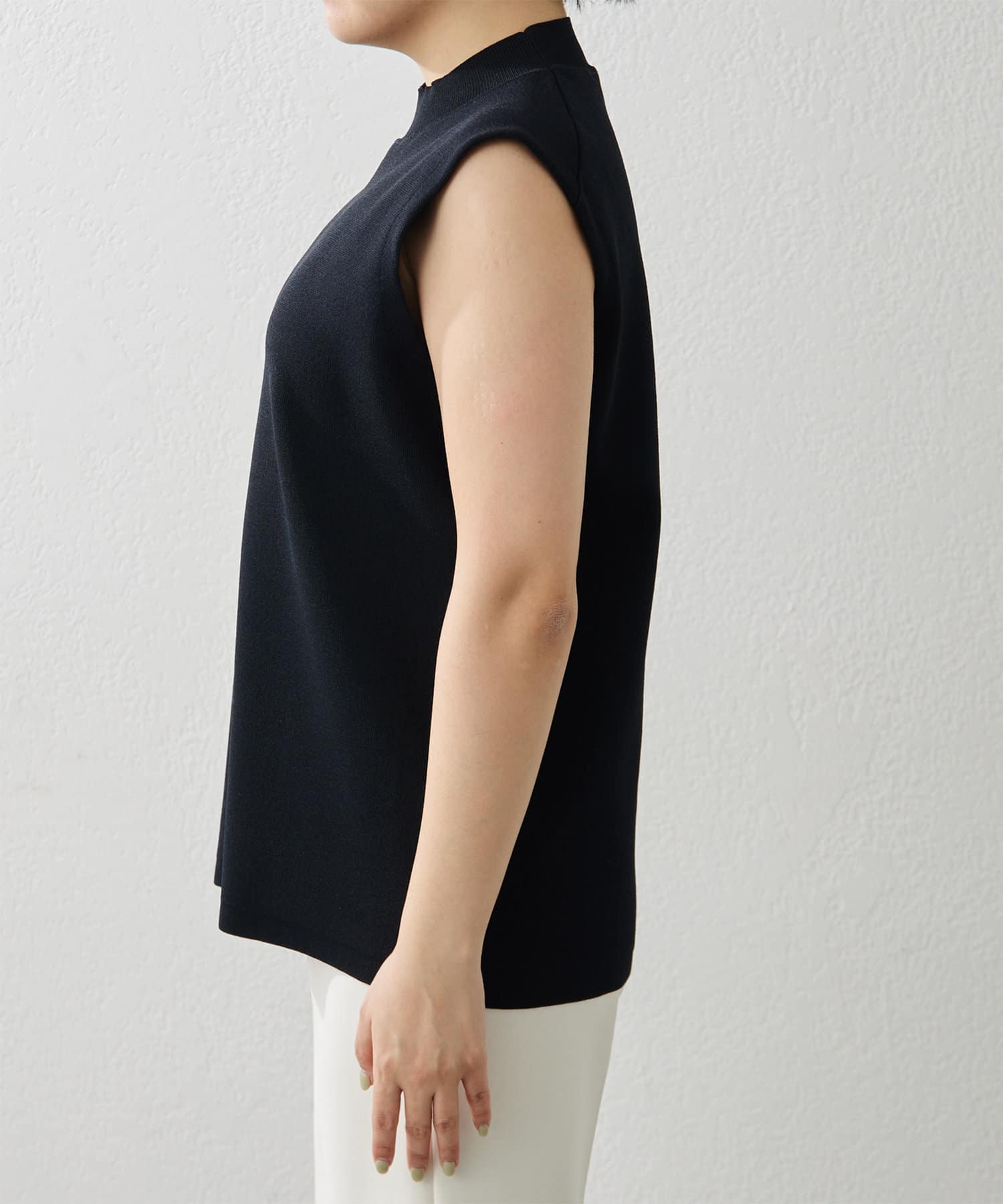■肩先の隠れるボックスシルエットがリラクシーなノースリーブニット。