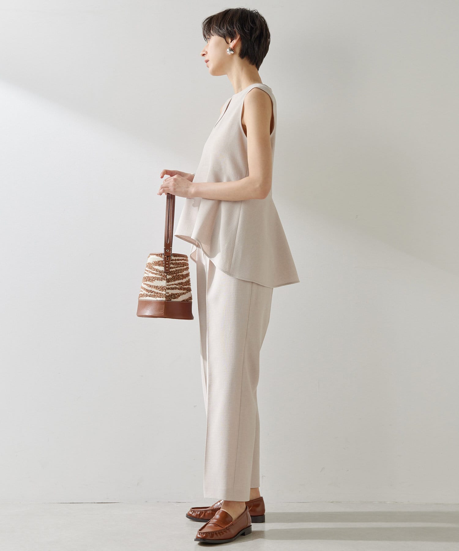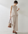 ■同素材のスカートやパンツとのセットアップスタイルを楽しむのもおすすめ。