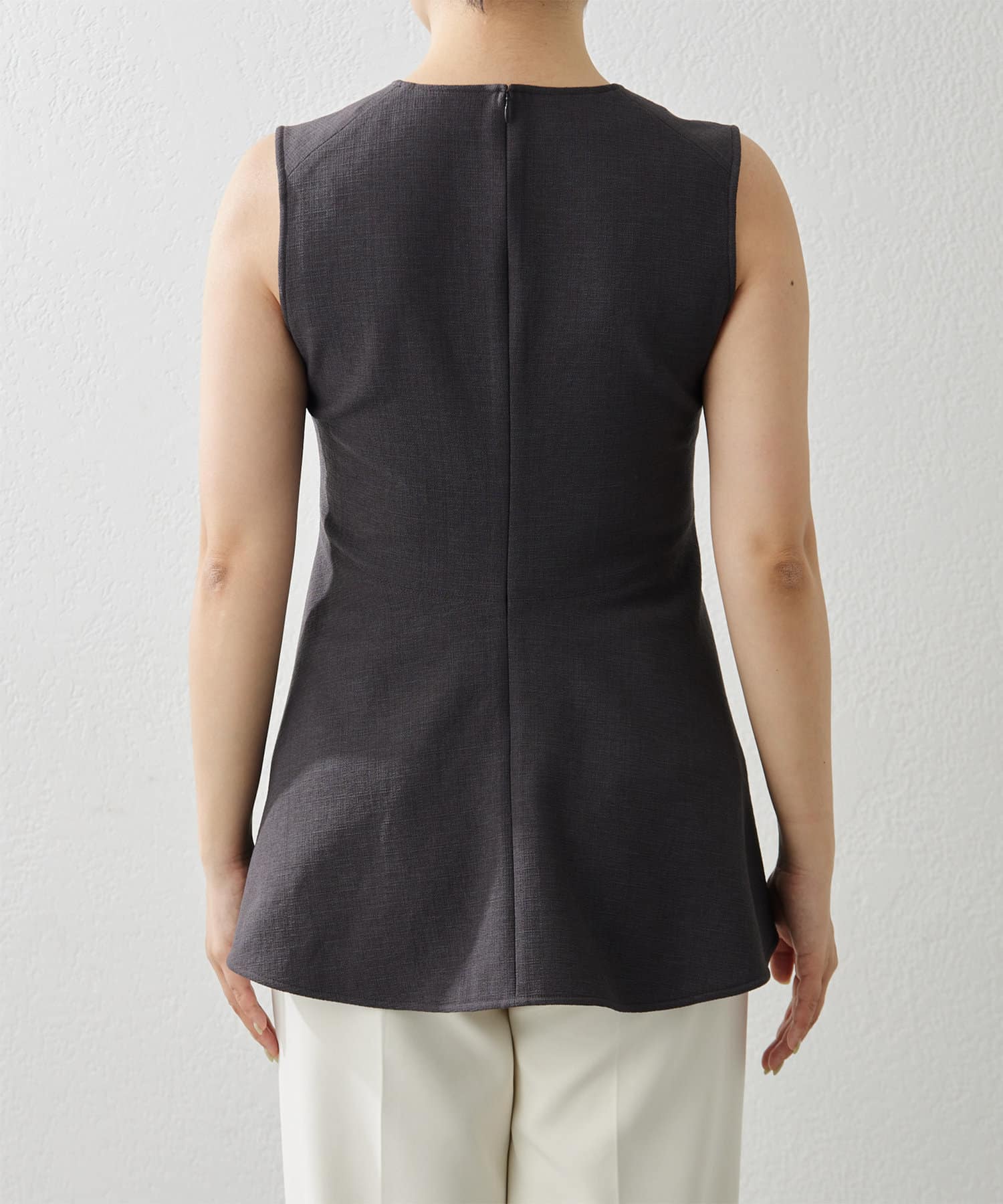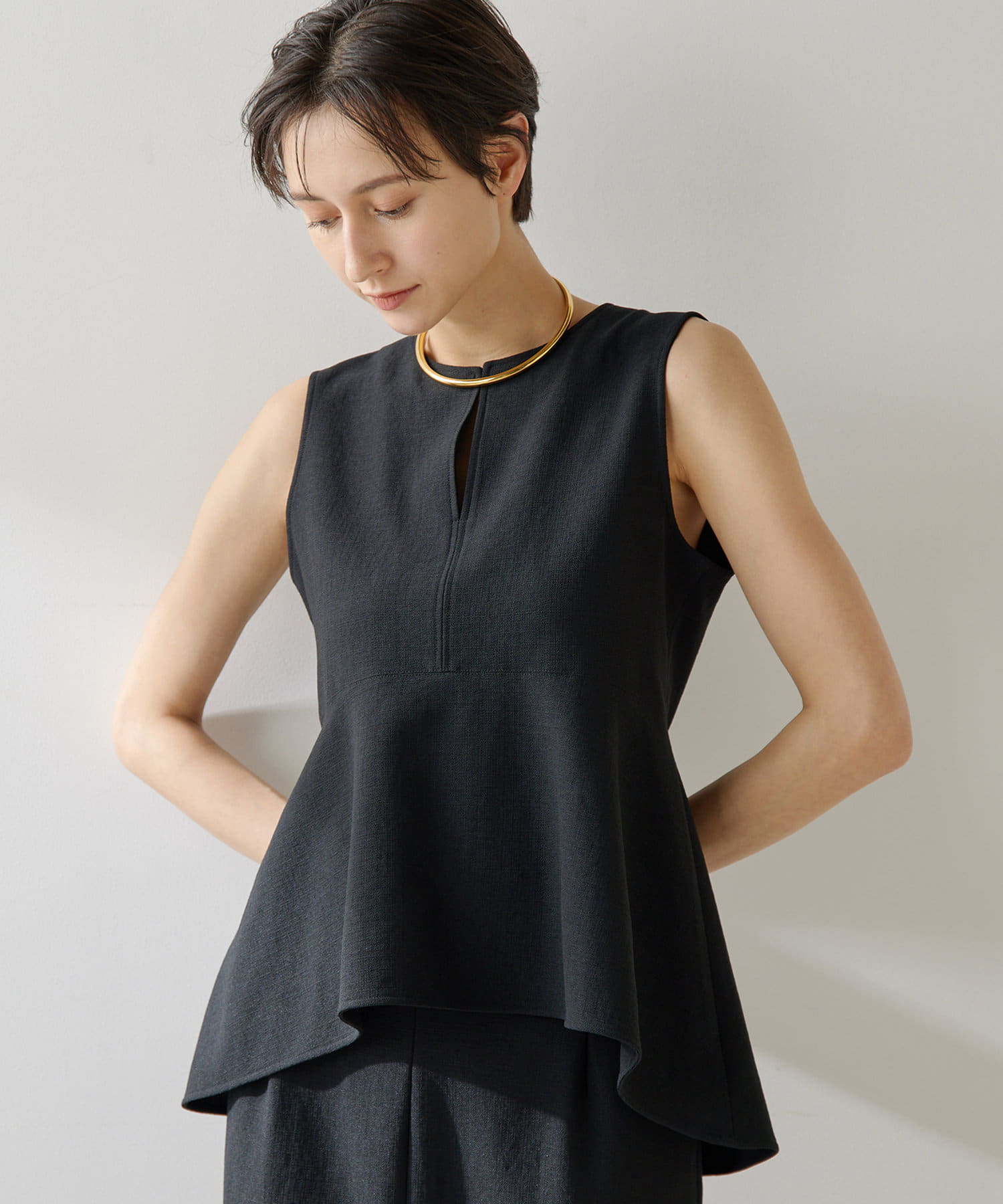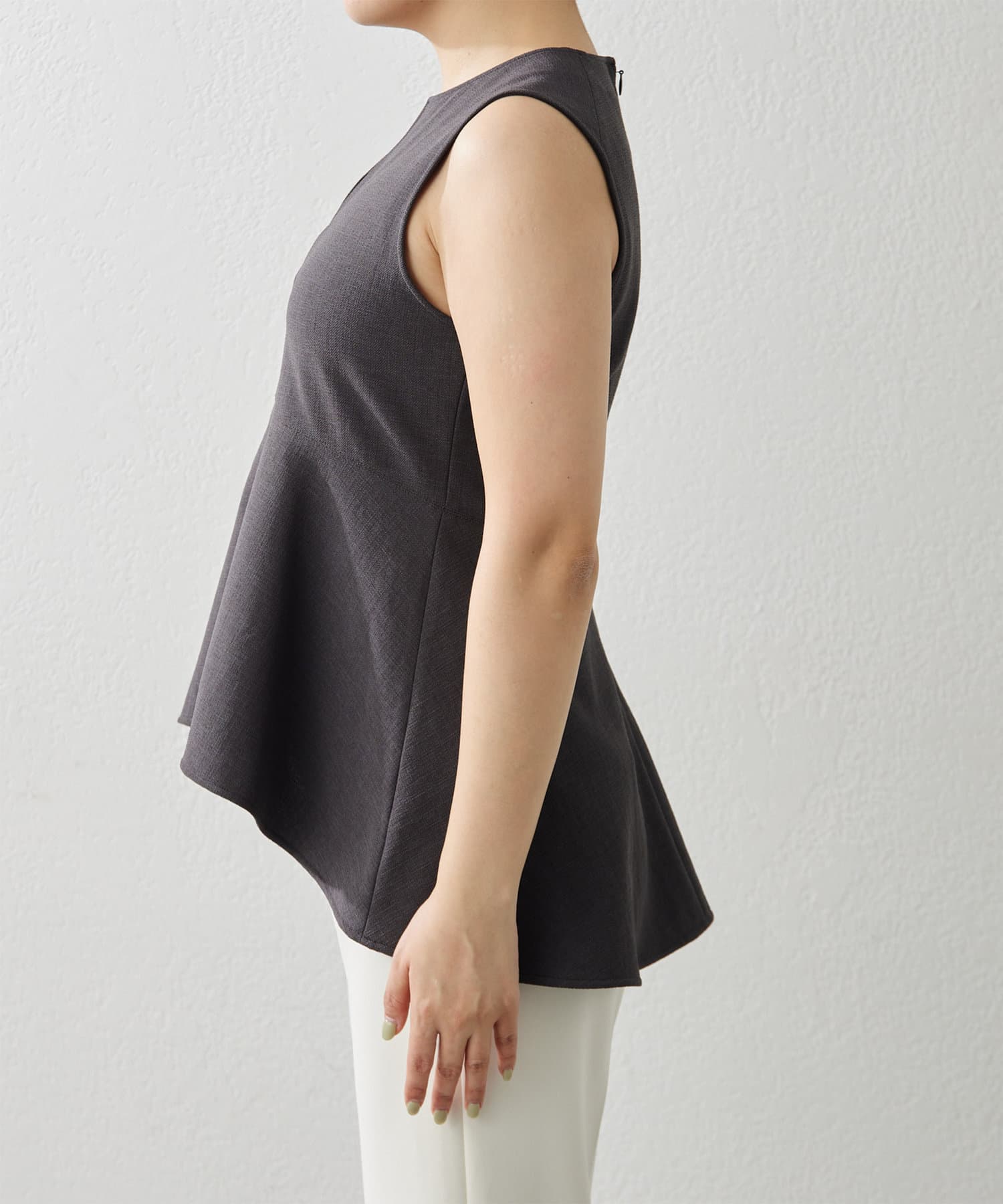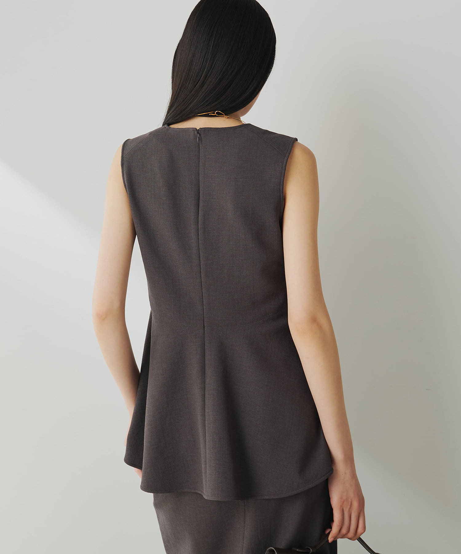 ■美しいボディラインを演出するノースリーブペプラムブラウス。