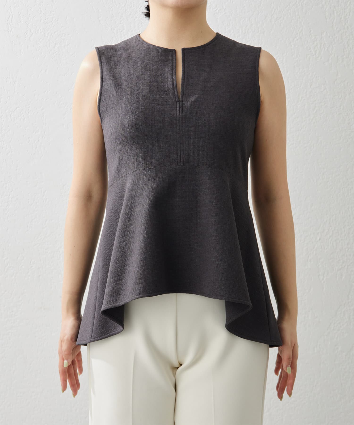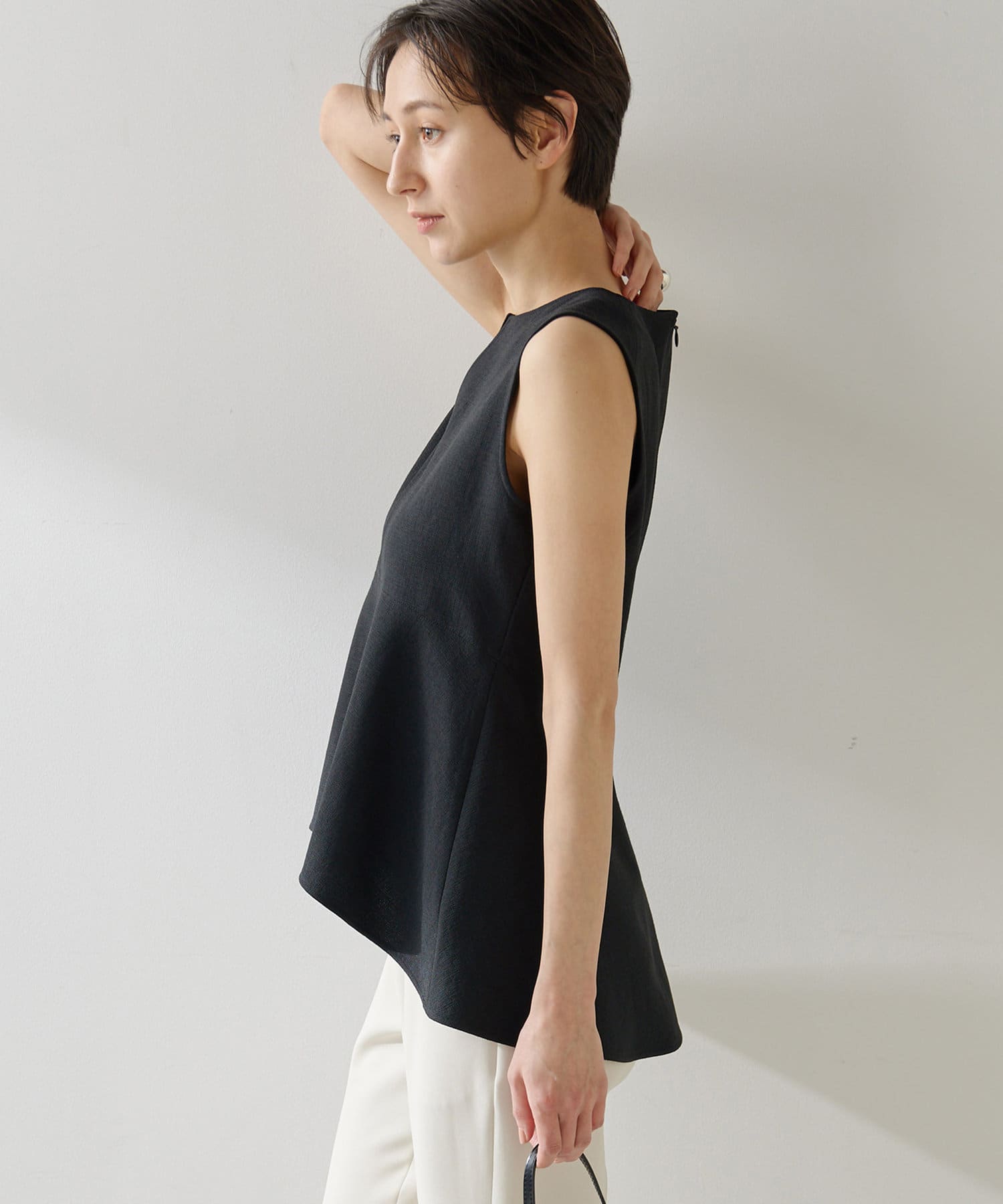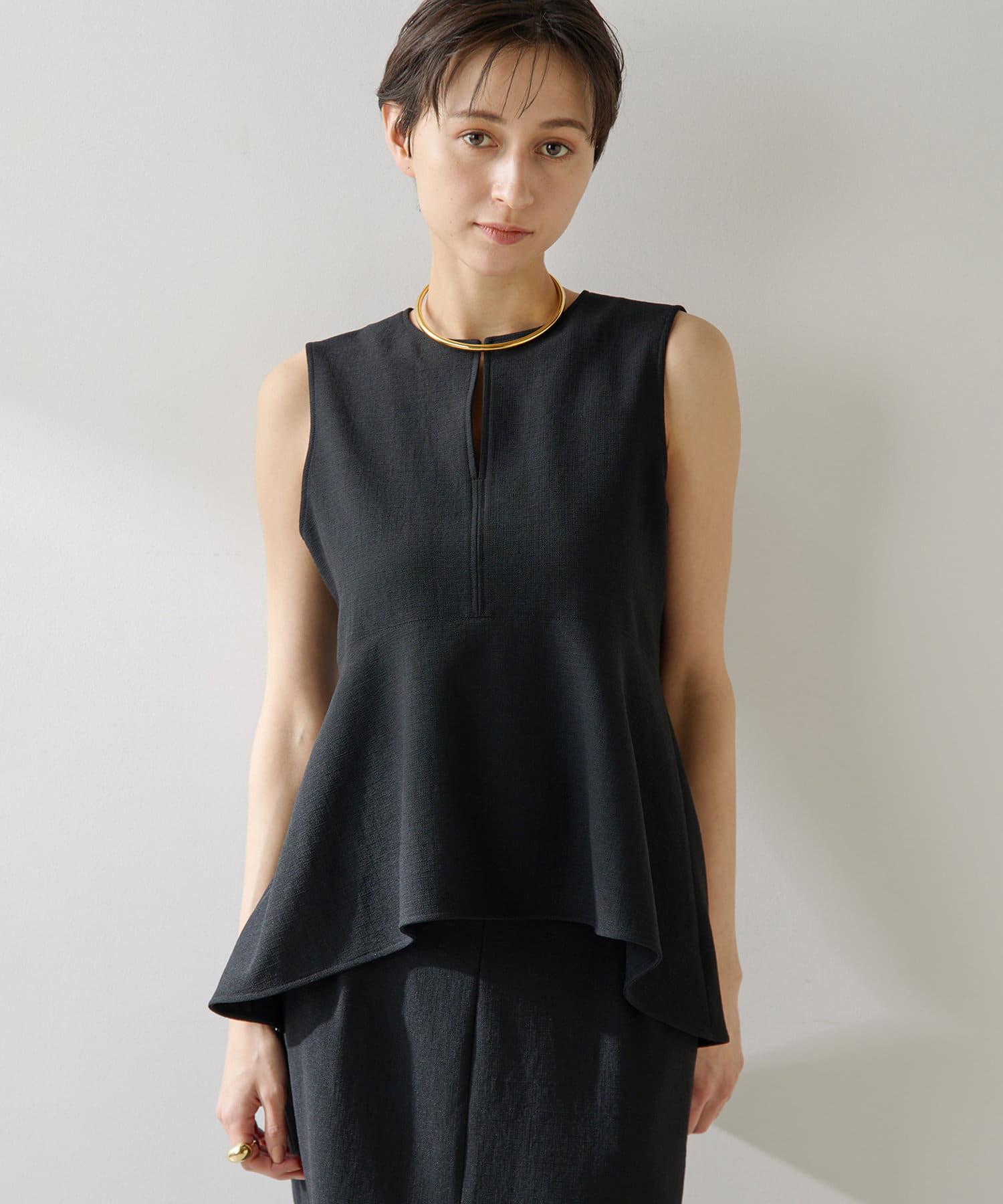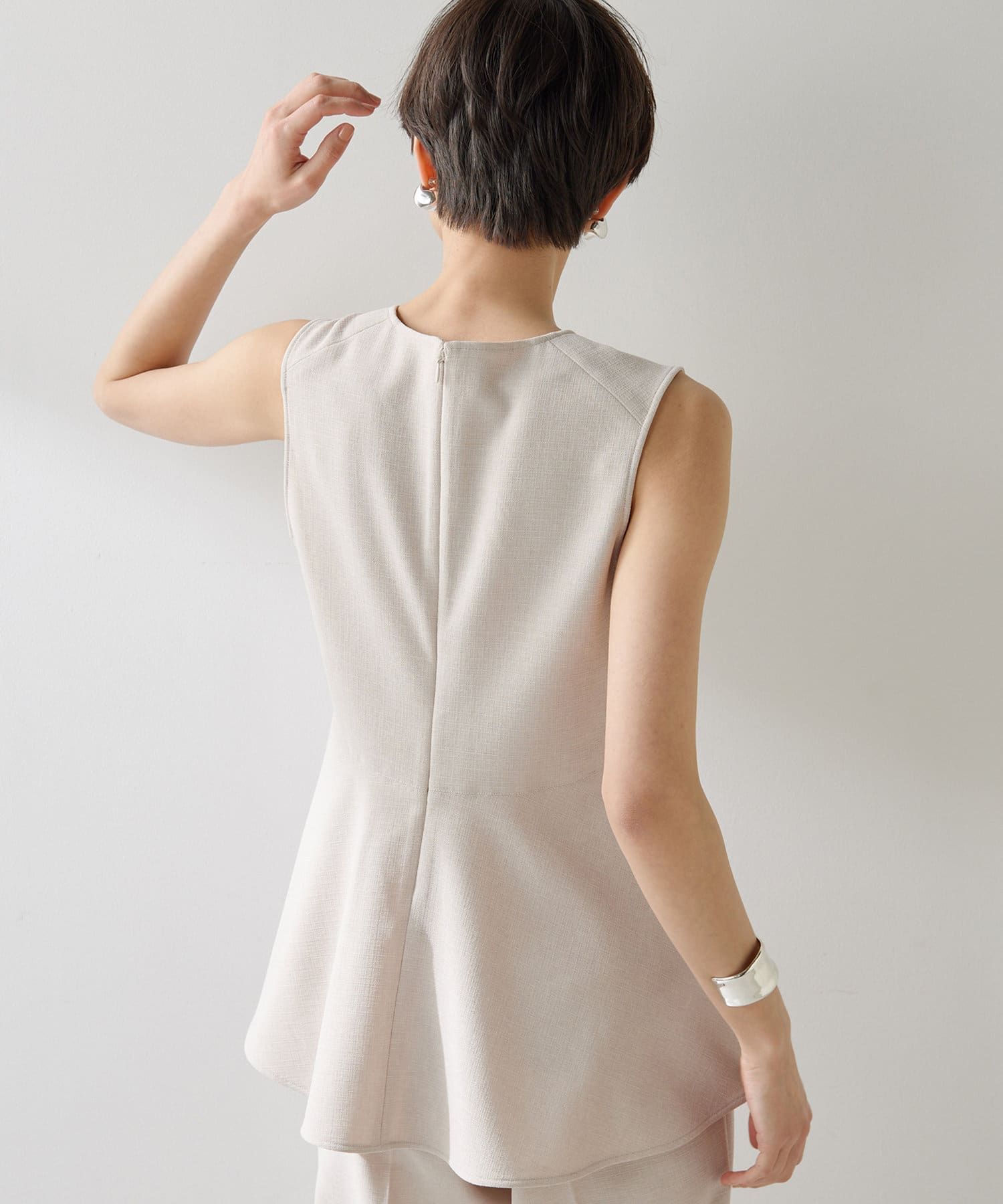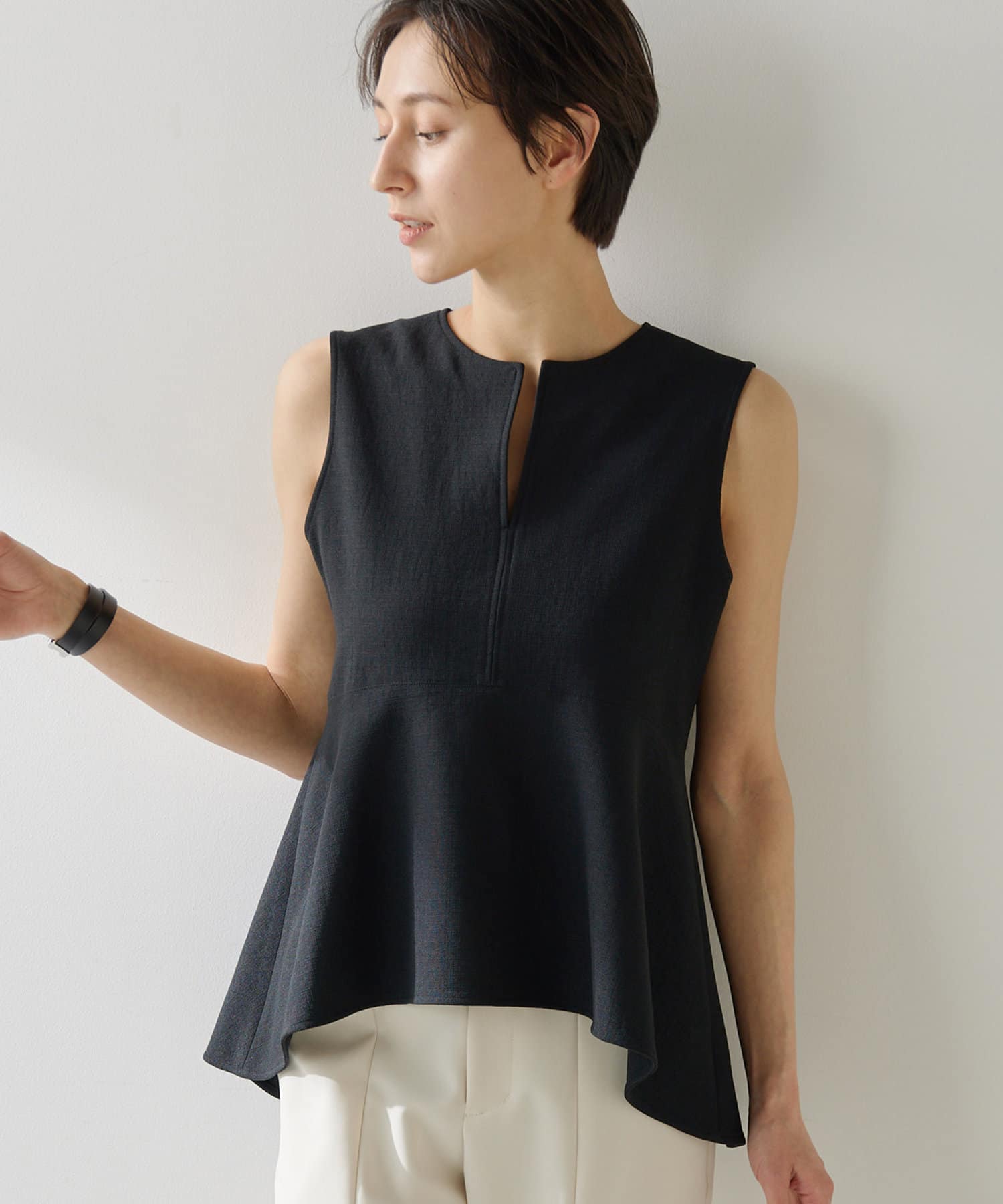 ■美しいボディラインを演出するノースリーブペプラムブラウス。