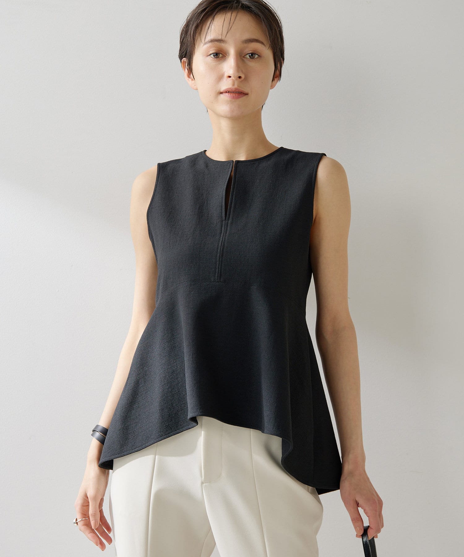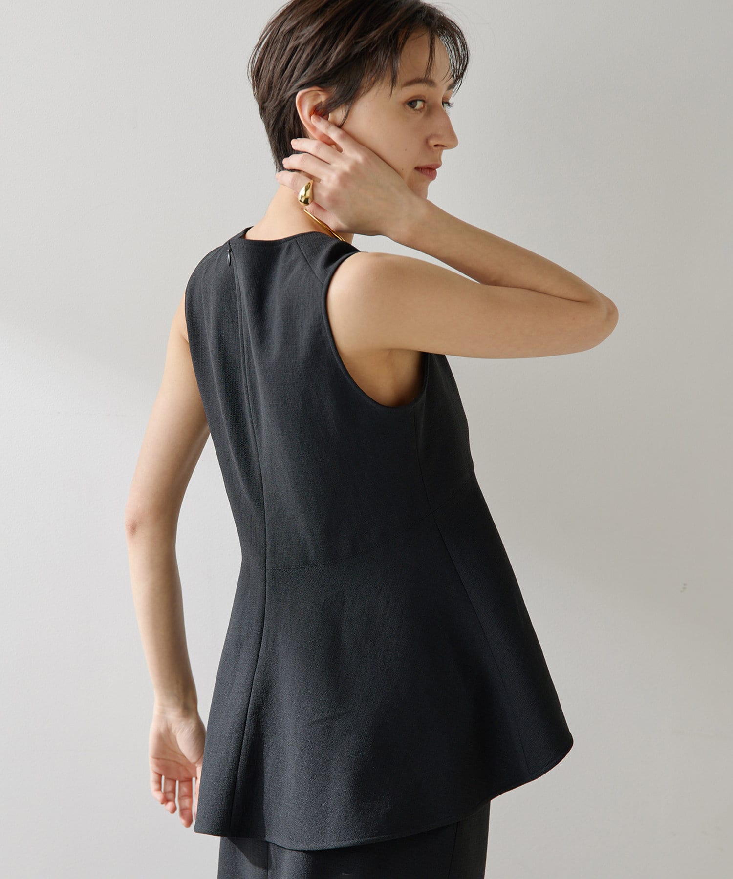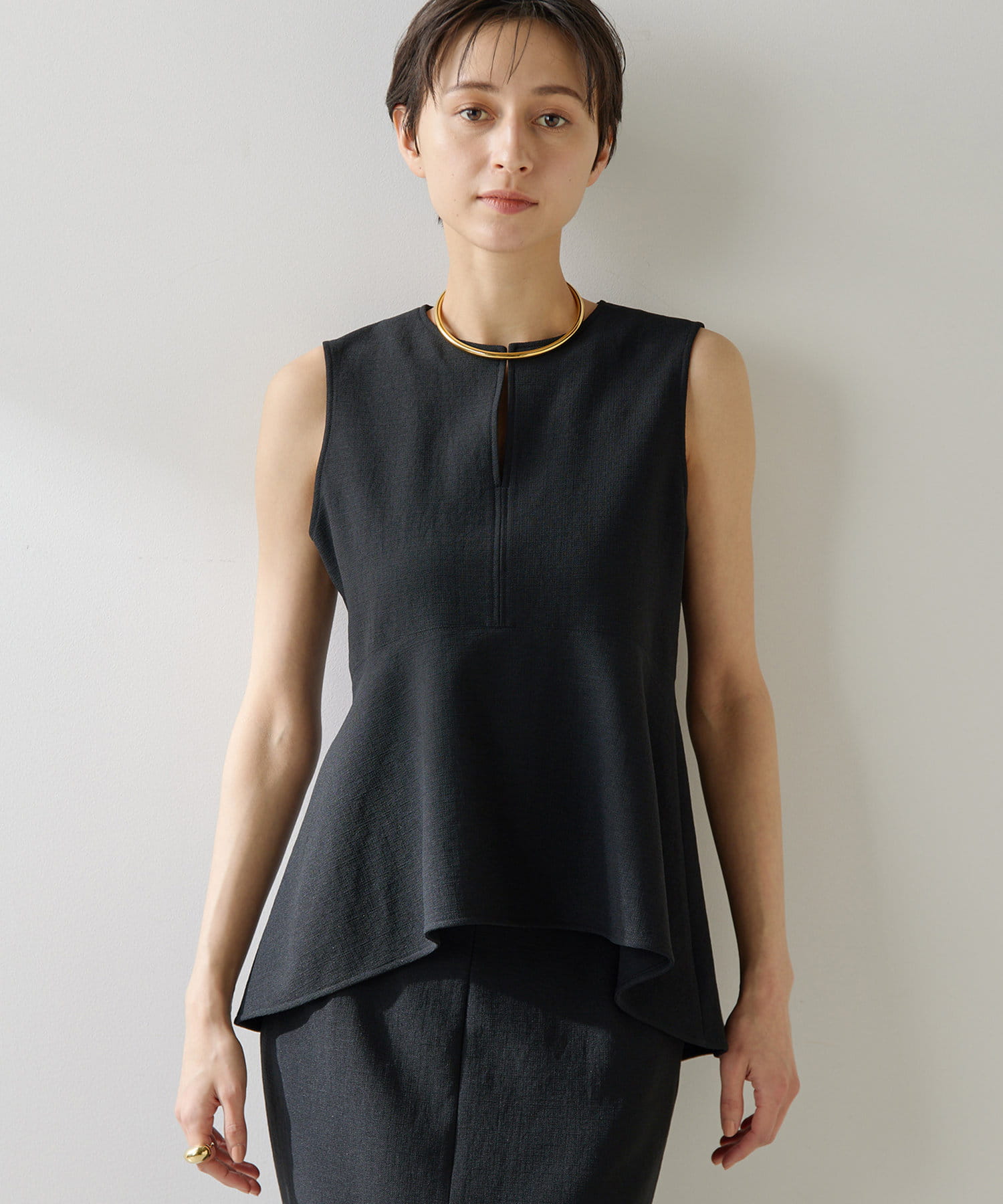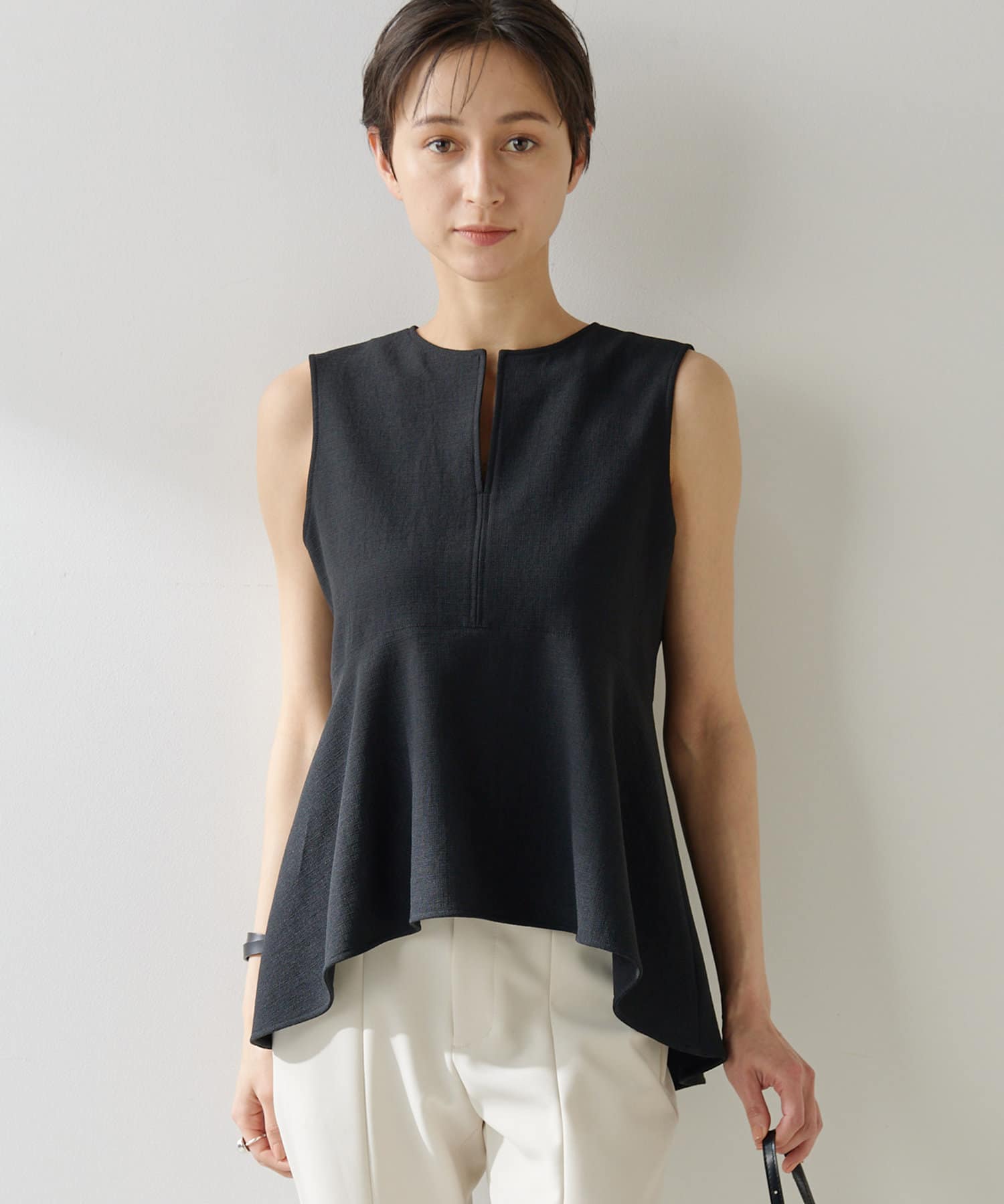 ■美しいボディラインを演出するノースリーブペプラムブラウス。