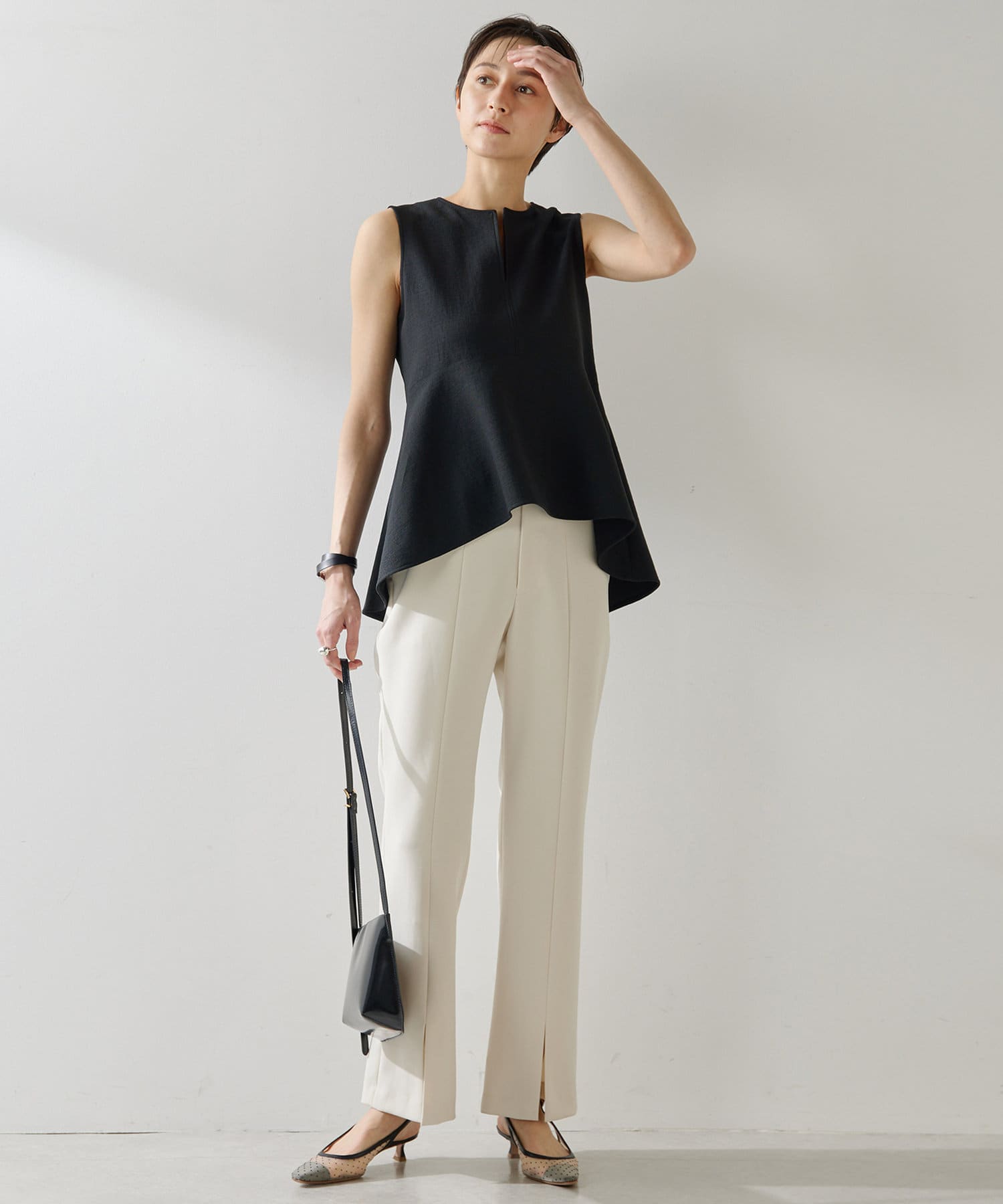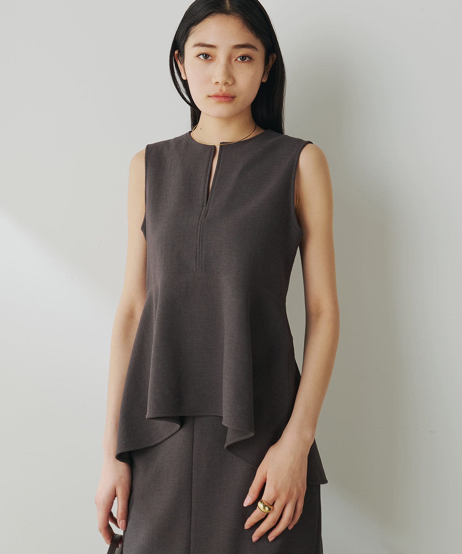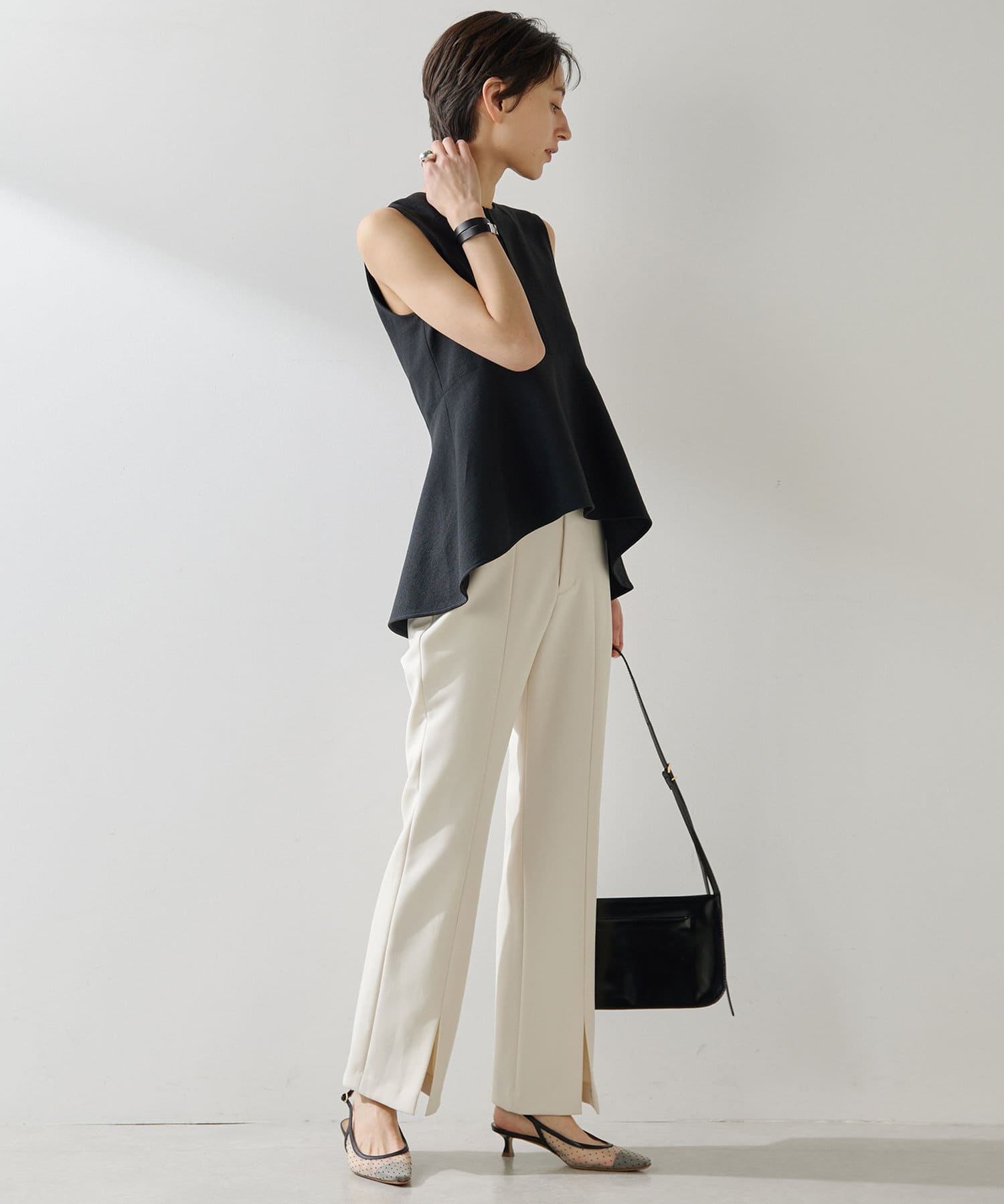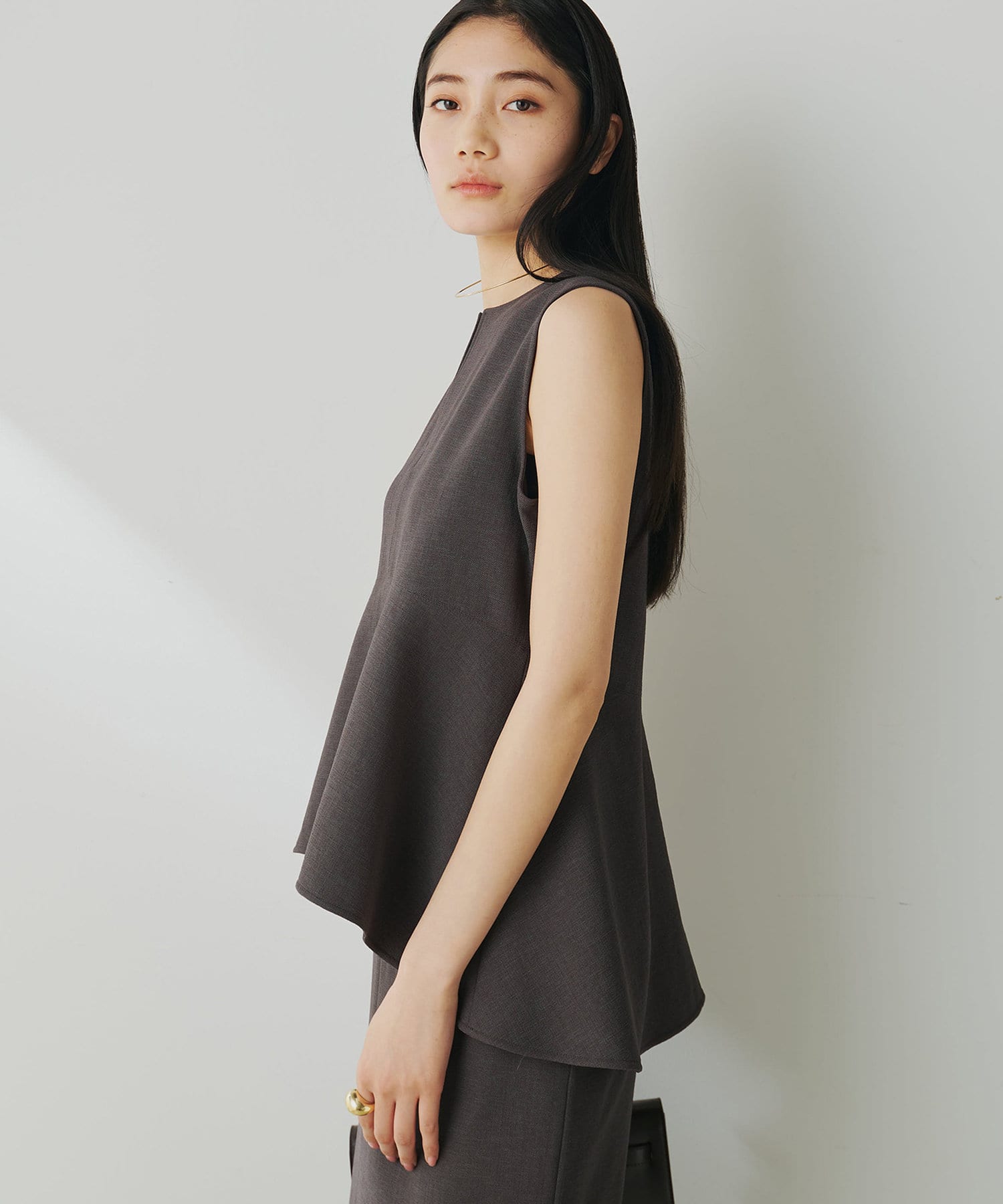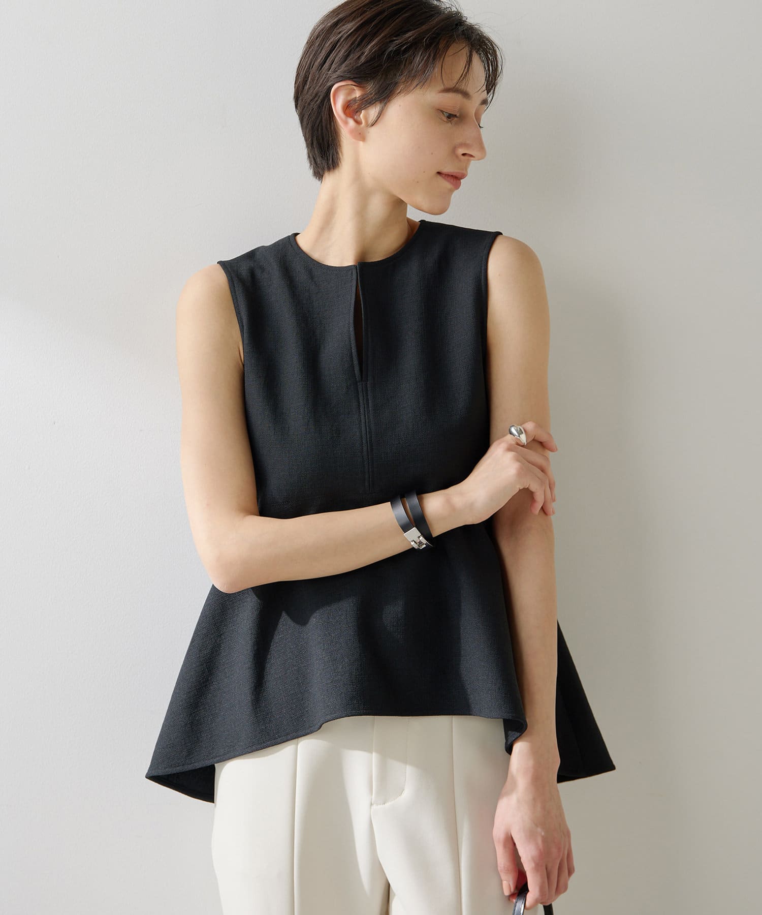 ■美しいボディラインを演出するノースリーブペプラムブラウス。