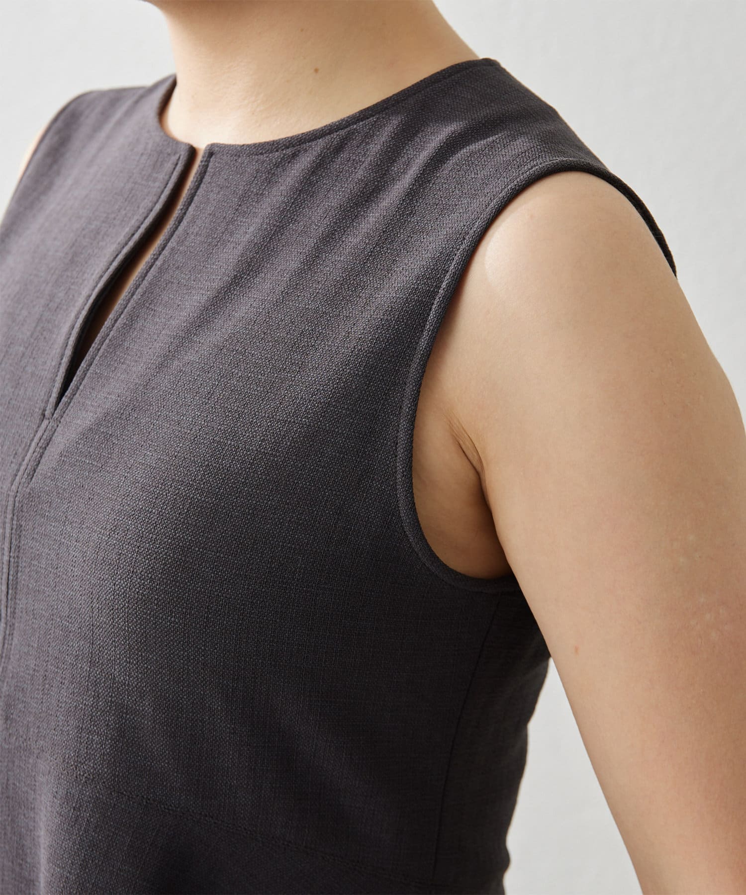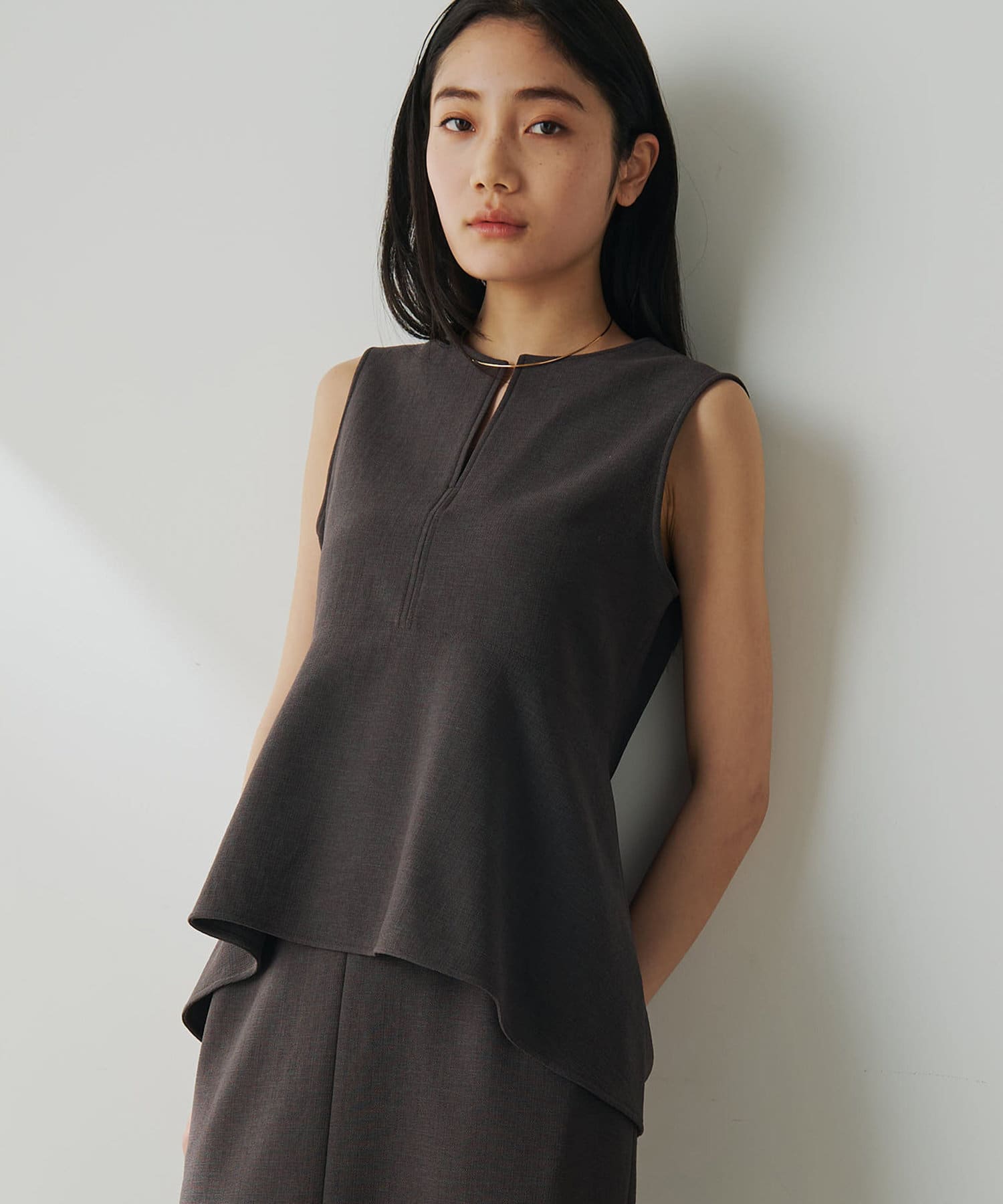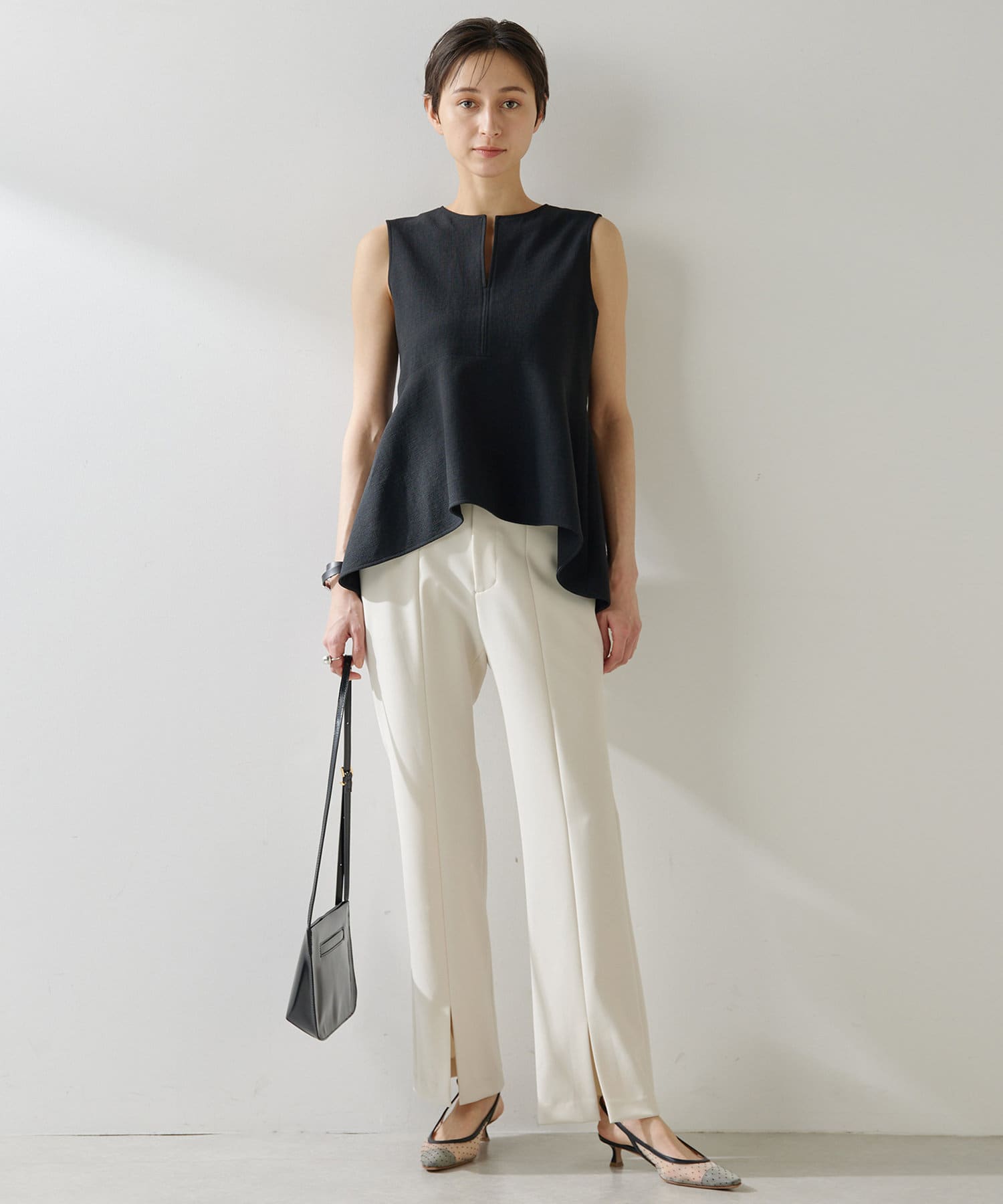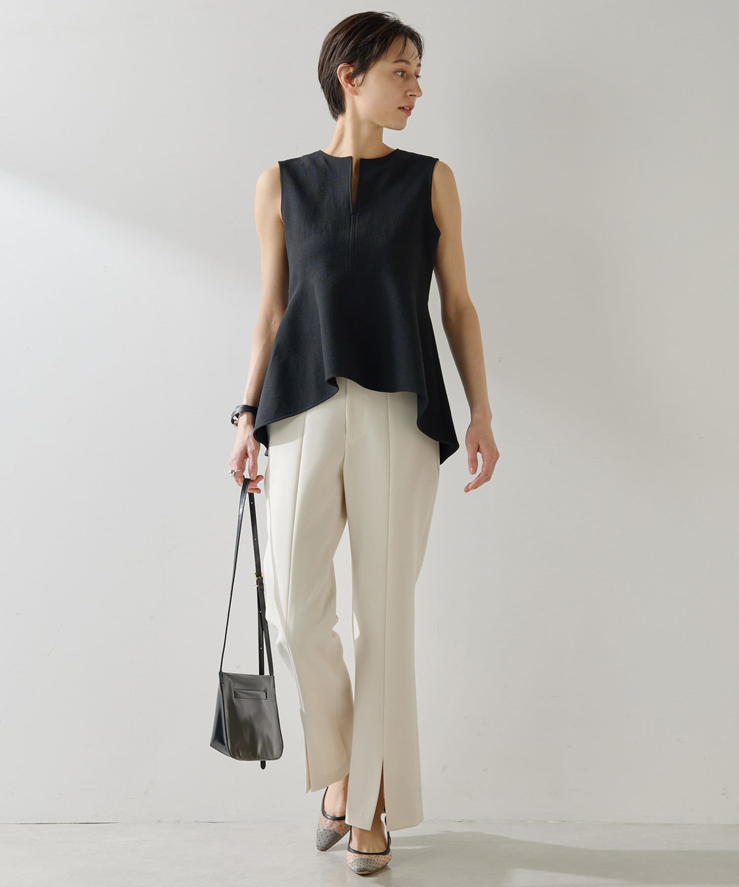 ■美しいボディラインを演出するノースリーブペプラムブラウス。