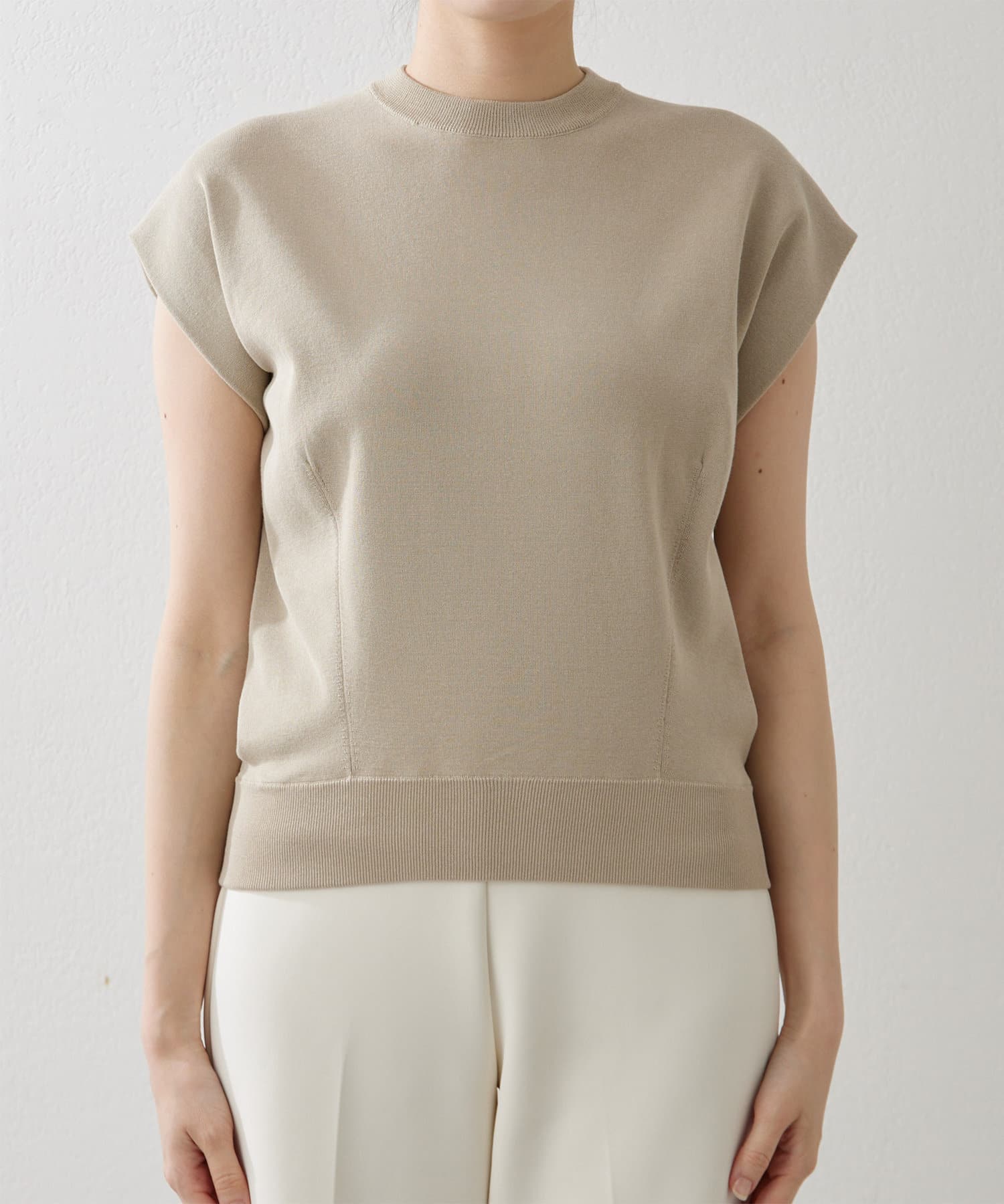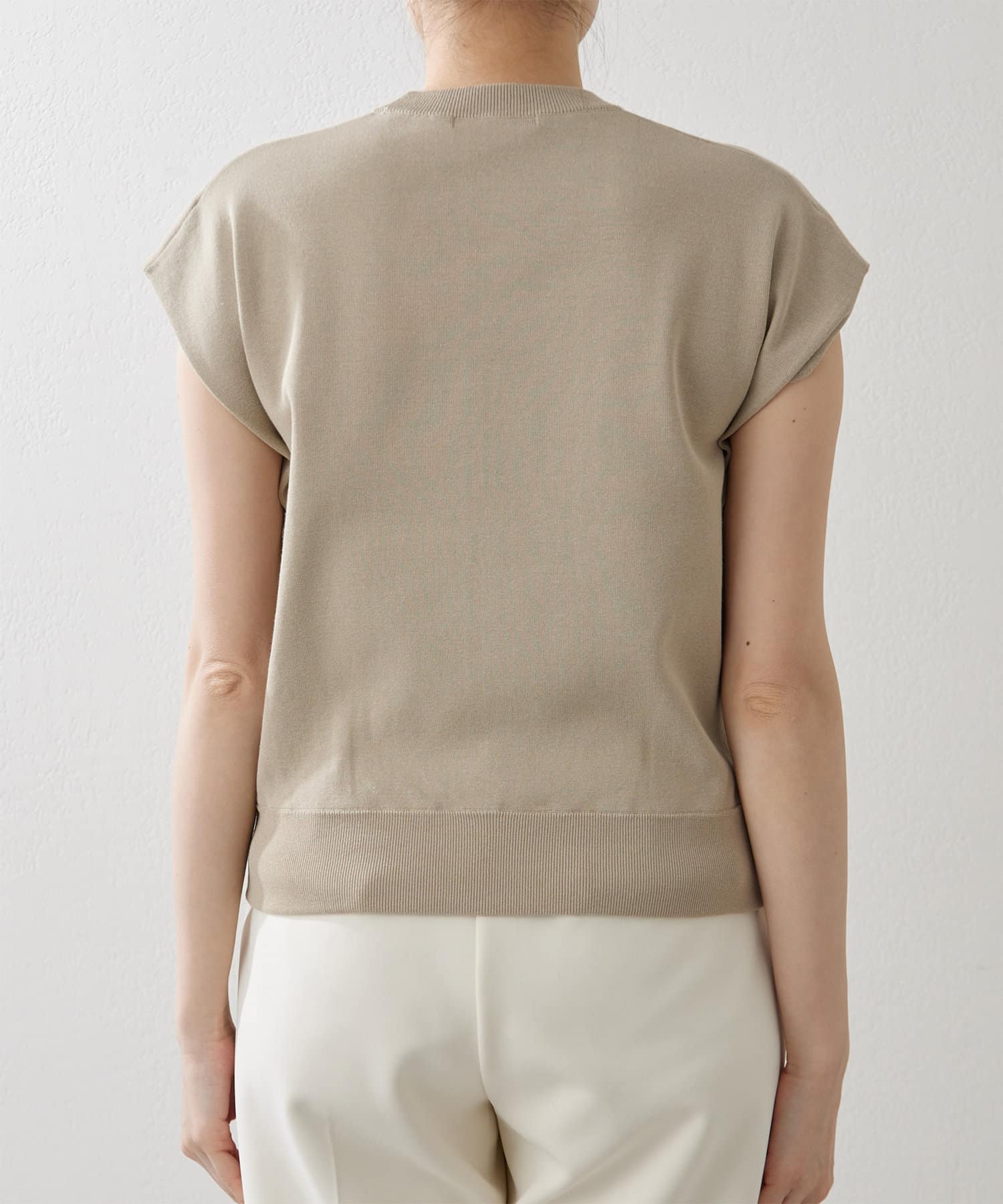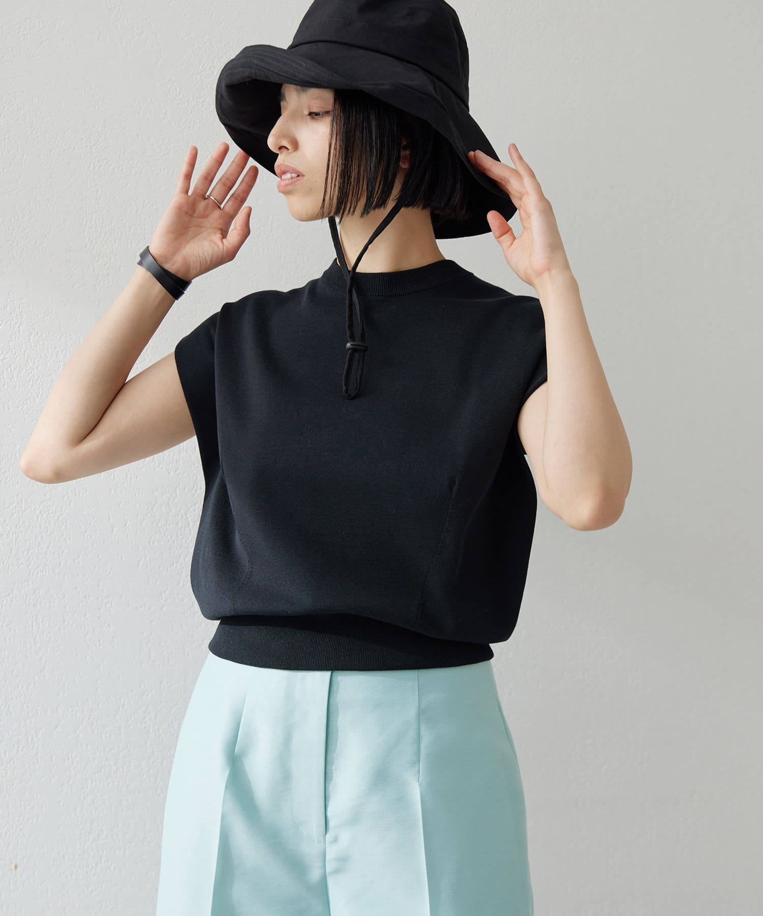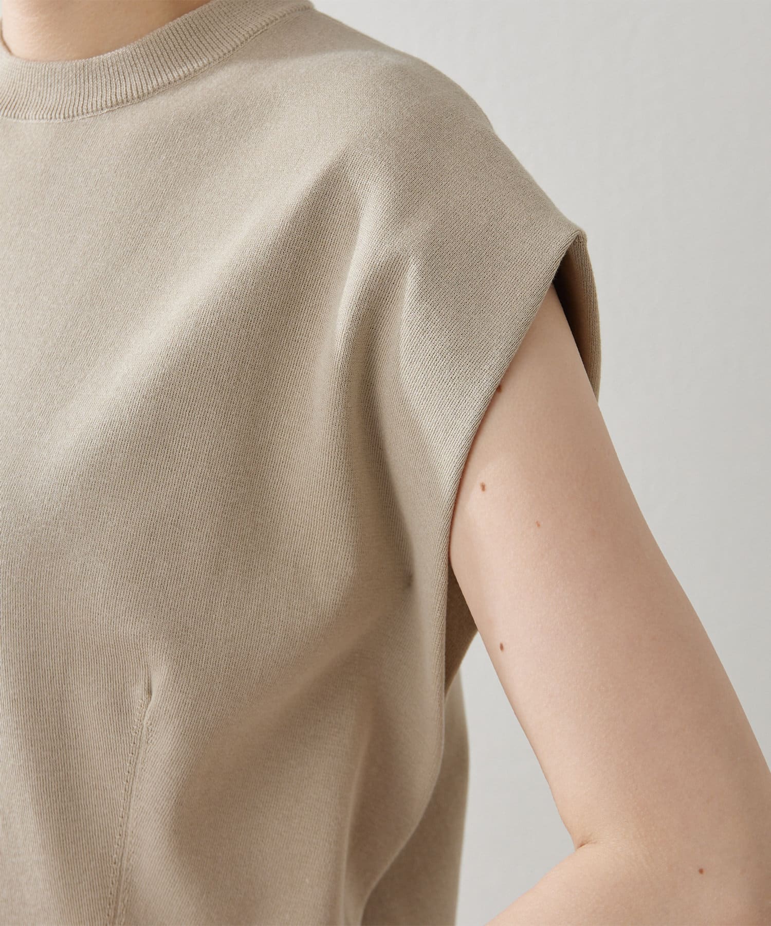 ■短めの着丈ですっきりと仕上げたノースリーブニットプルオーバー。