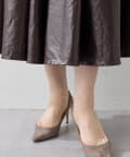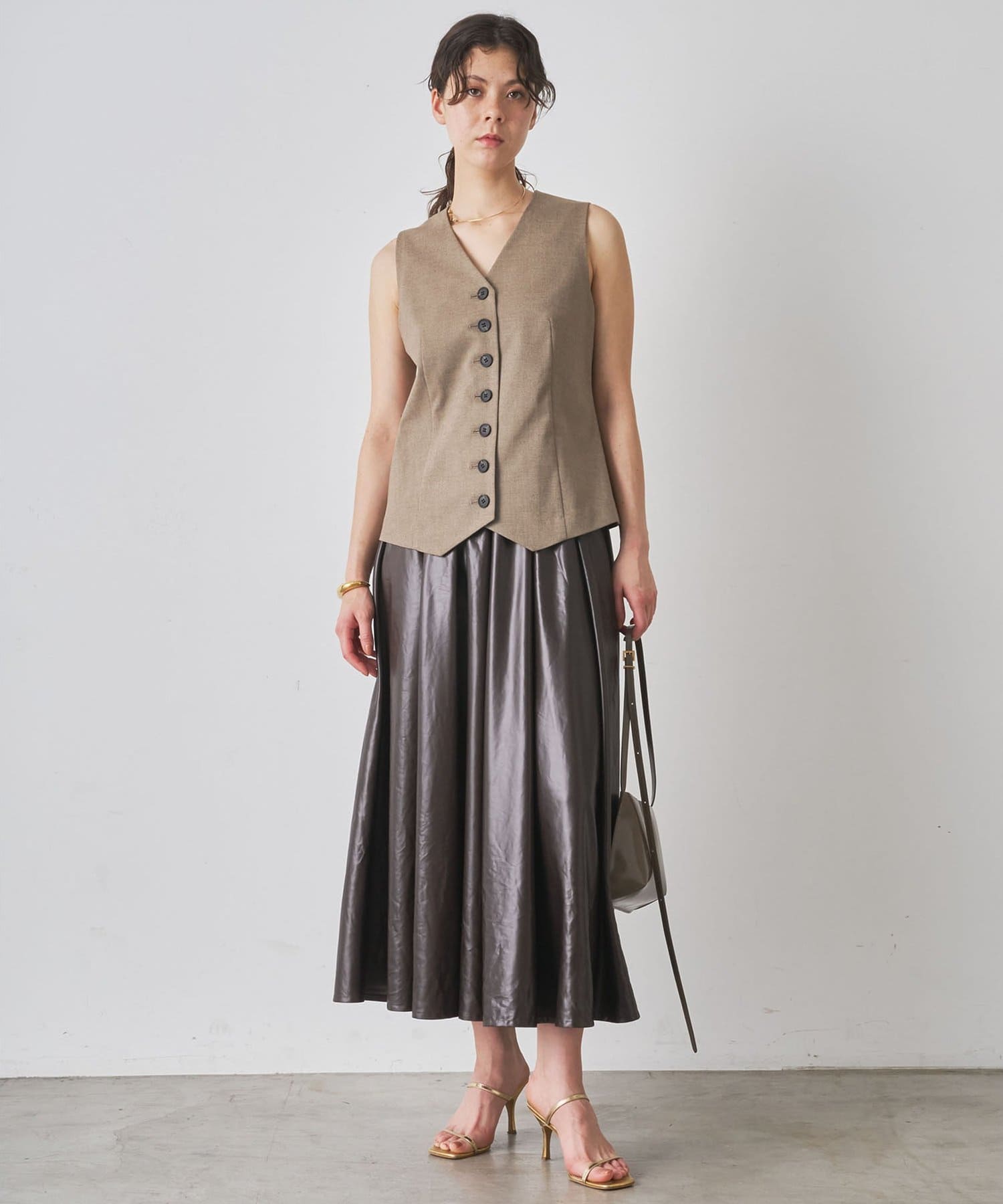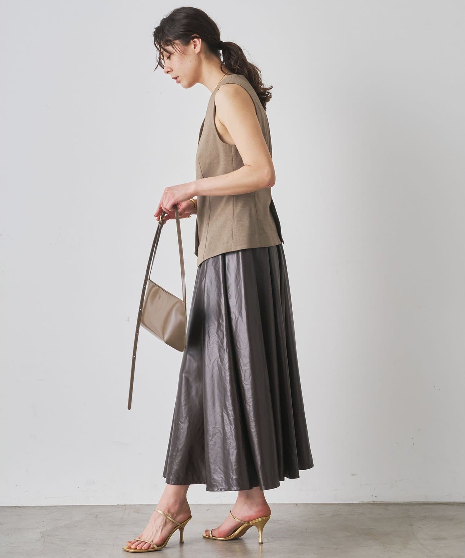 レザーライクな生地が映えるサテンフレアスカート