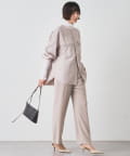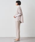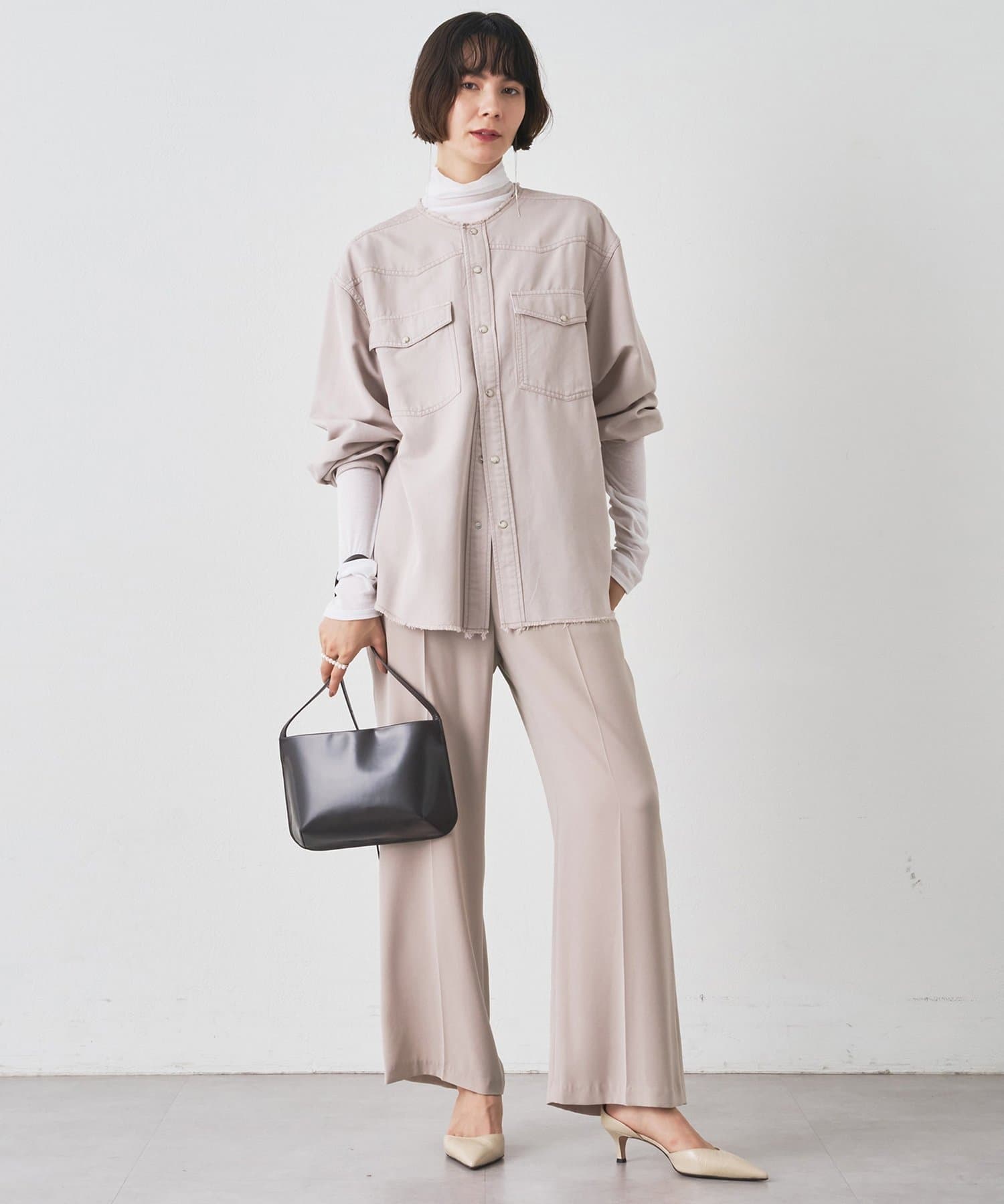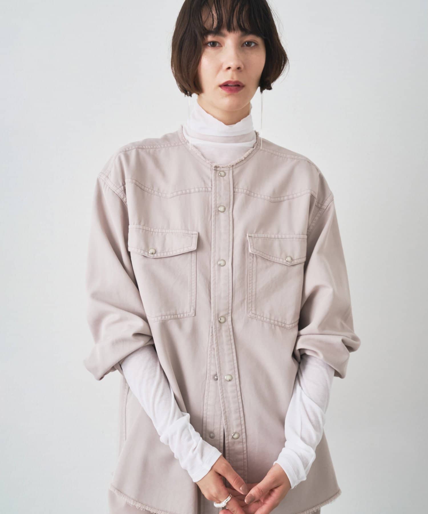 ■すっきりとしたノーカラーに、断ち切り仕上げでエッジを効かせたデザイン。