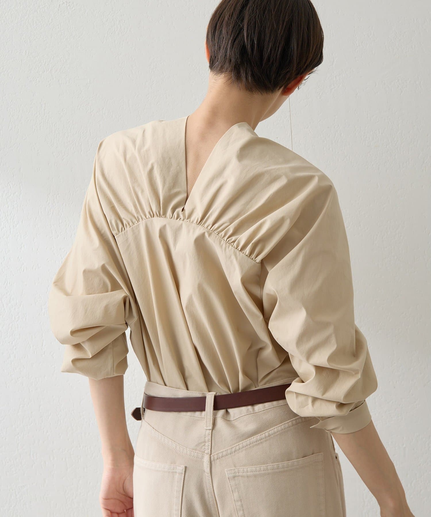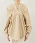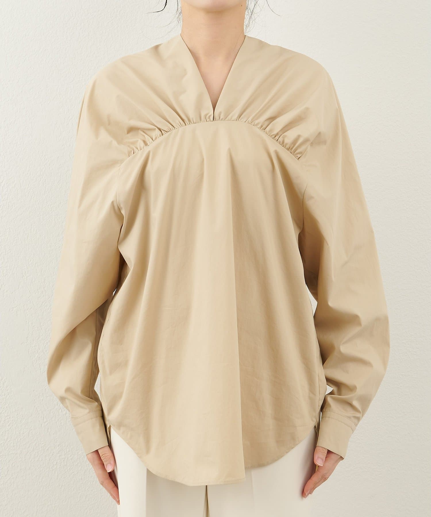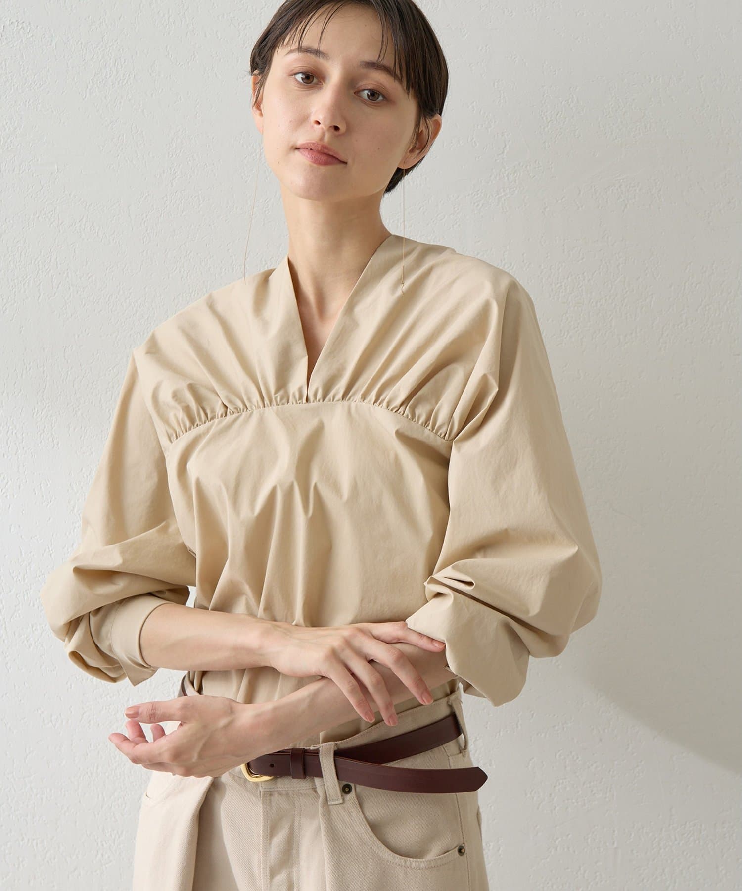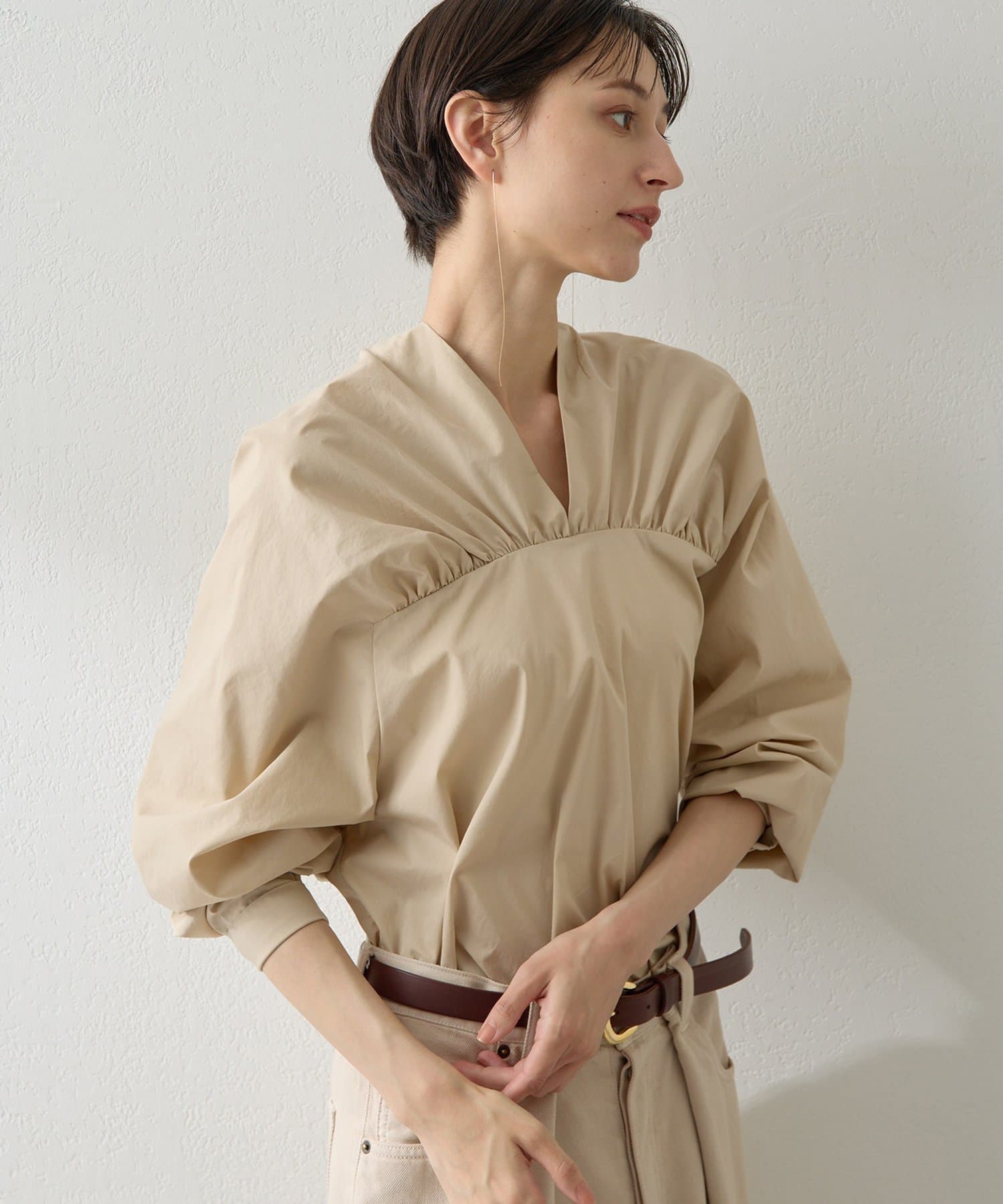 ■胸元に施したギャザーが着映え感のあるブラウス。