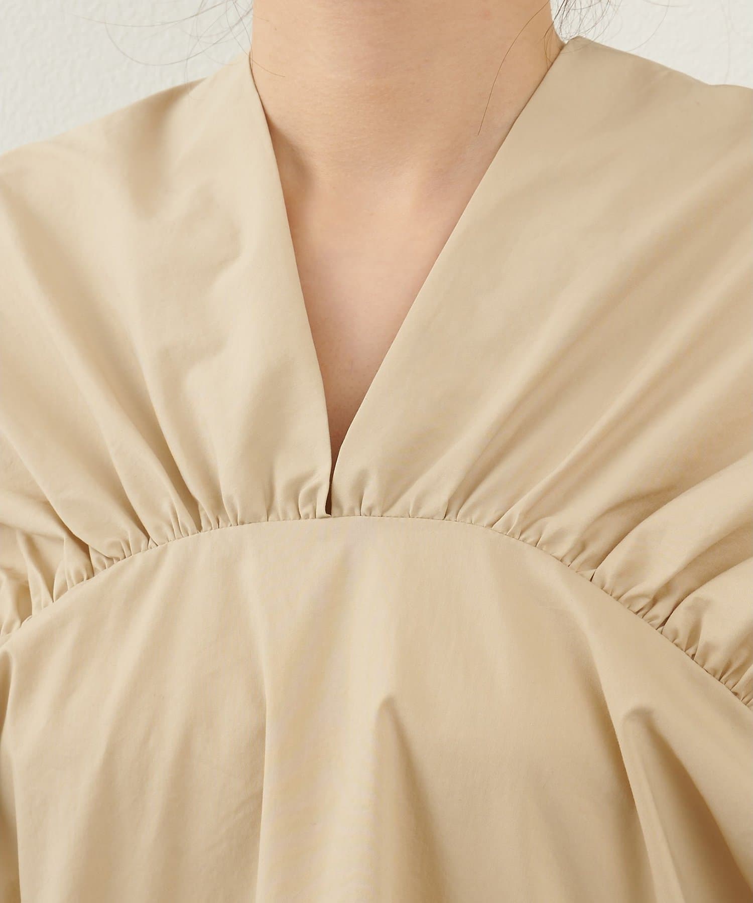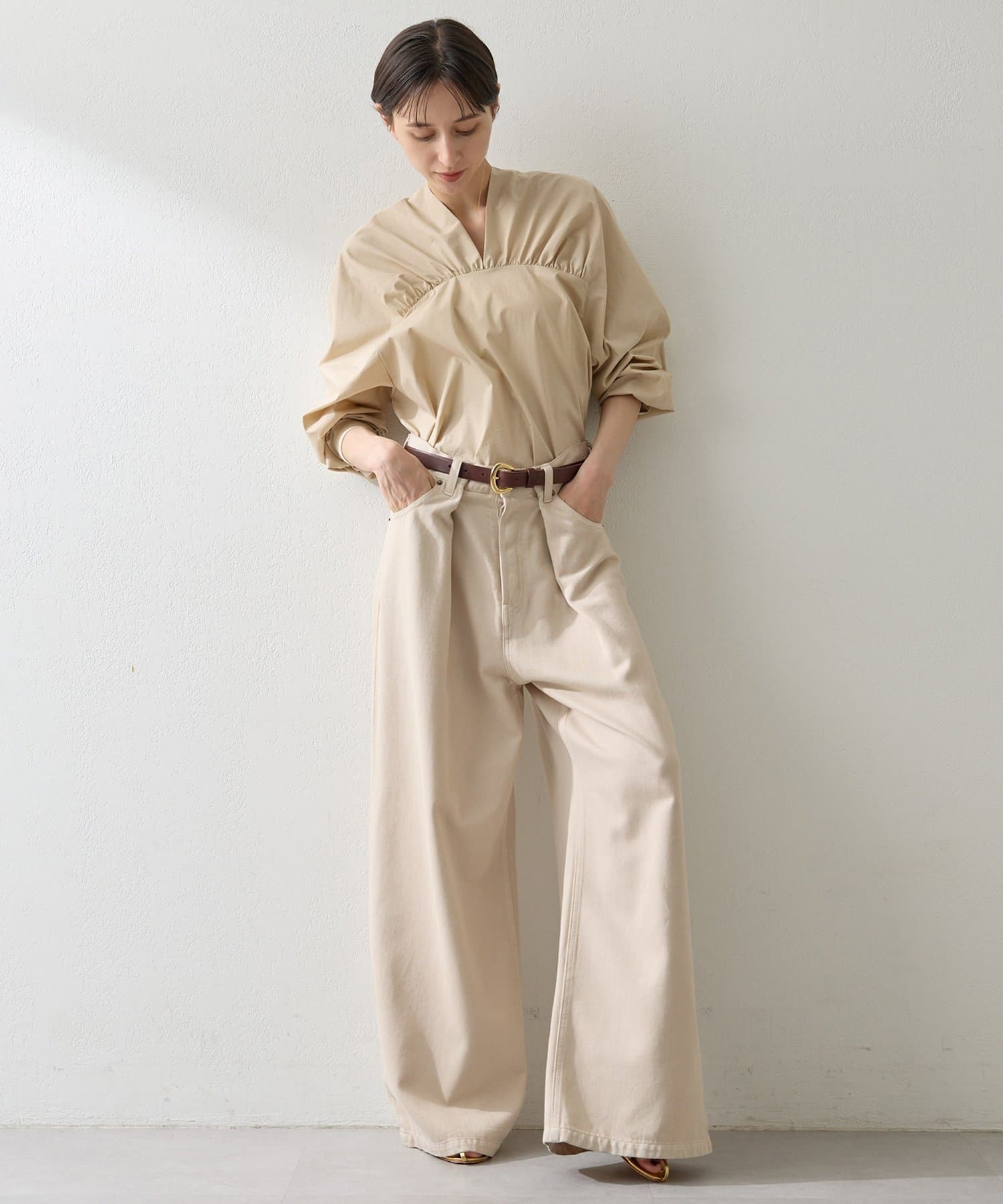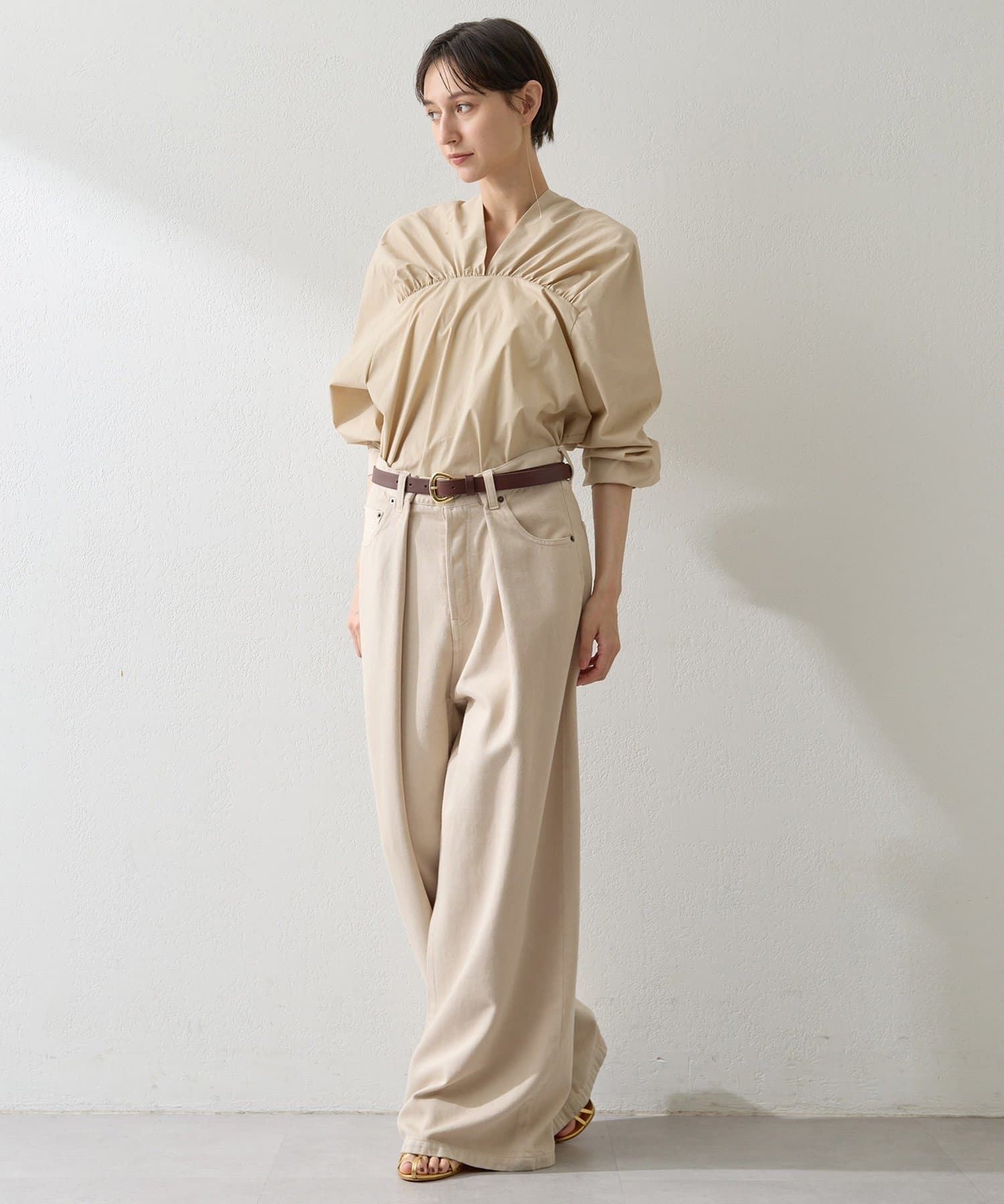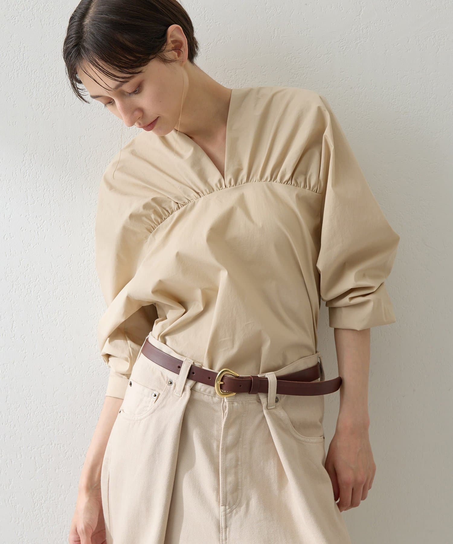 ■胸元に施したギャザーが着映え感のあるブラウス。