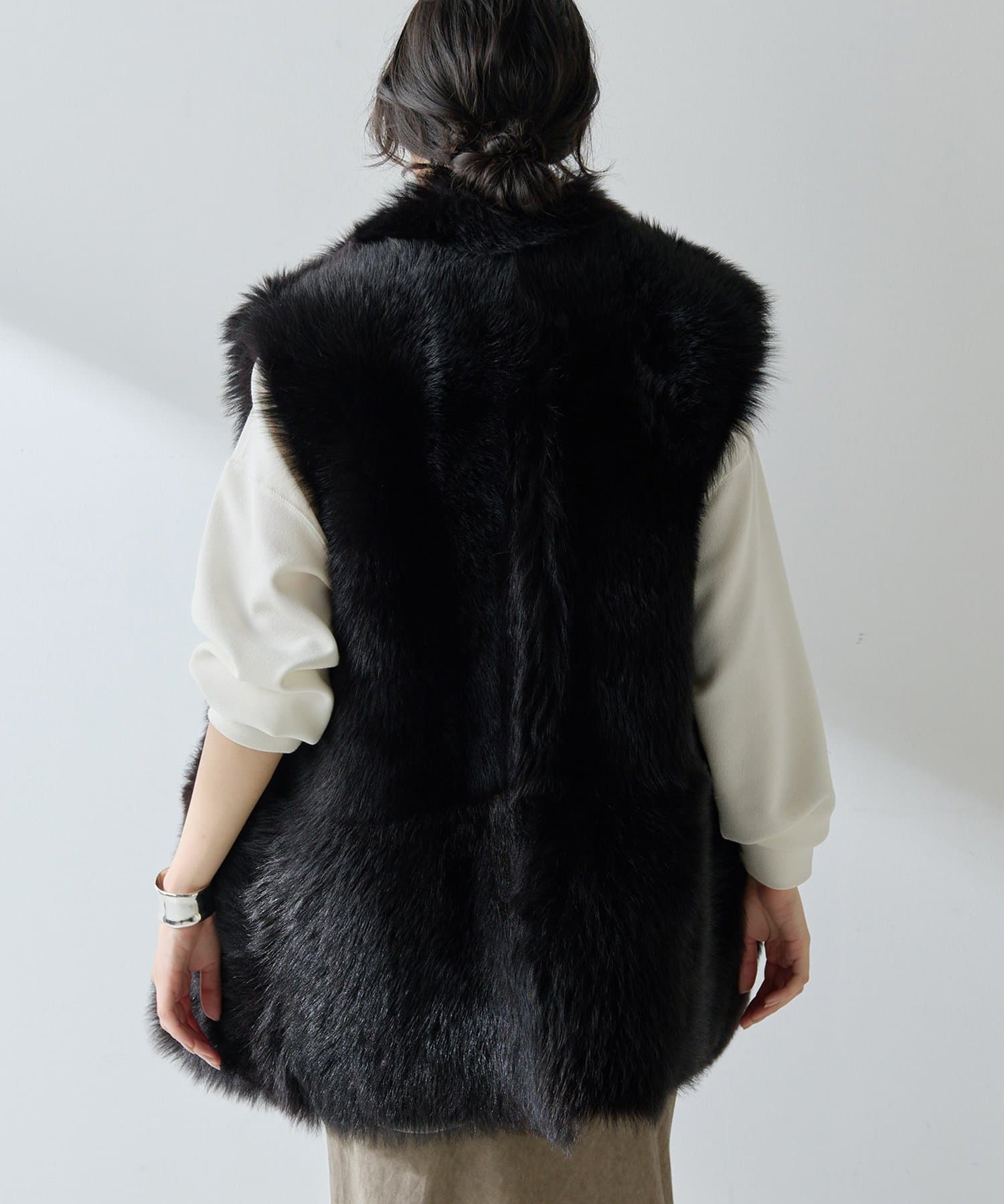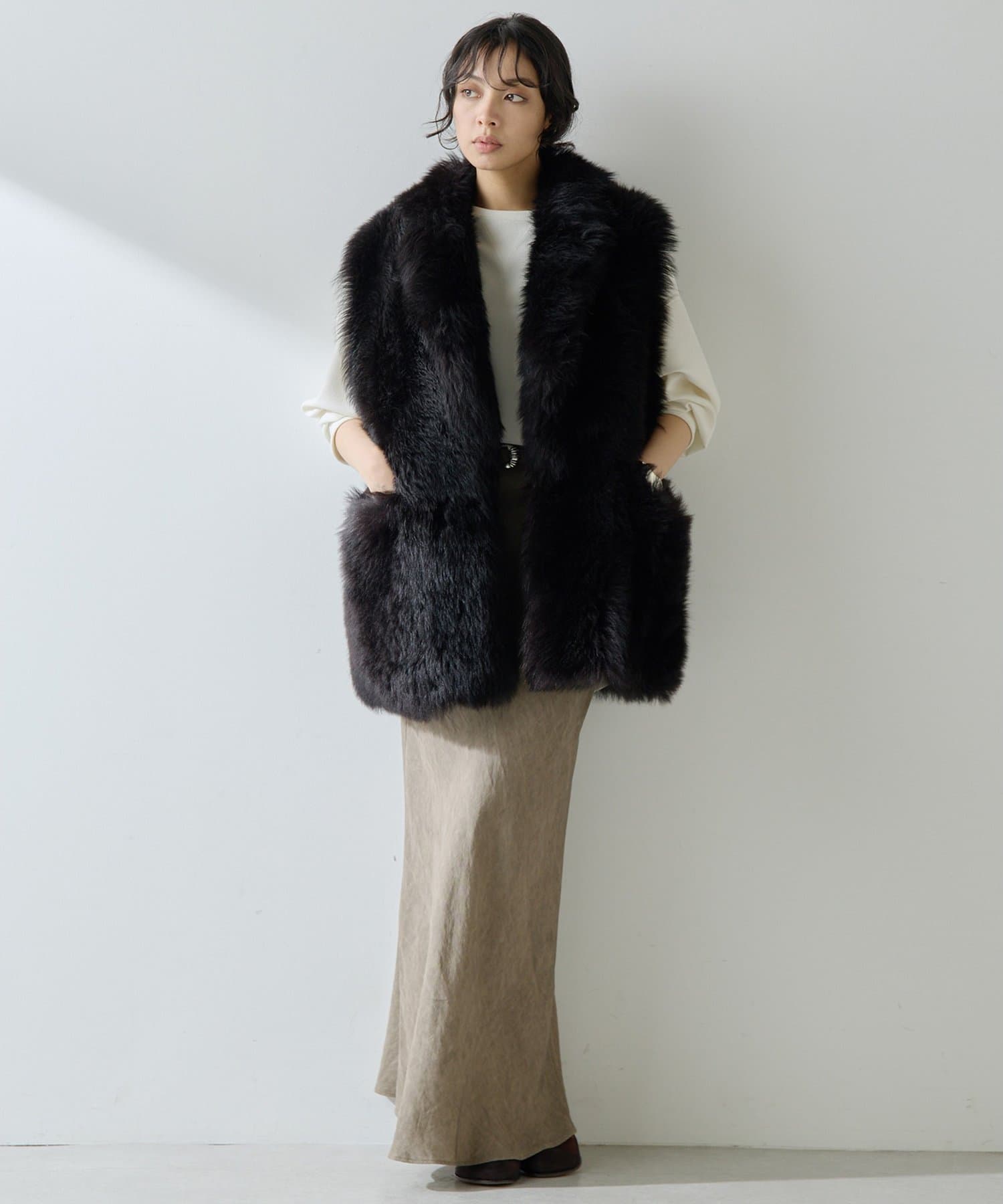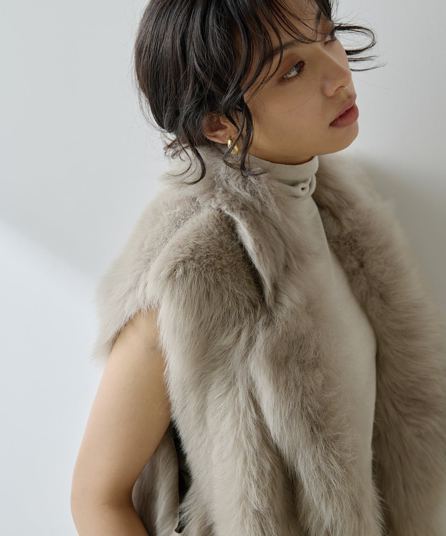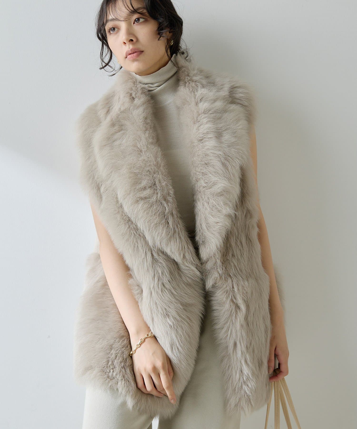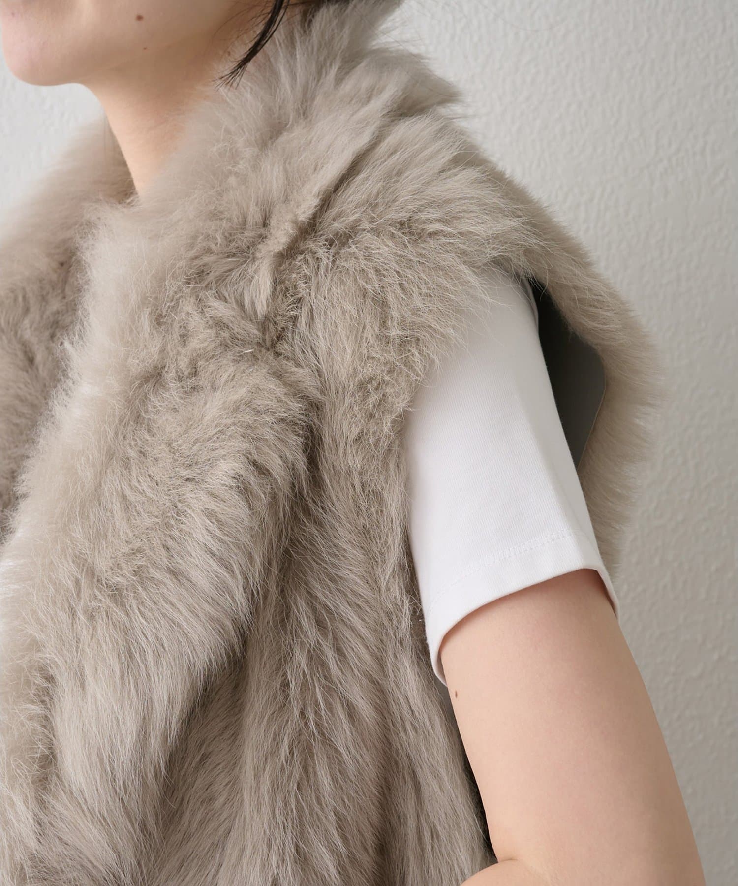 ■テーラーカラーを採用したオーバーサイズのファーベスト。