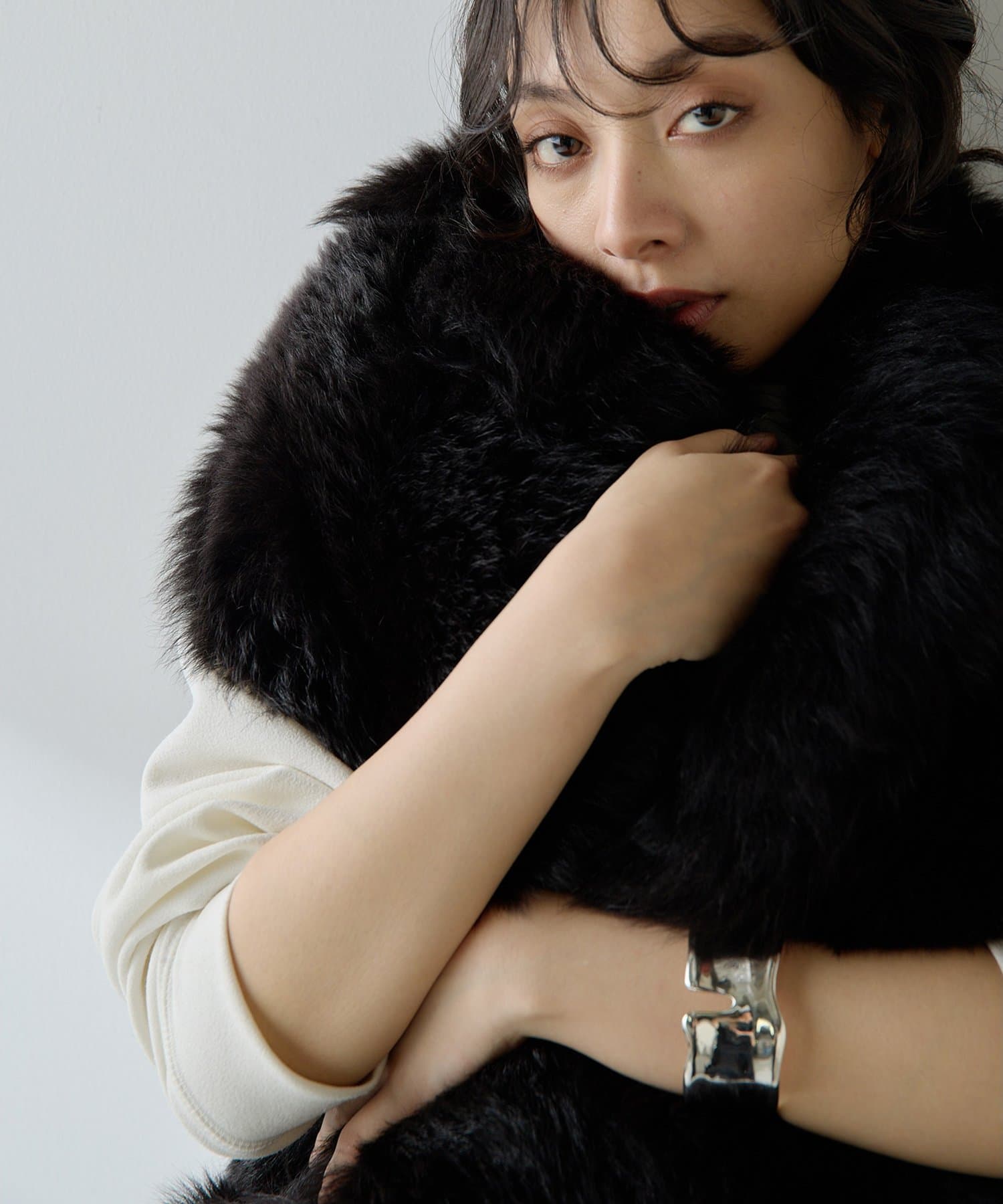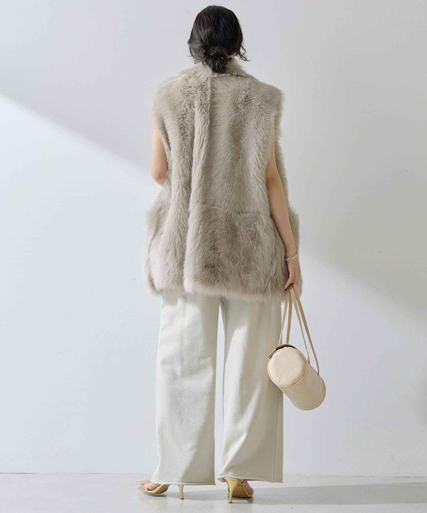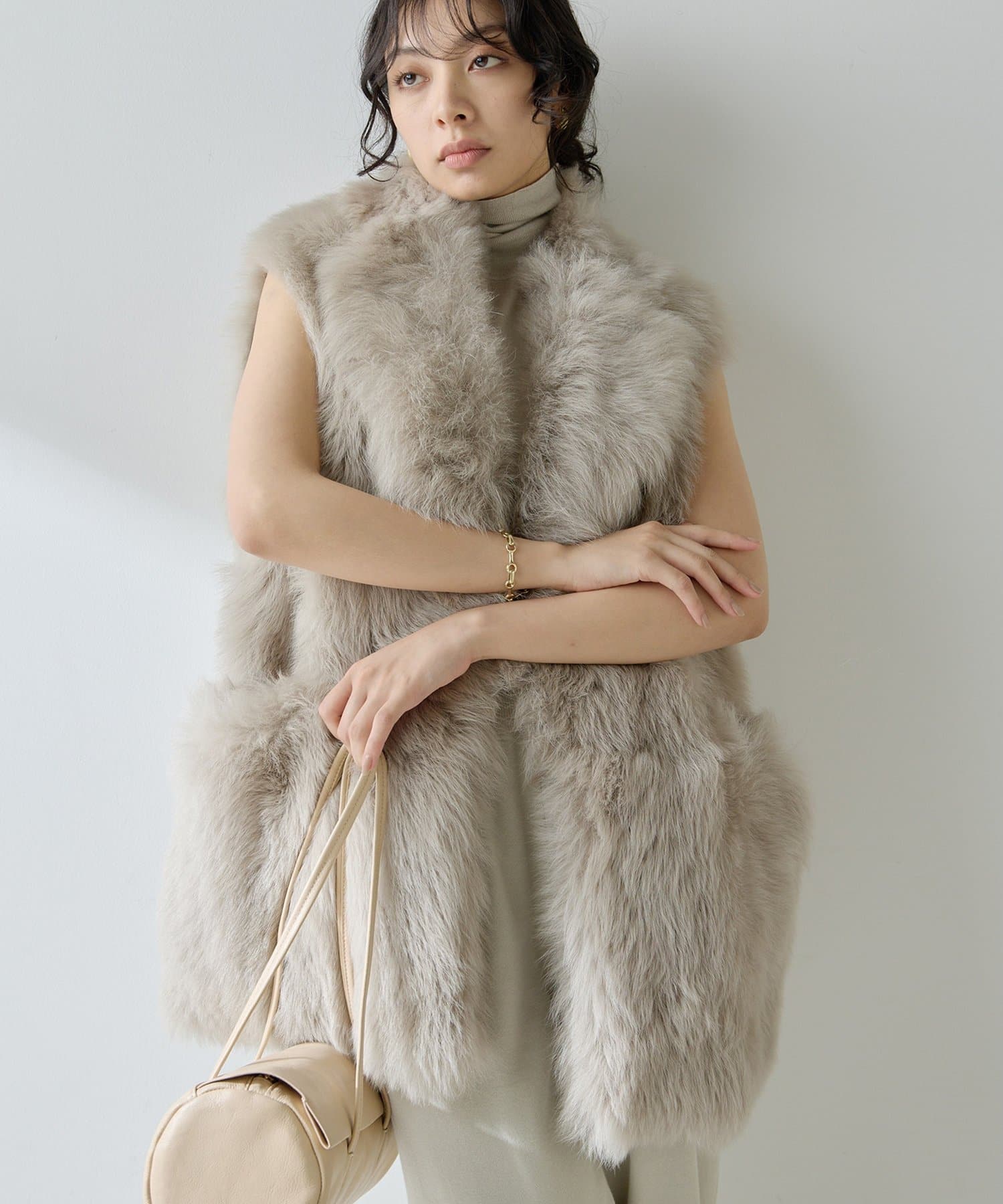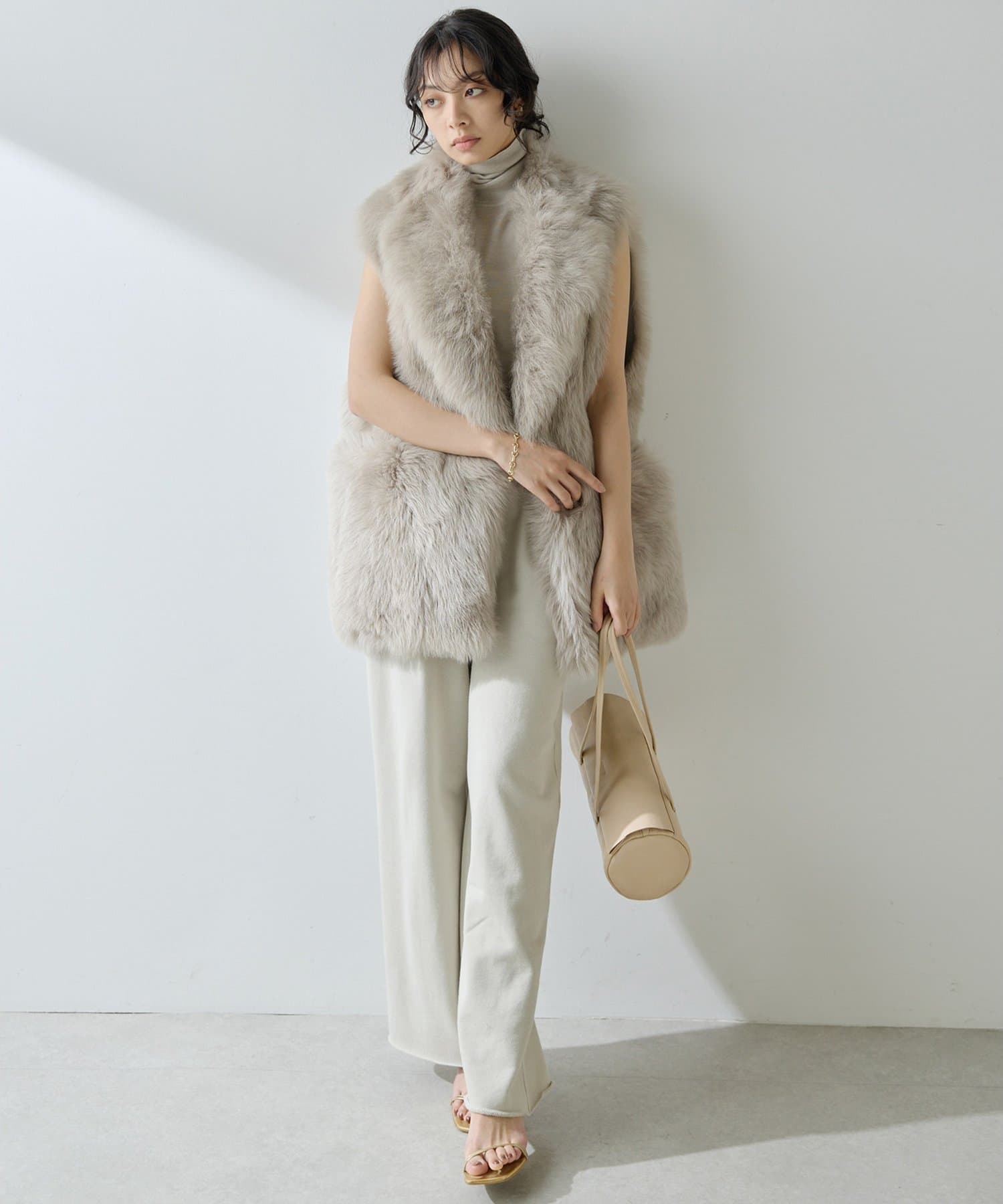 ■テーラーカラーを採用したオーバーサイズのファーベスト。
