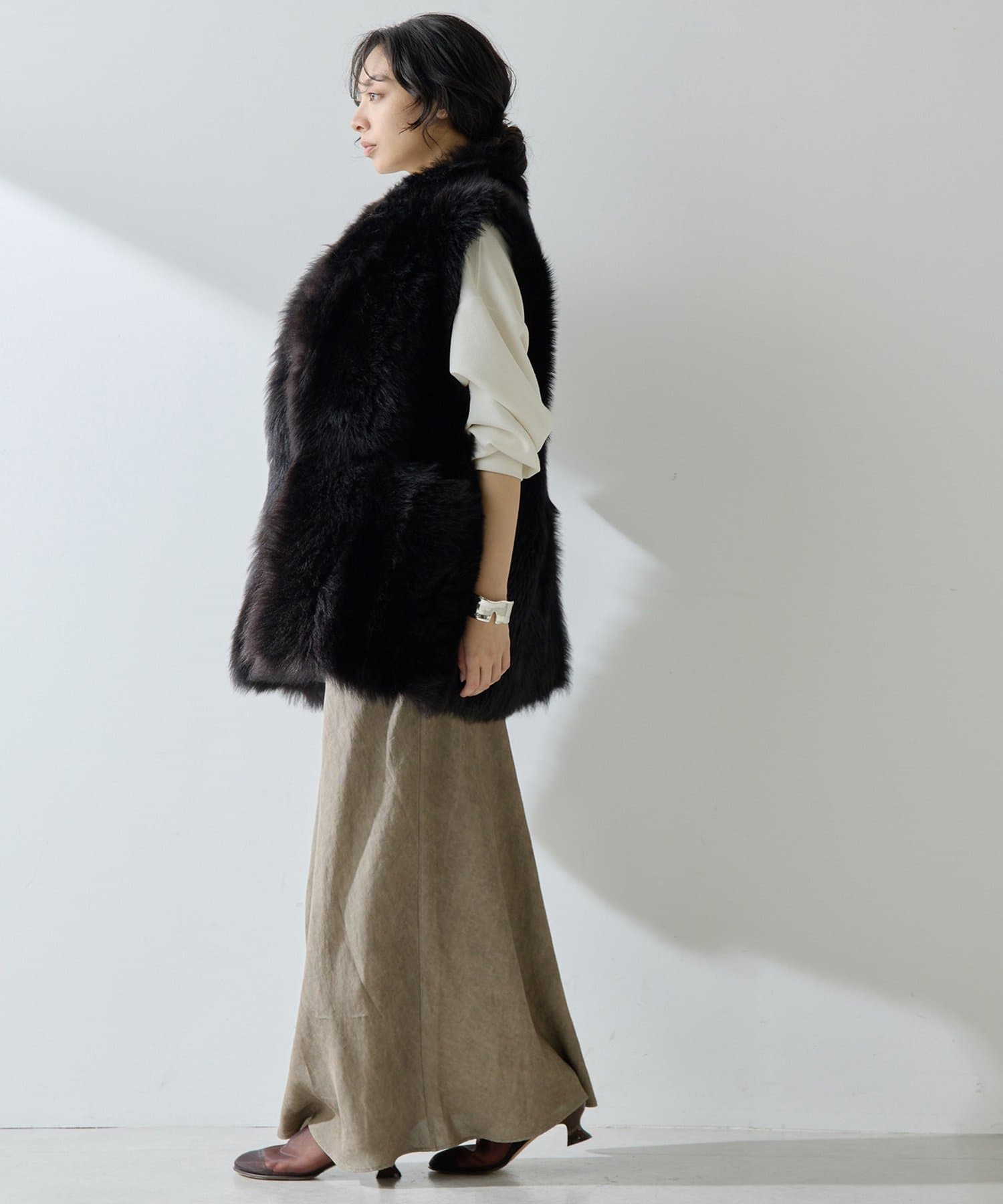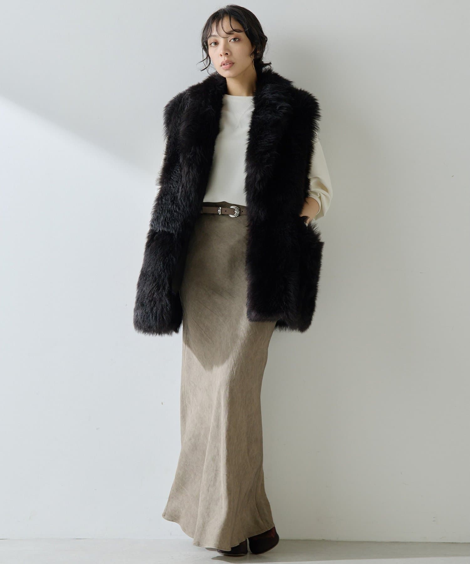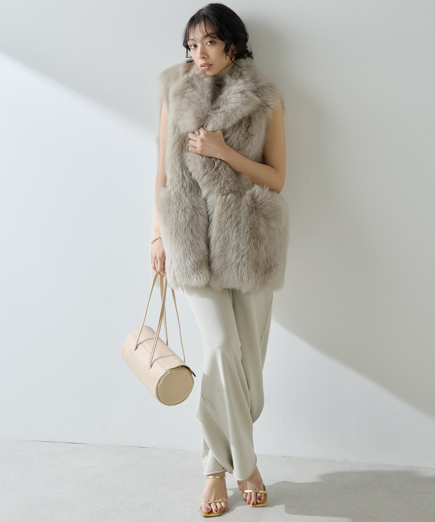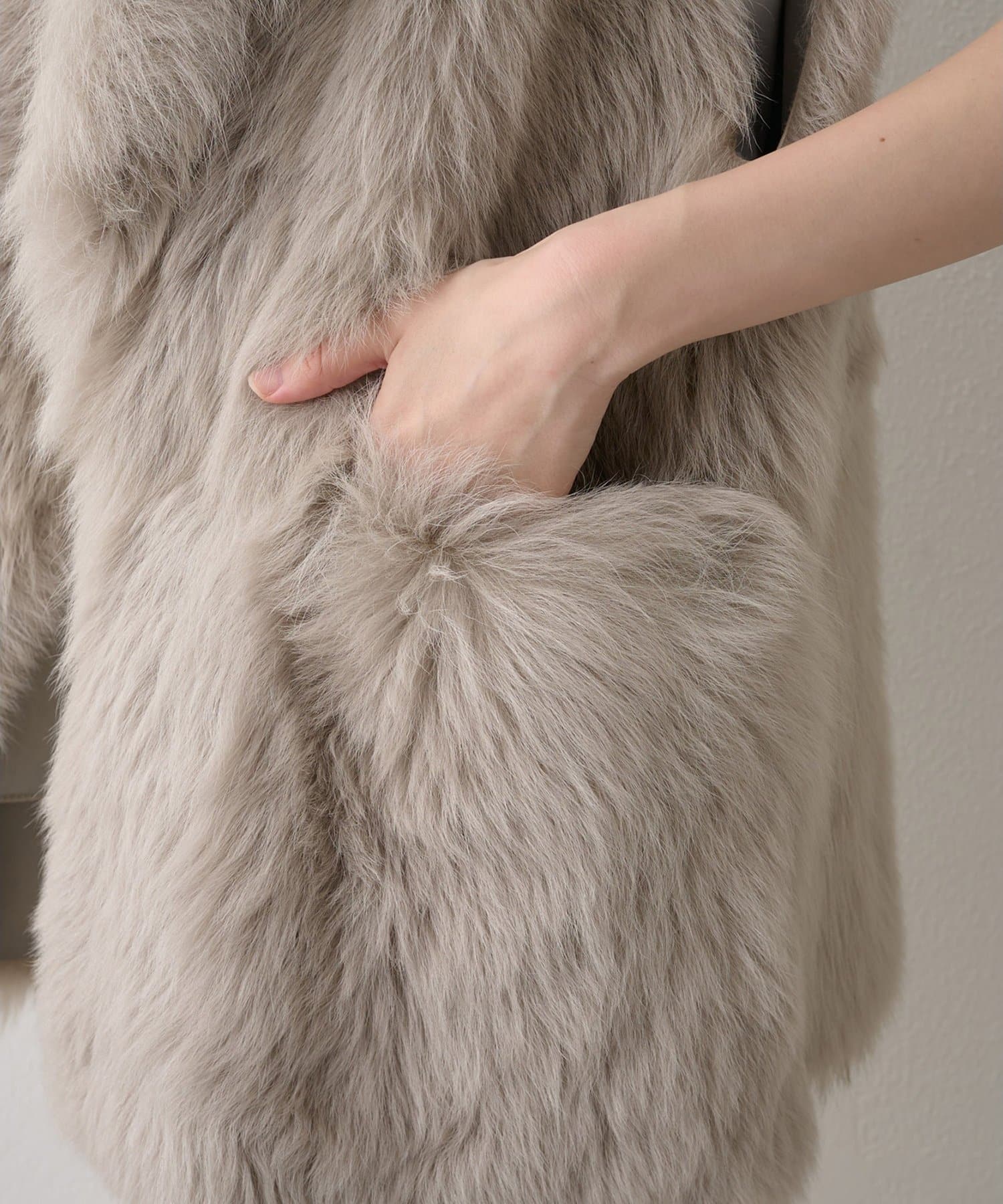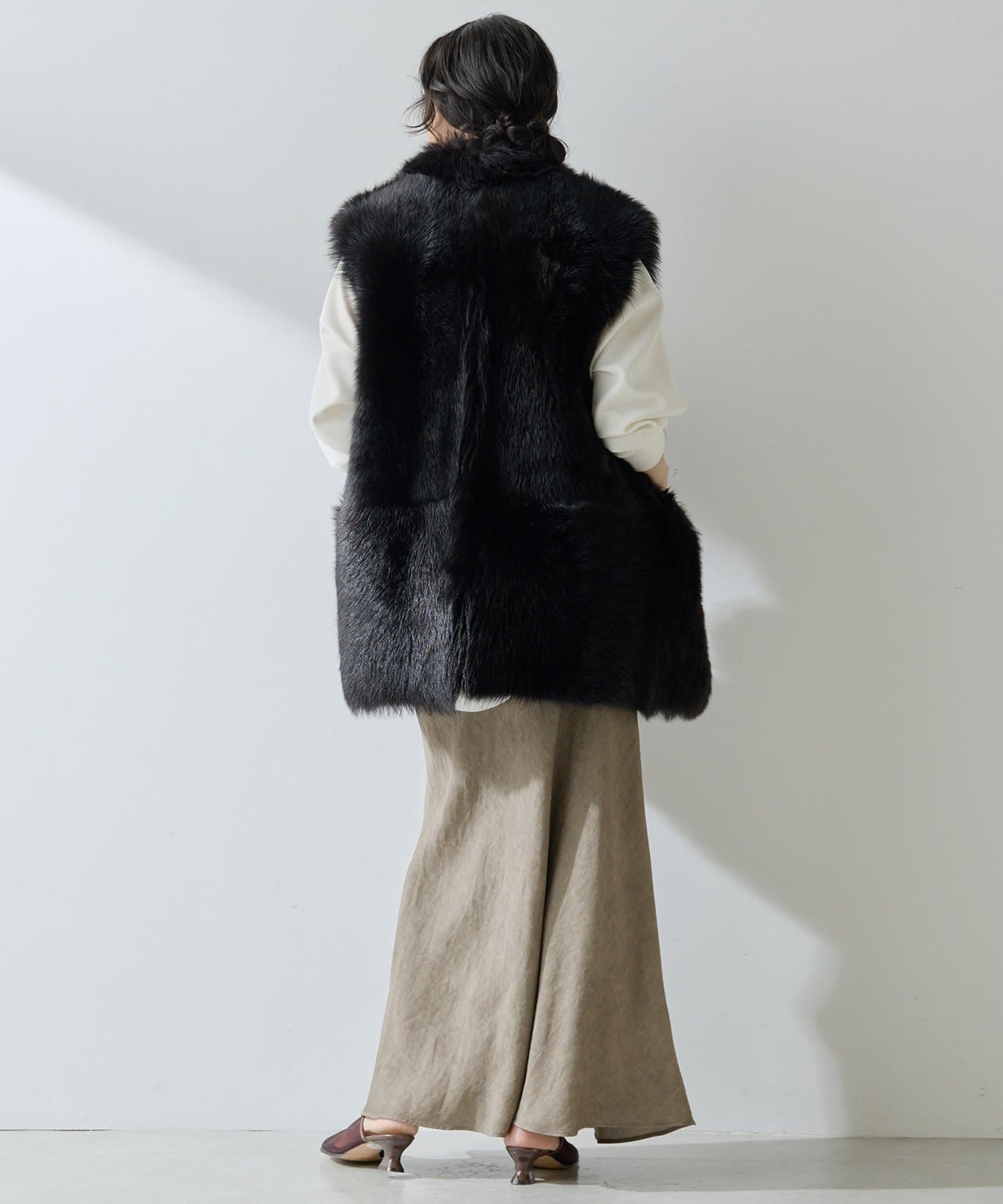 ■テーラーカラーを採用したオーバーサイズのファーベスト。