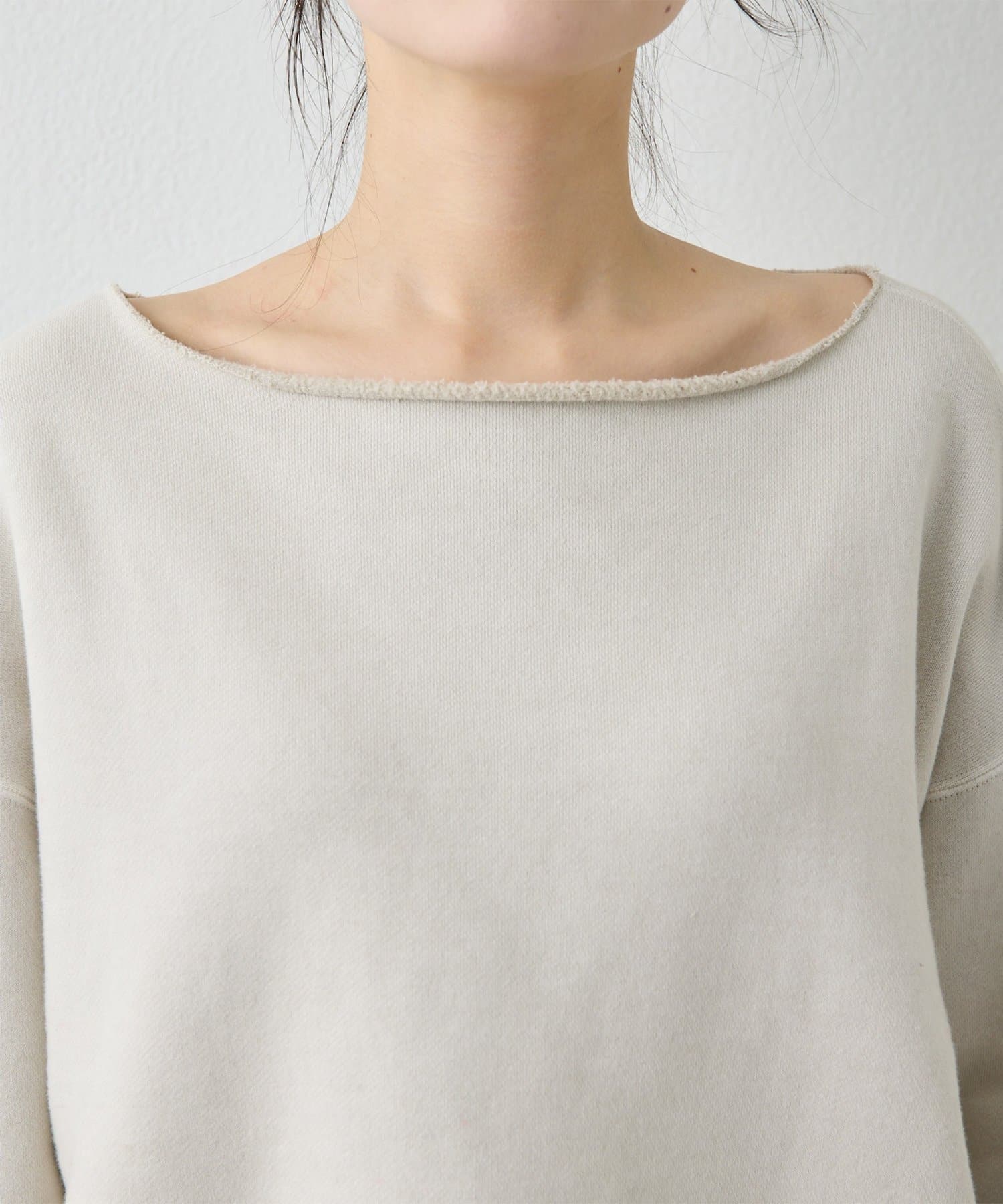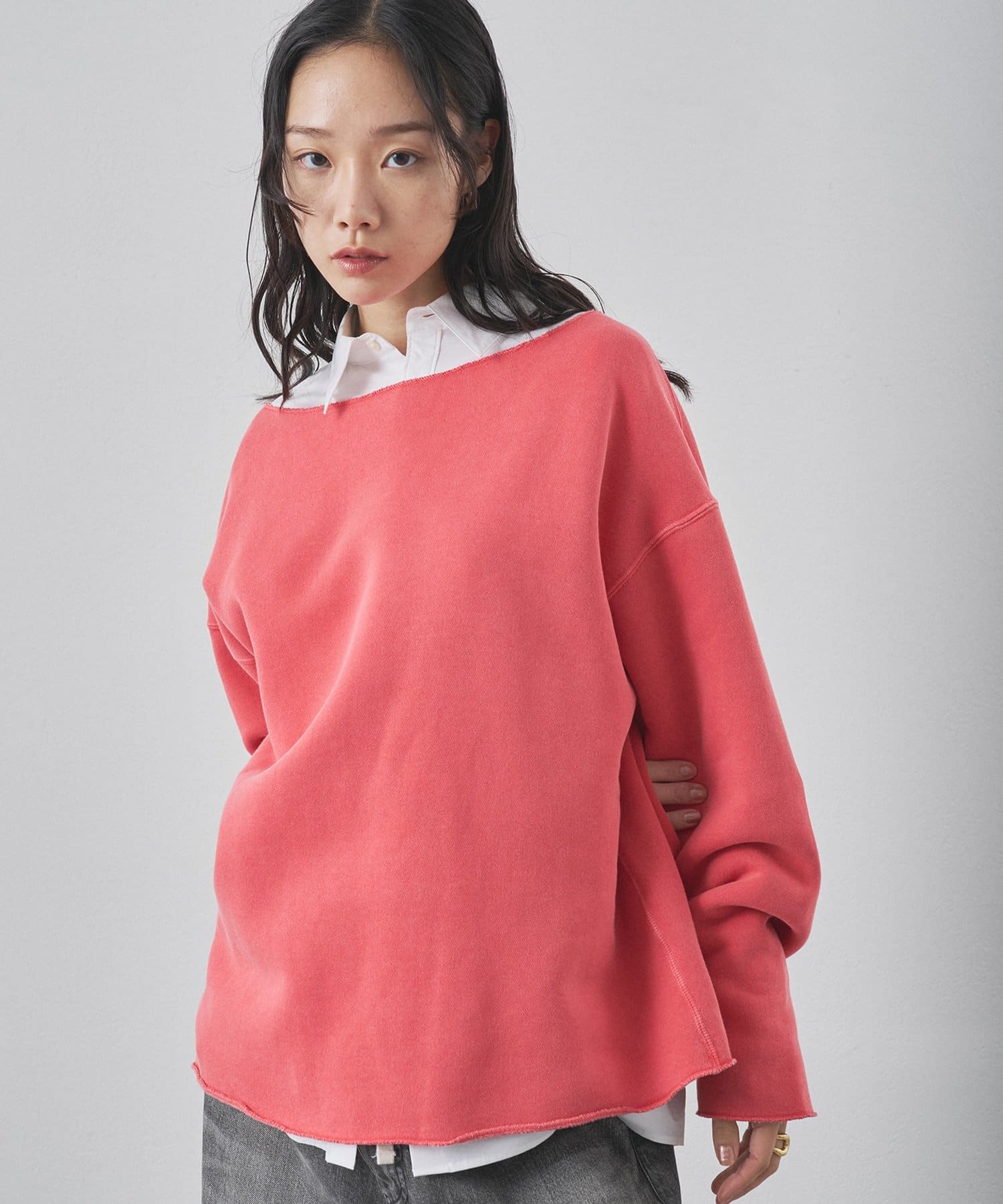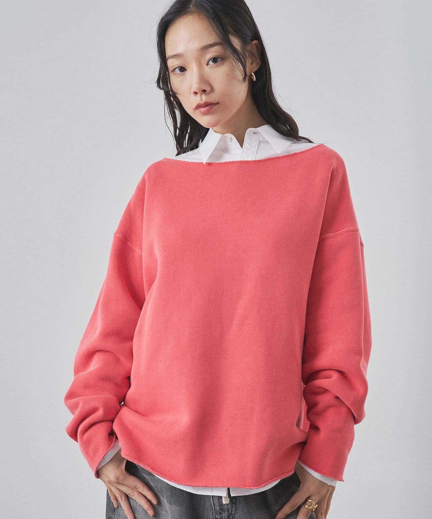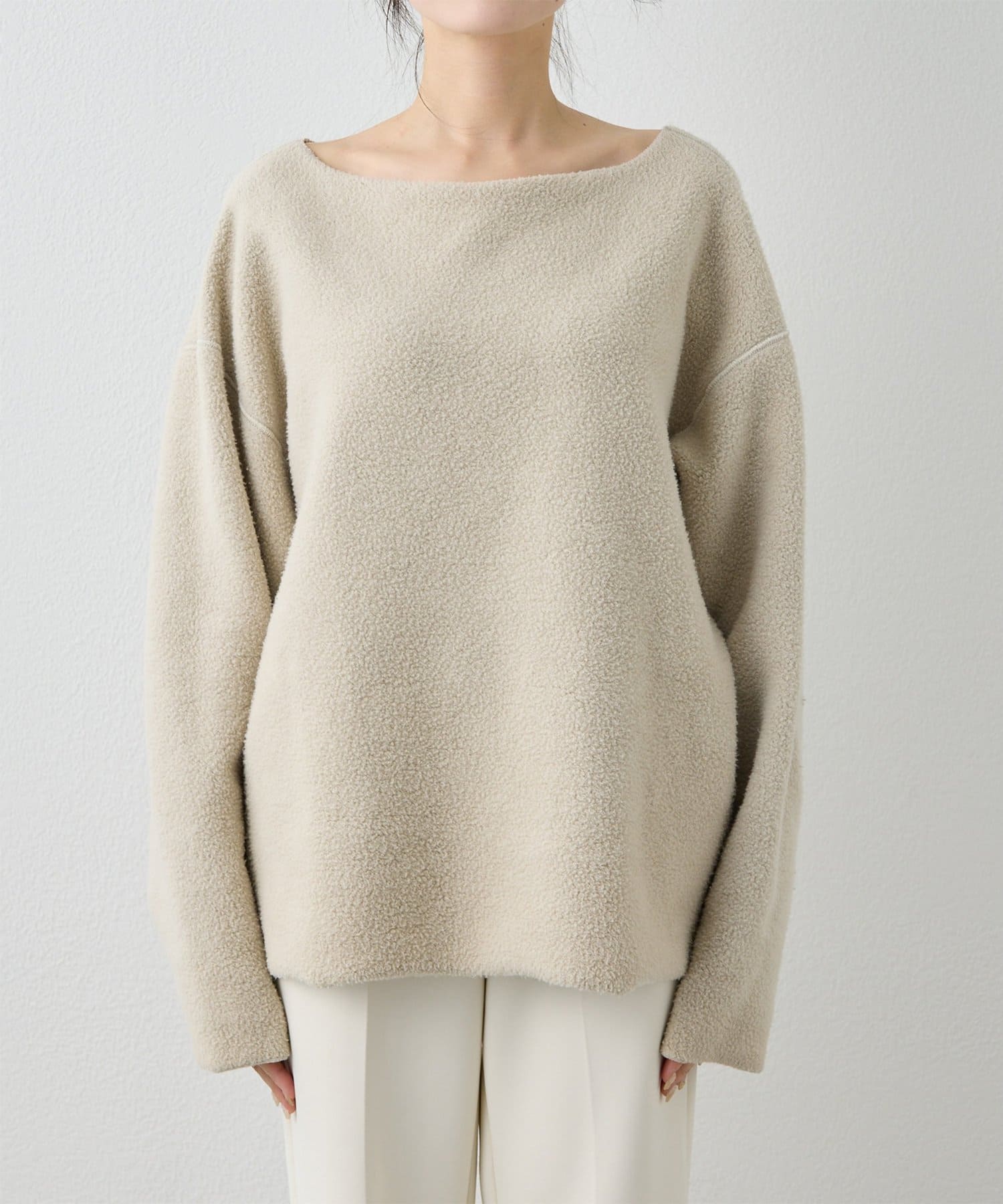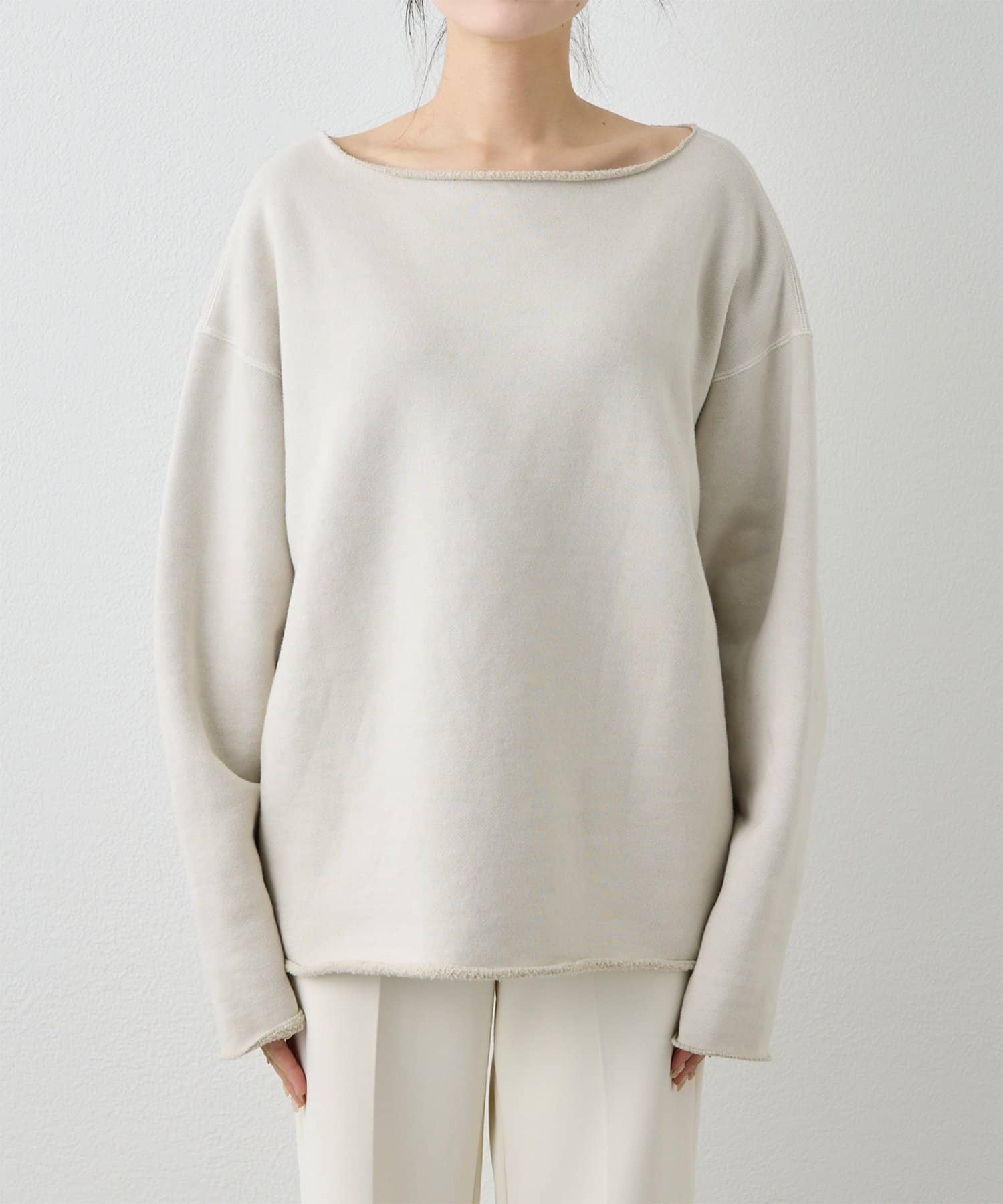 ■ゆったりとしたオーバーシルエットとボートネックが、リラックス感のある大人カジュアルを演出。