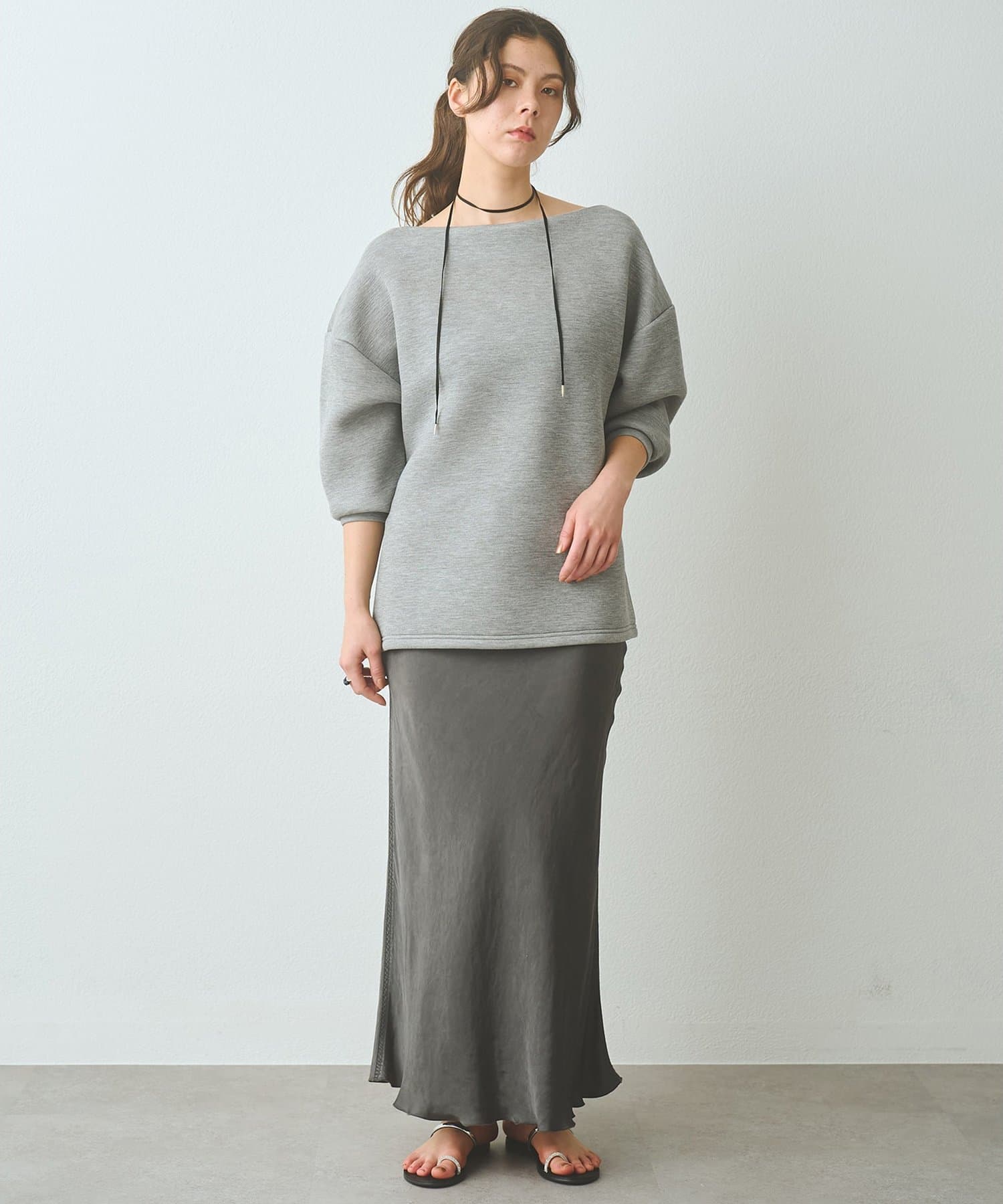 ■肩のラインをさりげなく引き立てるオフショルデザインが、女性らしさとモード感を両立。
