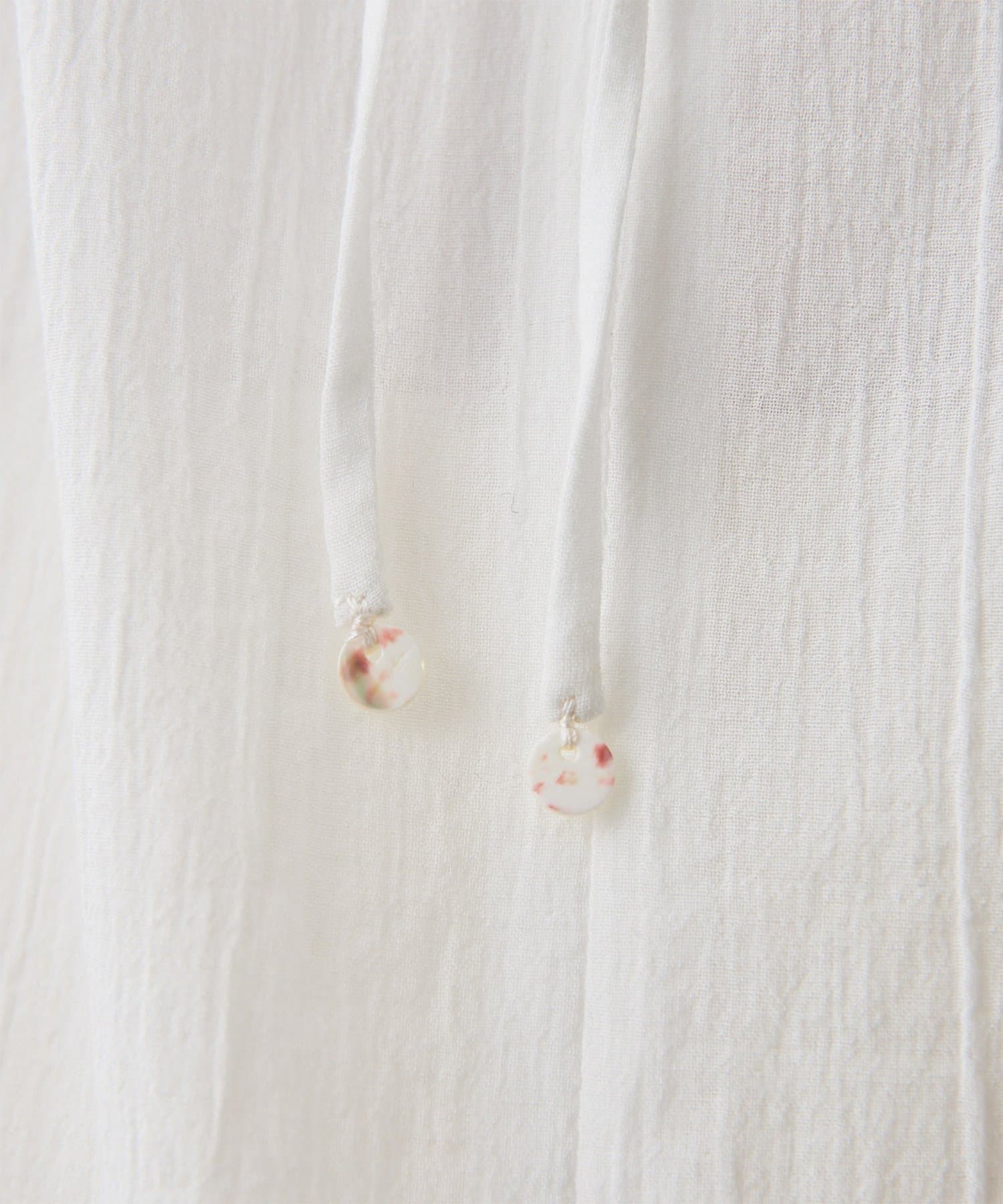 ■レースを袖口にあしらい、ネックひもの先には貝を飾りさりげないポイントに。