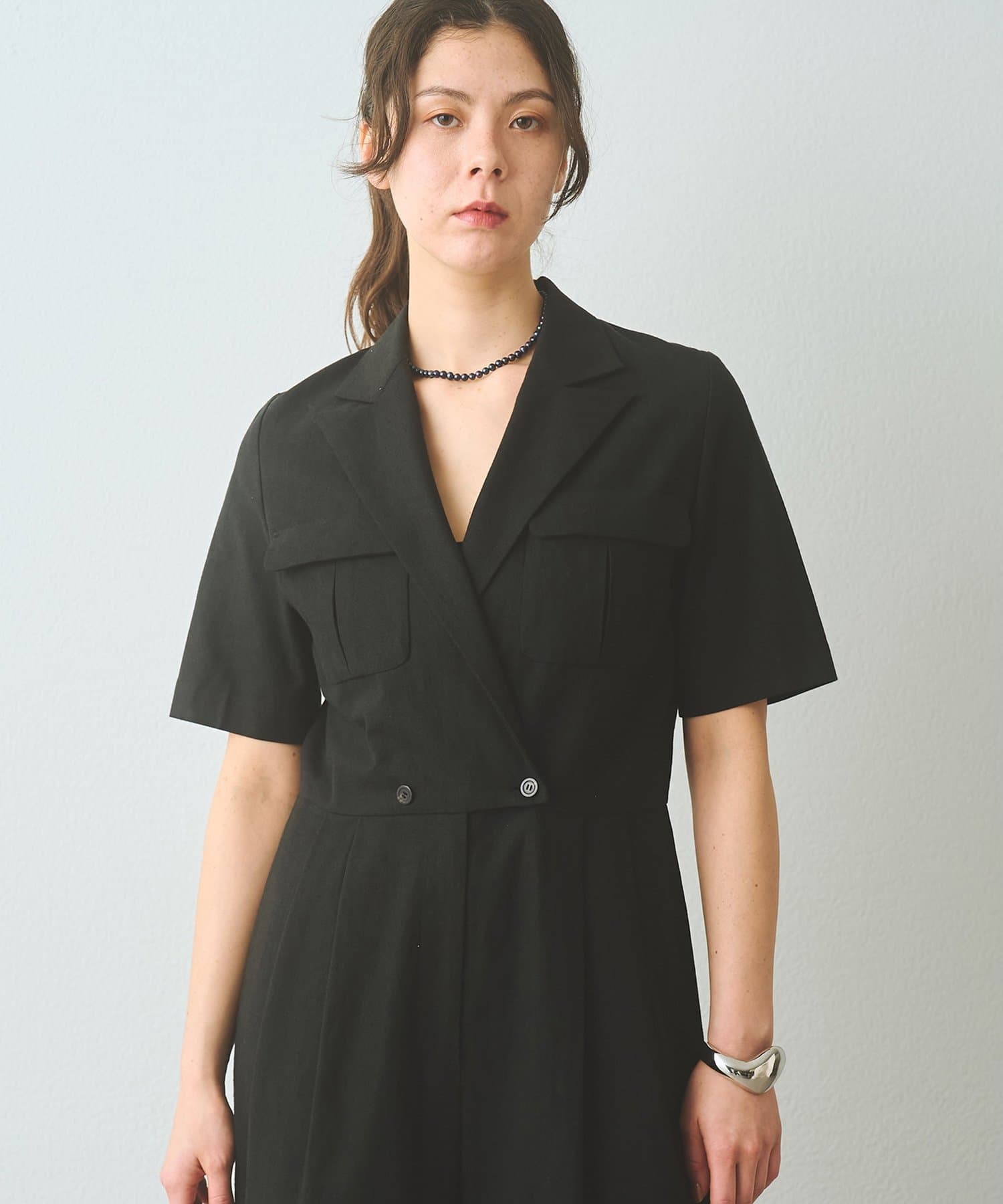 ■オープンカラーデザインと高めのウエスト切り替えでスタイリッシュな印象に。