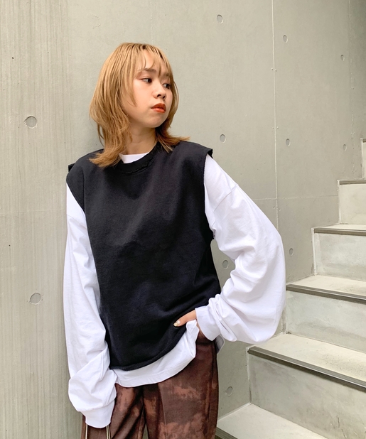 ・裾や首元のダメージ加工がポイント。他にはない、個性的でオシャレな雰囲気を演出。