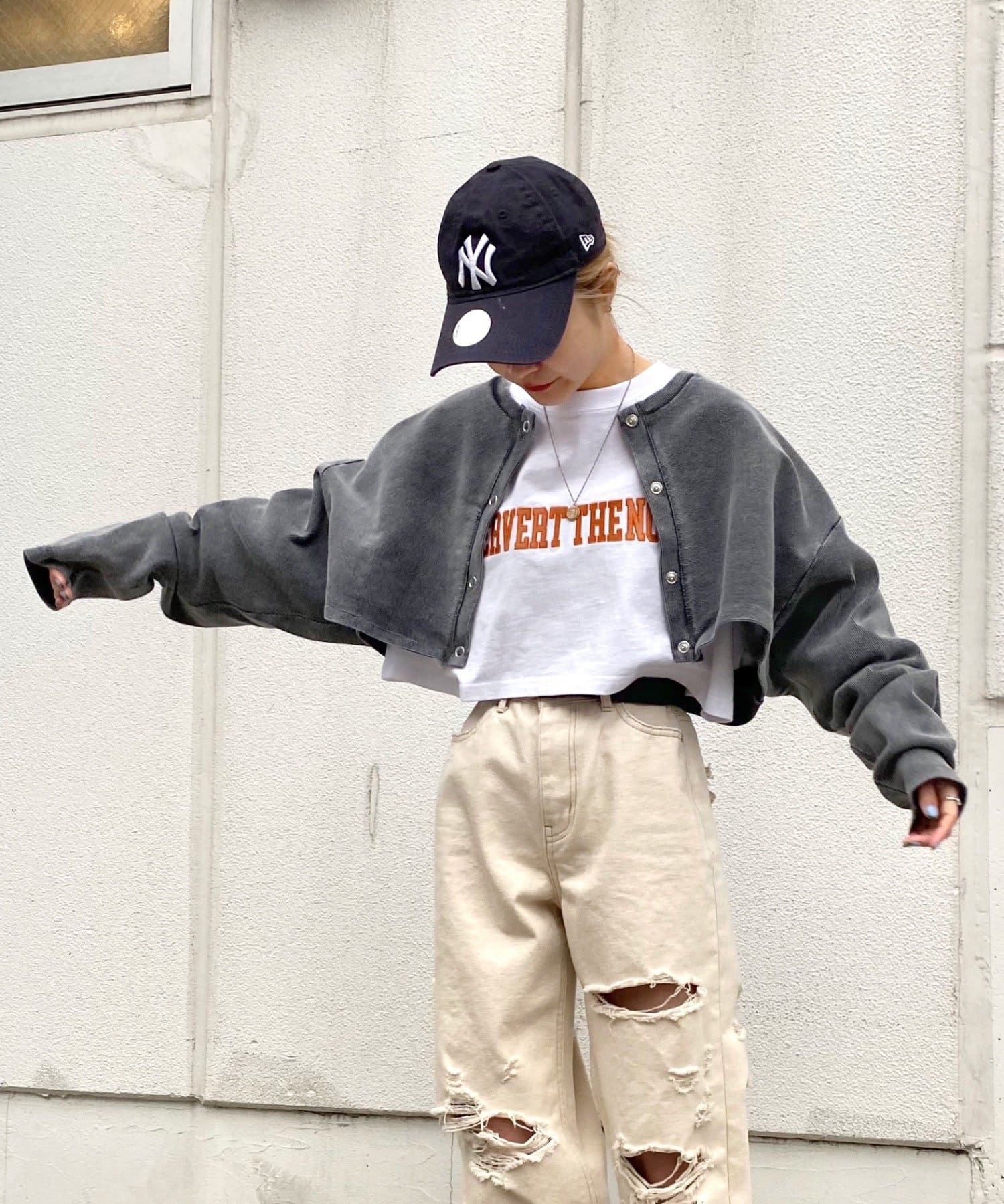 ・短丈なので、レイヤードスタイルにも◎。シャツやロンT、Tシャツなど好きな組み合わせで是非。