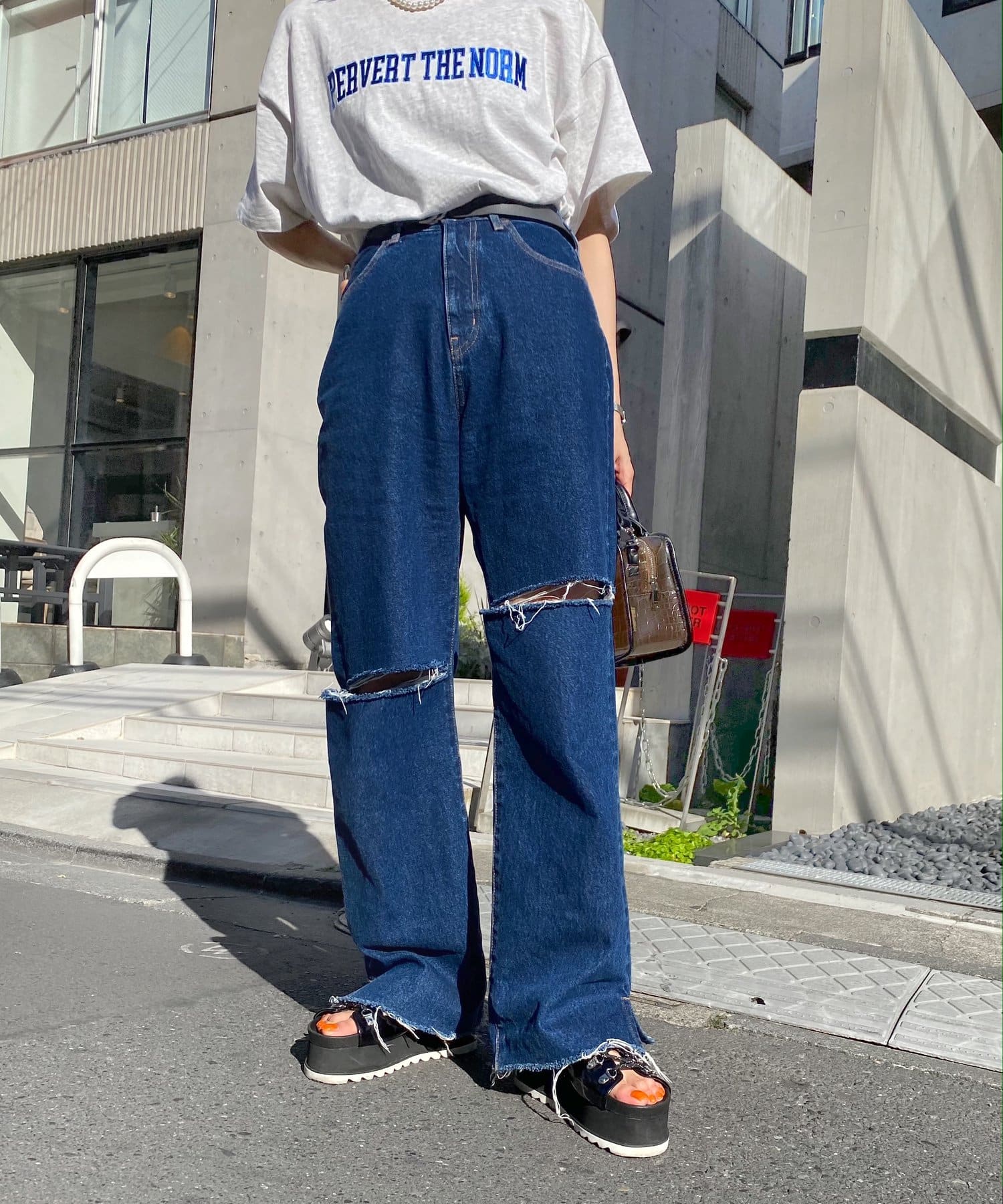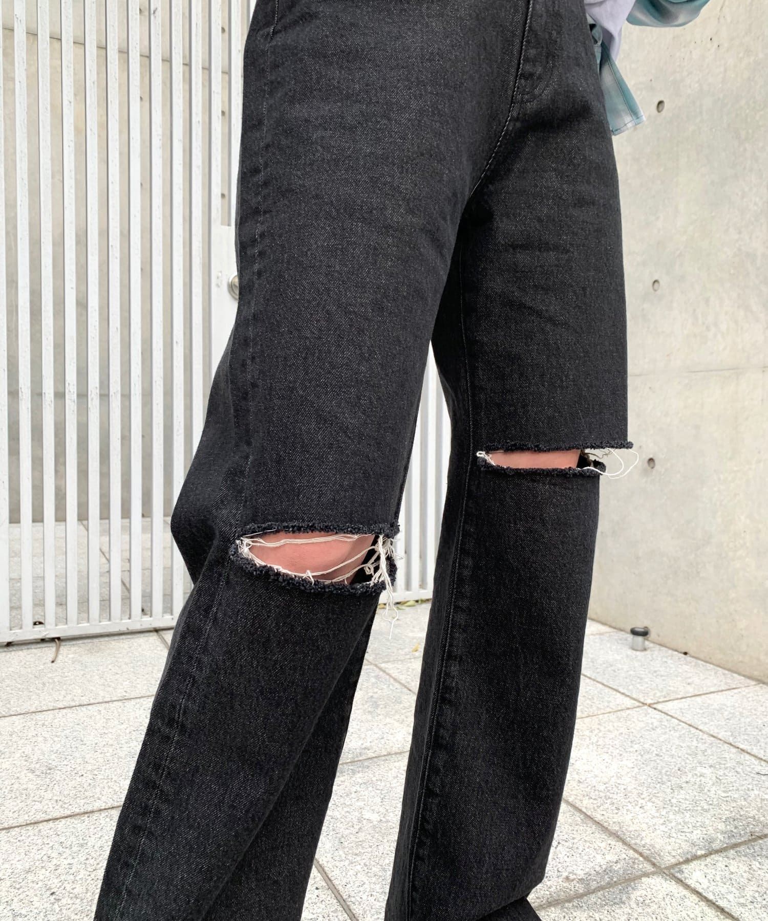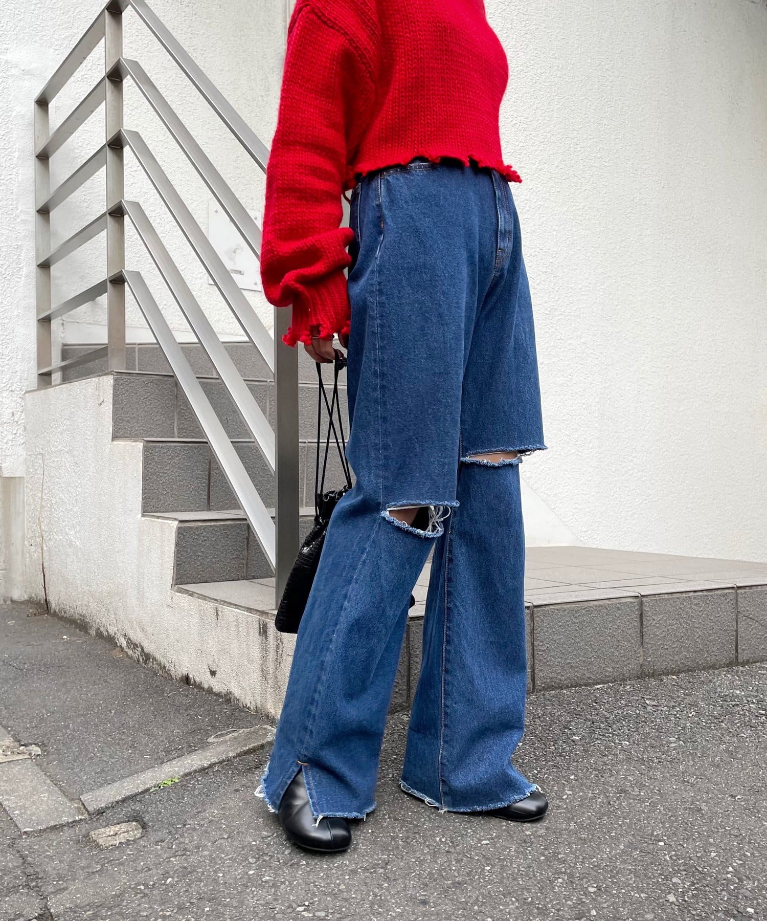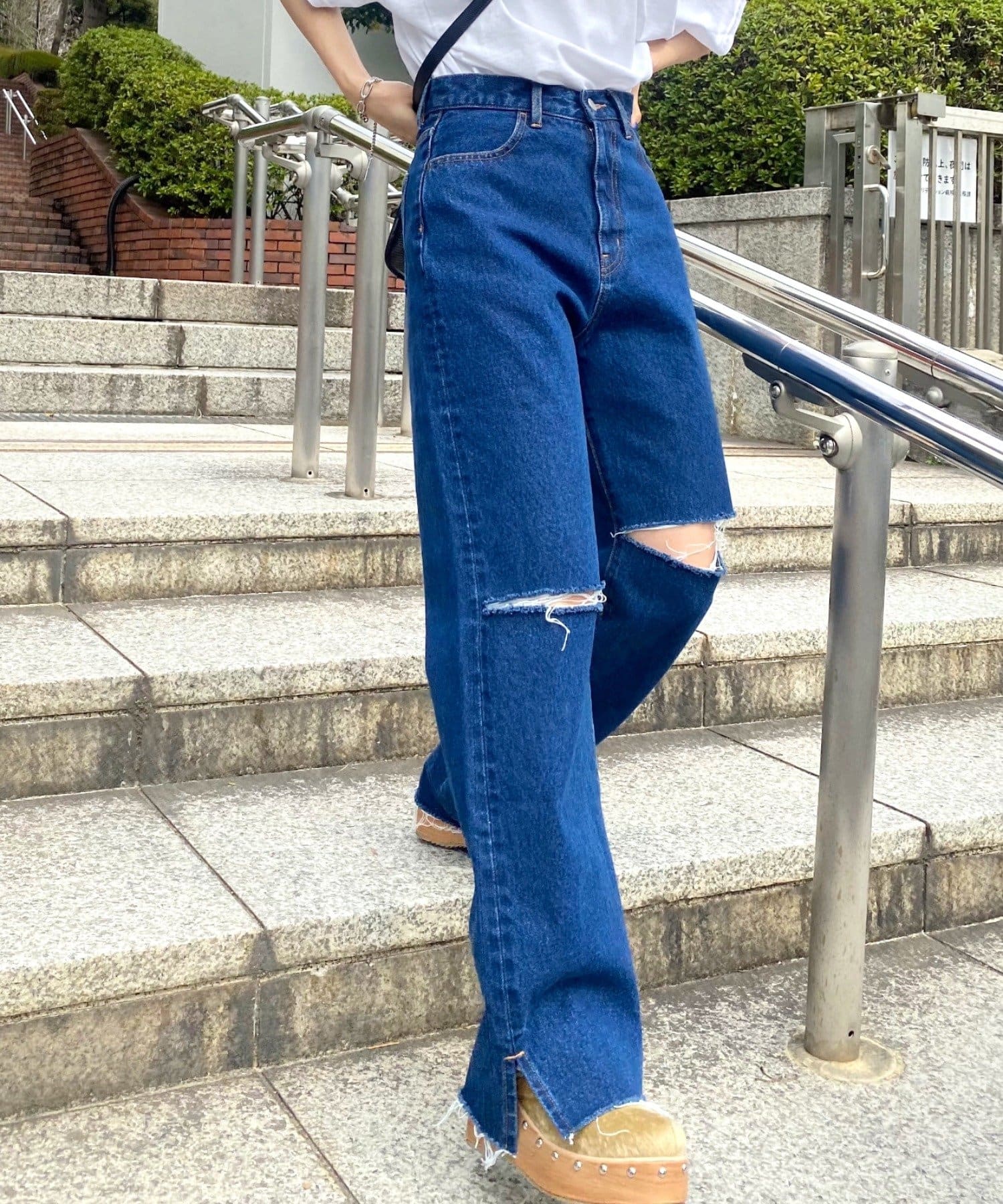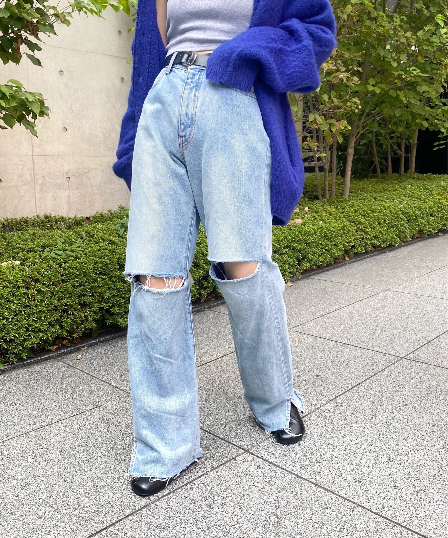 膝の大胆なカッティング+裾のスリットがコーデのポイントになるダメージデニム
