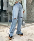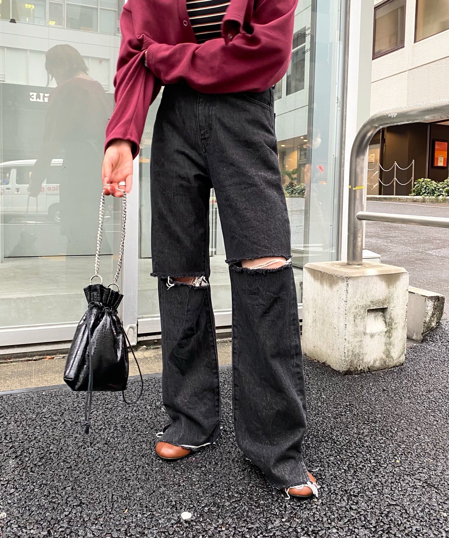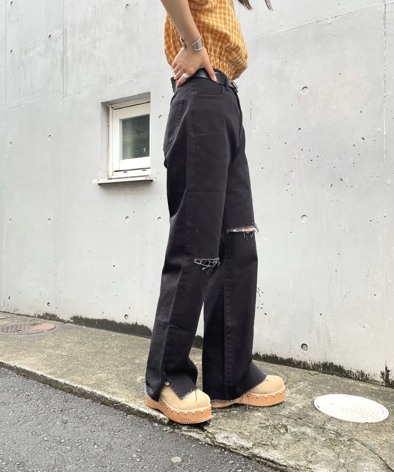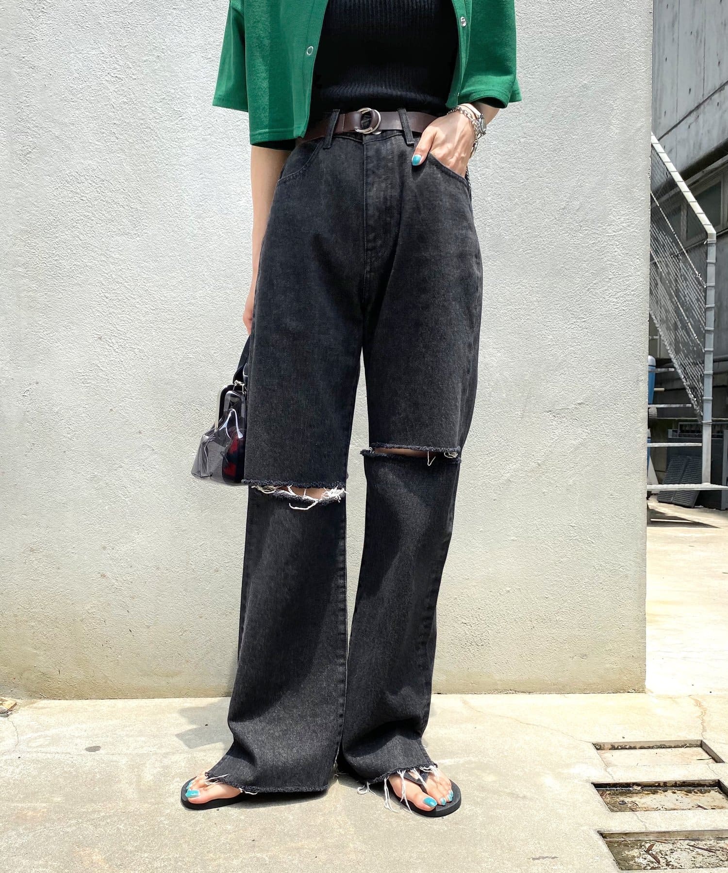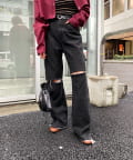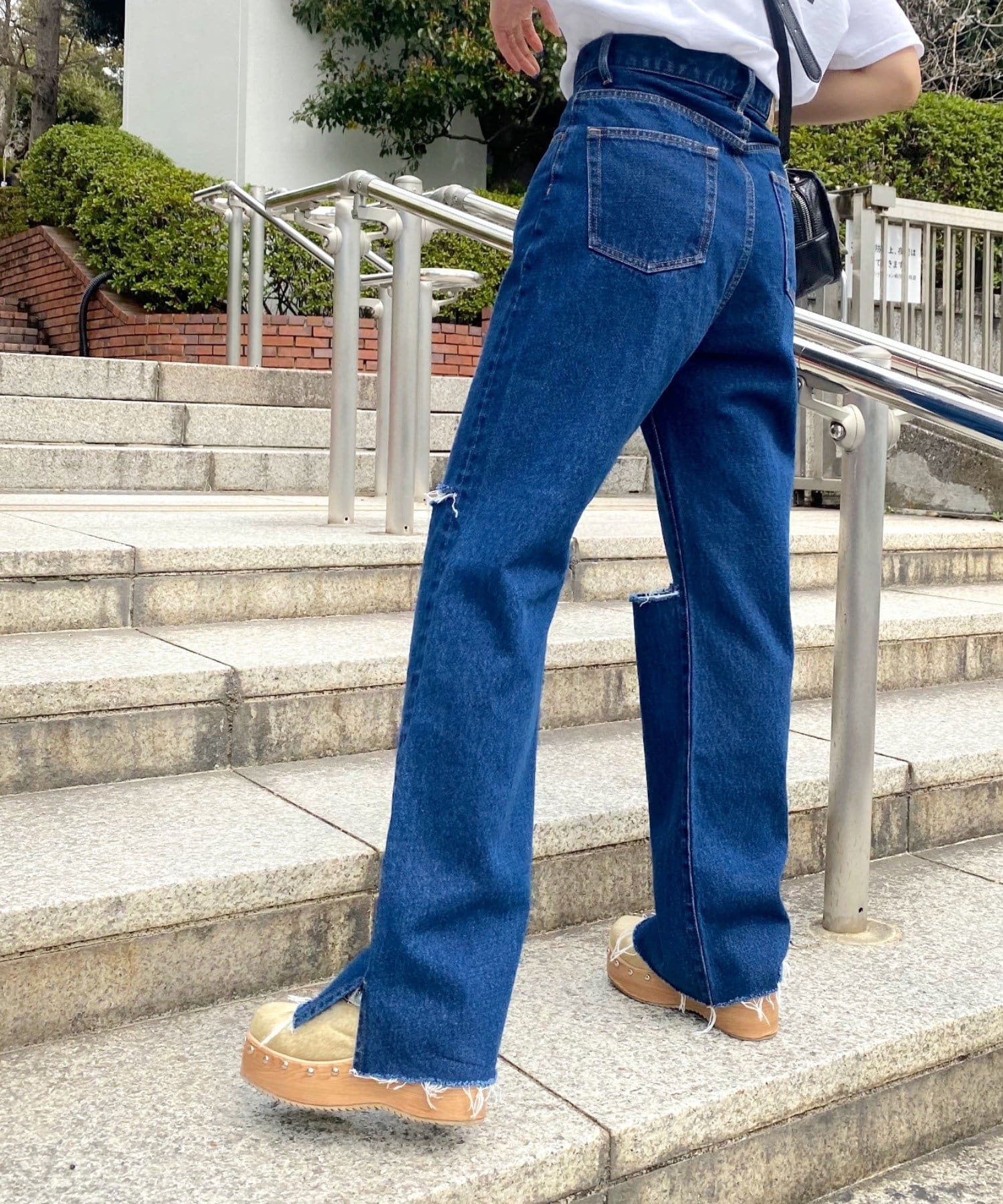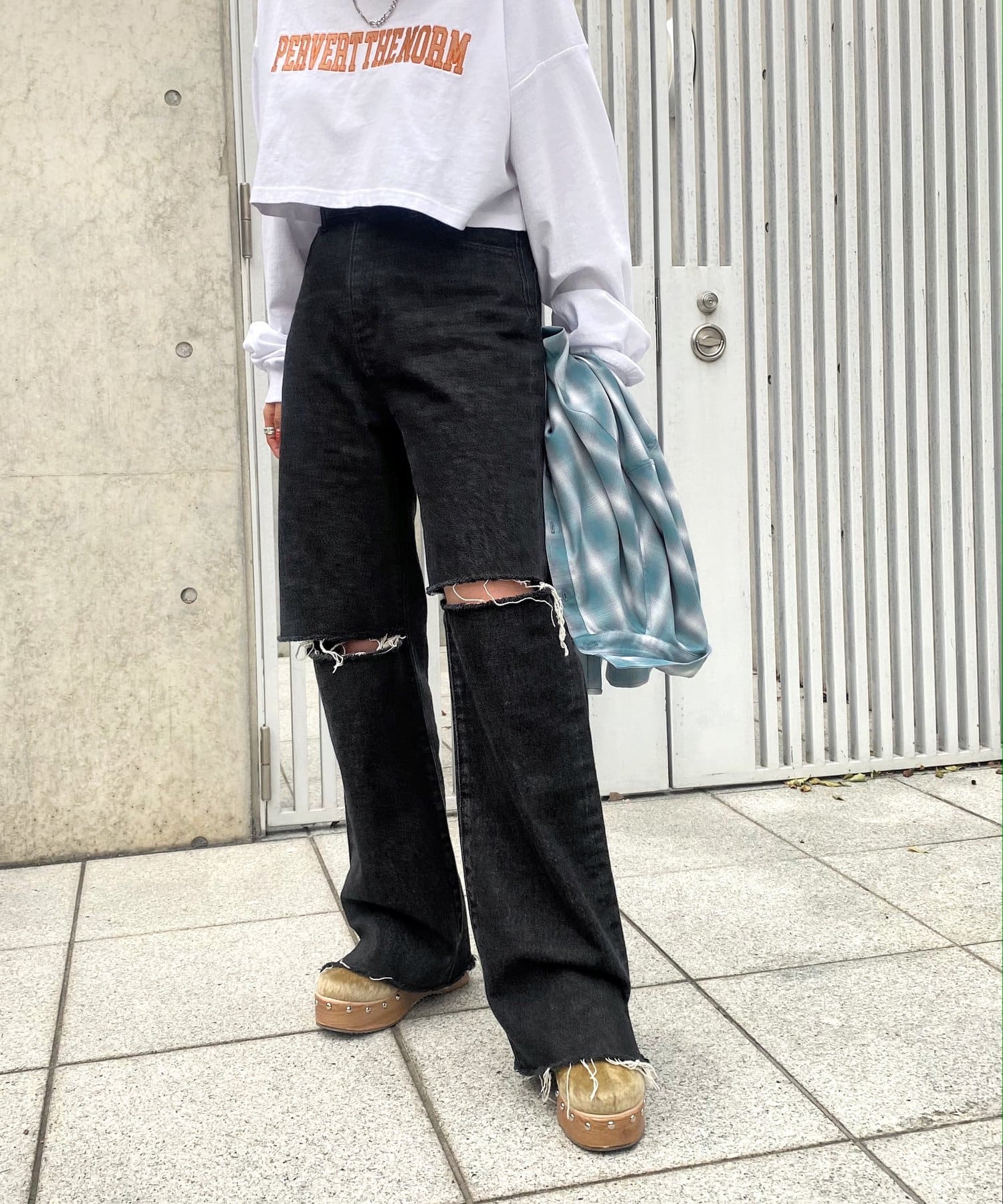 膝の大胆なカッティング+裾のスリットがコーデのポイントになるダメージデニム