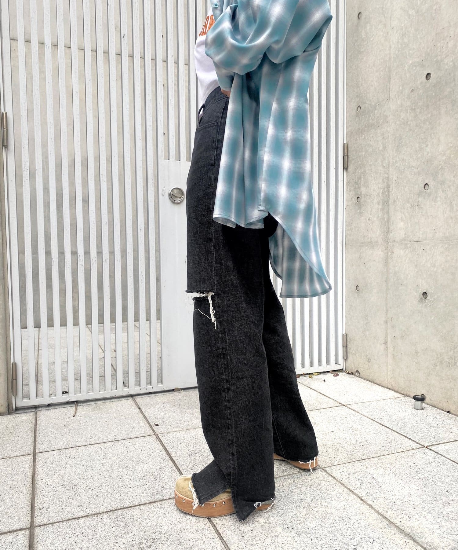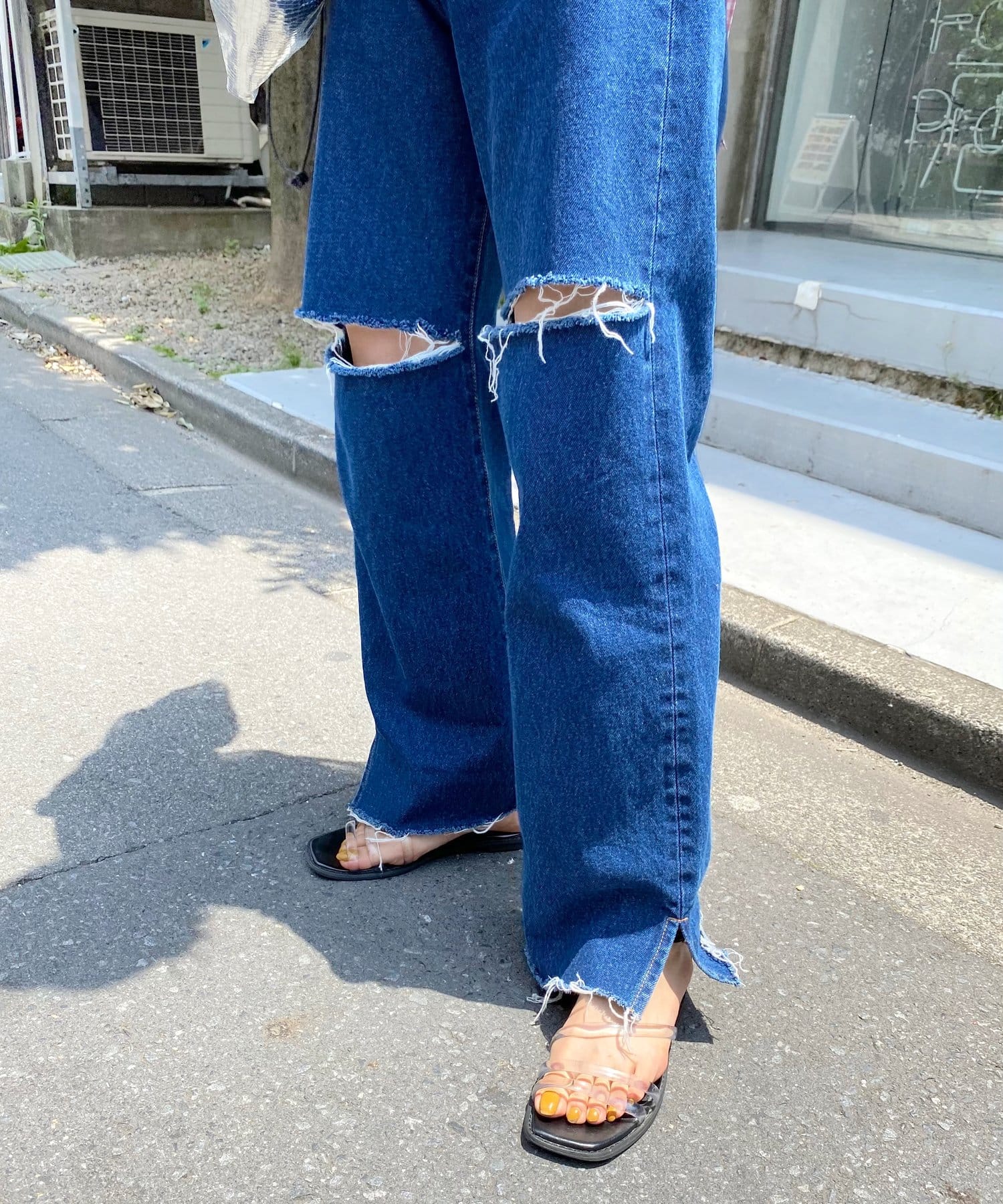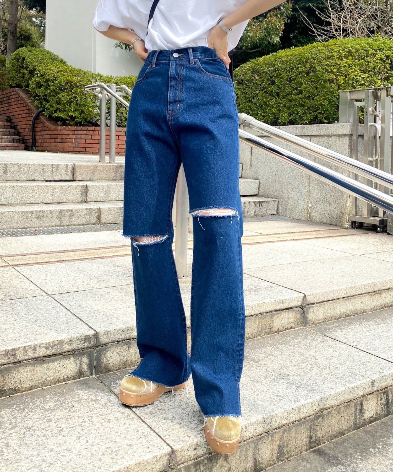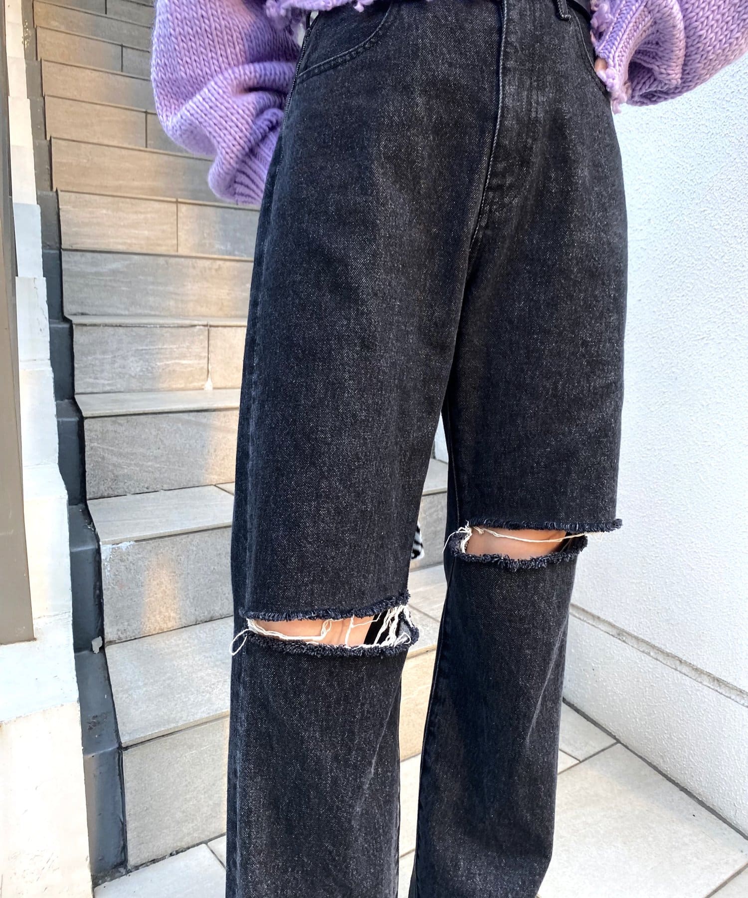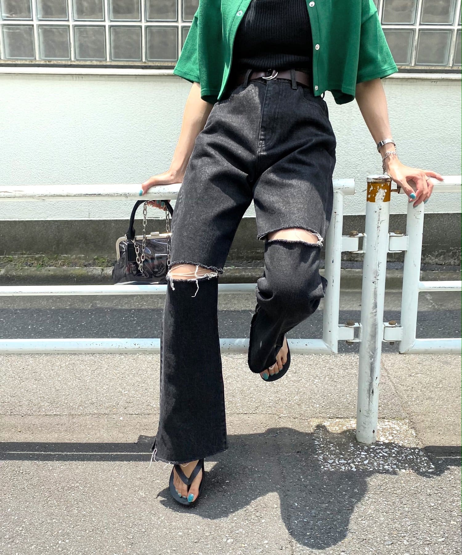 膝の大胆なカッティング+裾のスリットがコーデのポイントになるダメージデニム