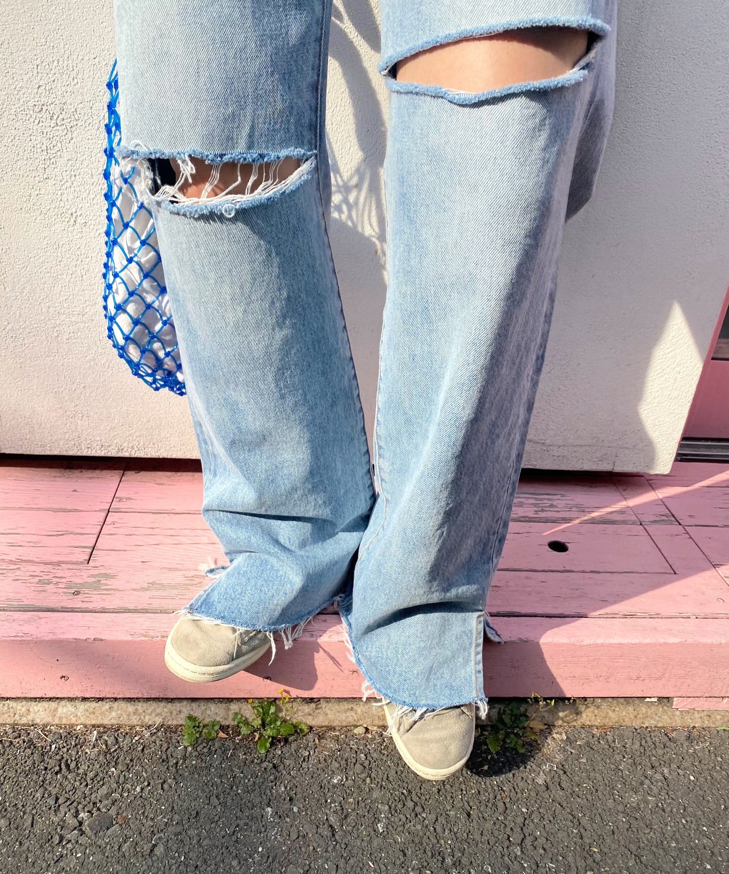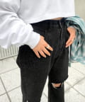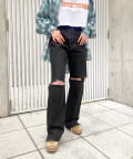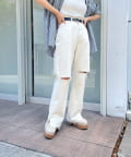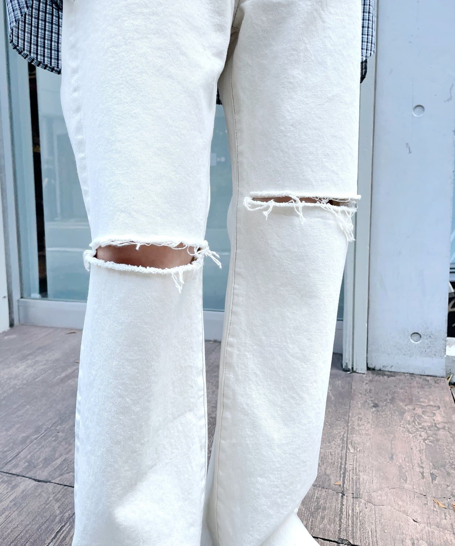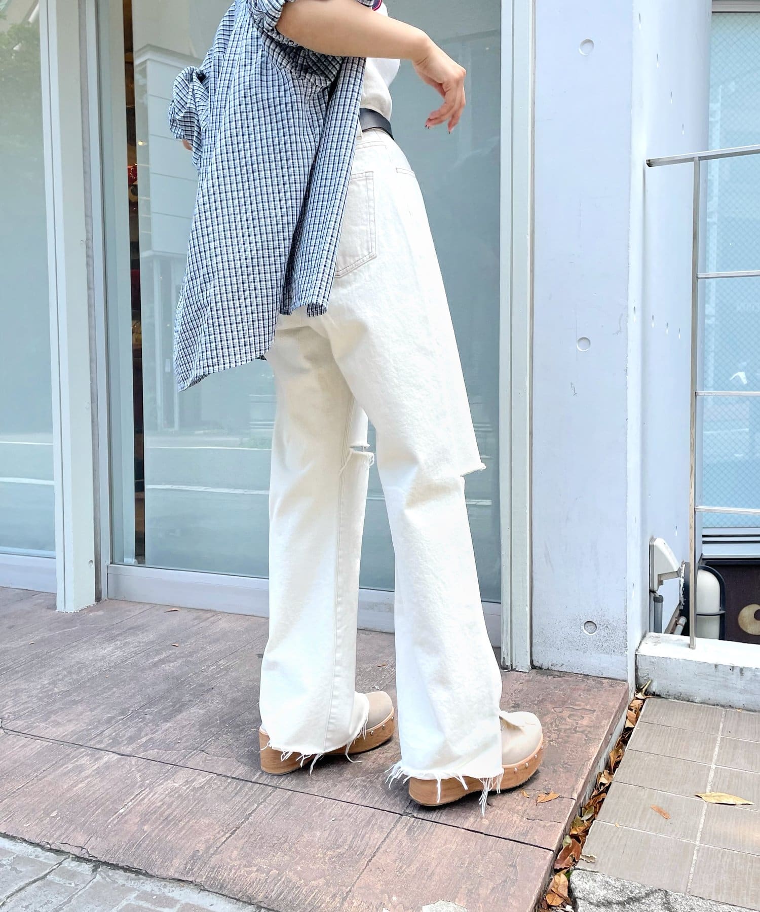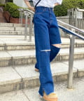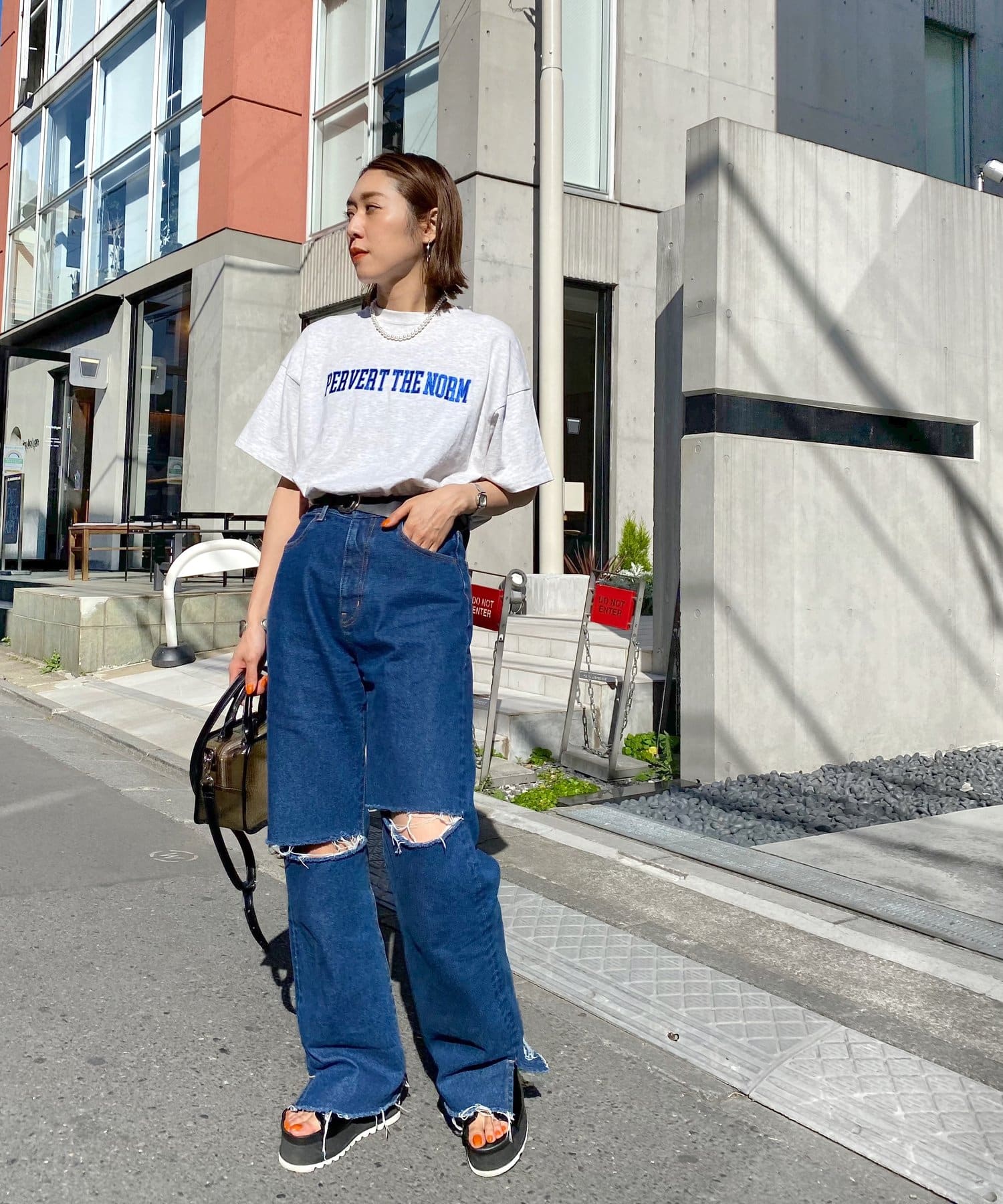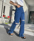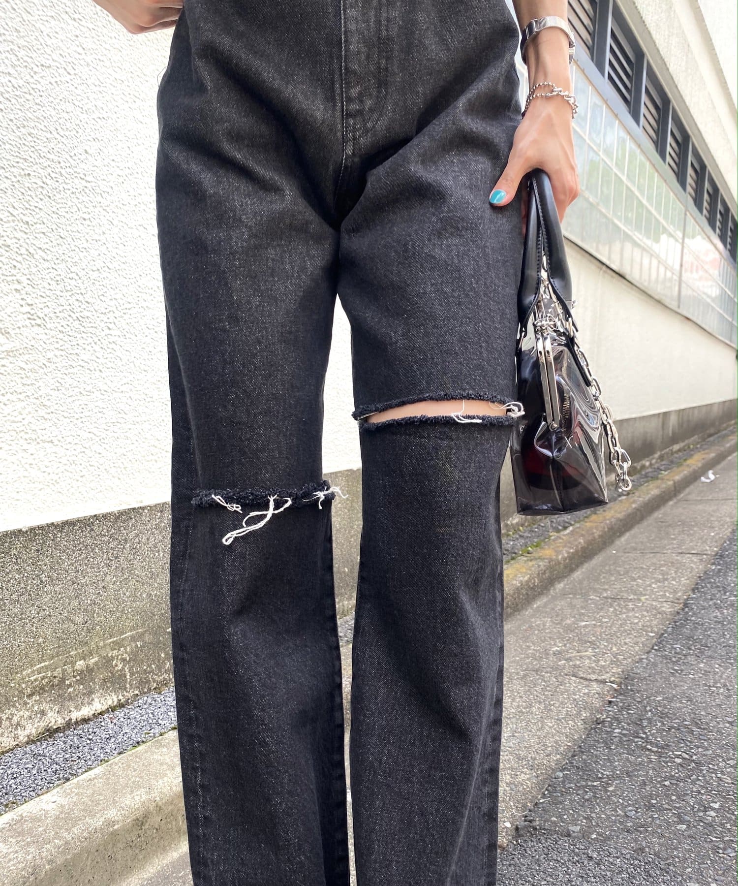 膝の大胆なカッティング+裾のスリットがコーデのポイントになるダメージデニム