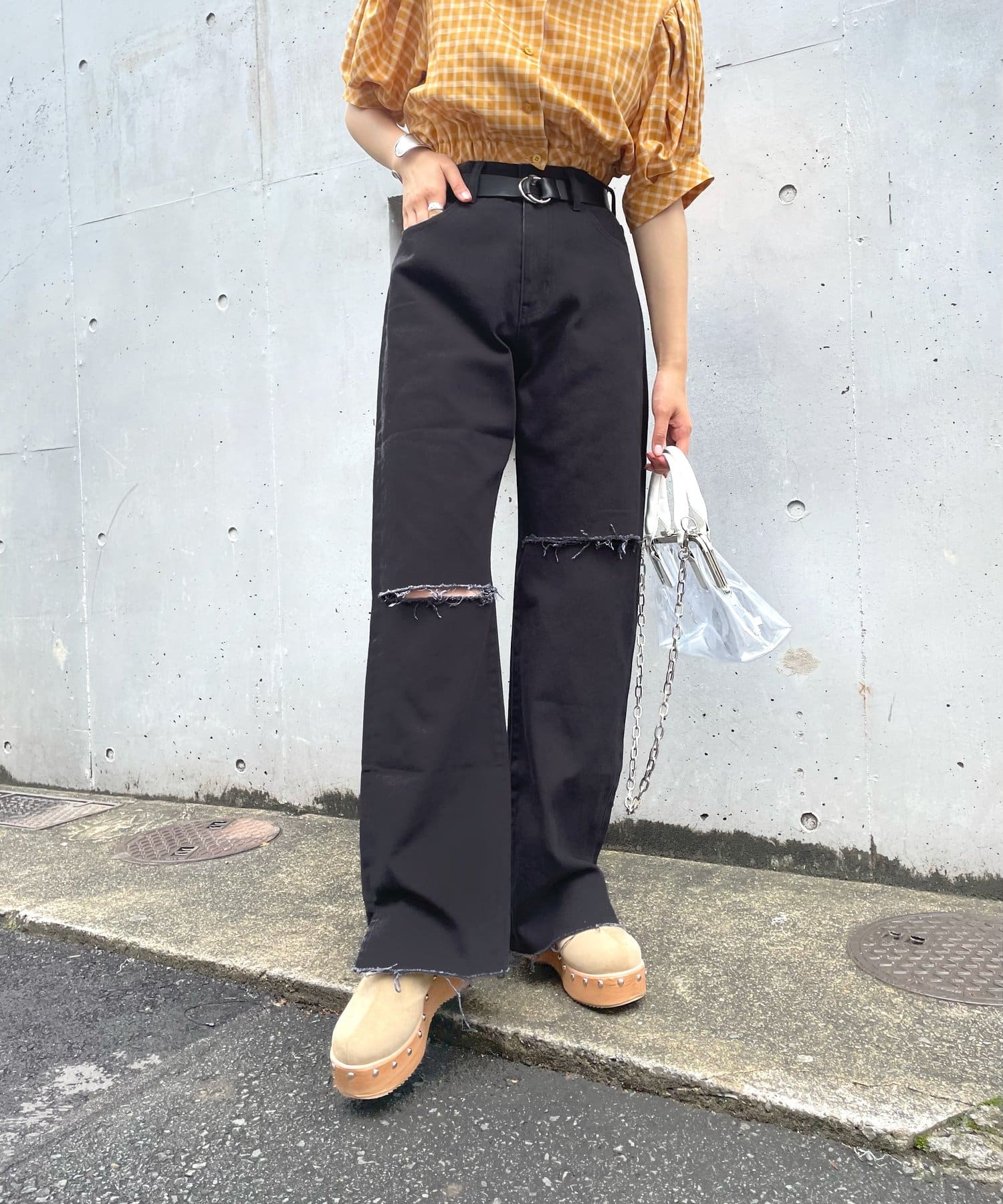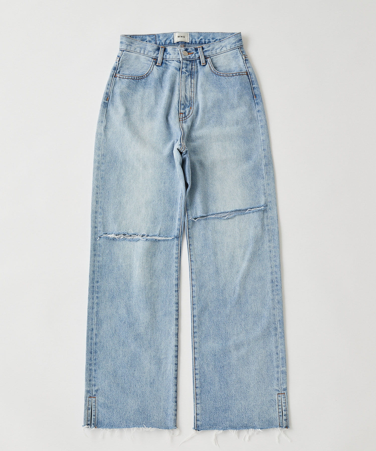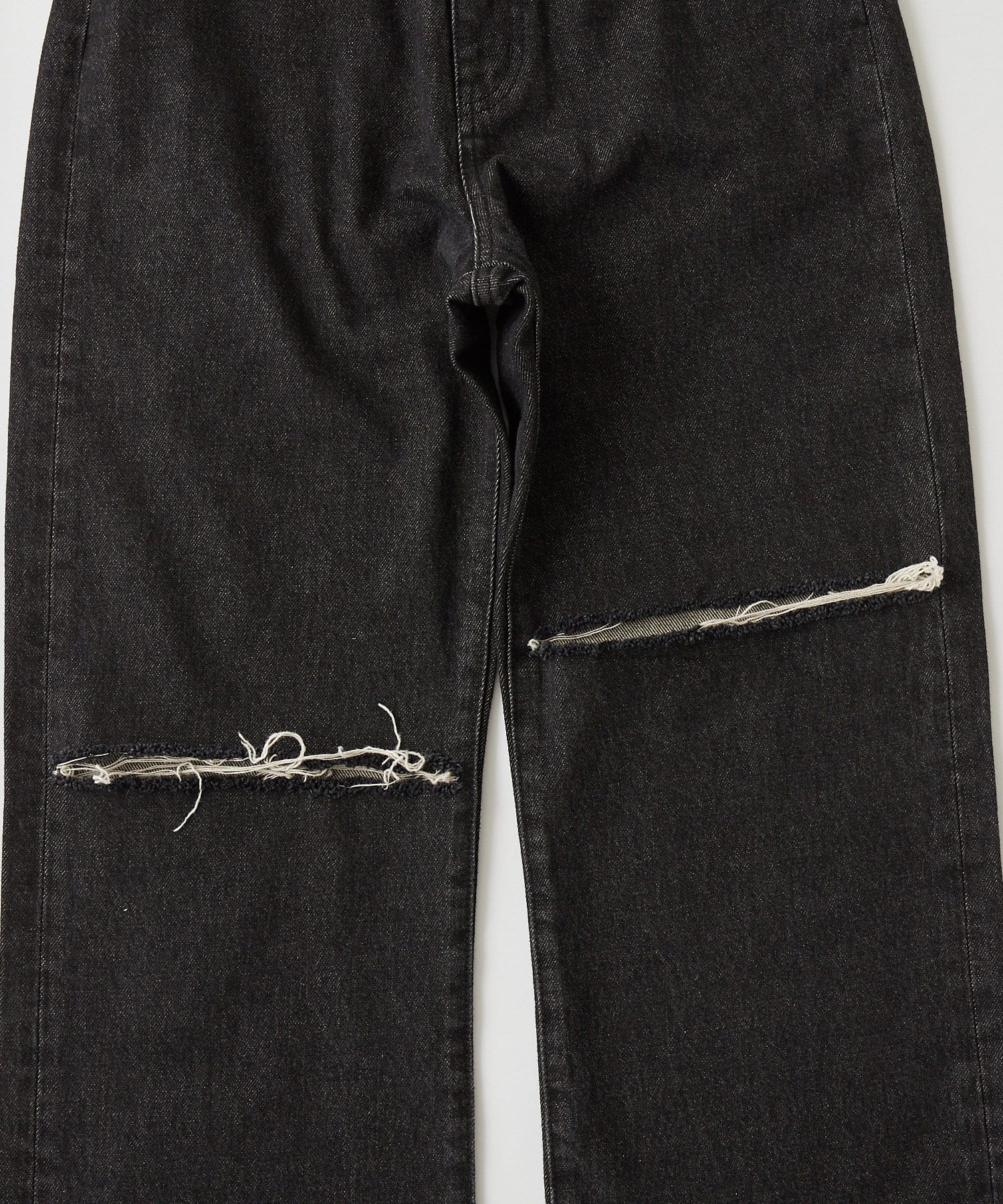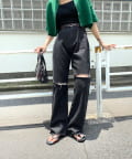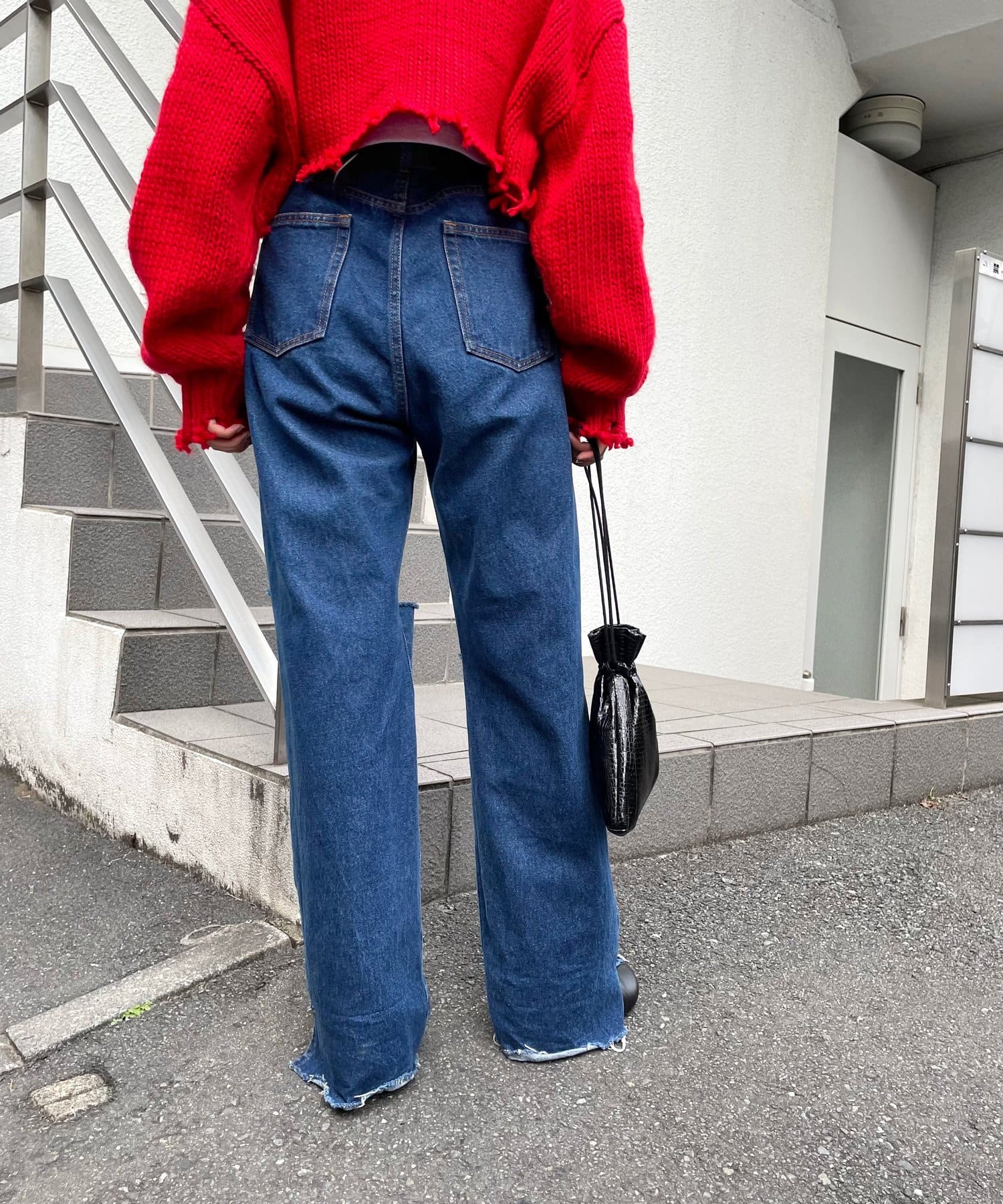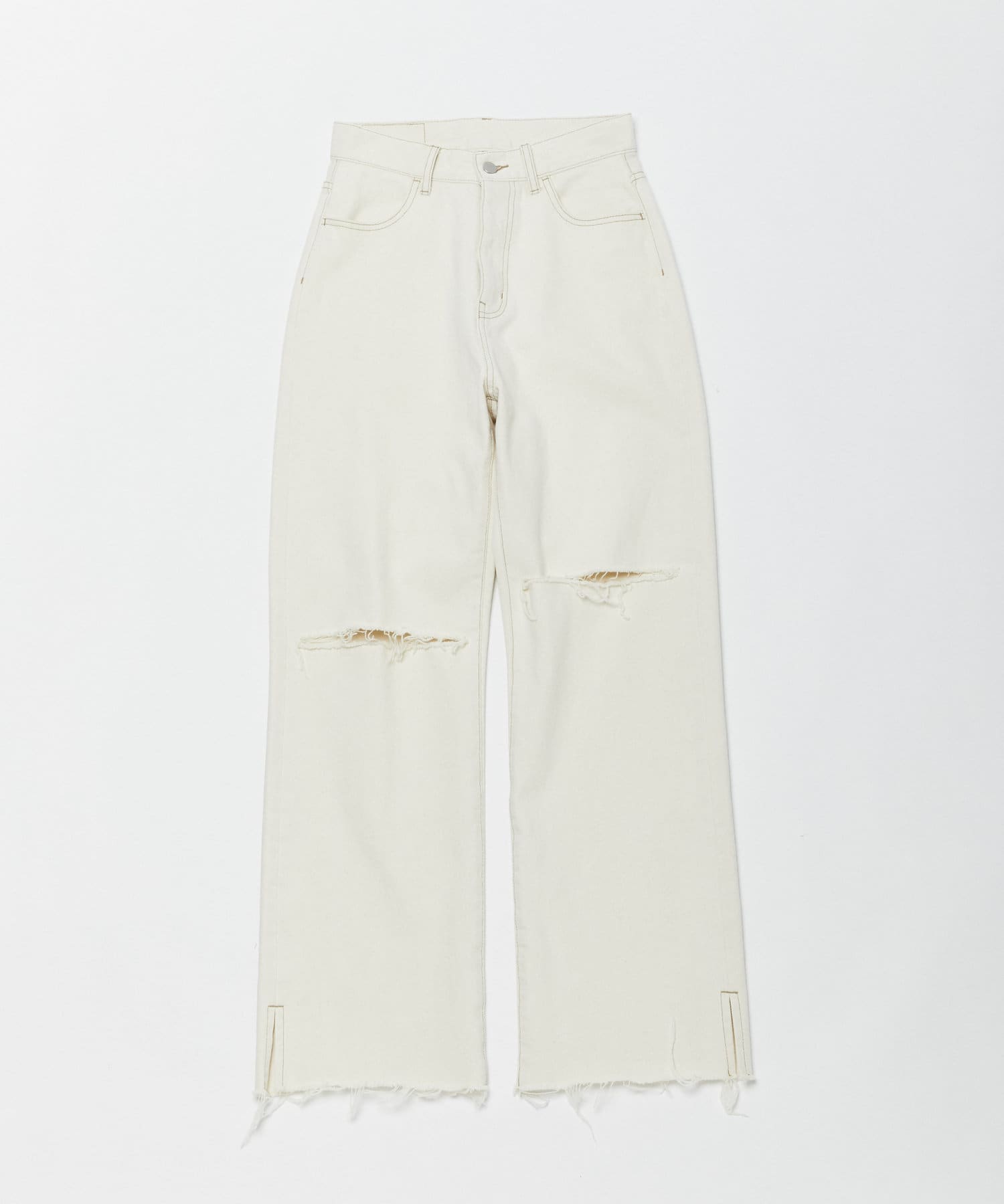 膝の大胆なカッティング+裾のスリットがコーデのポイントになるダメージデニム