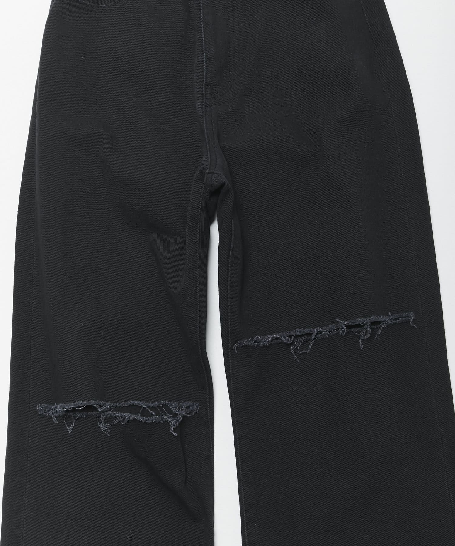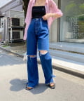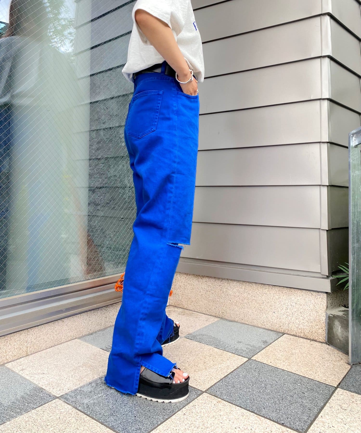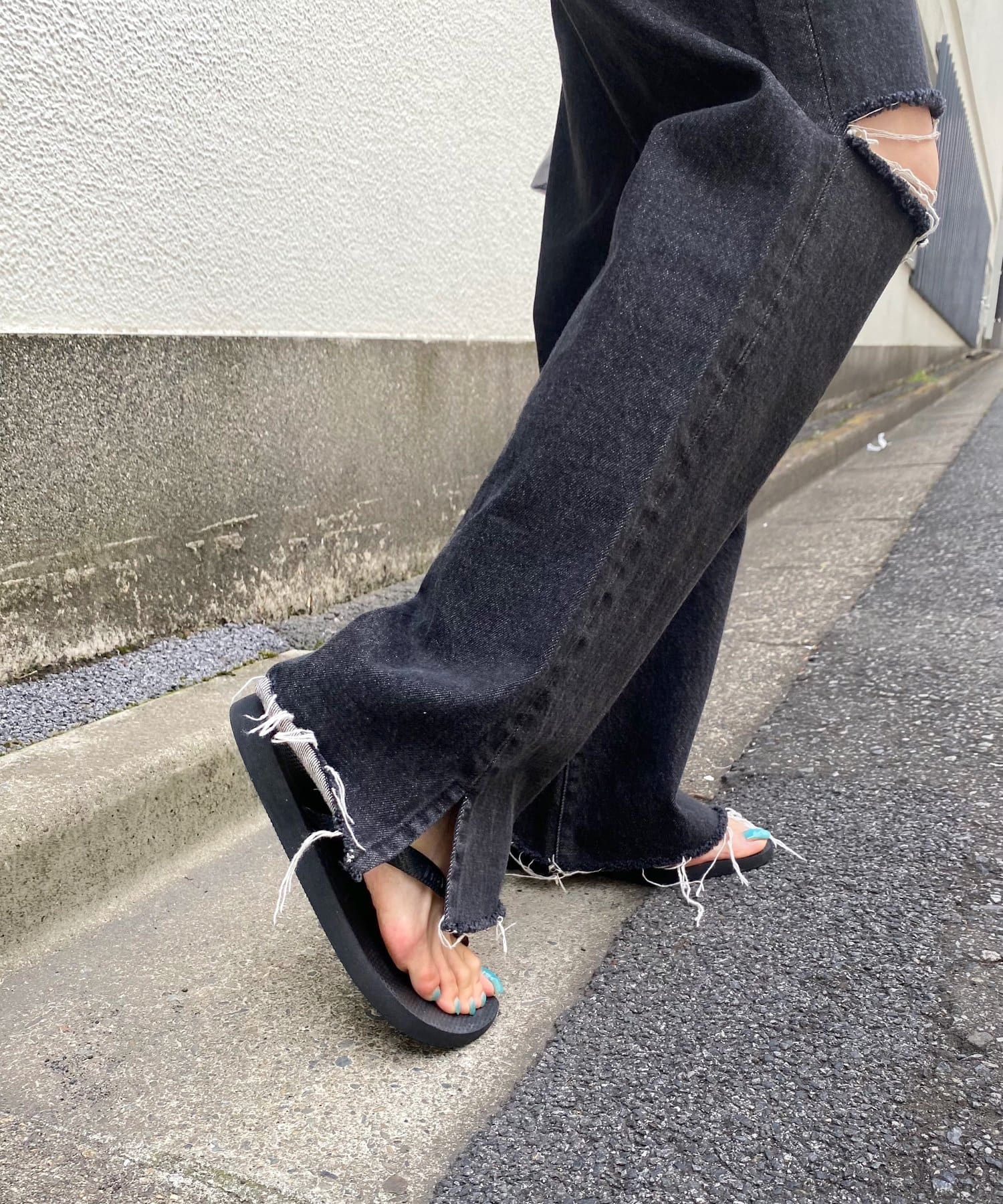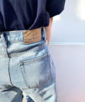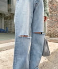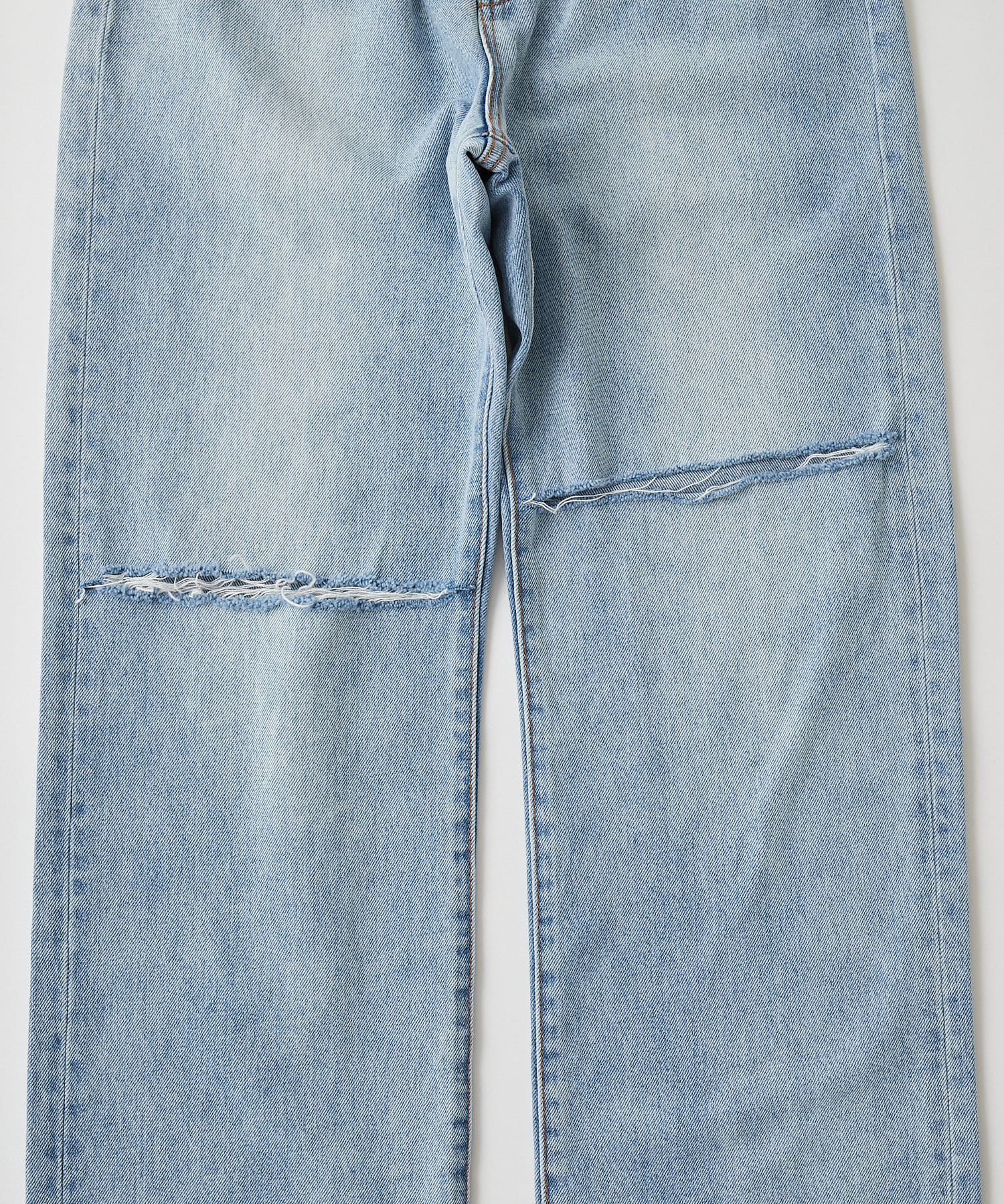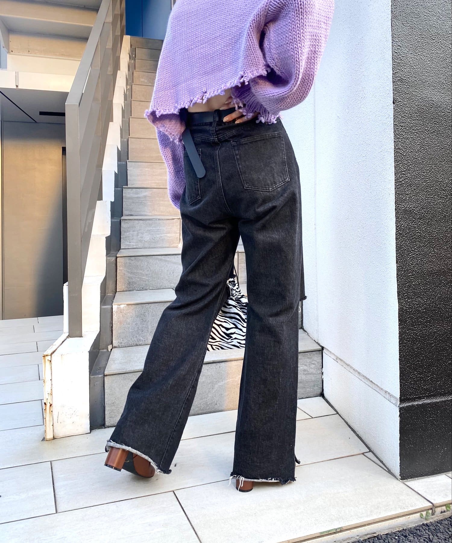 膝の大胆なカッティング+裾のスリットがコーデのポイントになるダメージデニム