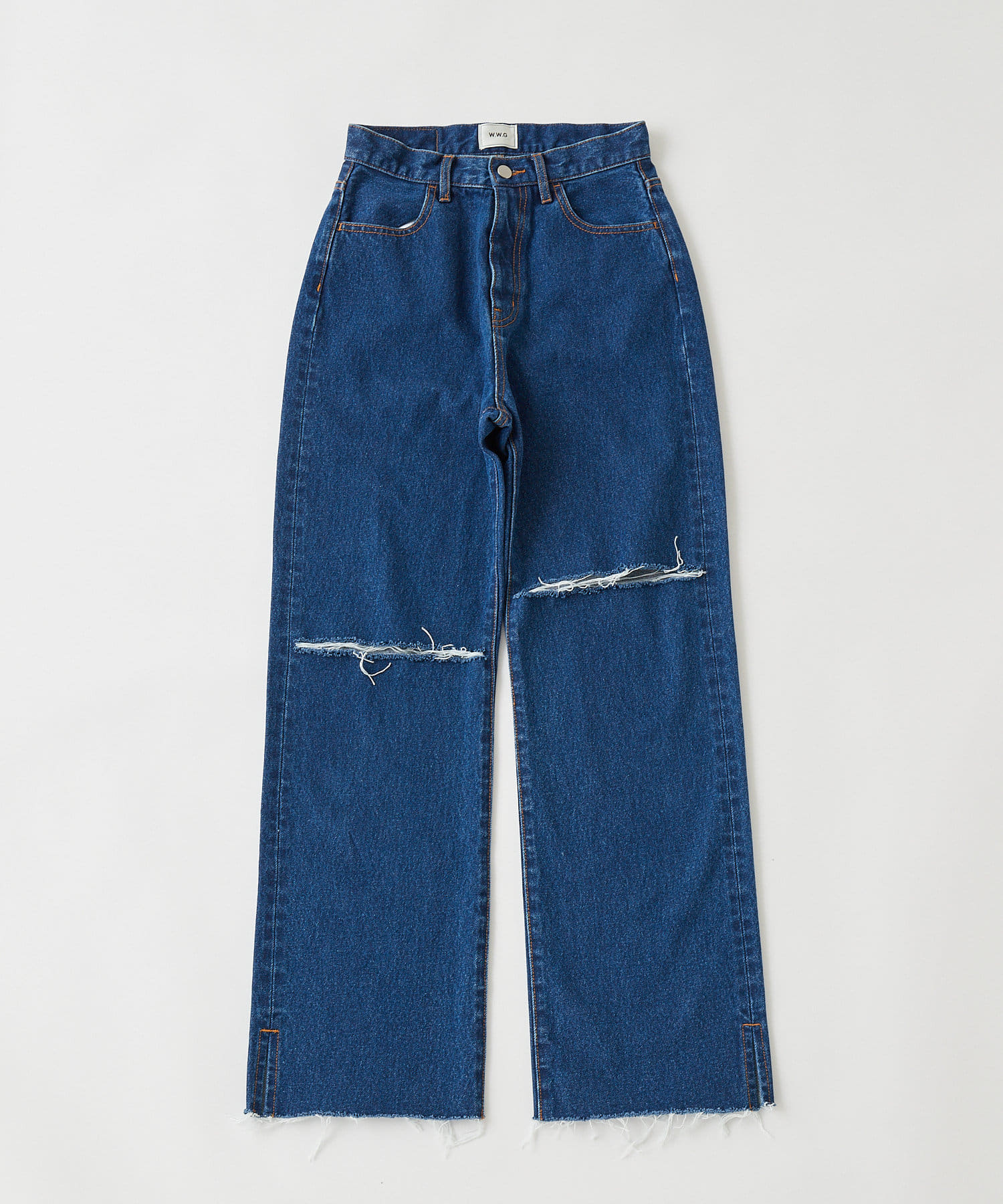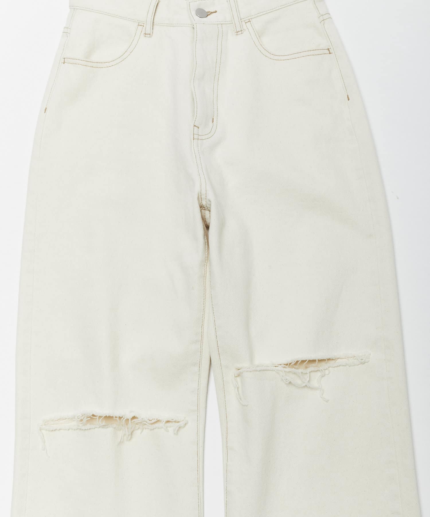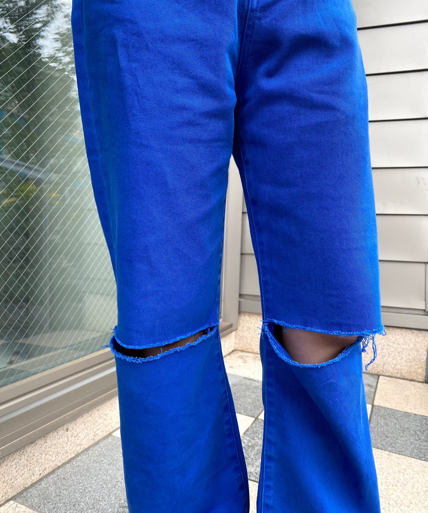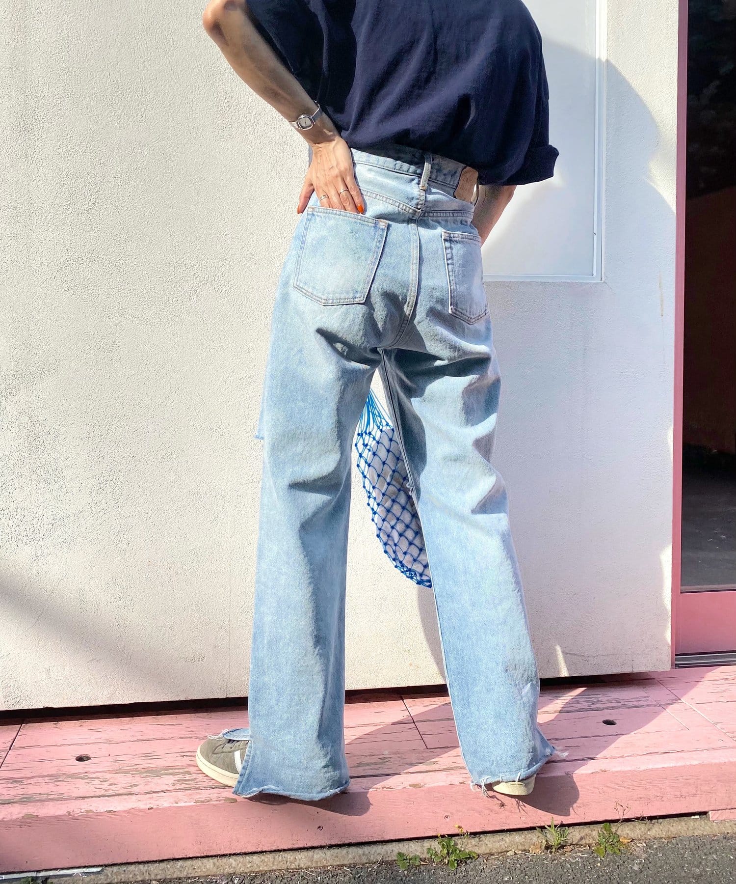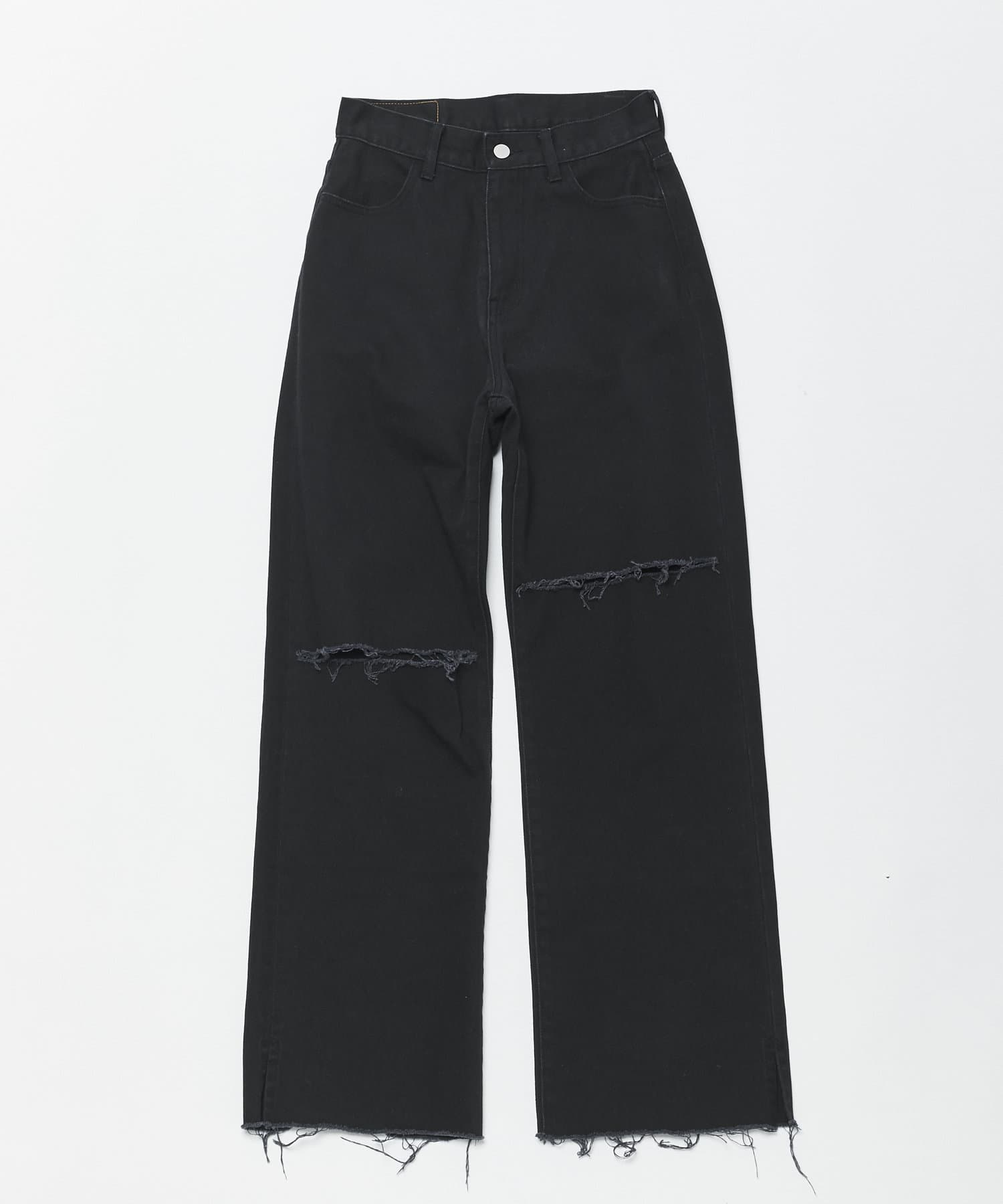 膝の大胆なカッティング+裾のスリットがコーデのポイントになるダメージデニム