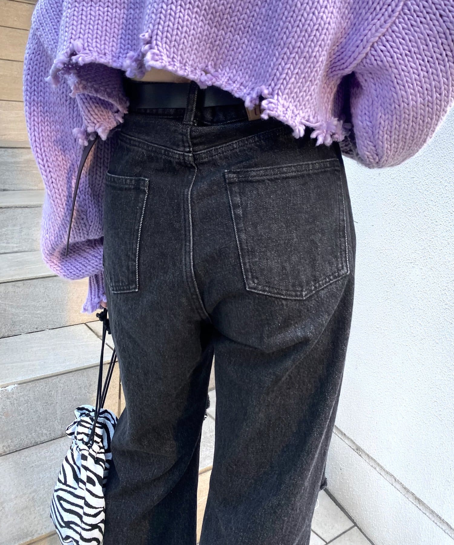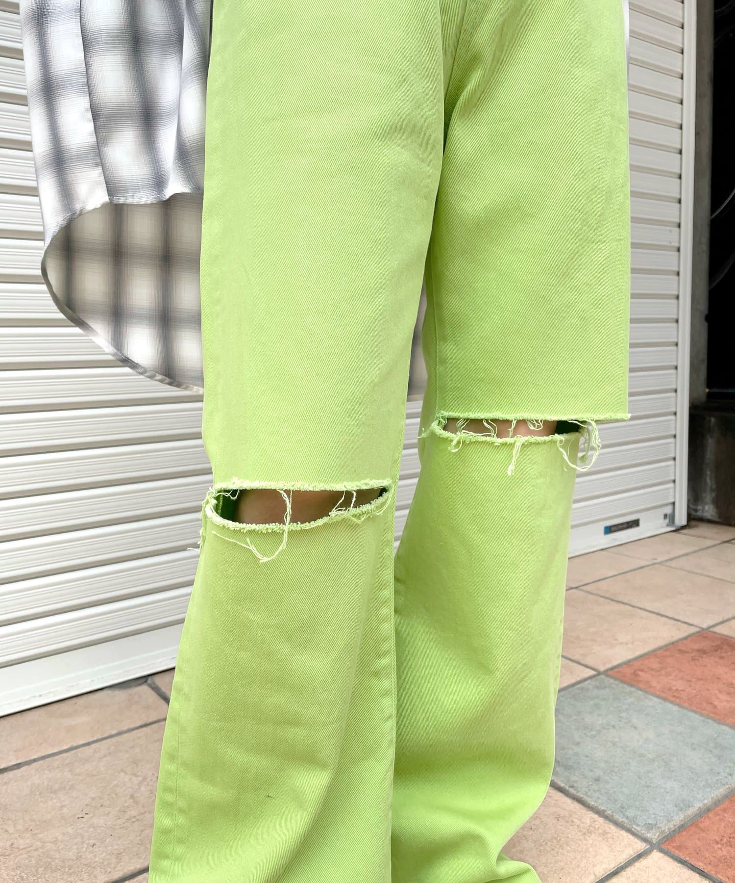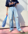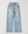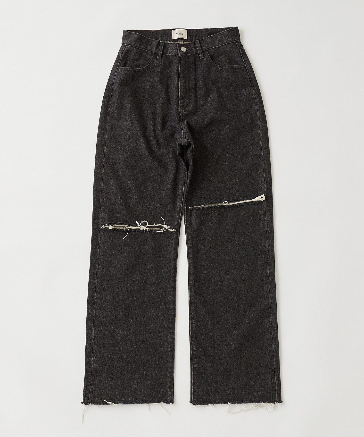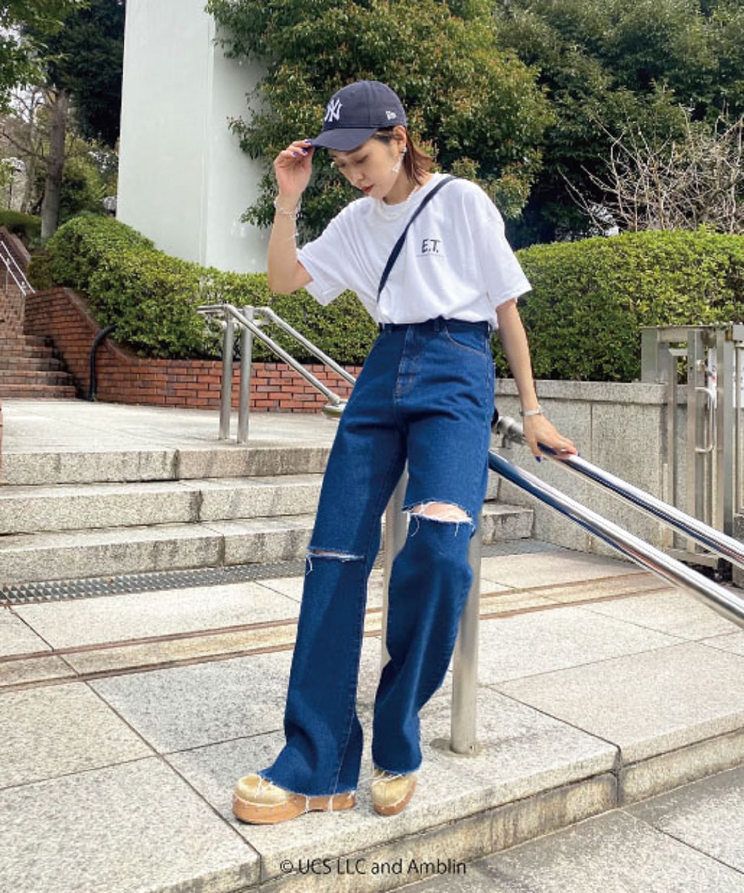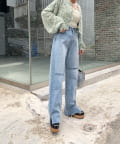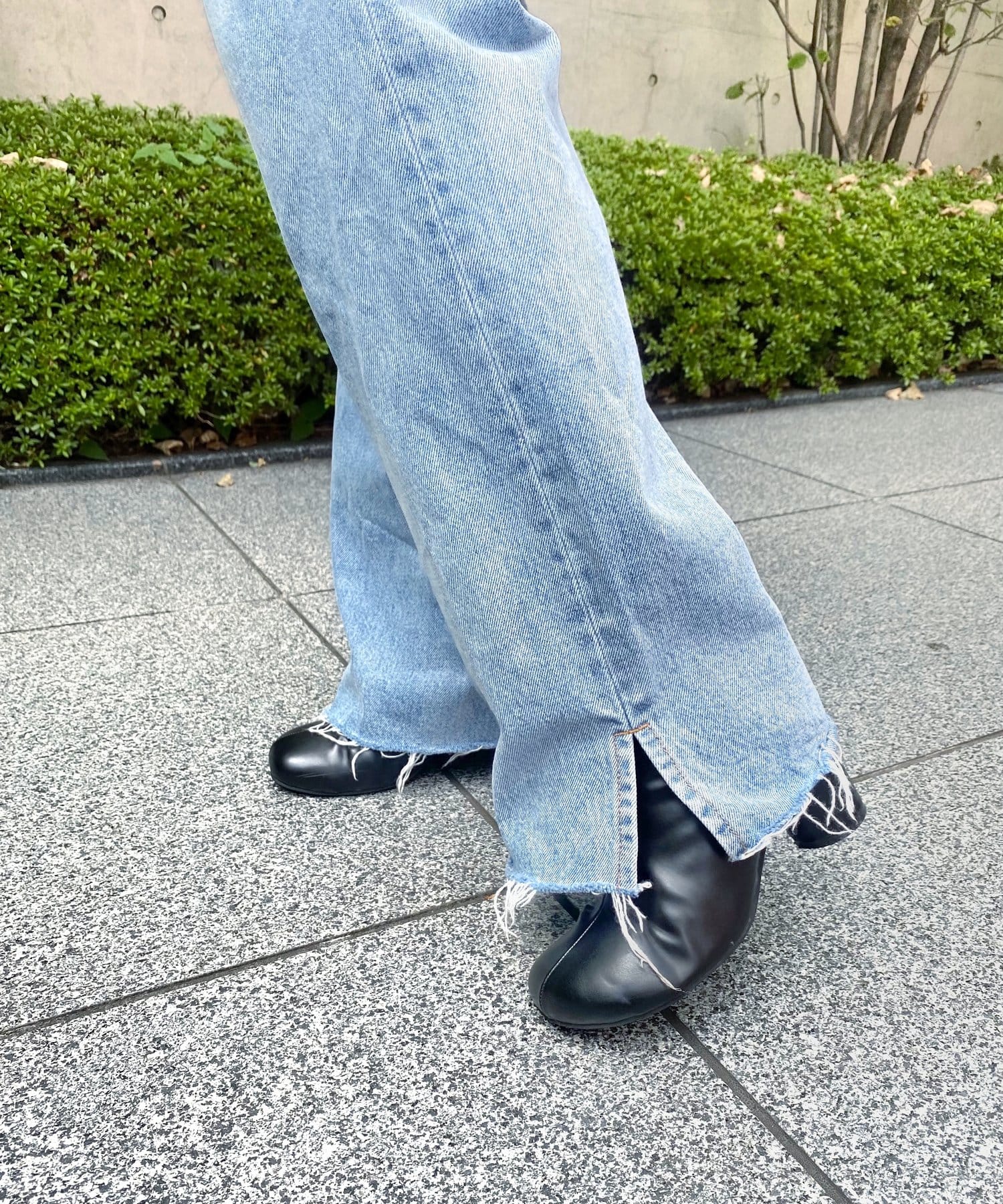 膝の大胆なカッティング+裾のスリットがコーデのポイントになるダメージデニム
