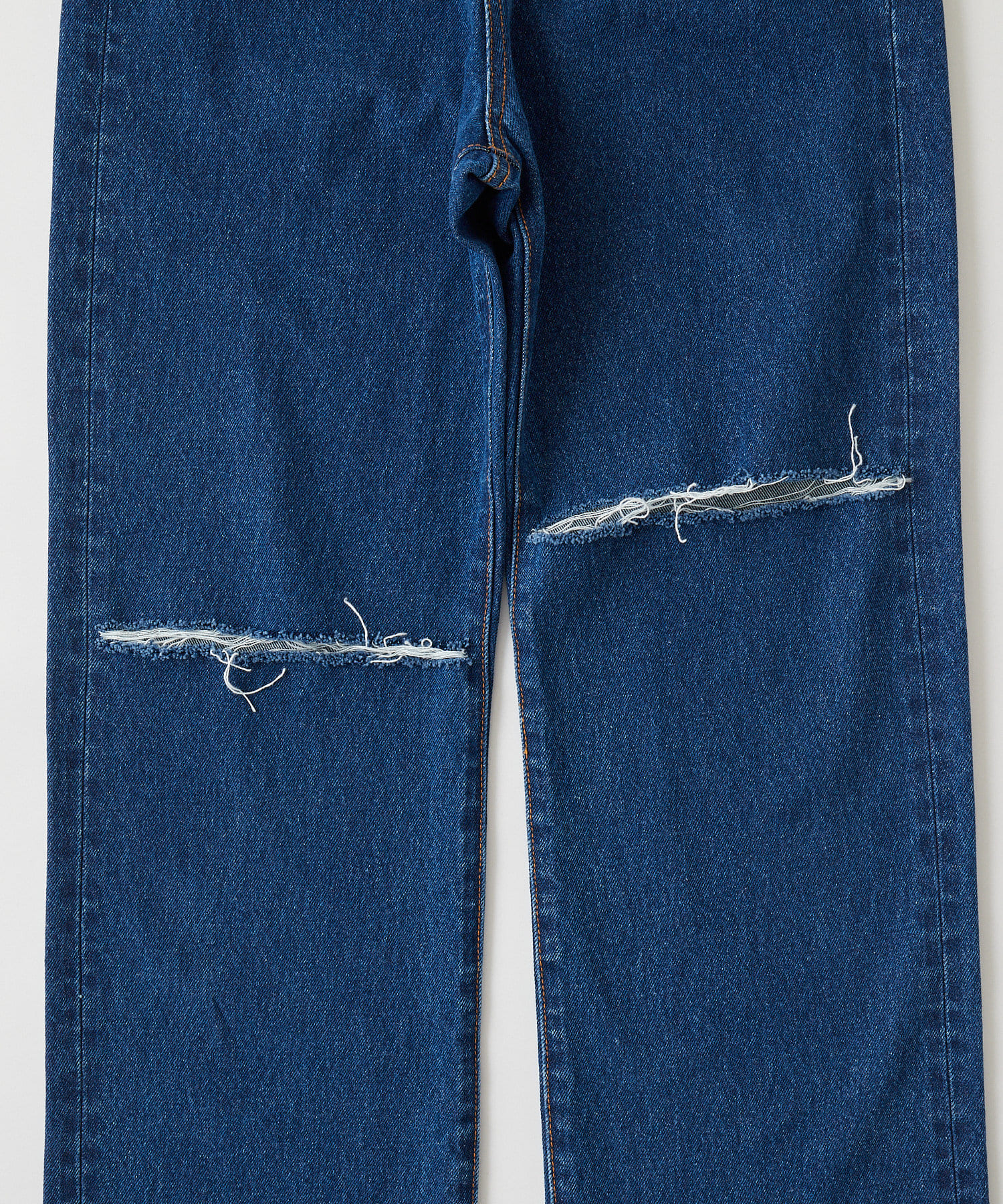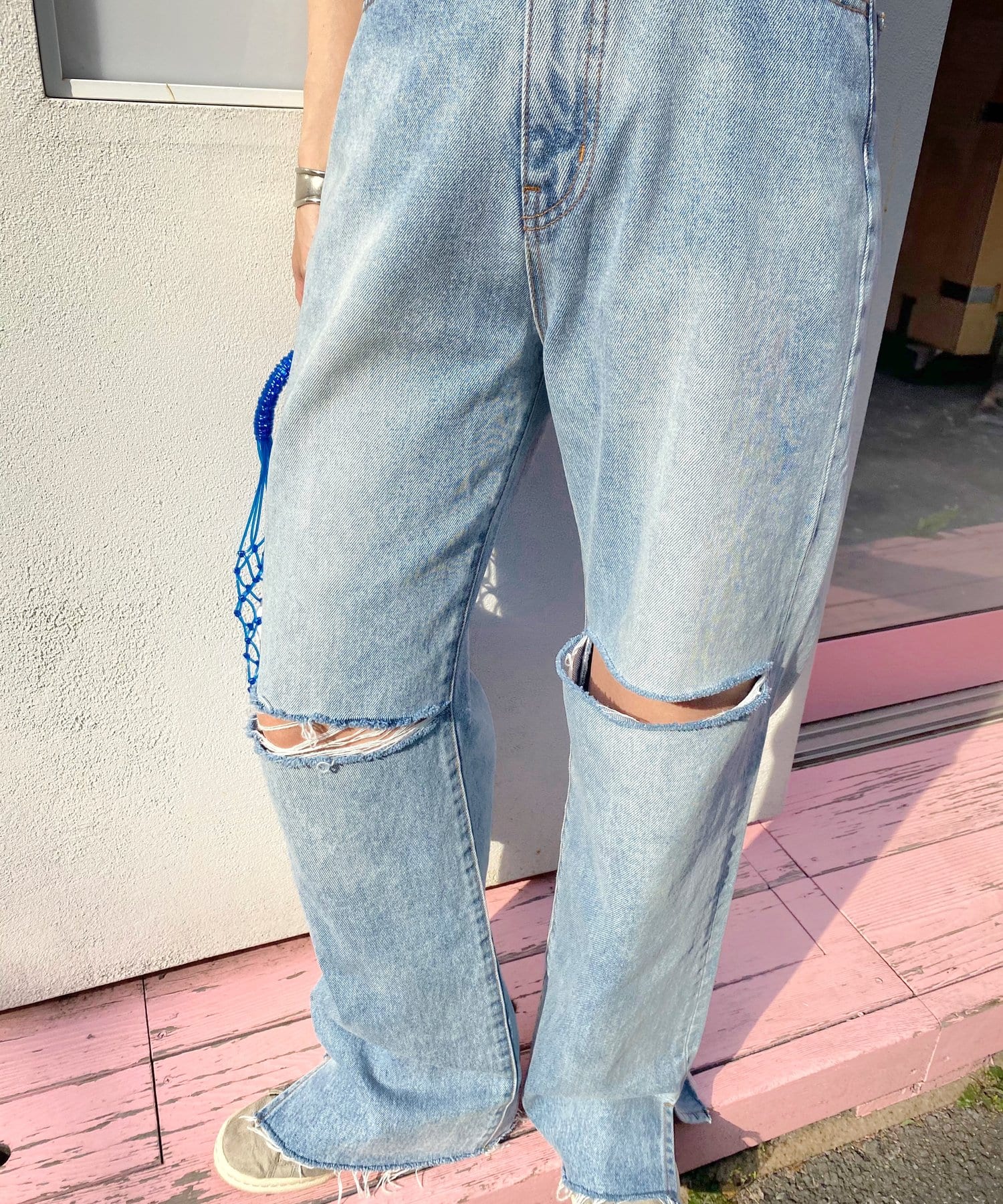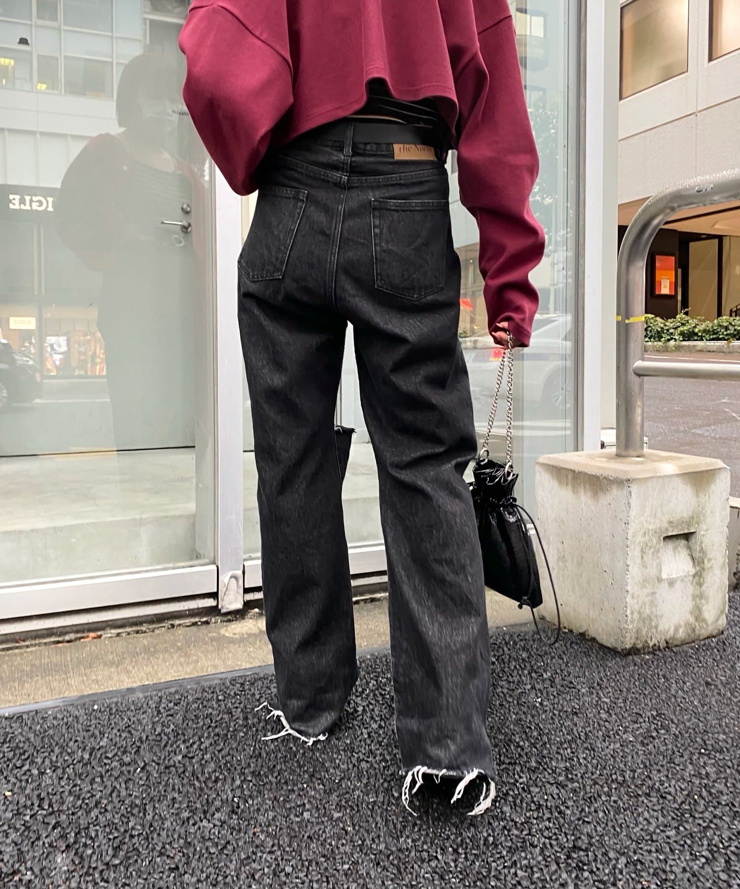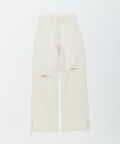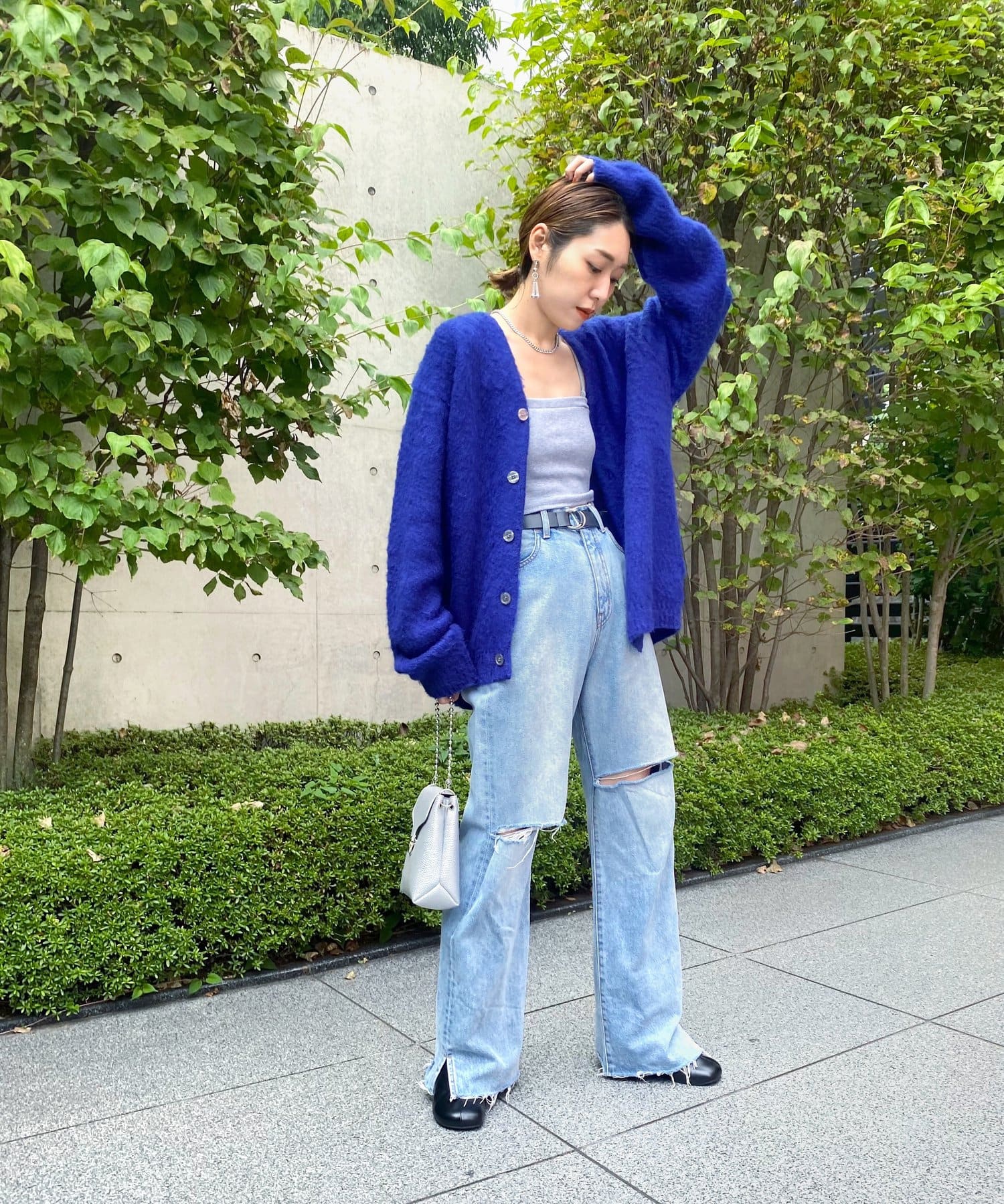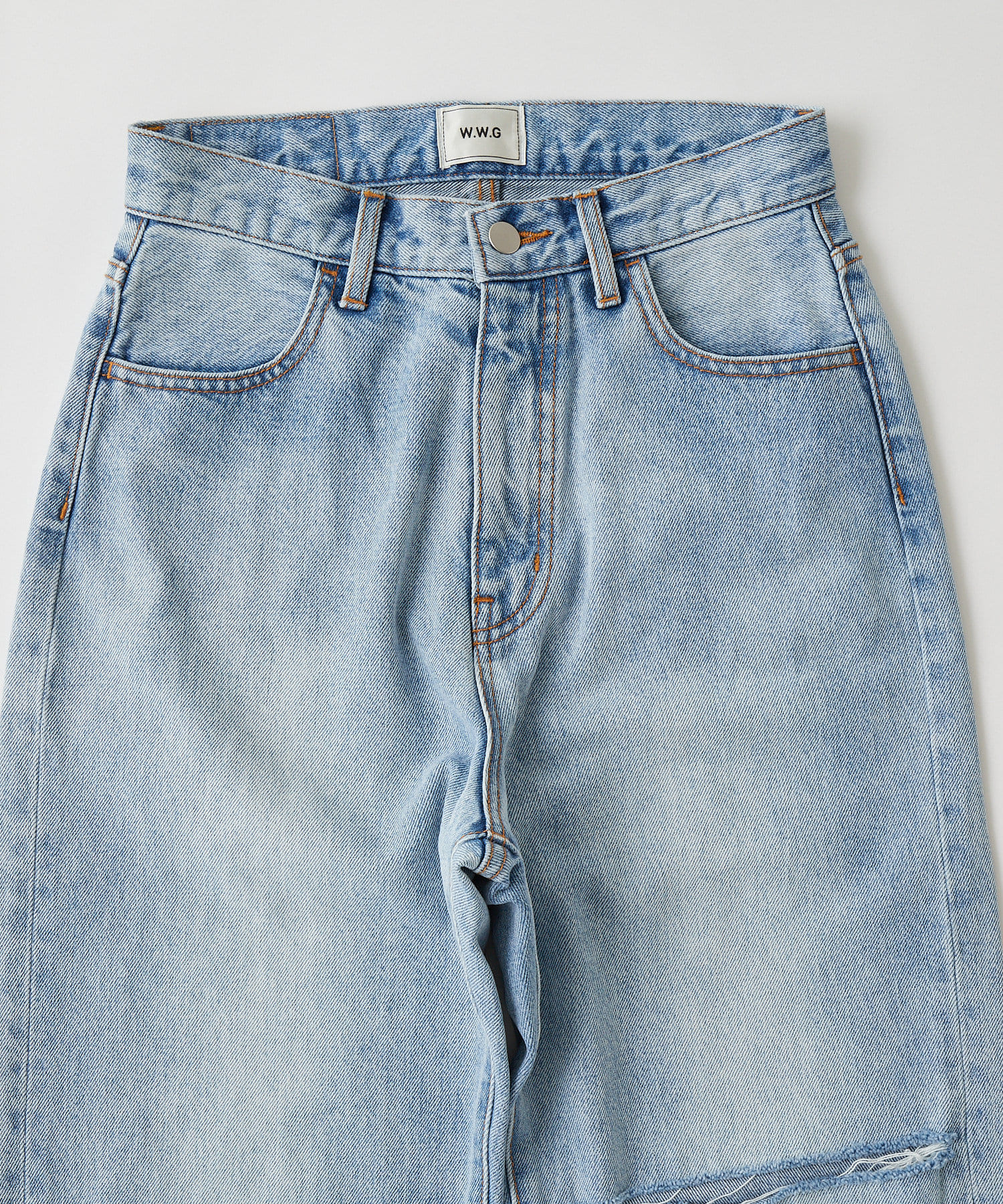 膝の大胆なカッティング+裾のスリットがコーデのポイントになるダメージデニム