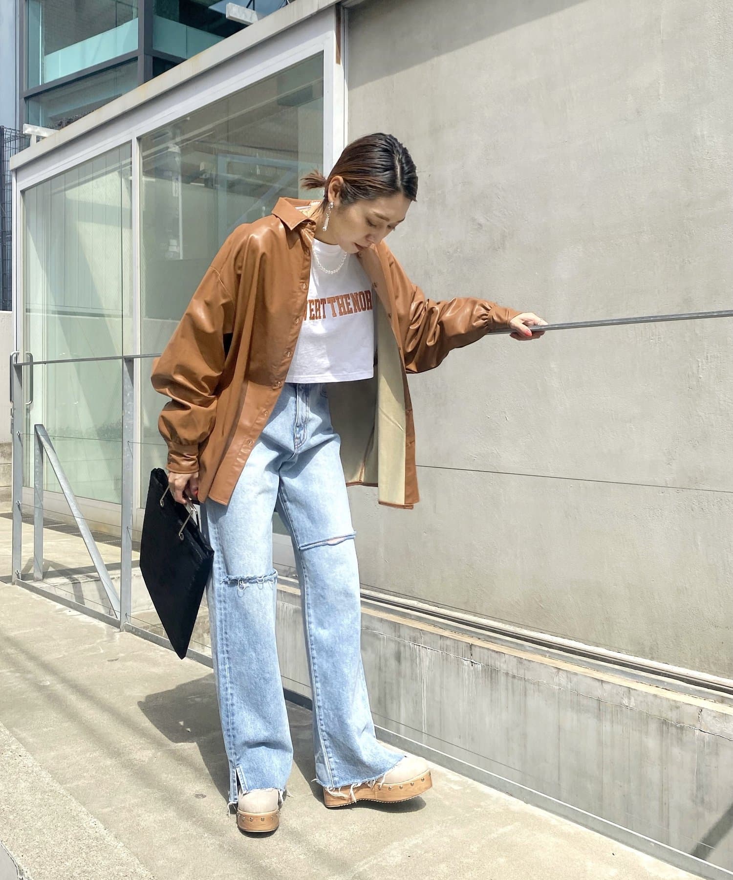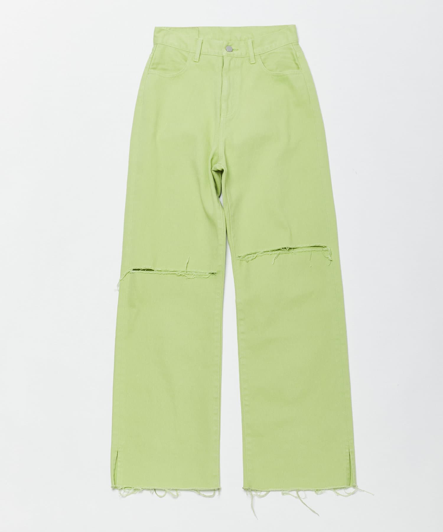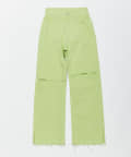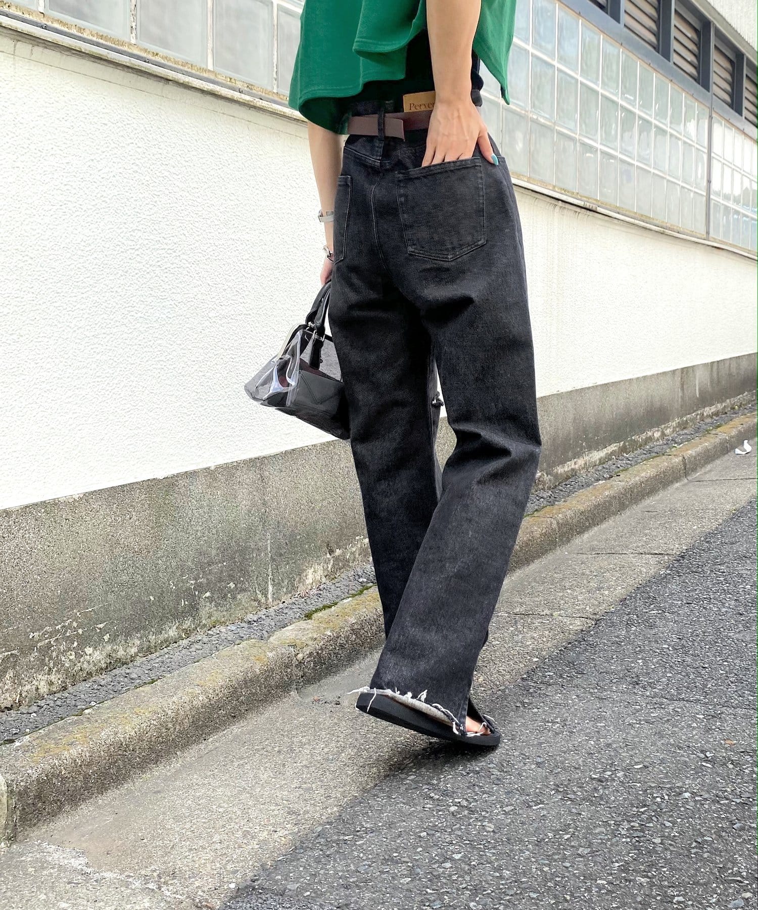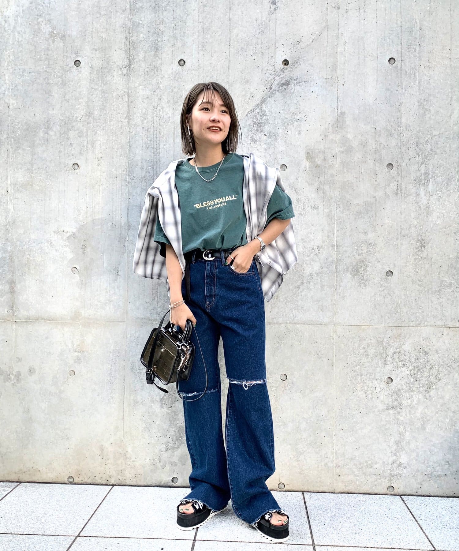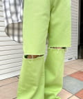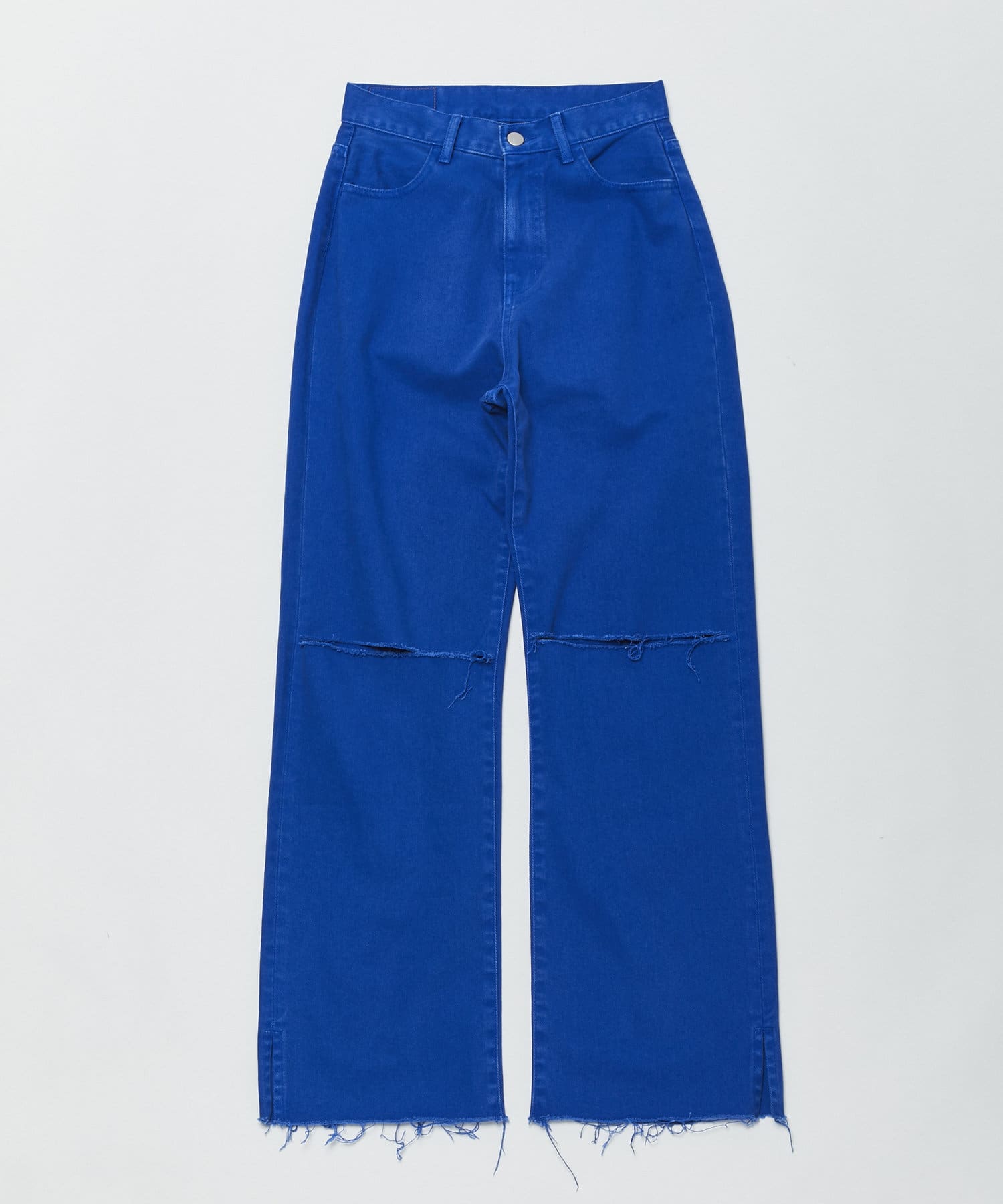 膝の大胆なカッティング+裾のスリットがコーデのポイントになるダメージデニム