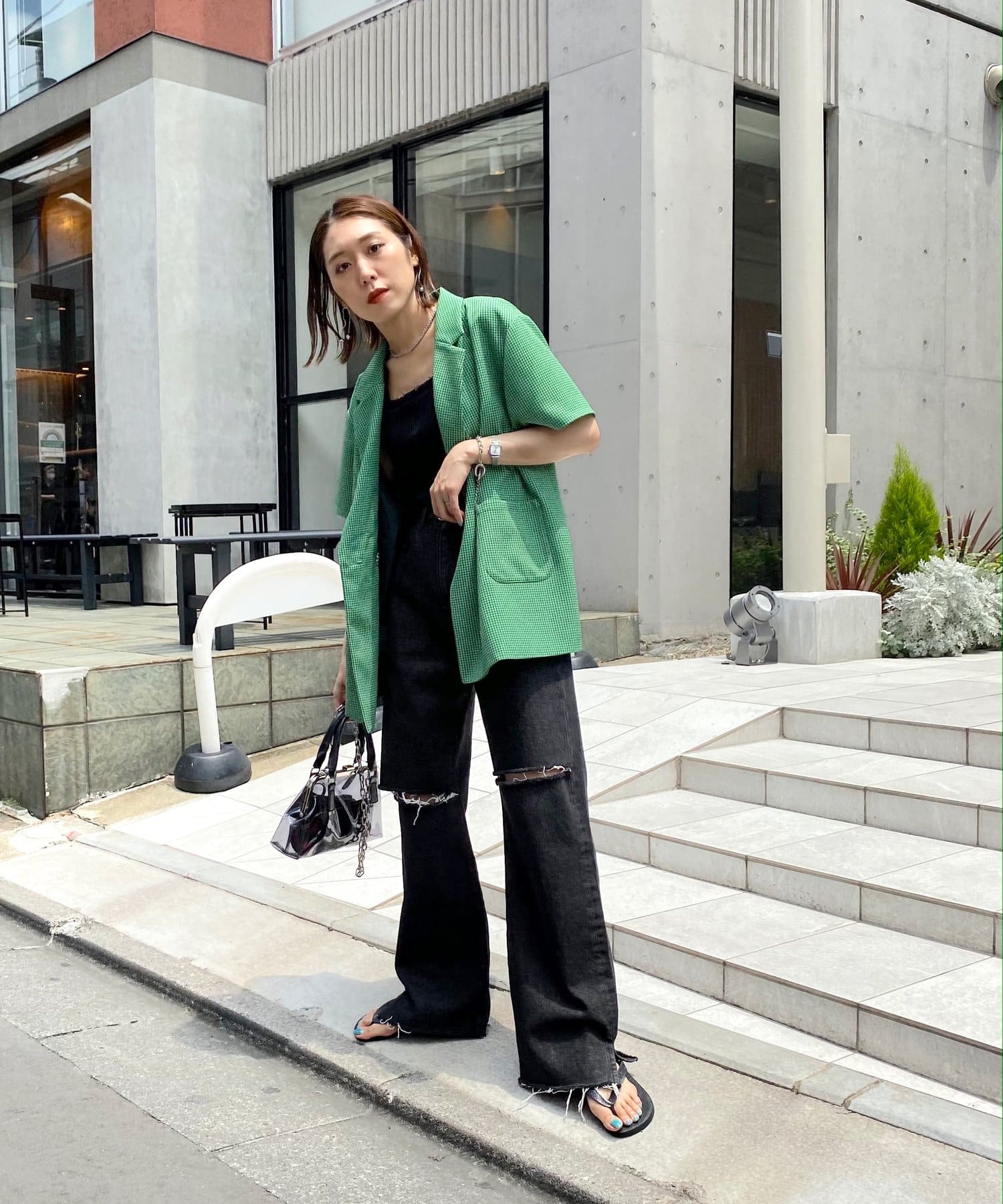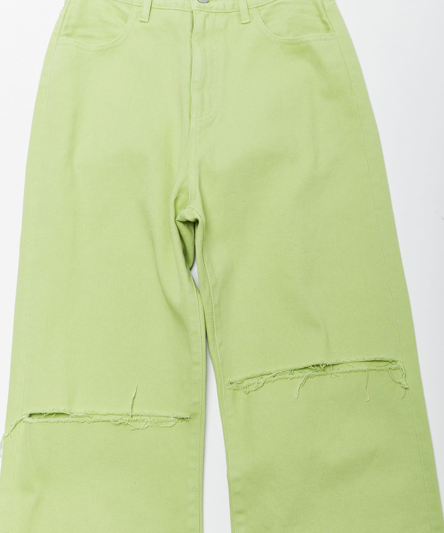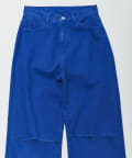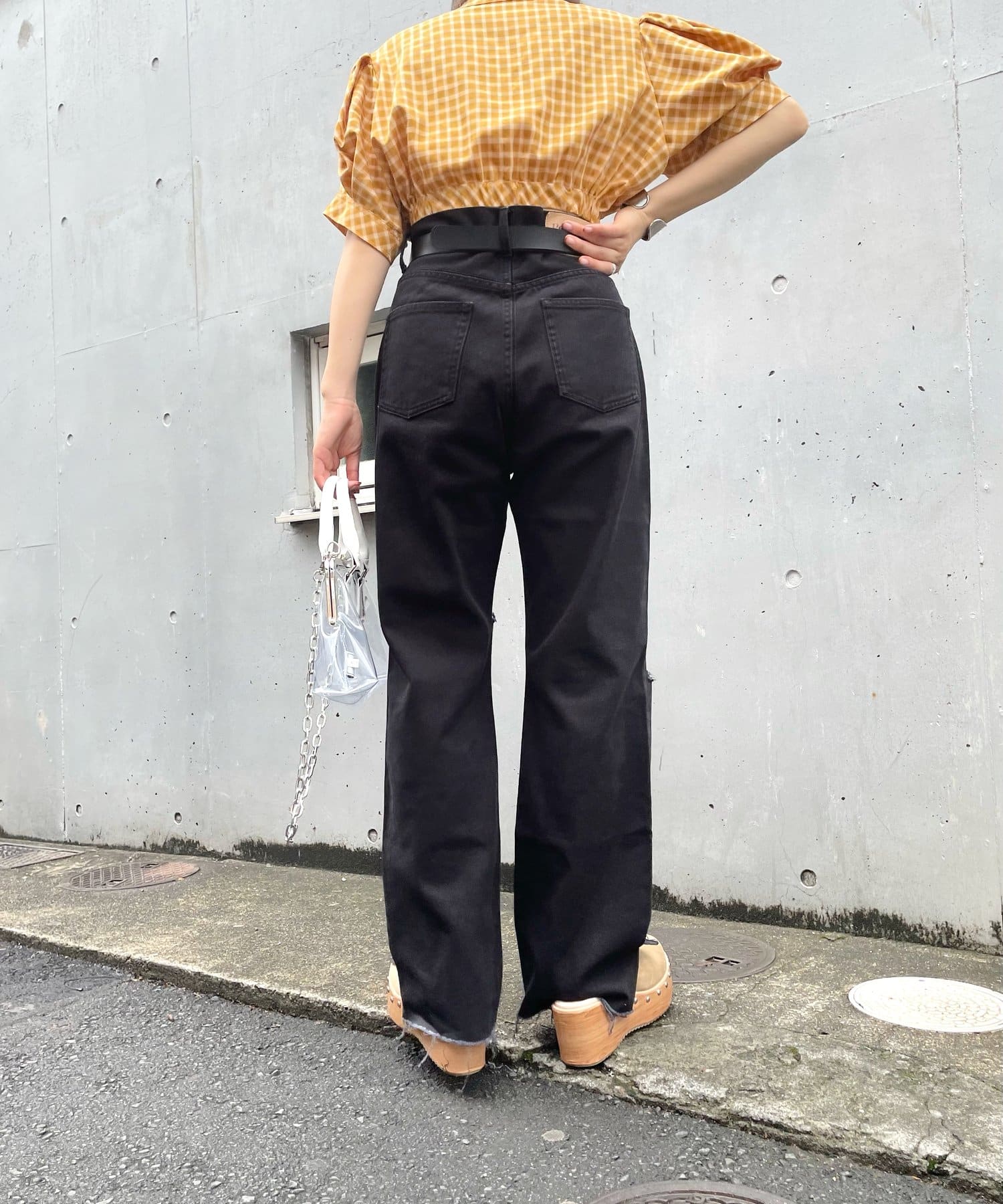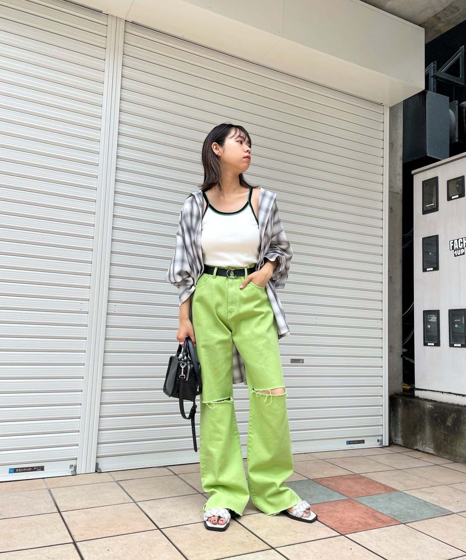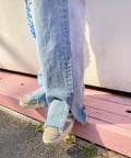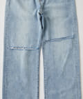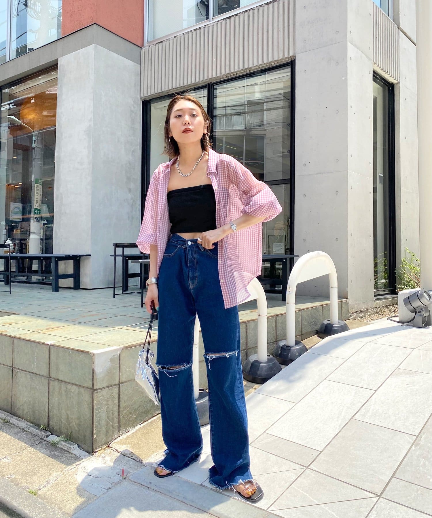 膝の大胆なカッティング+裾のスリットがコーデのポイントになるダメージデニム
