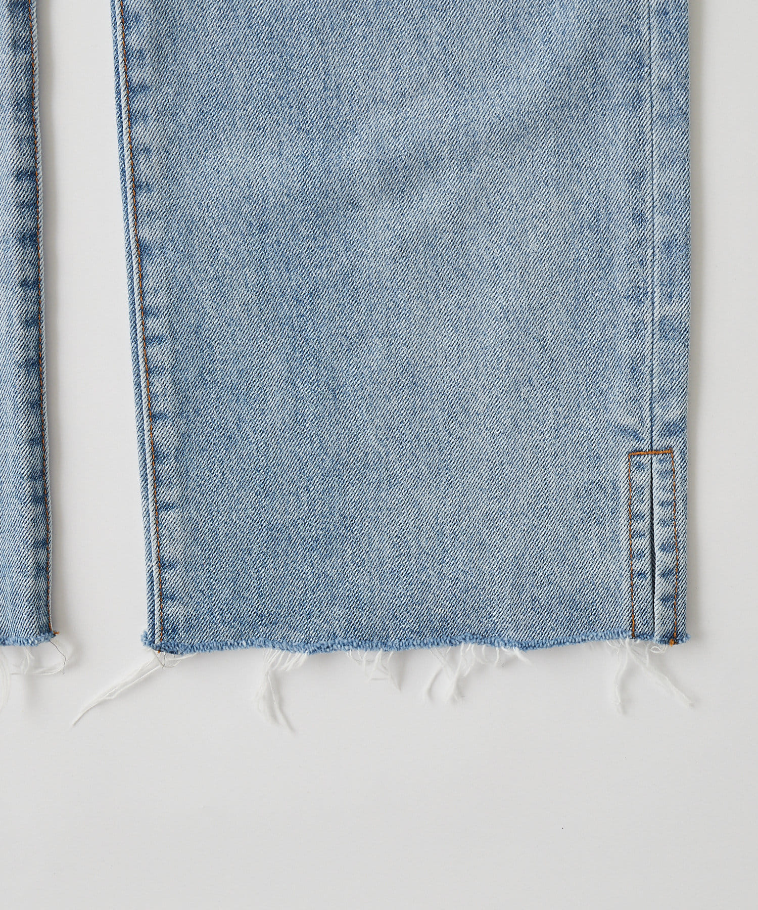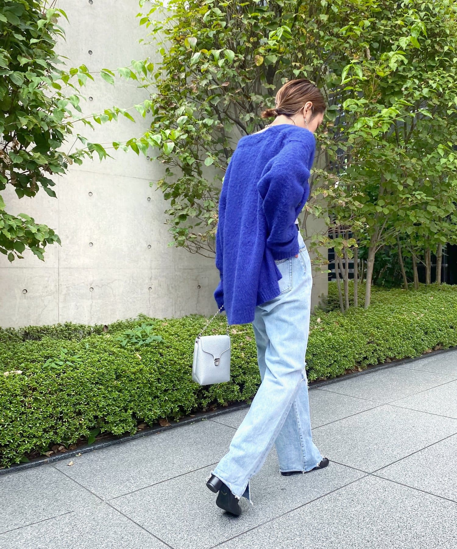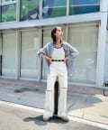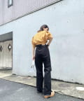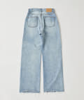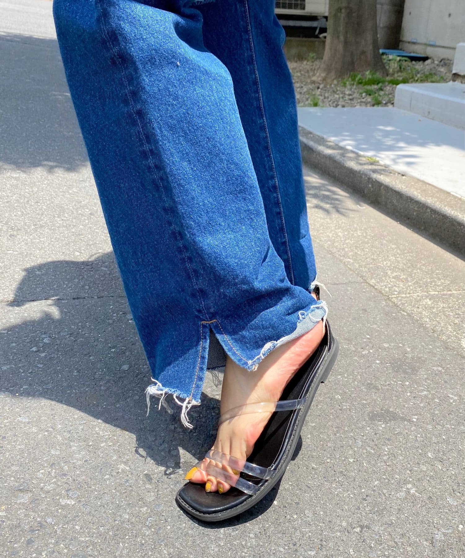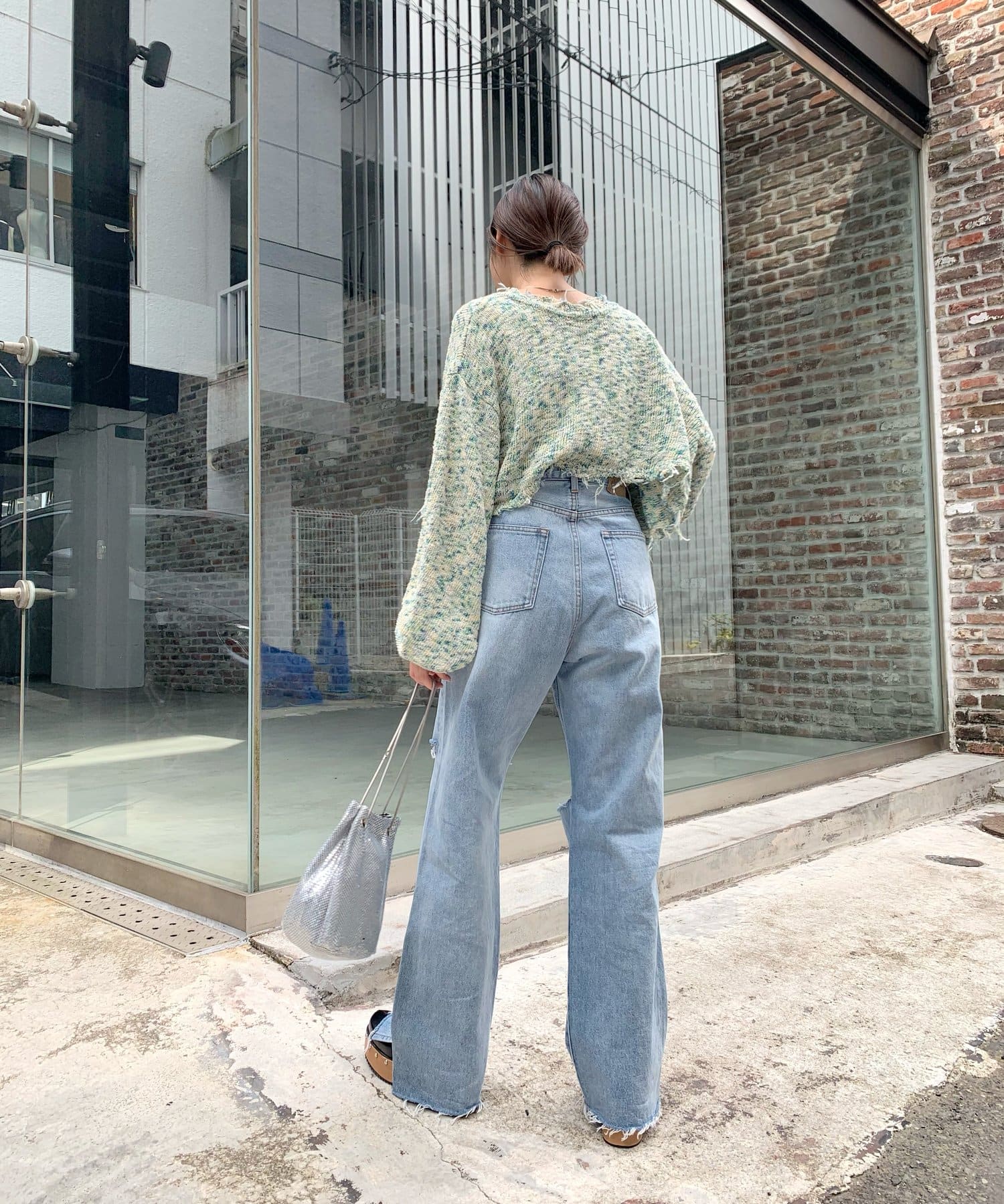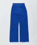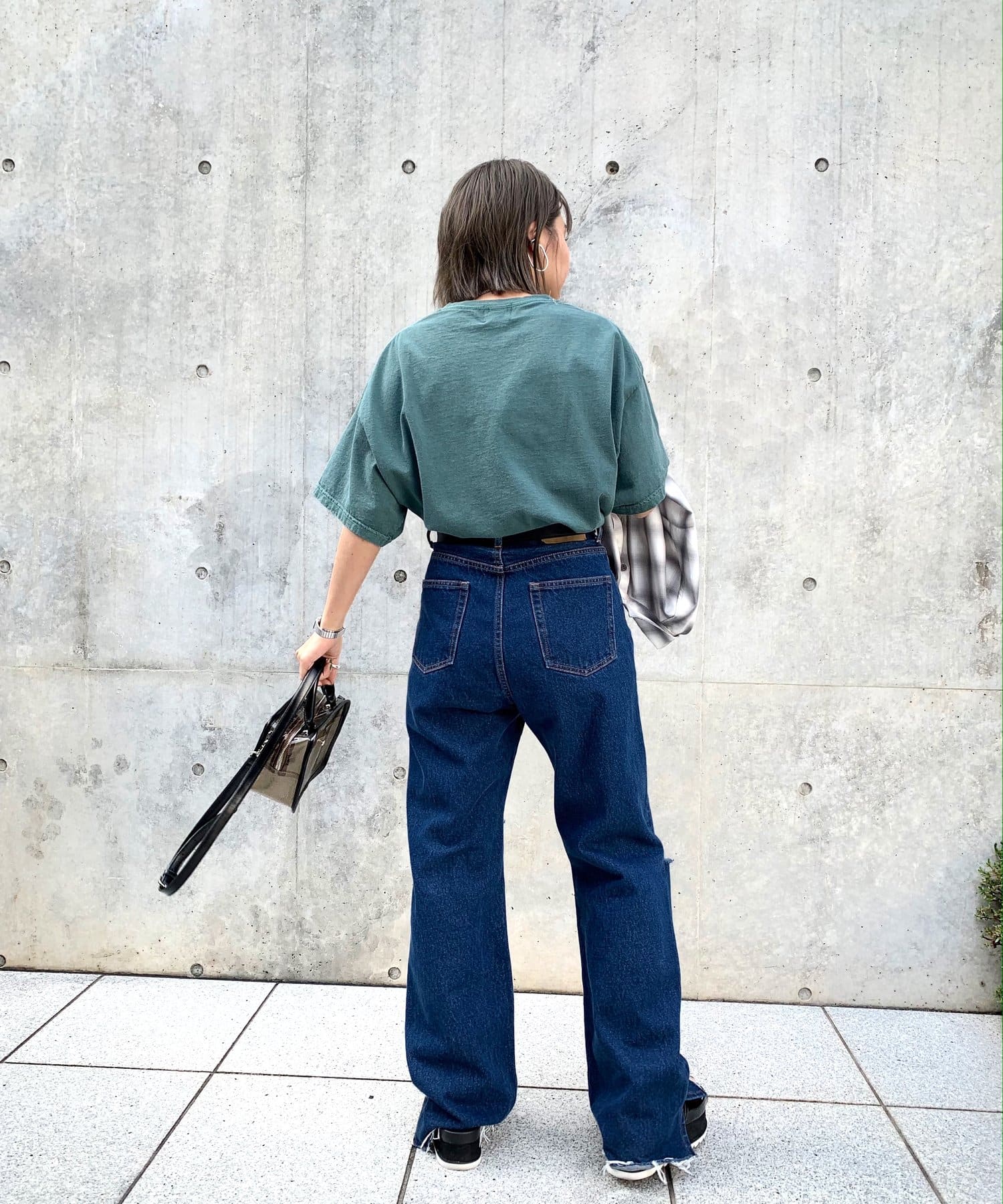膝の大胆なカッティング+裾のスリットがコーデのポイントになるダメージデニム