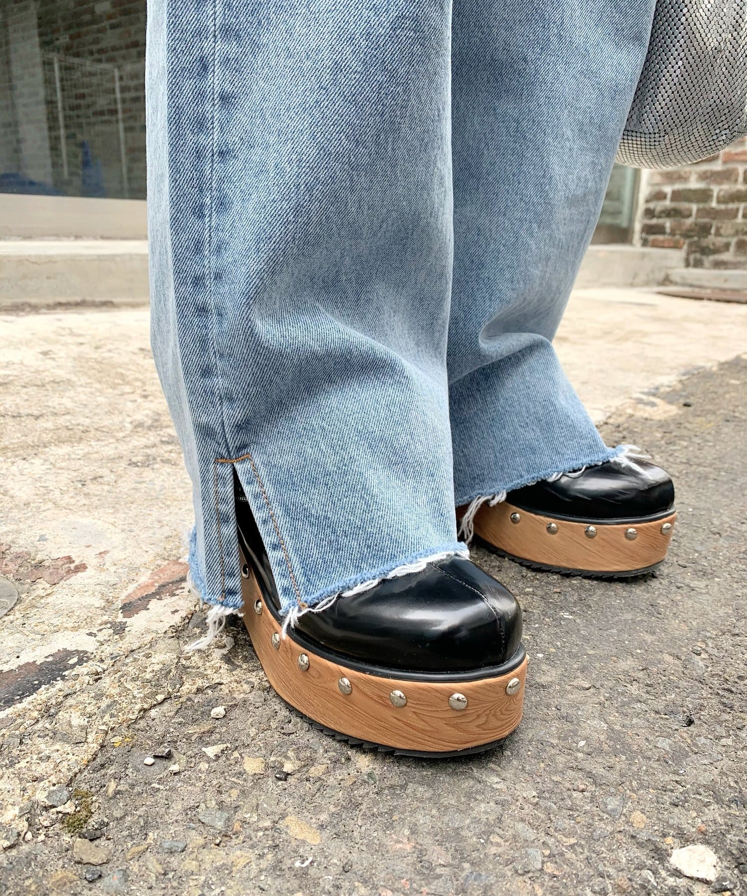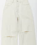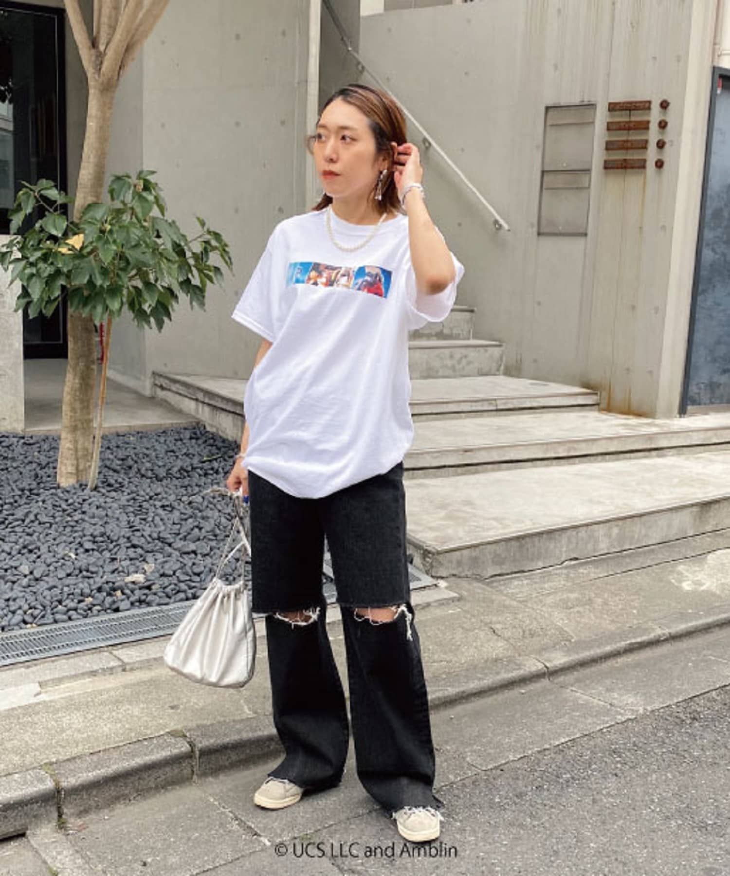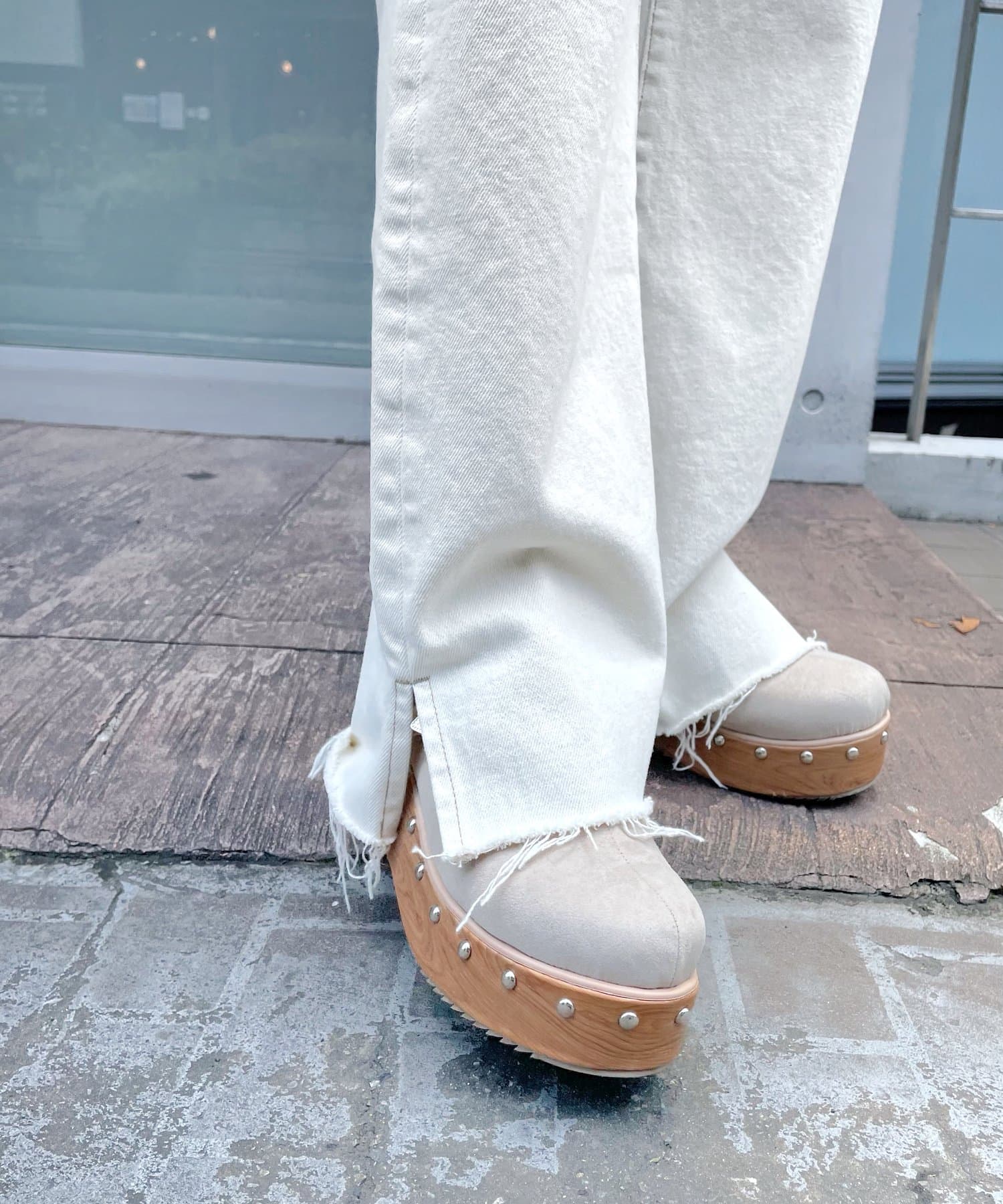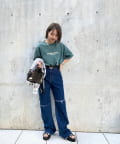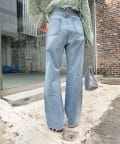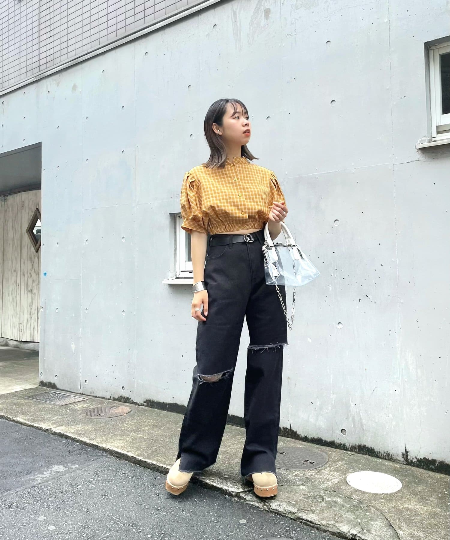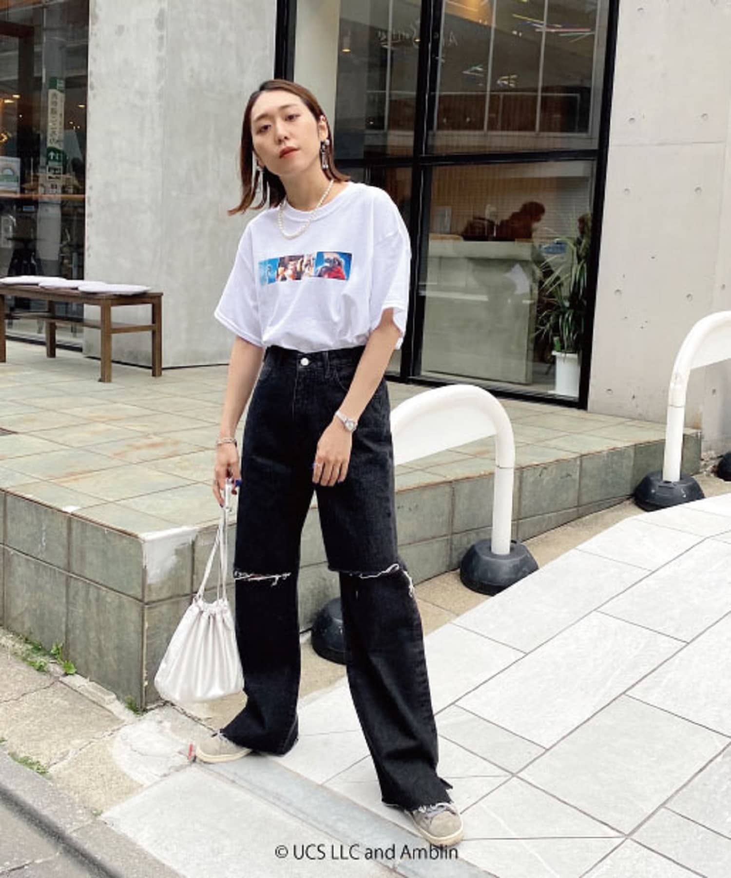 膝の大胆なカッティング+裾のスリットがコーデのポイントになるダメージデニム