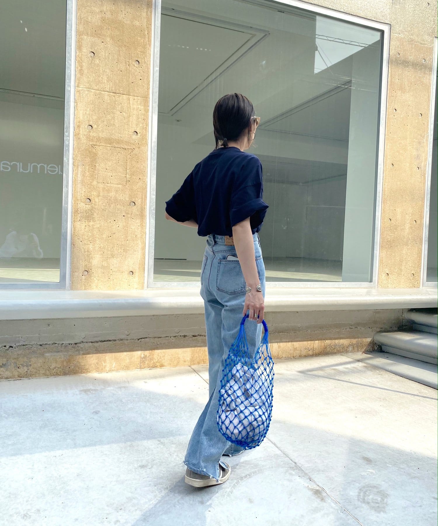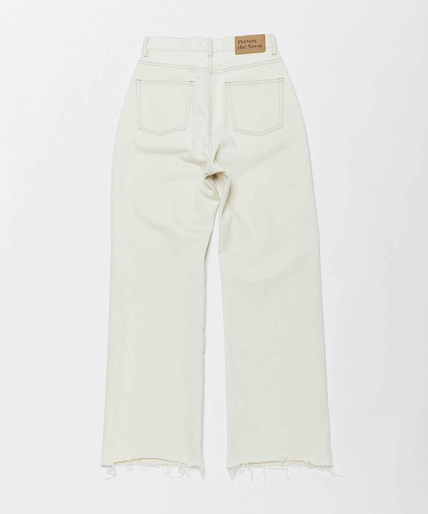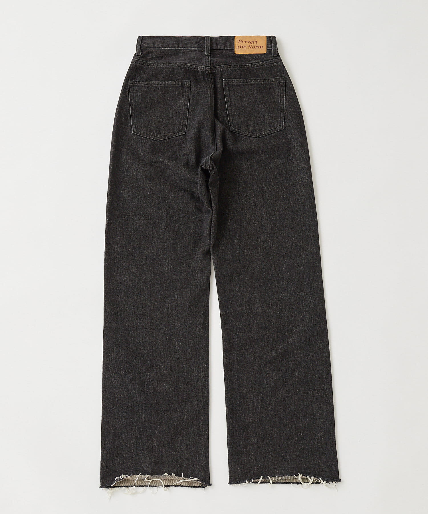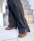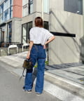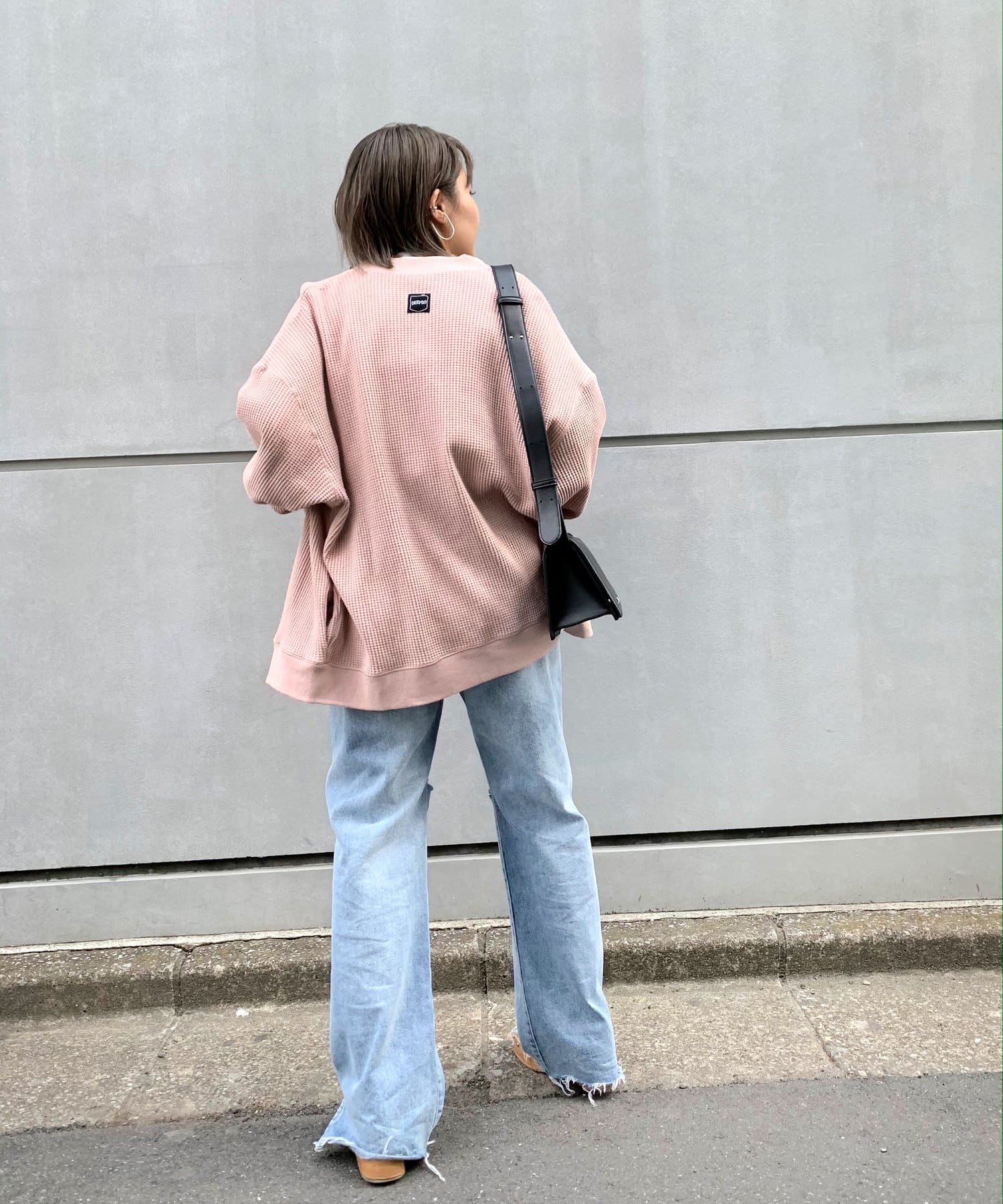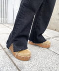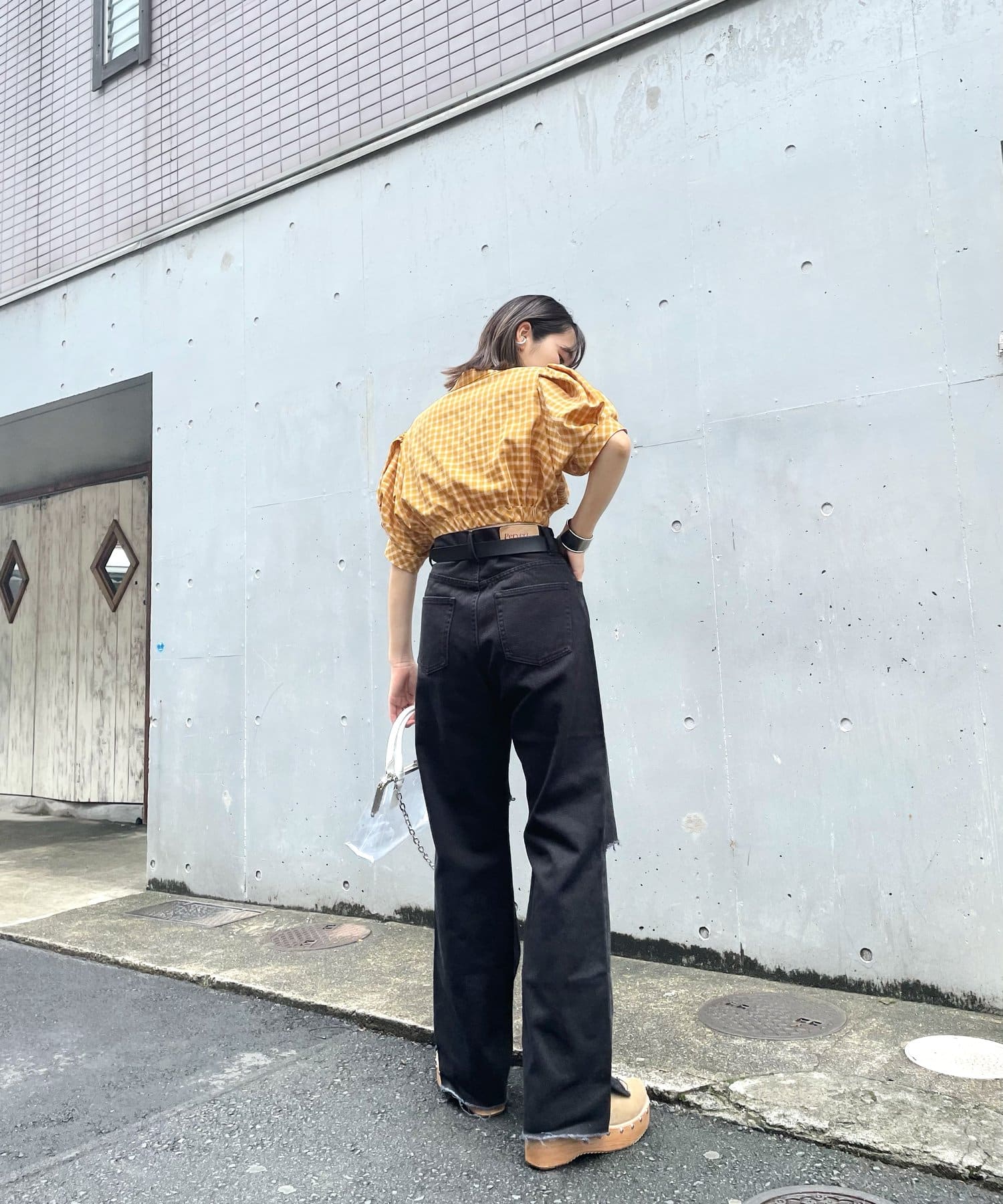 膝の大胆なカッティング+裾のスリットがコーデのポイントになるダメージデニム