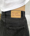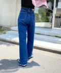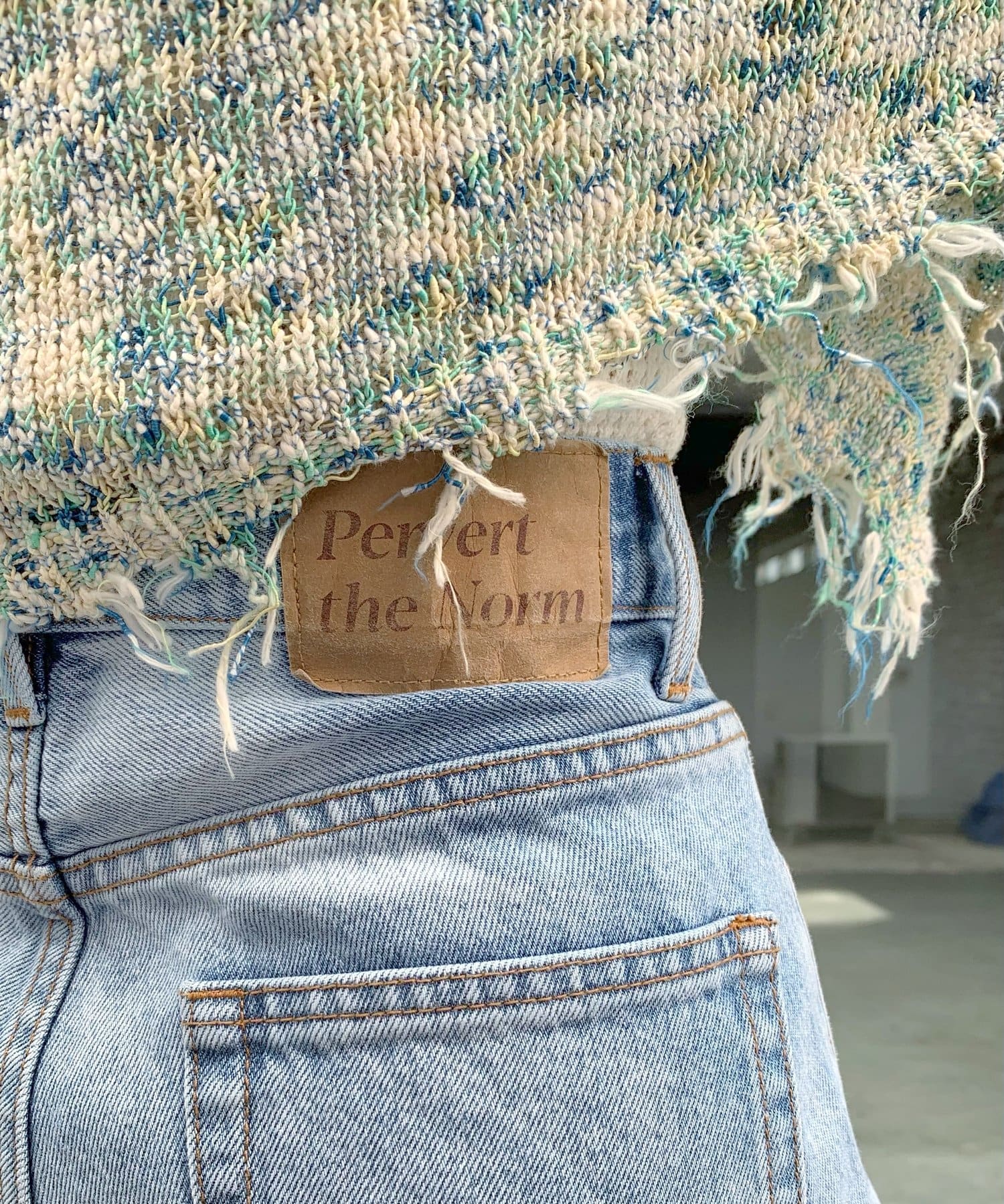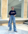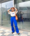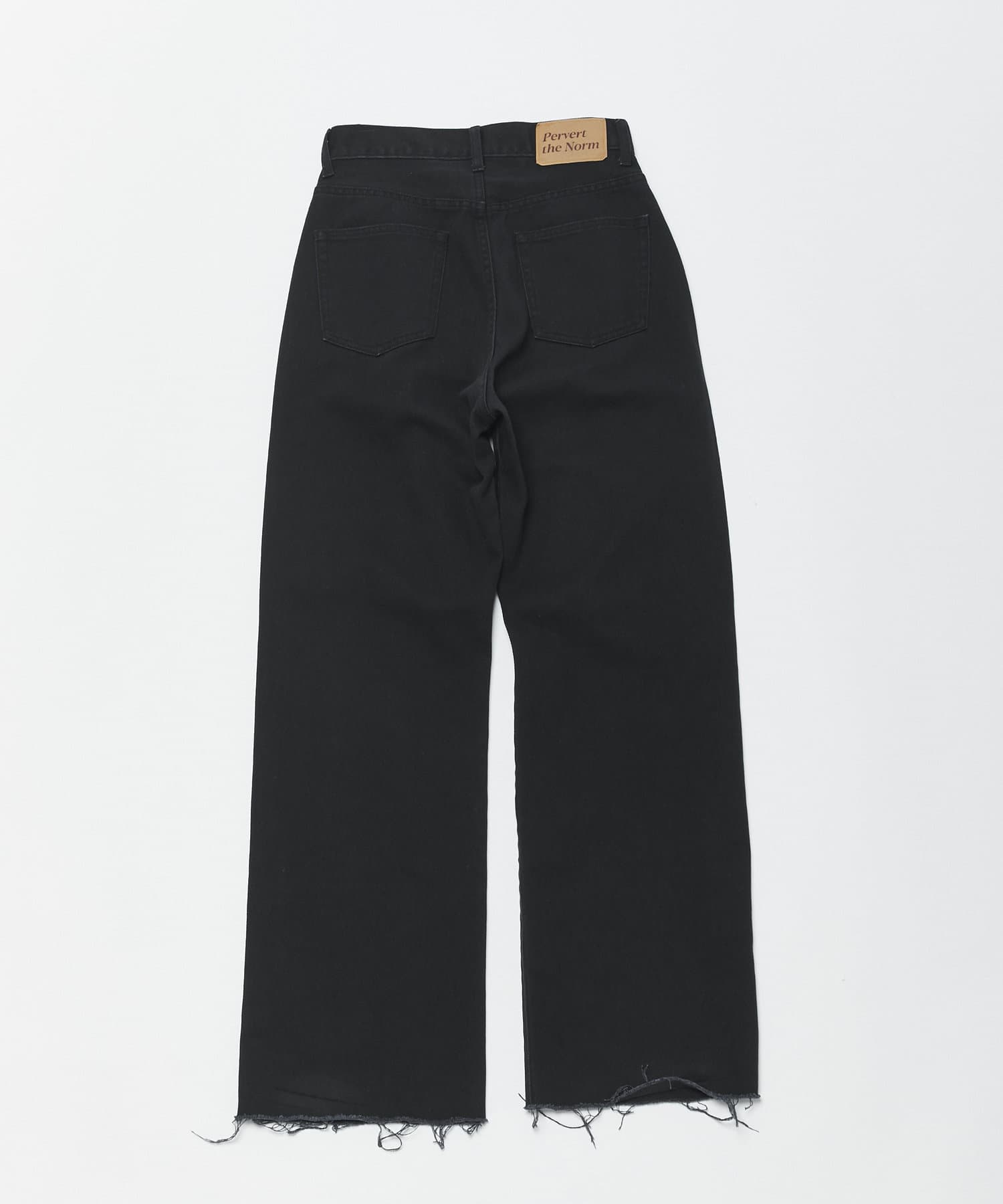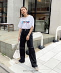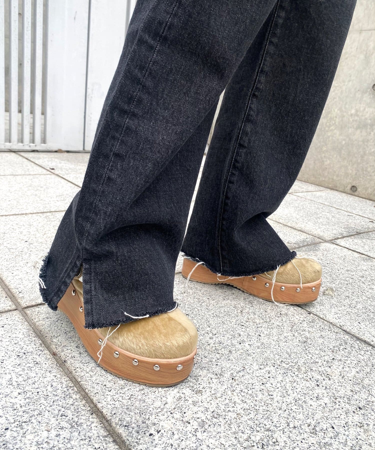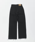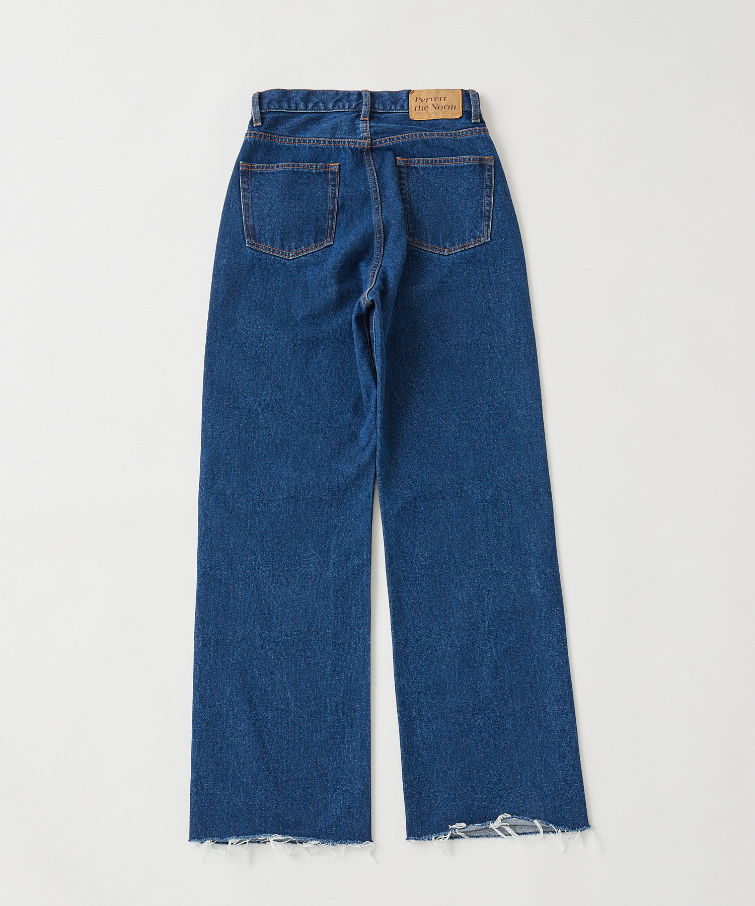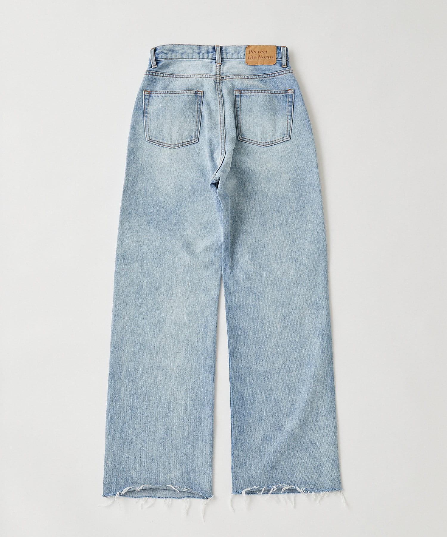 膝の大胆なカッティング+裾のスリットがコーデのポイントになるダメージデニム