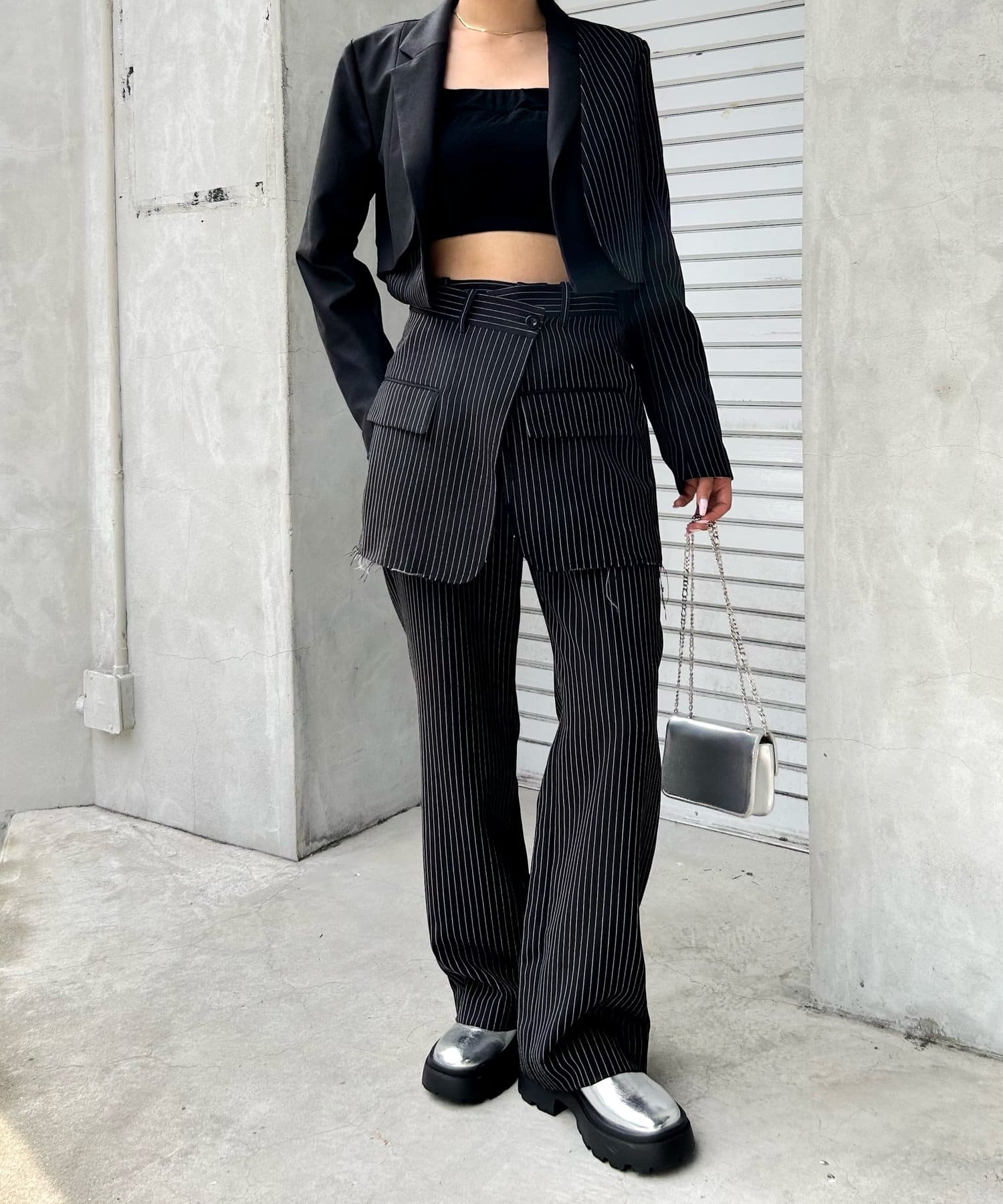 -カット素材はもちろん、ブラウスなどのデザイントップスとの合わせもおすすめ。