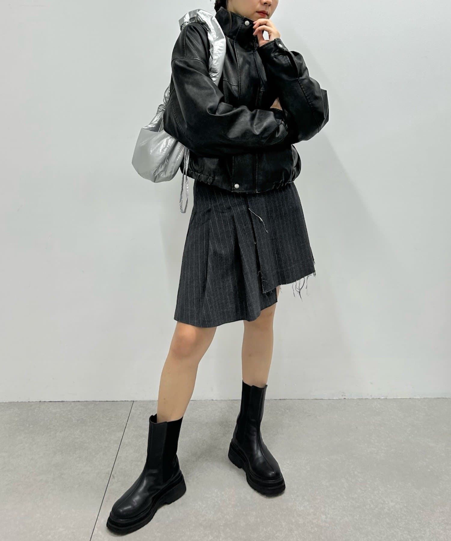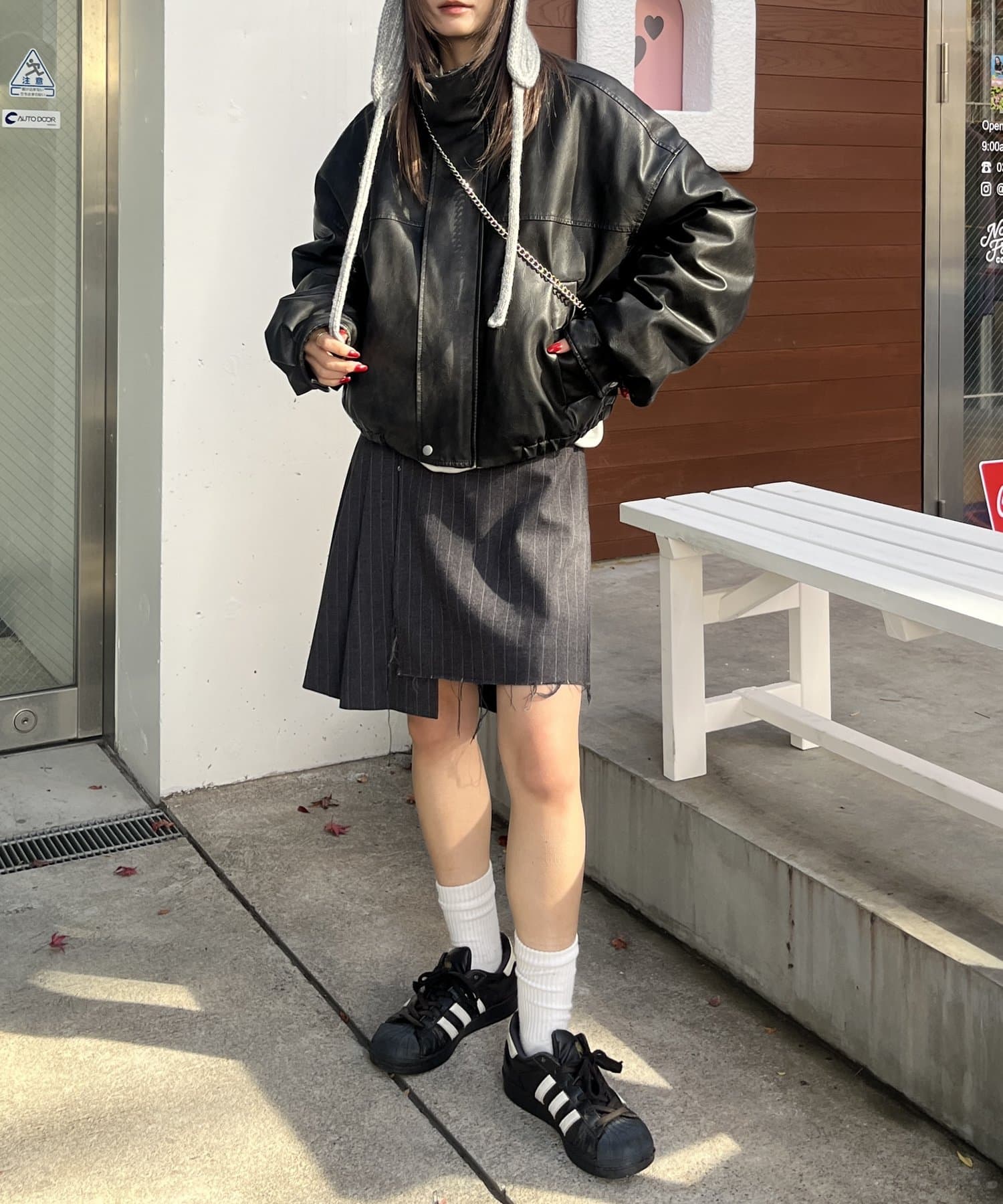 プリーツスカート、ミニスカートを合わせ今季トレンドの韓国ストリートスタイル。