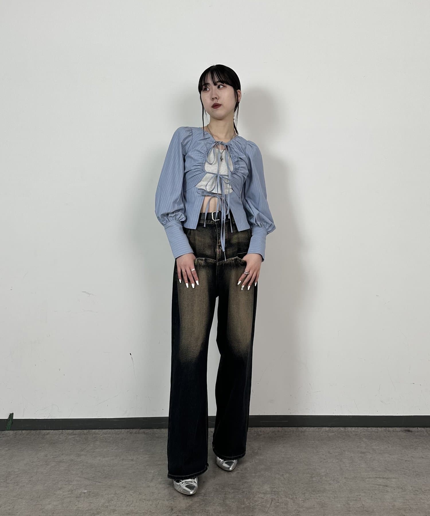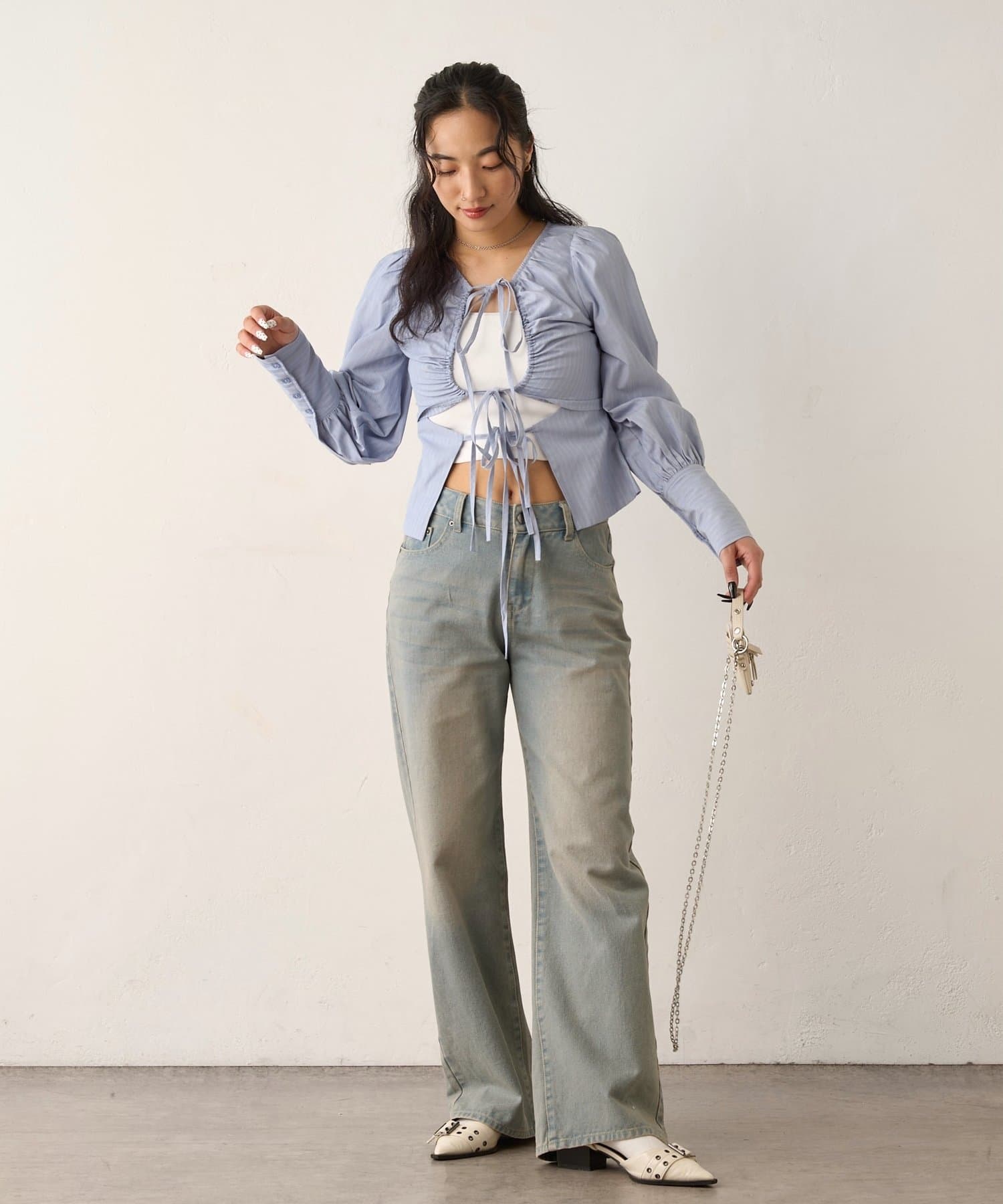 色んな素材感のタイプの違うブラウスですが、デニムと相性抜群です。