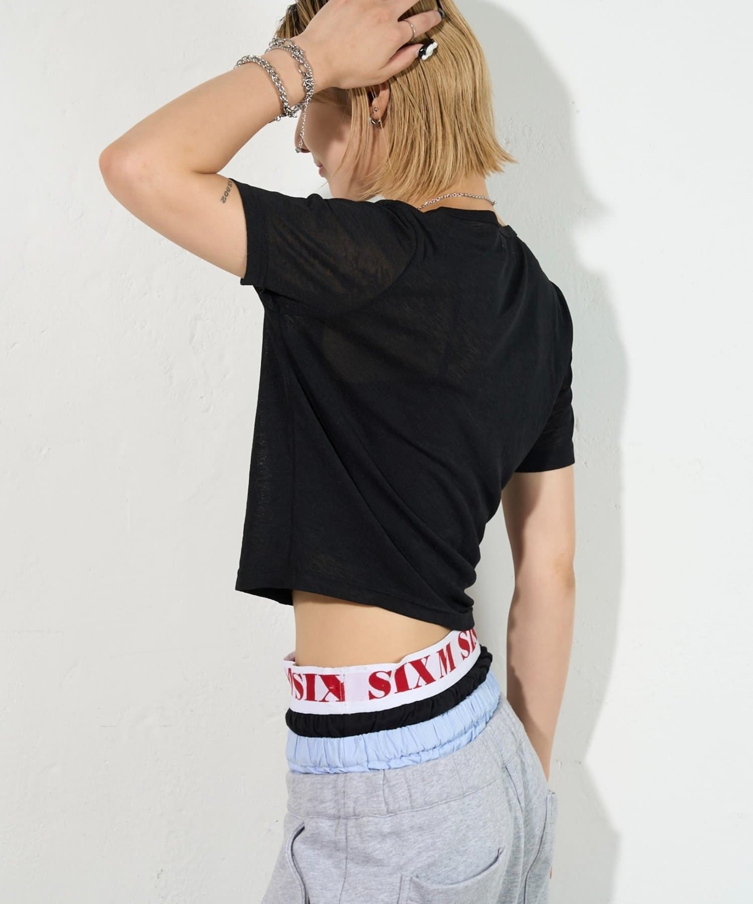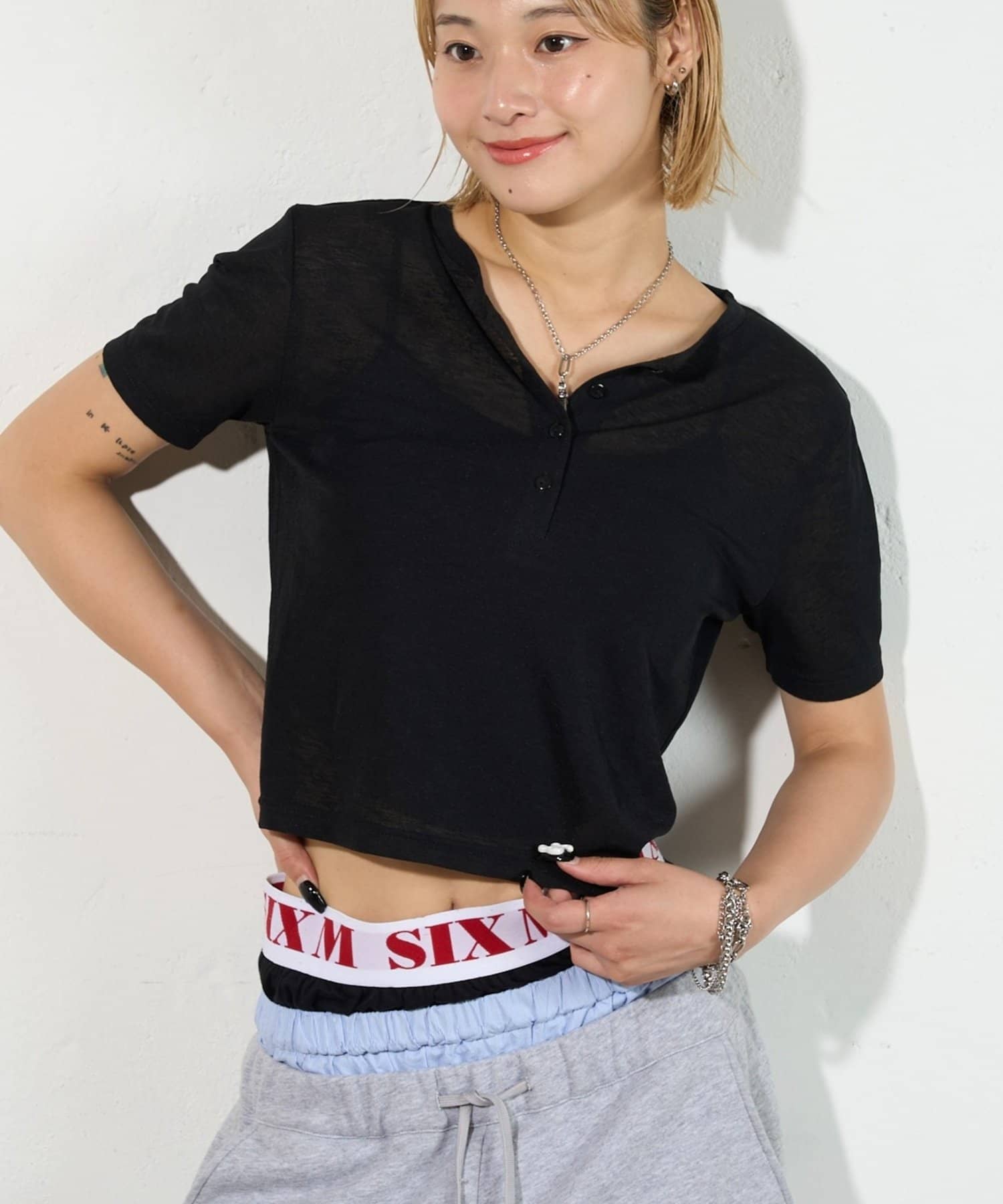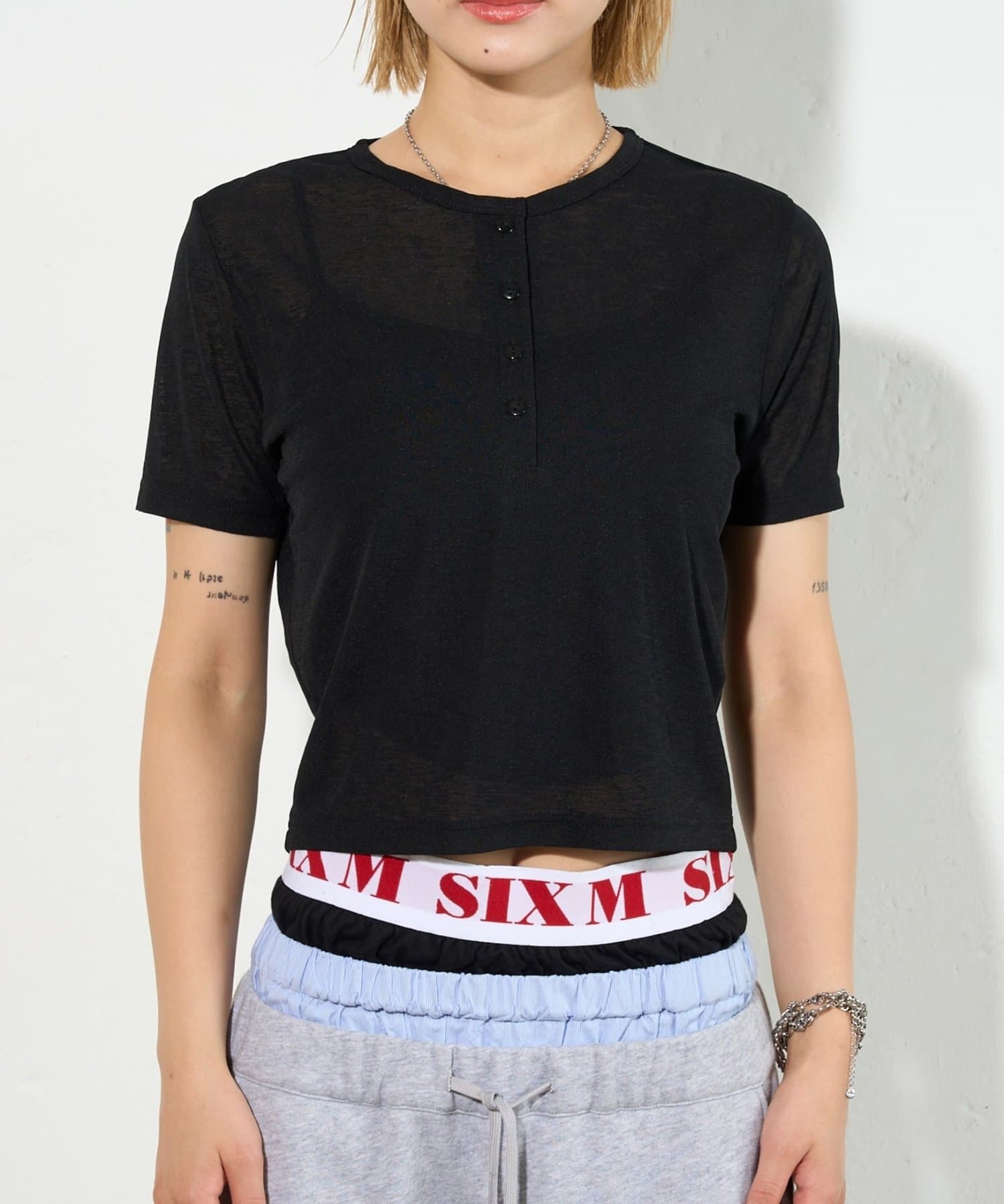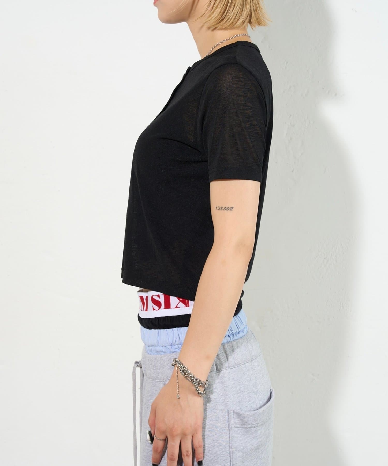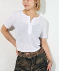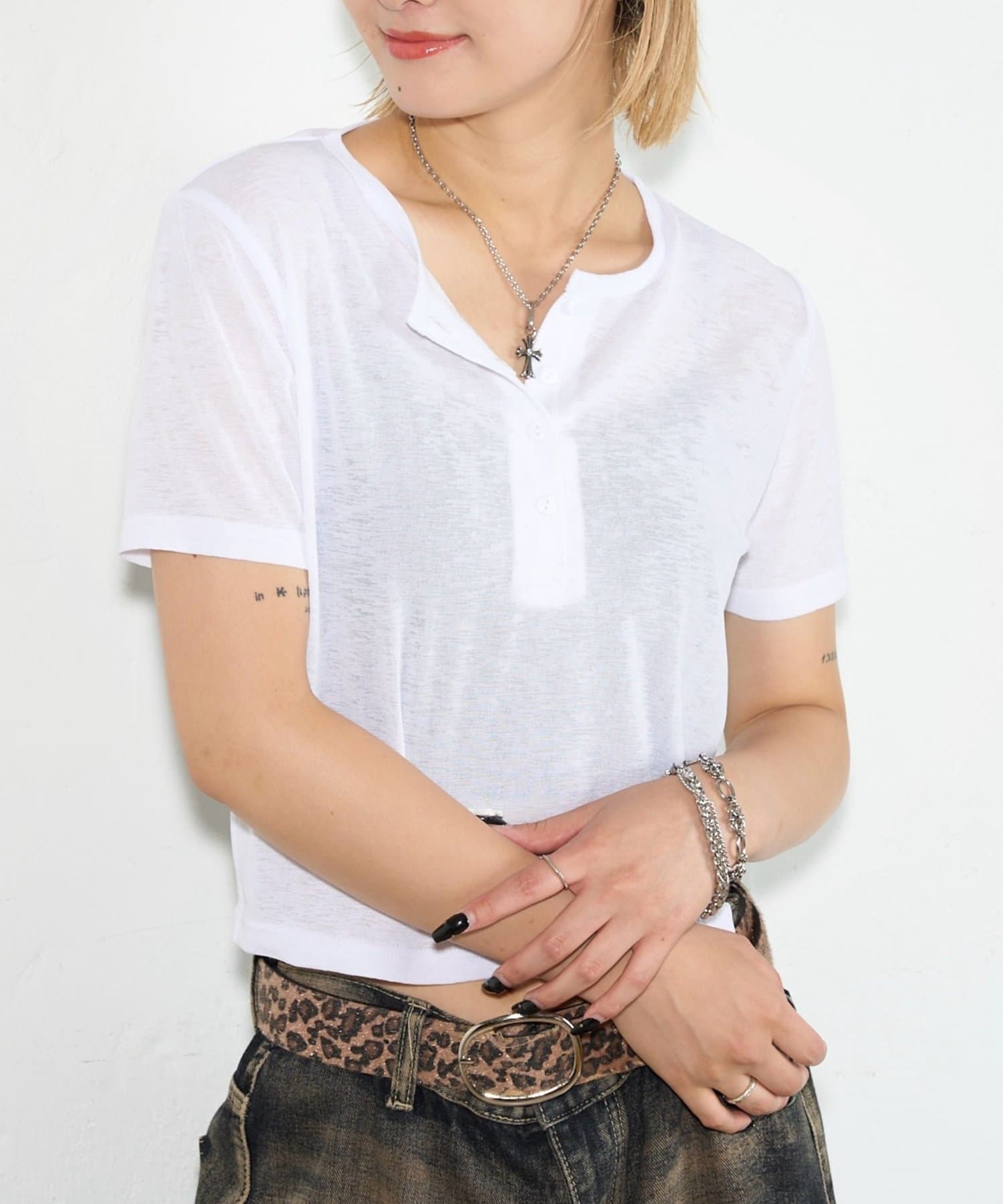 トレンドのシアー素材を使用したヘンリーネックTシャツ