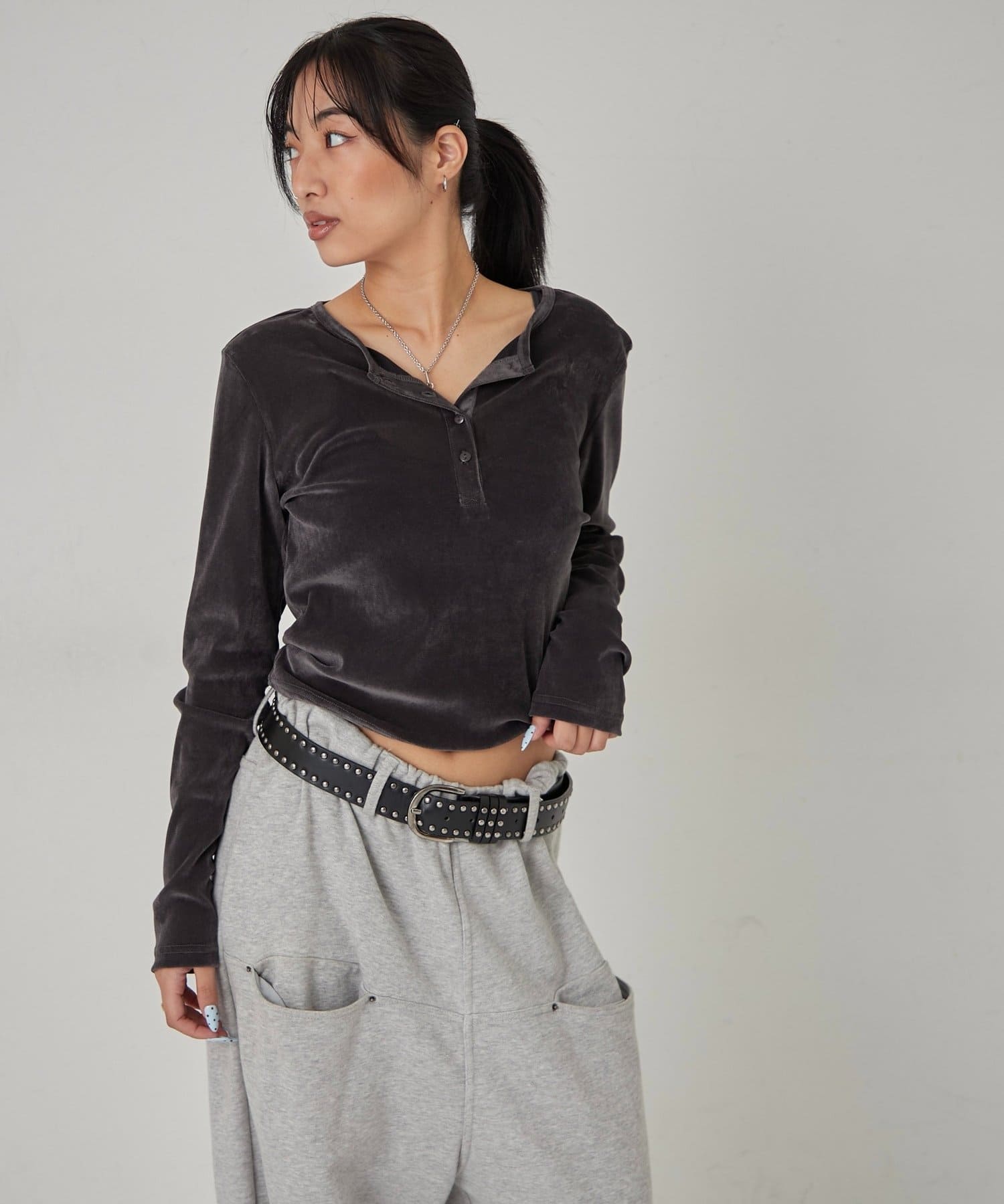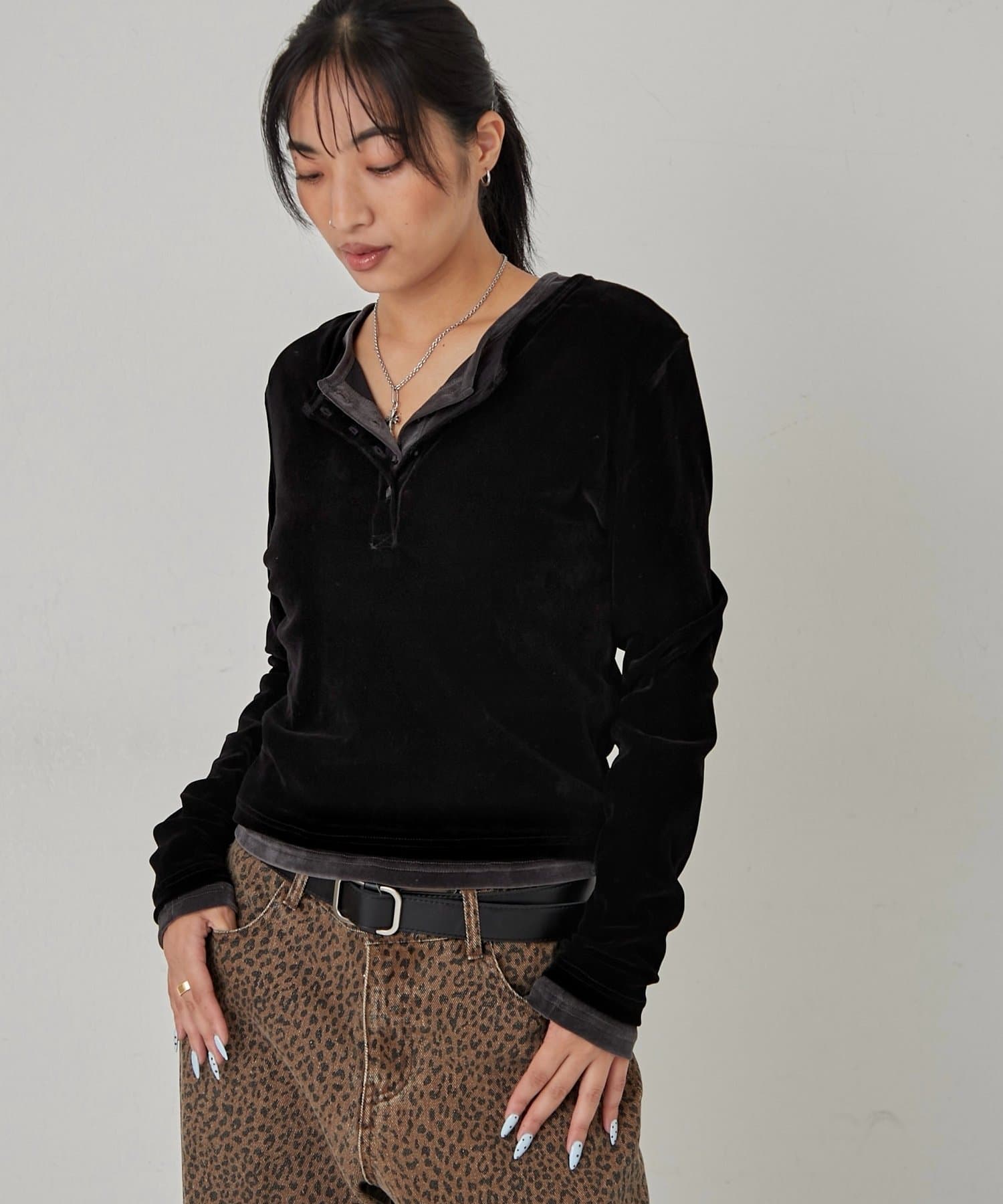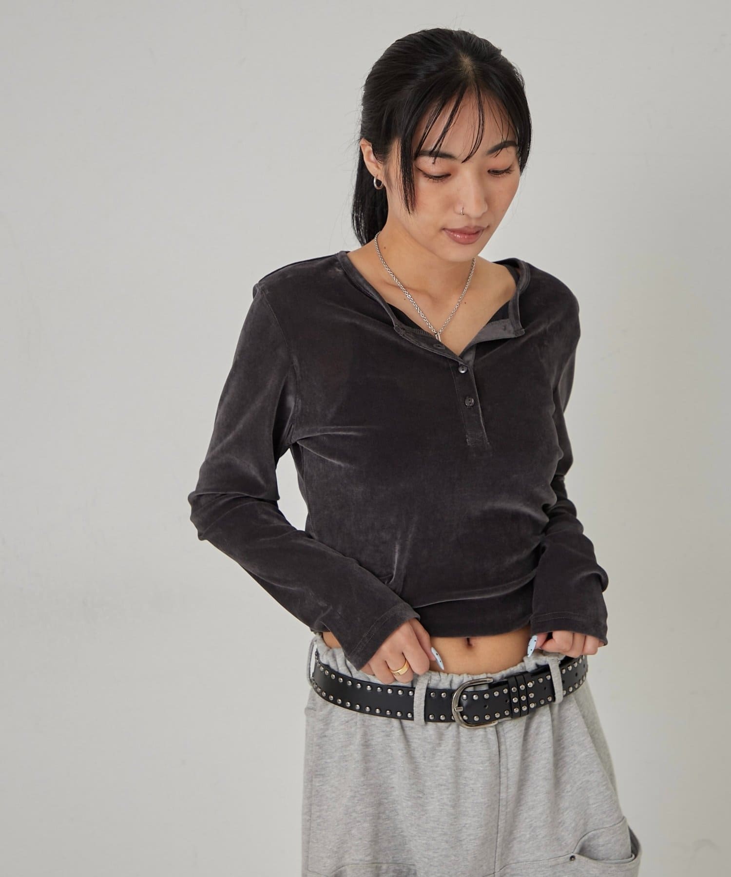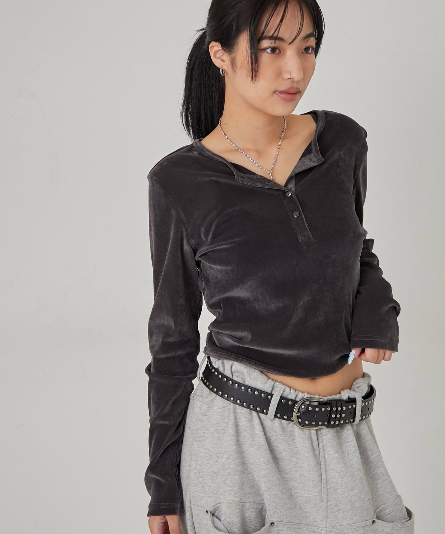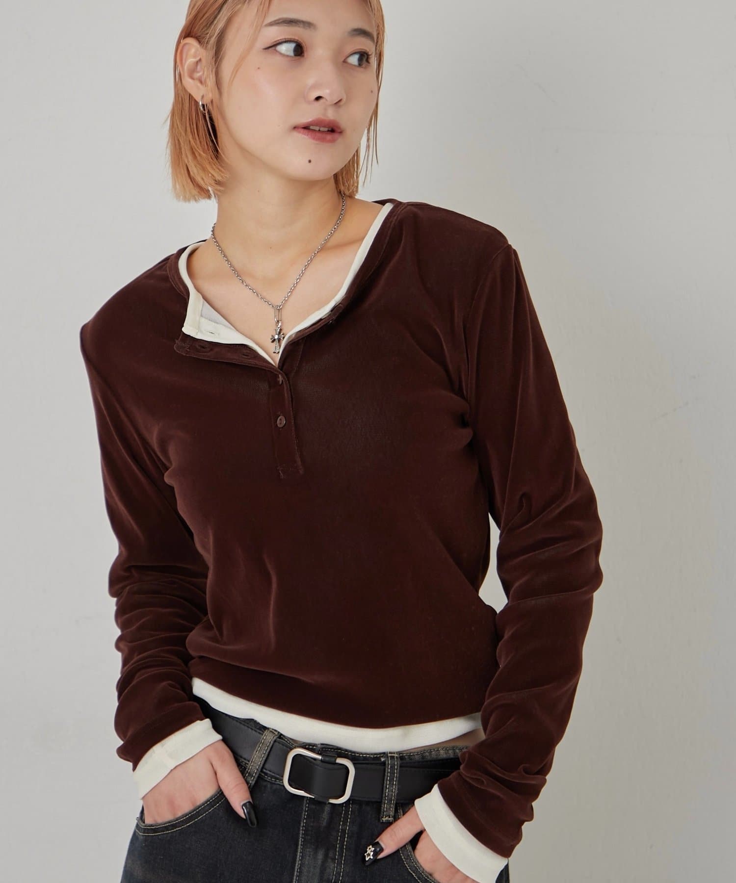 トレンドのヘンリーネックトップスを、フロッキーメッシュ素材でアップデート