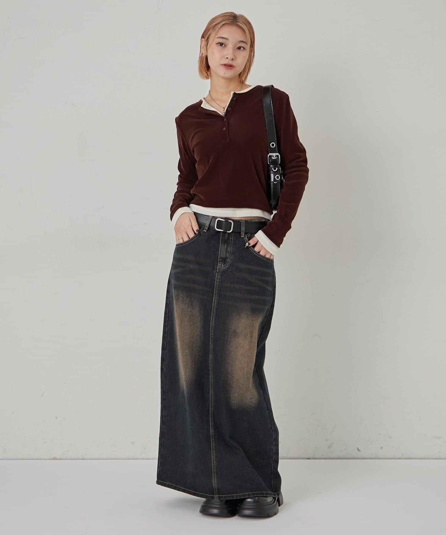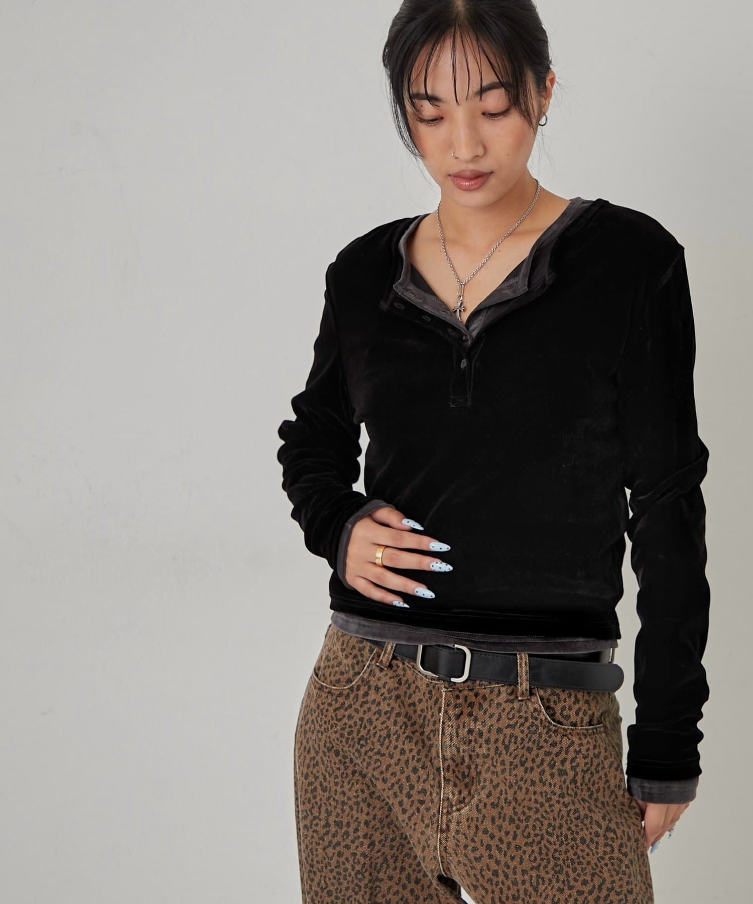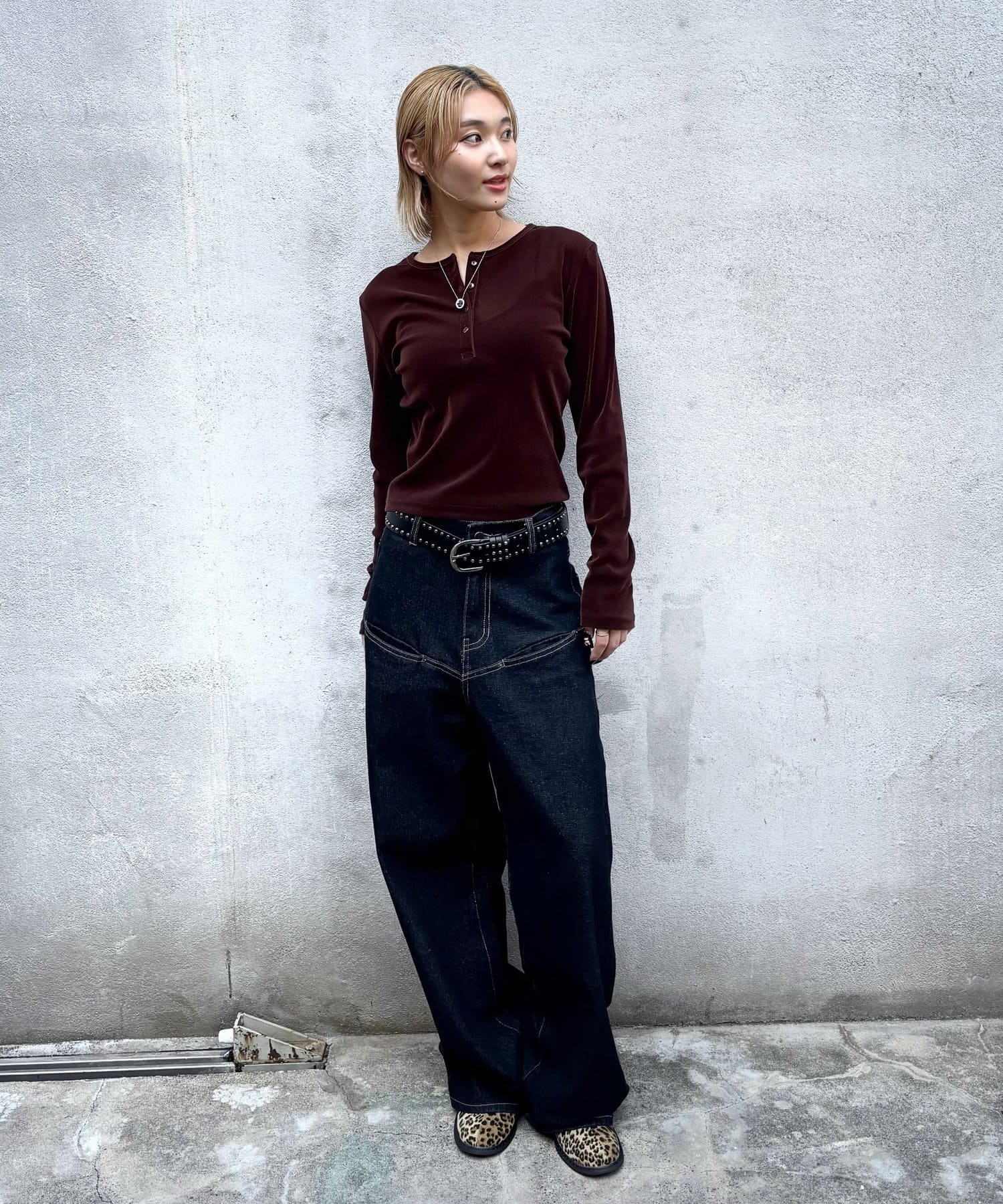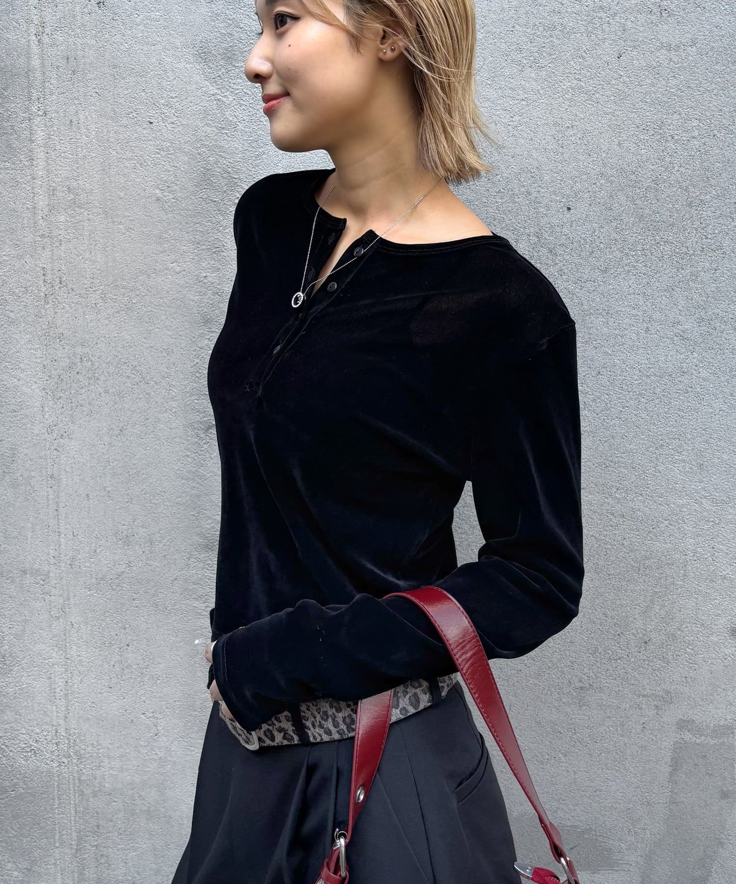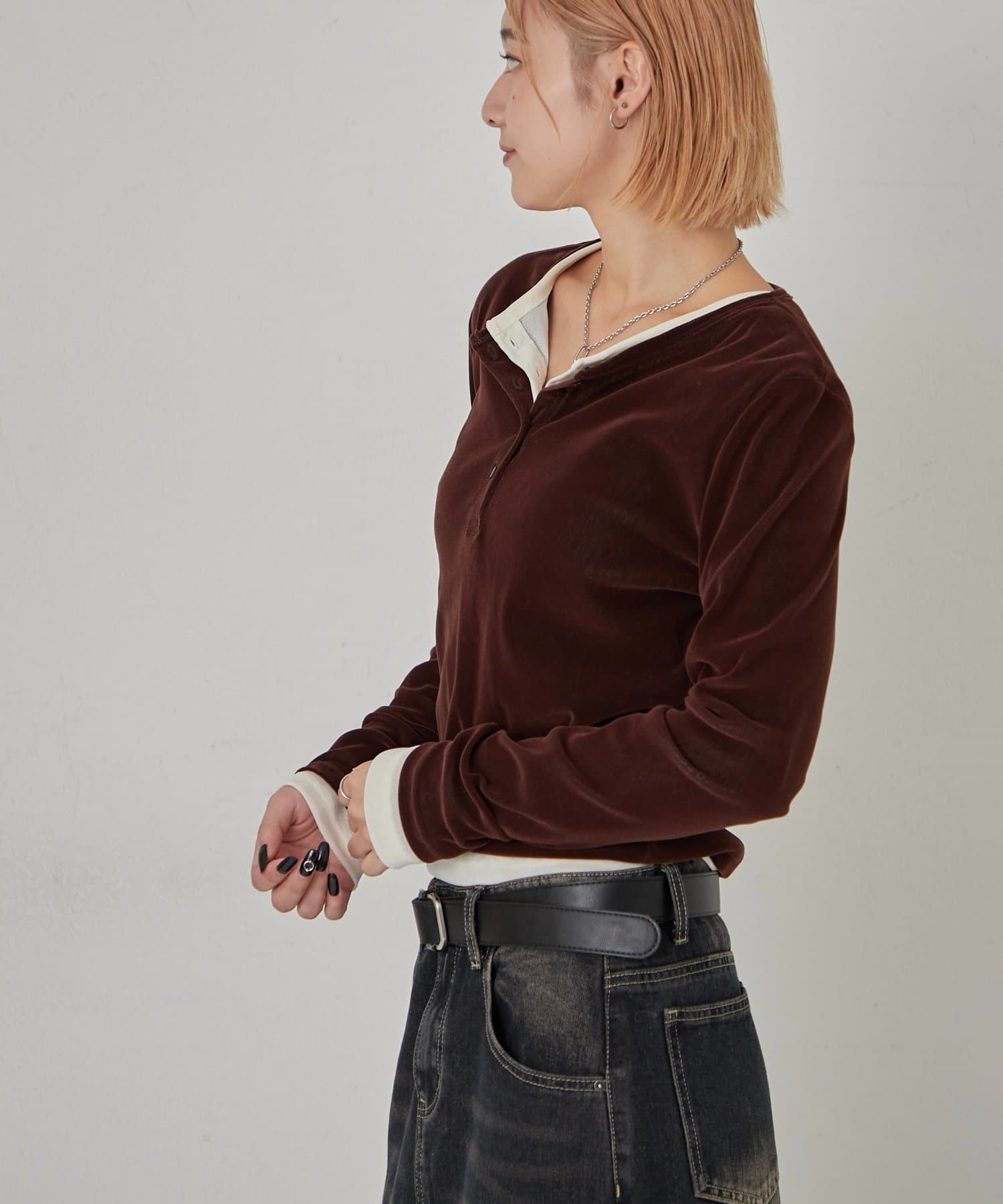 ・ボタンを開けて、インナーとのレイヤードを楽しむのもおすすめです。