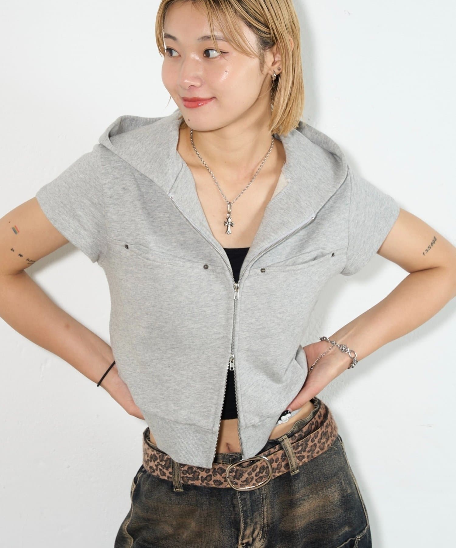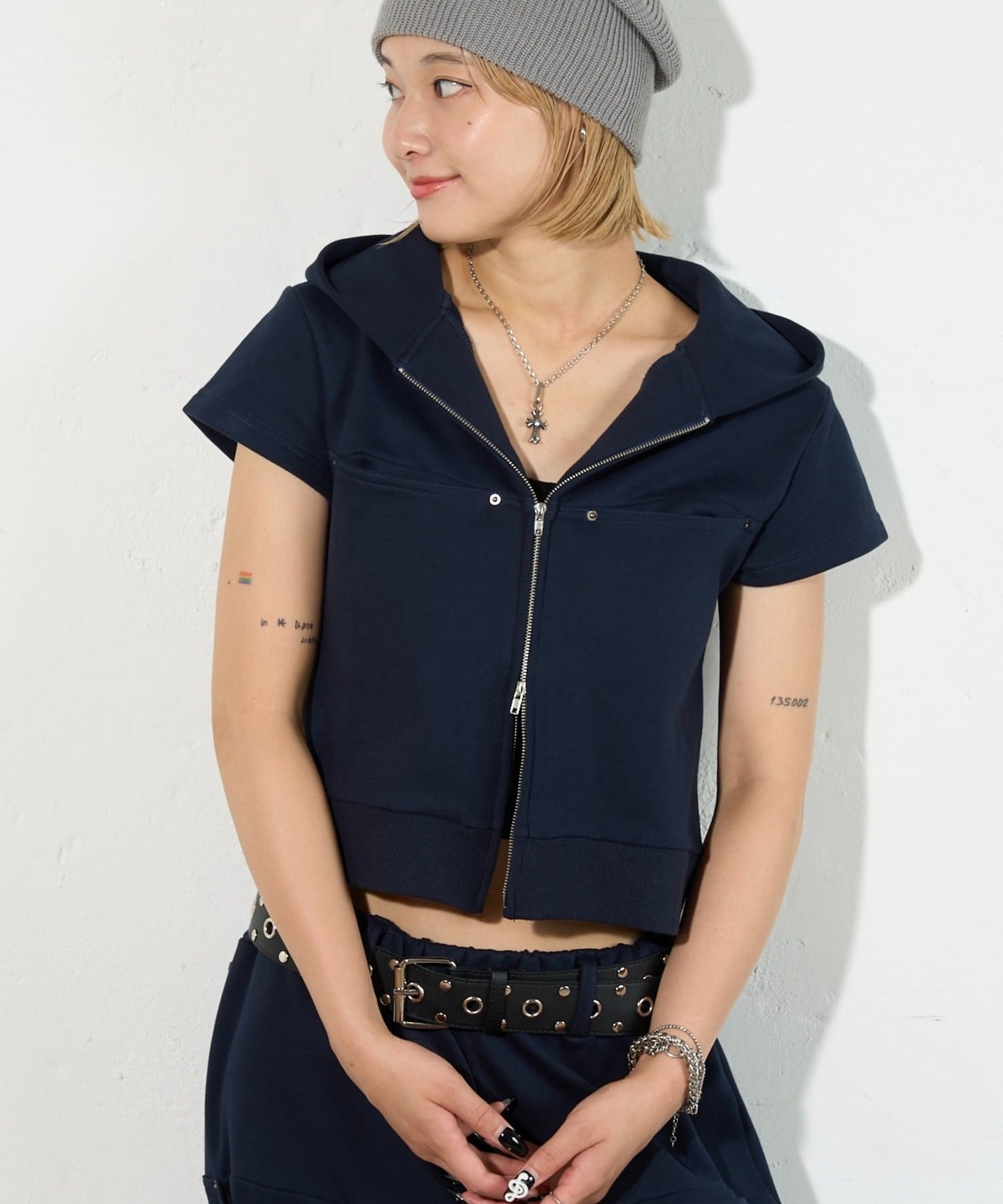 セットアップ対応!(スラッシュポケット付き)コンパクトダブルジップ半袖パーカー