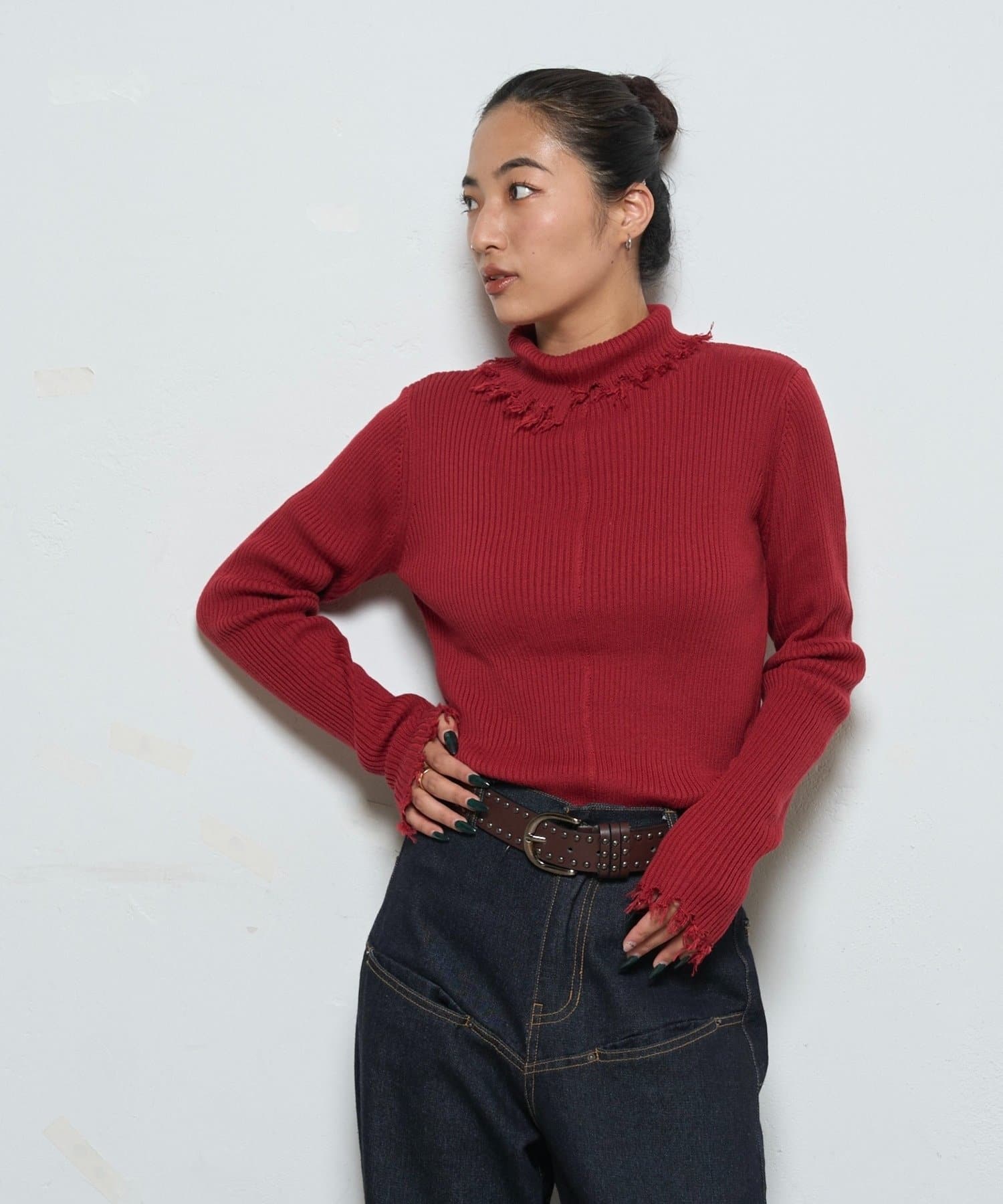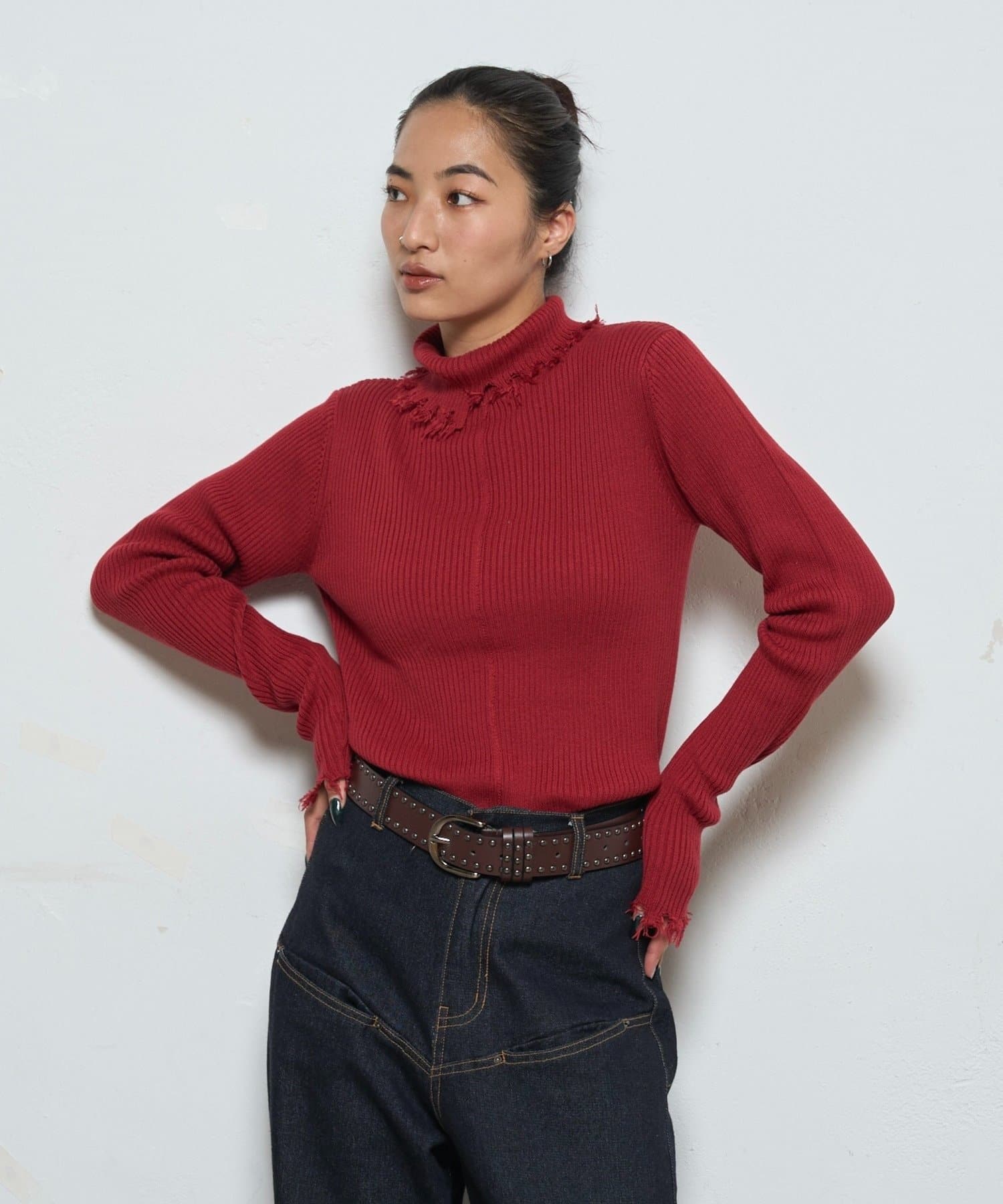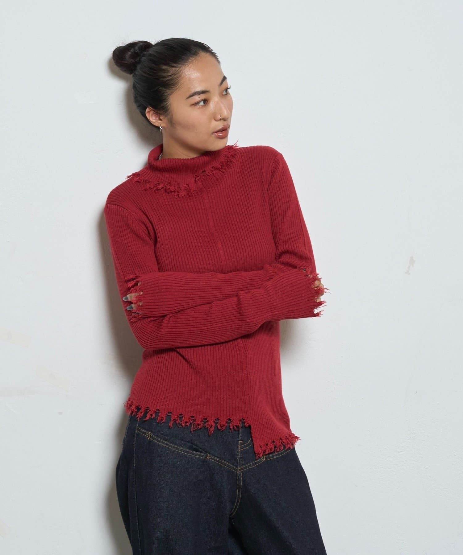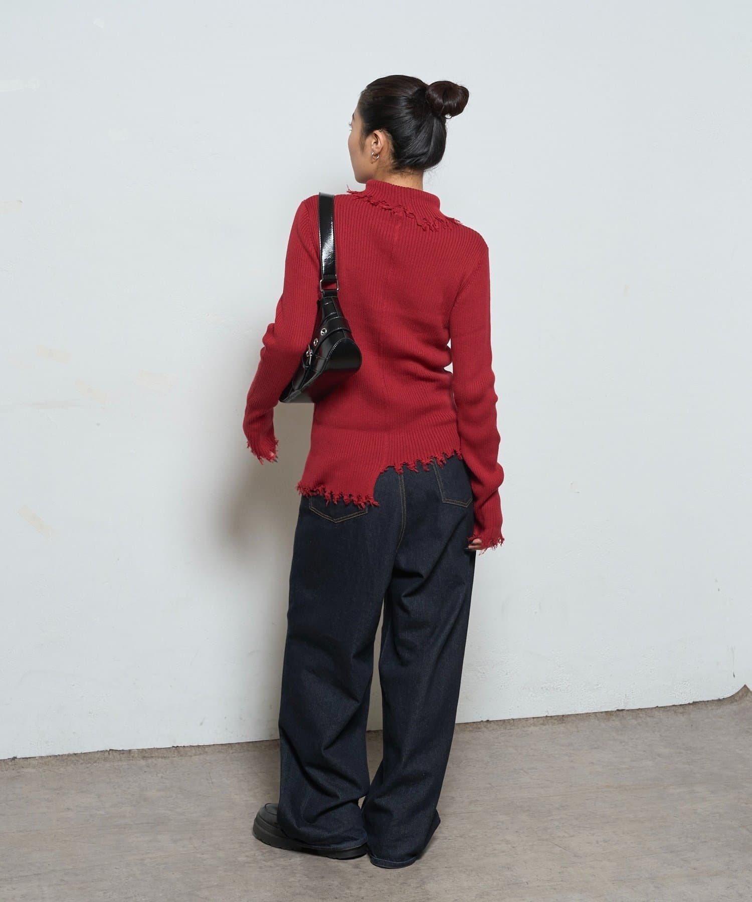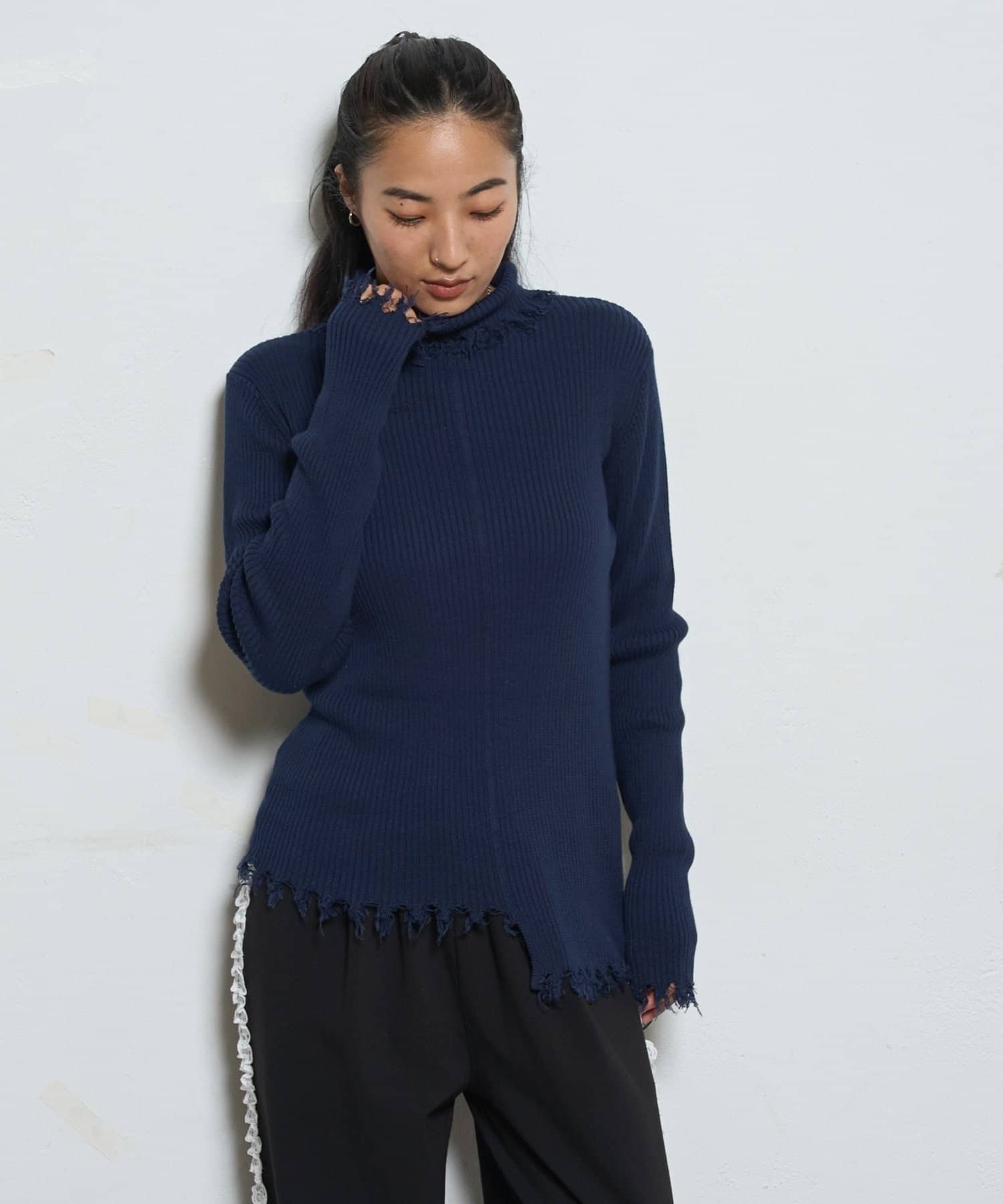 【WEB限定】エッジの効いたデザインが魅力!ダメージスライドリブニット