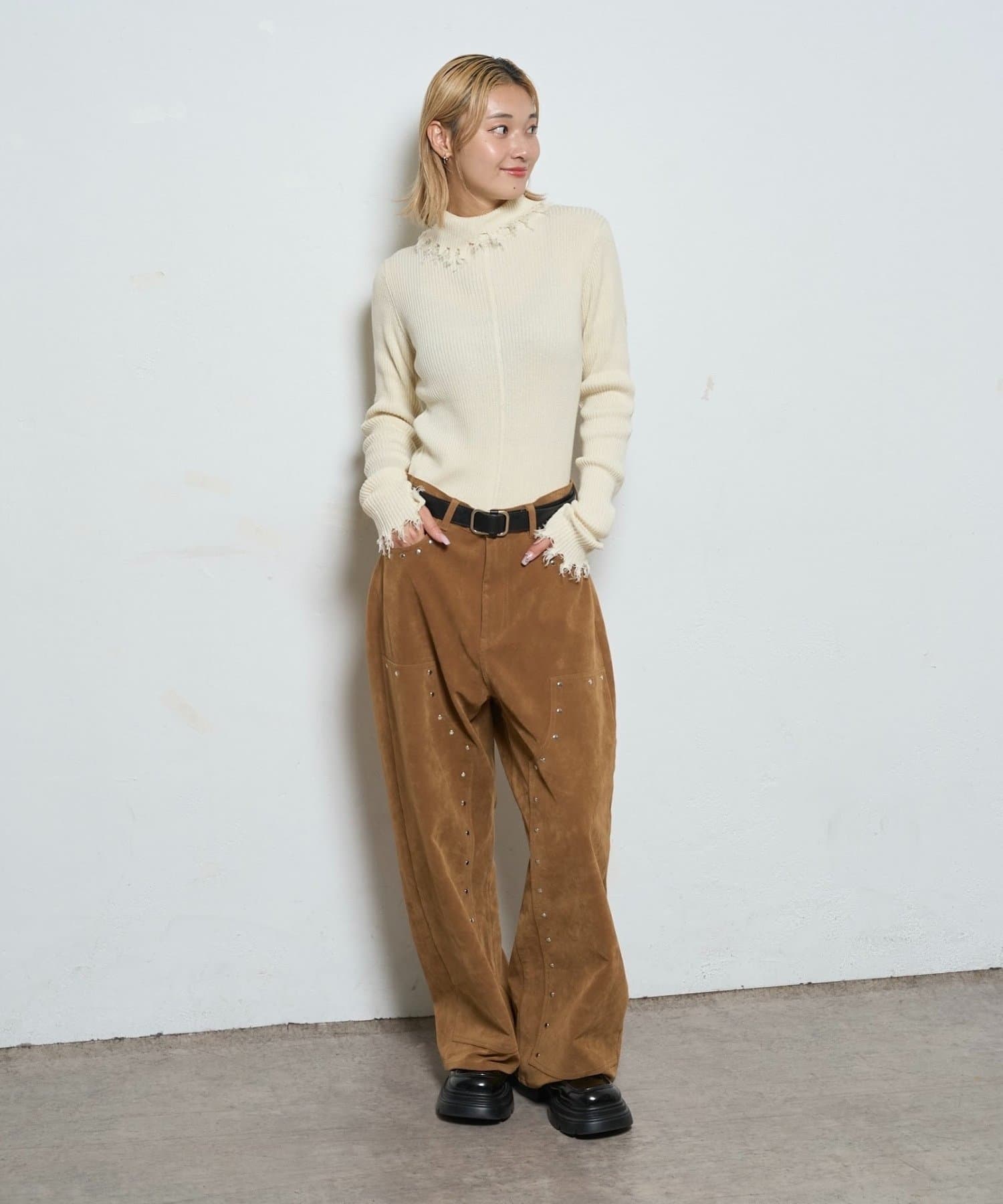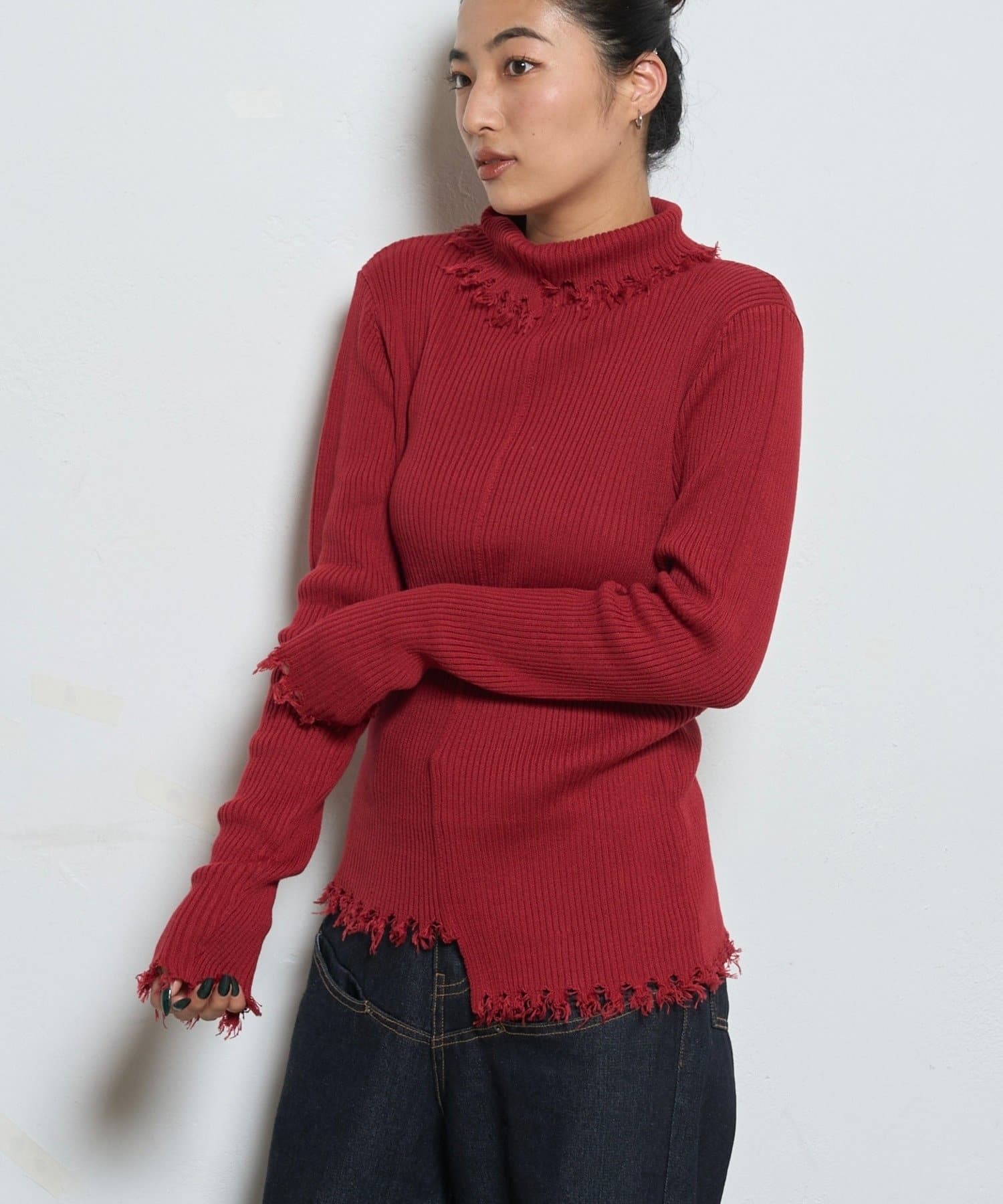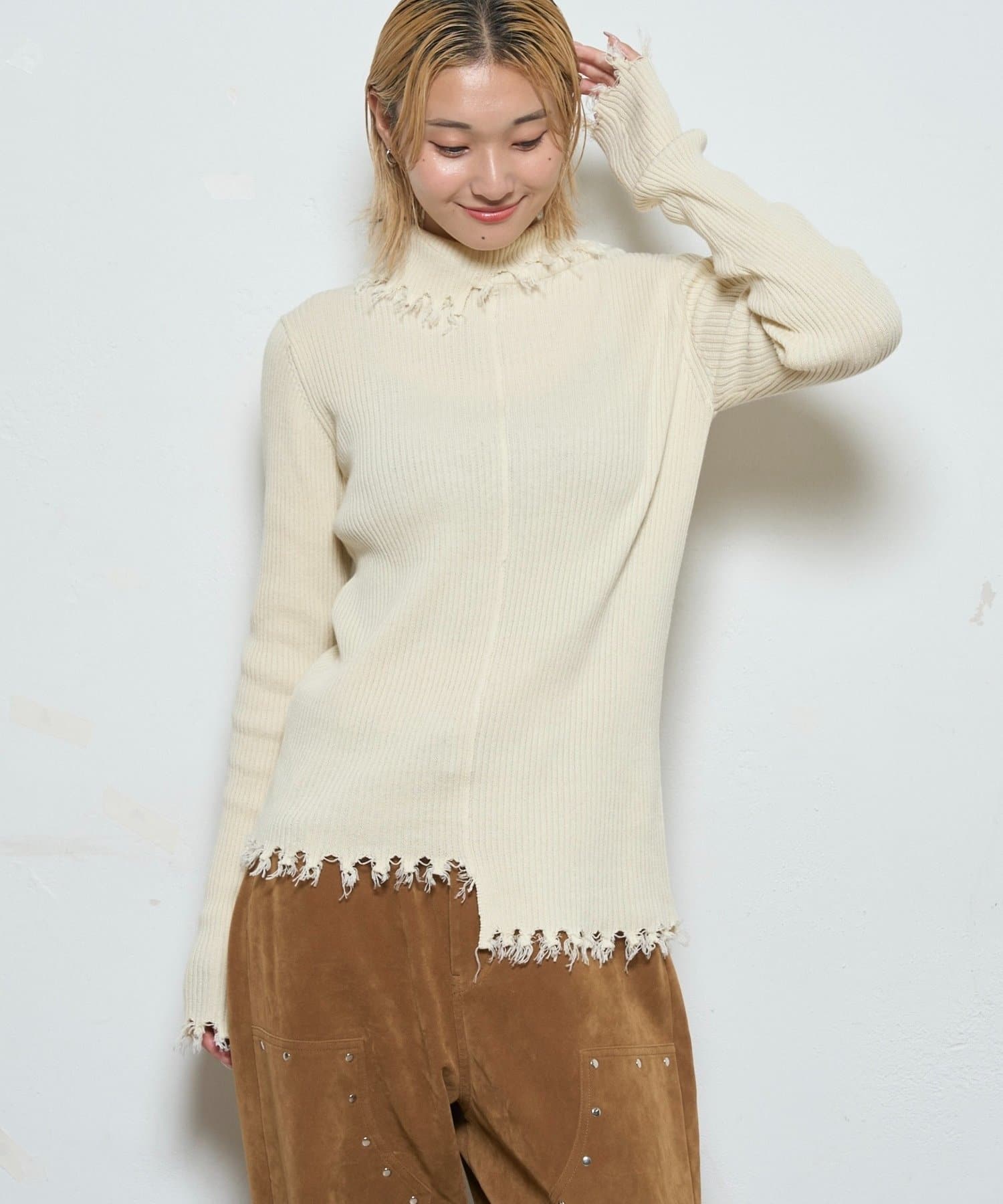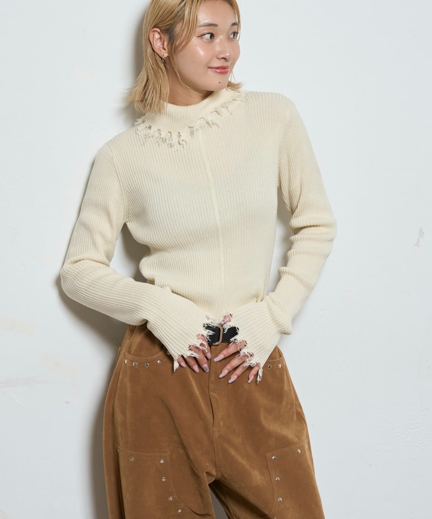 ・ トレンドのダメージ加工を施した、スタイリッシュなリブニット。