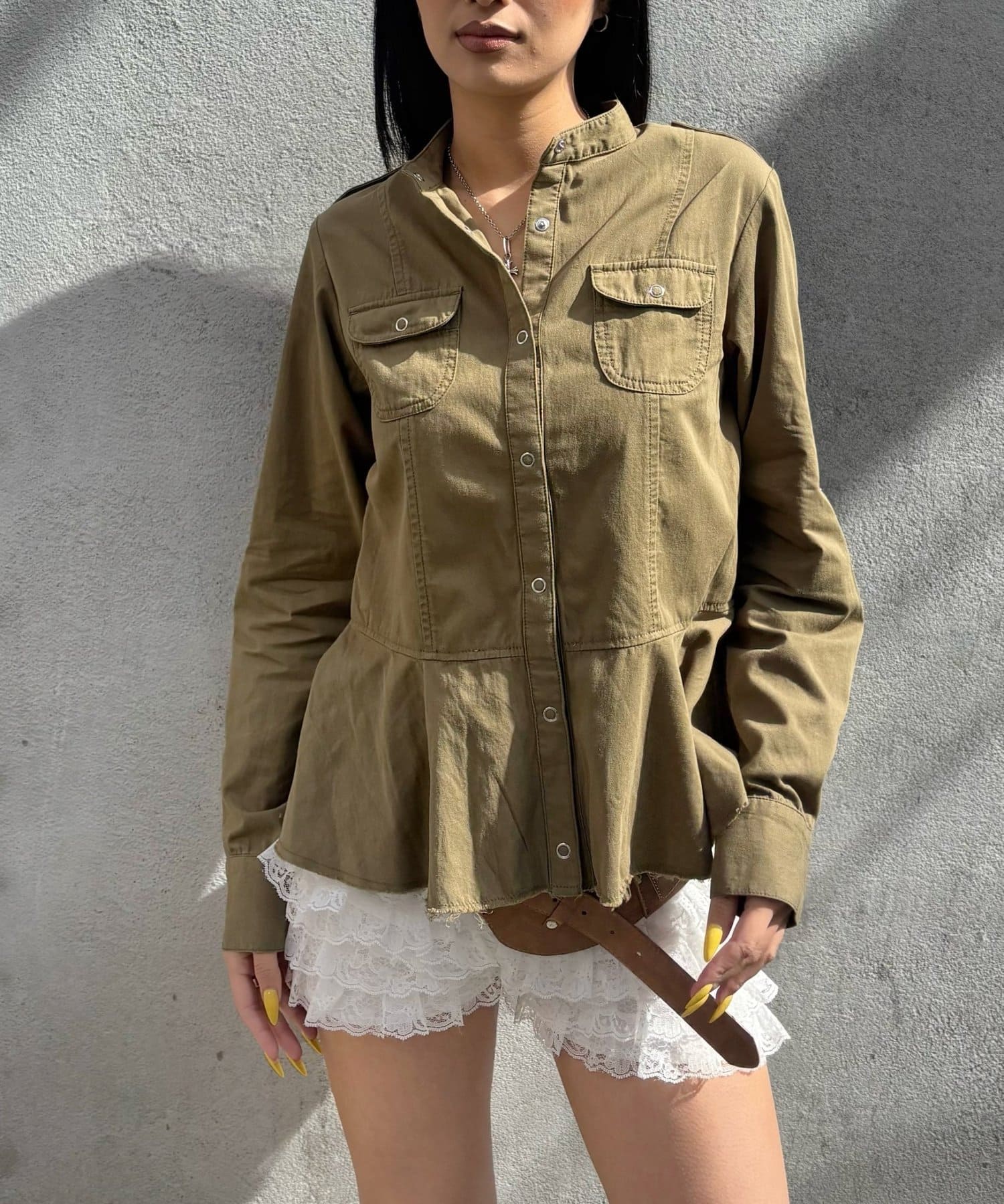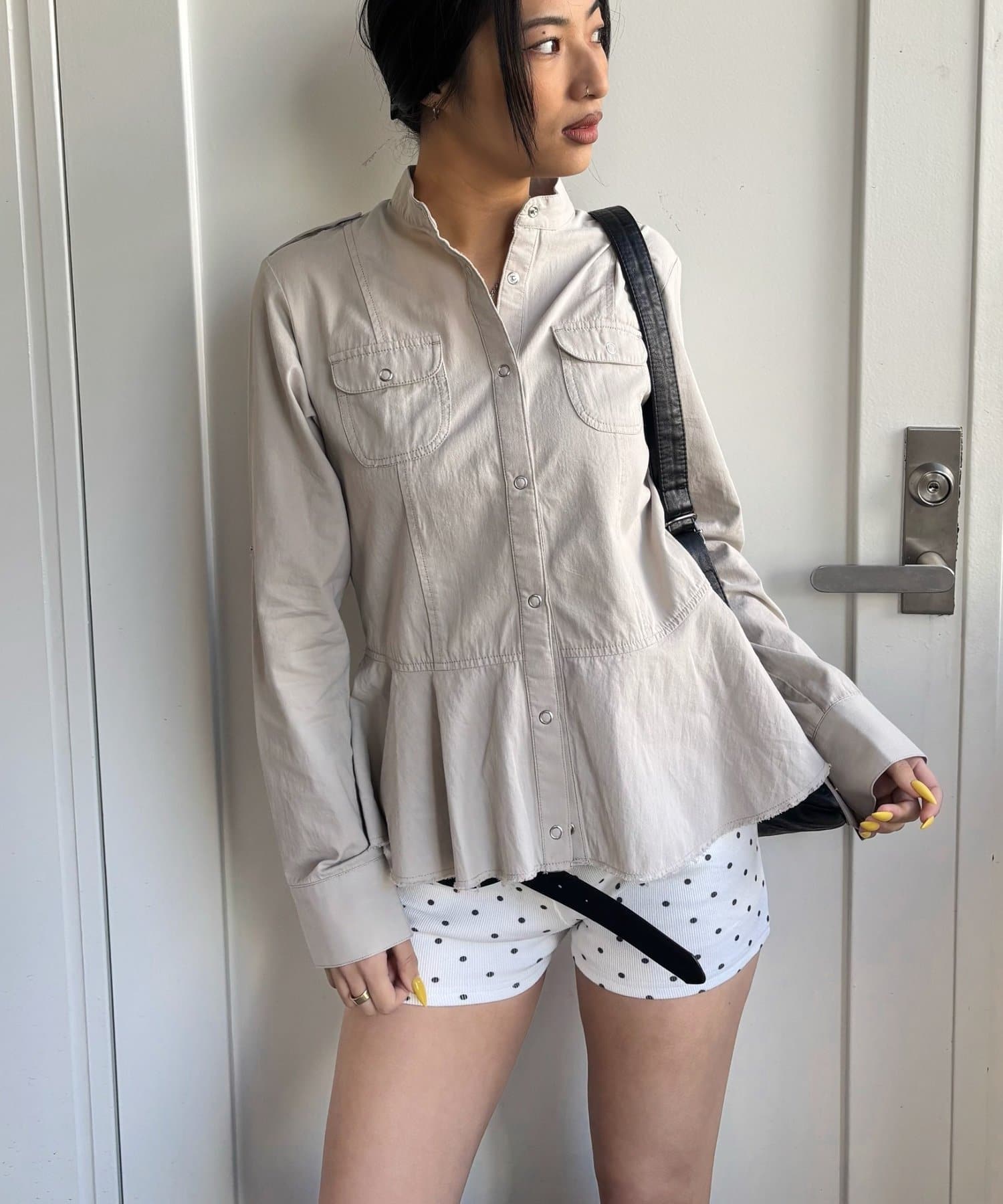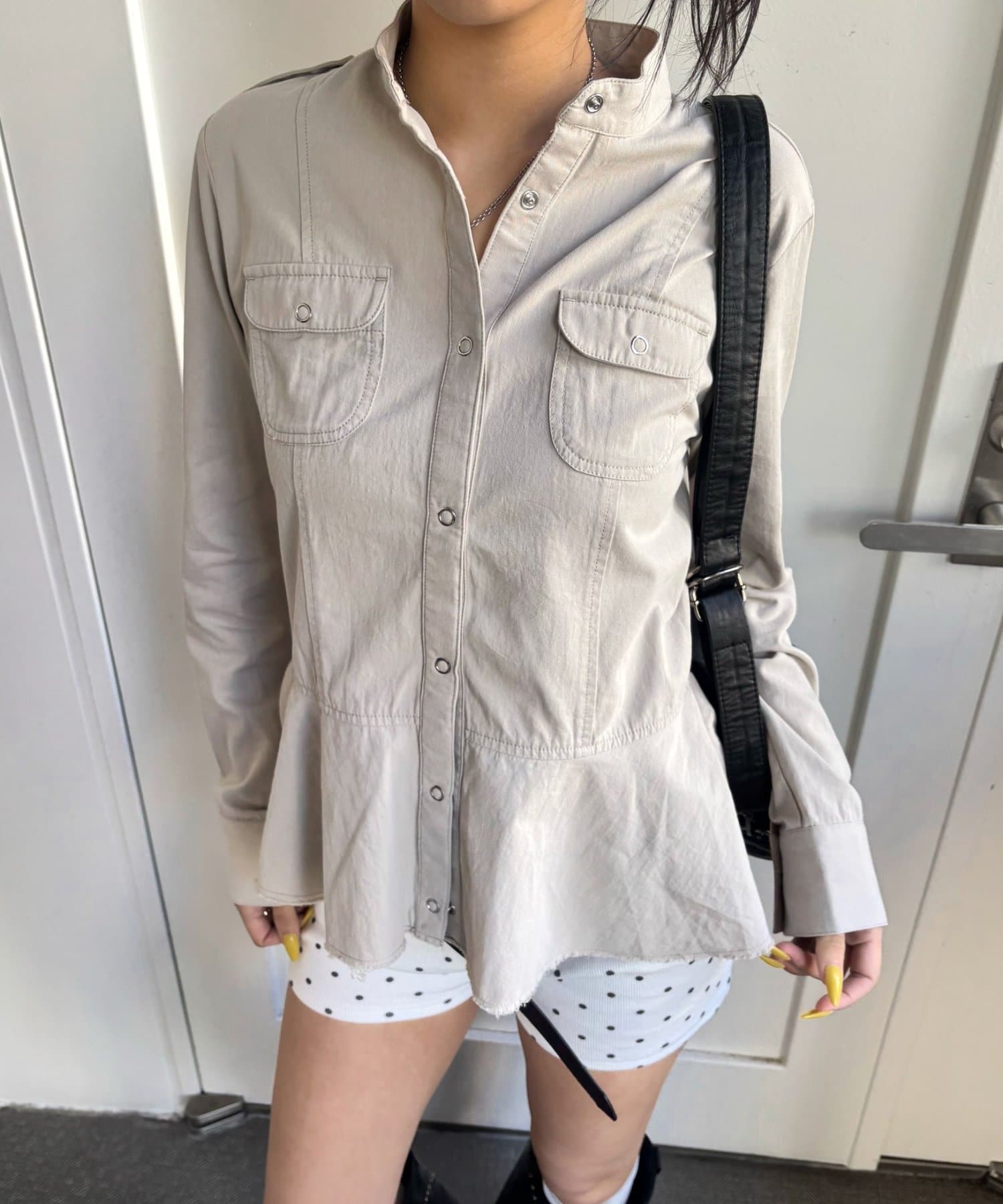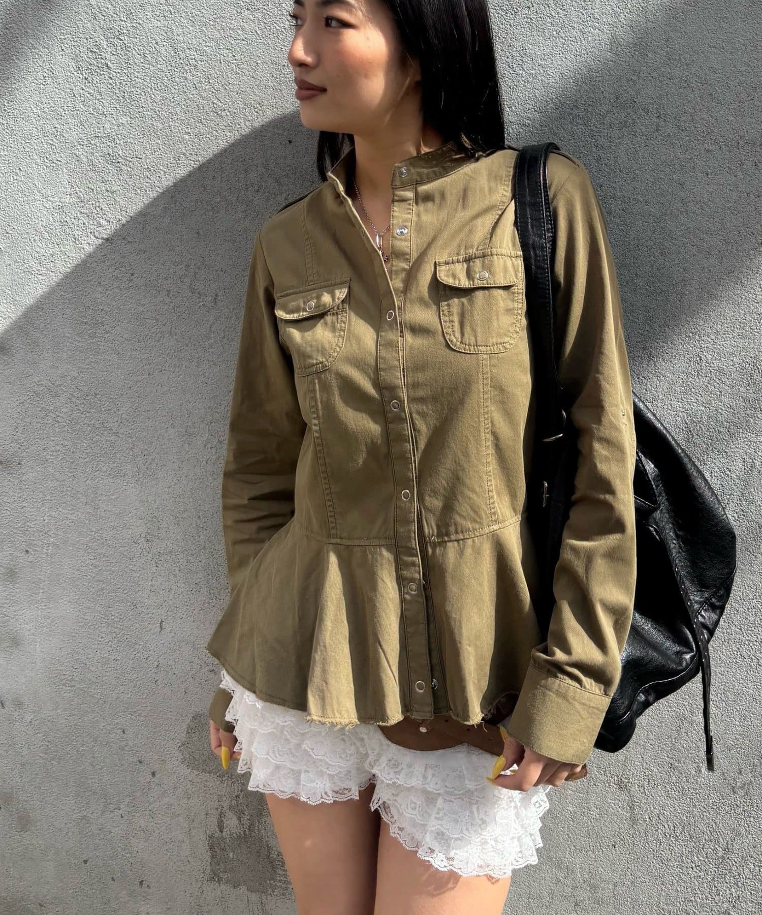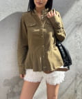 ミリタリー感とペプラムデザインで女性らしさもあるブラウス。