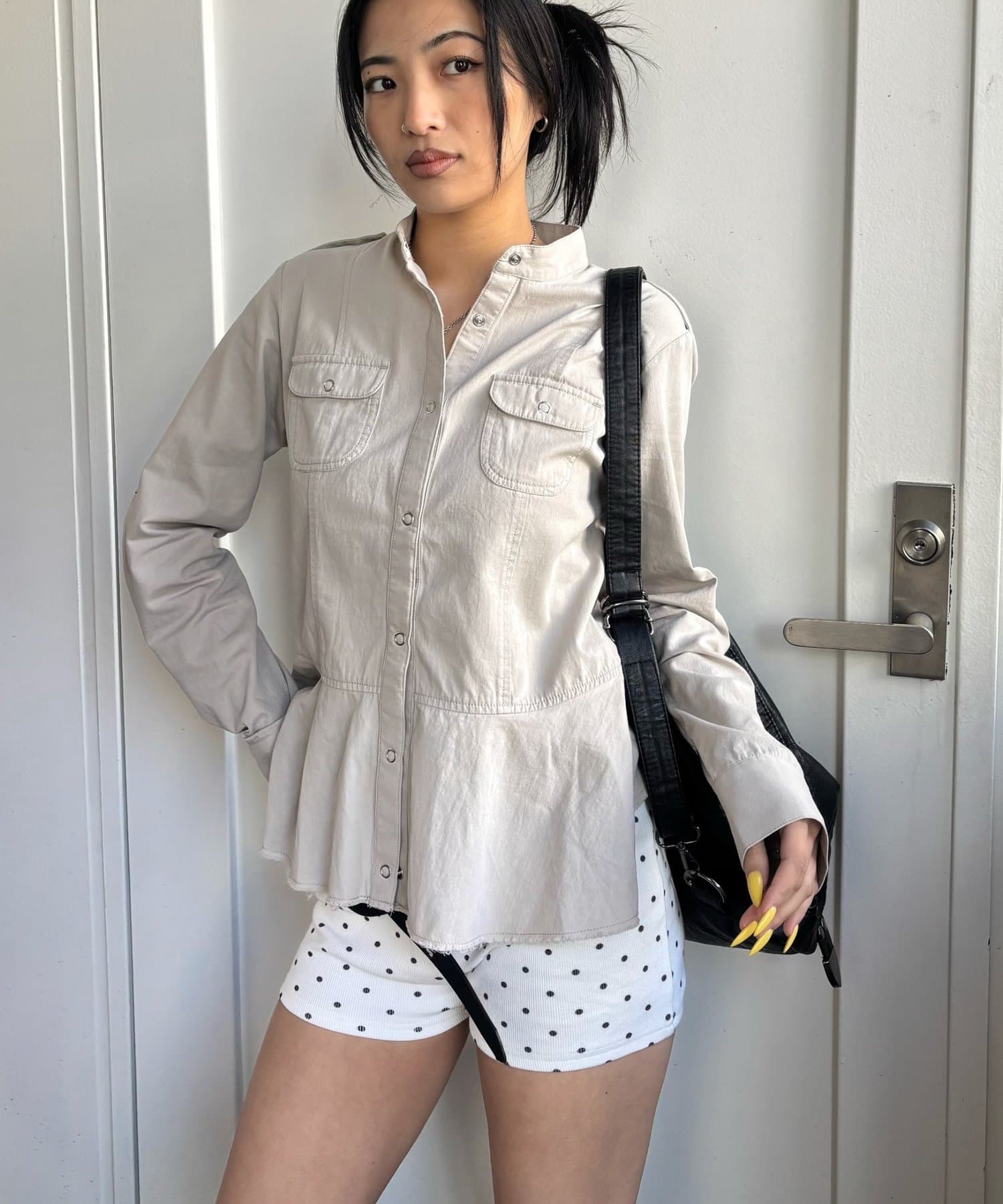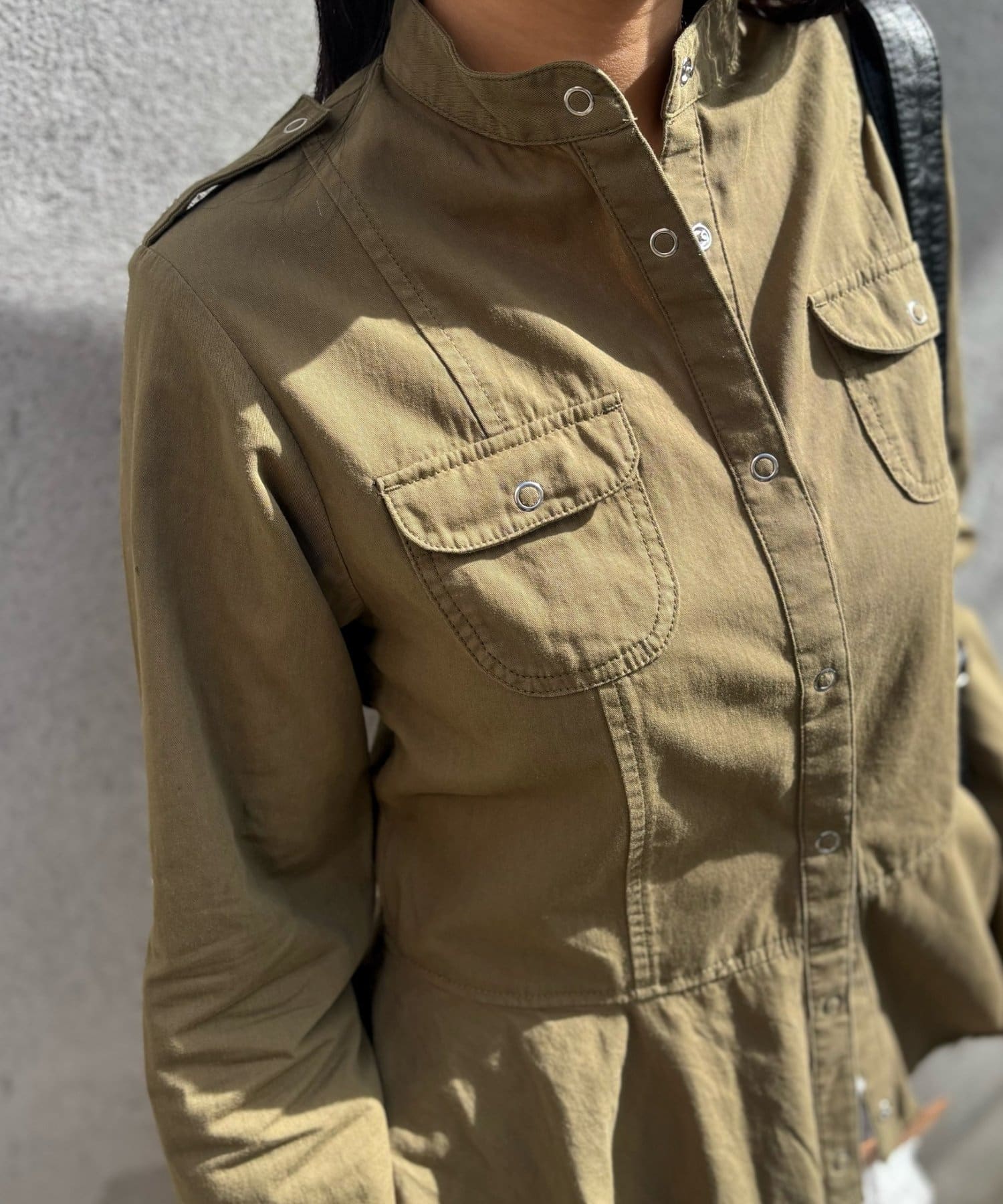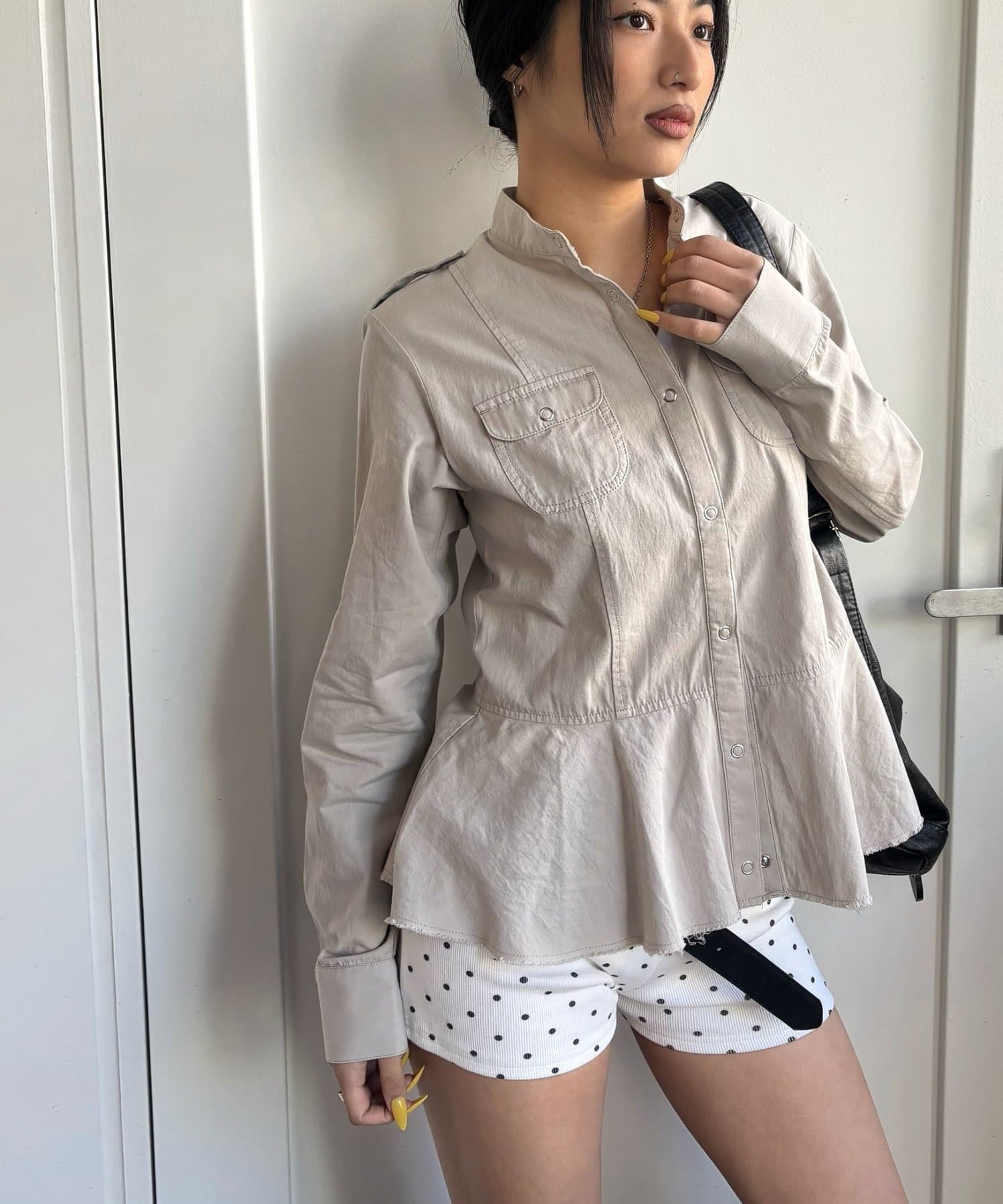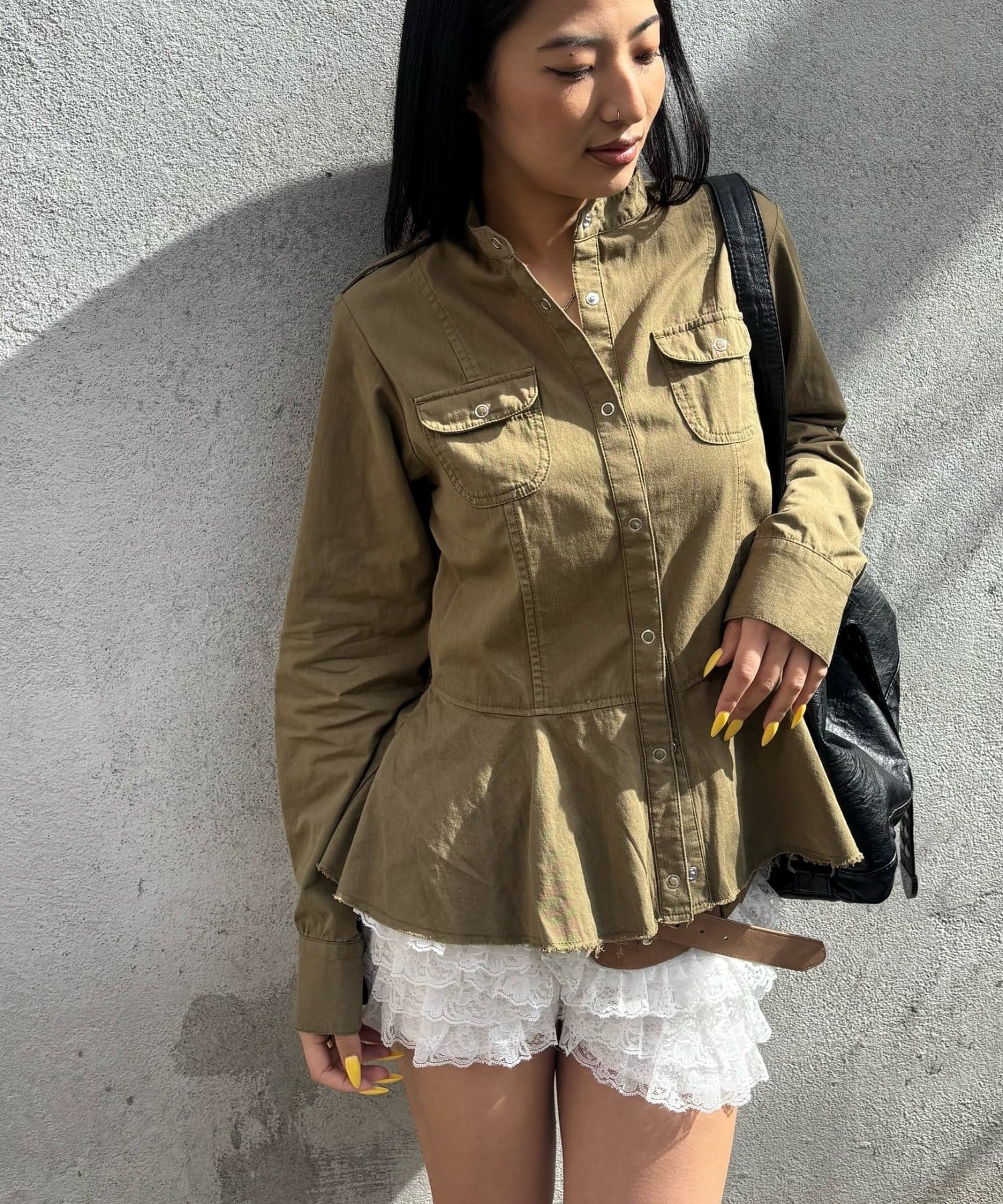 ミリタリー感とペプラムデザインで女性らしさもあるブラウス。