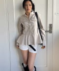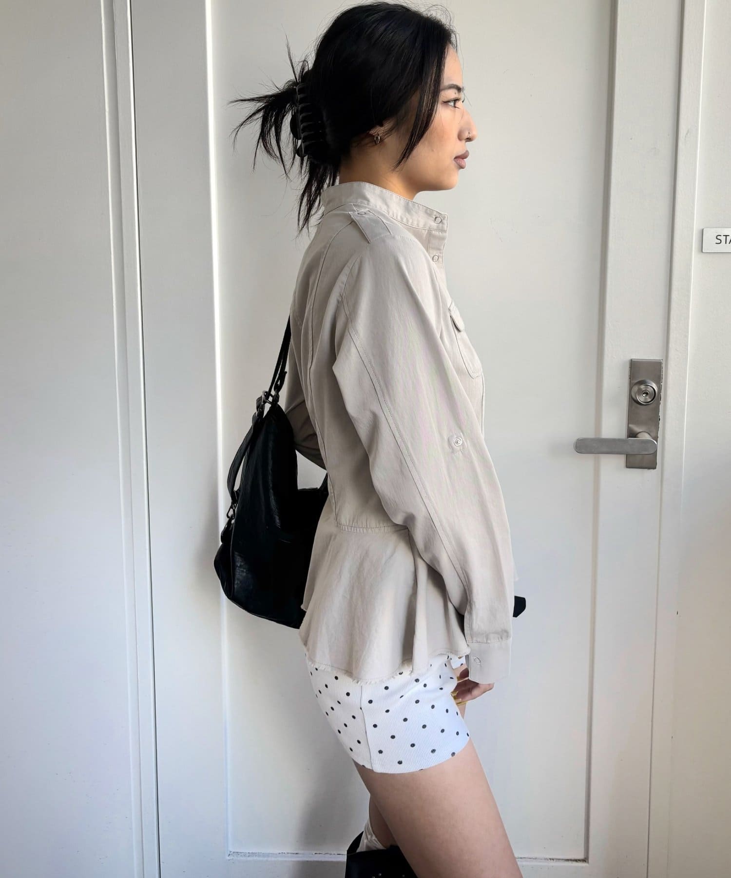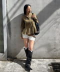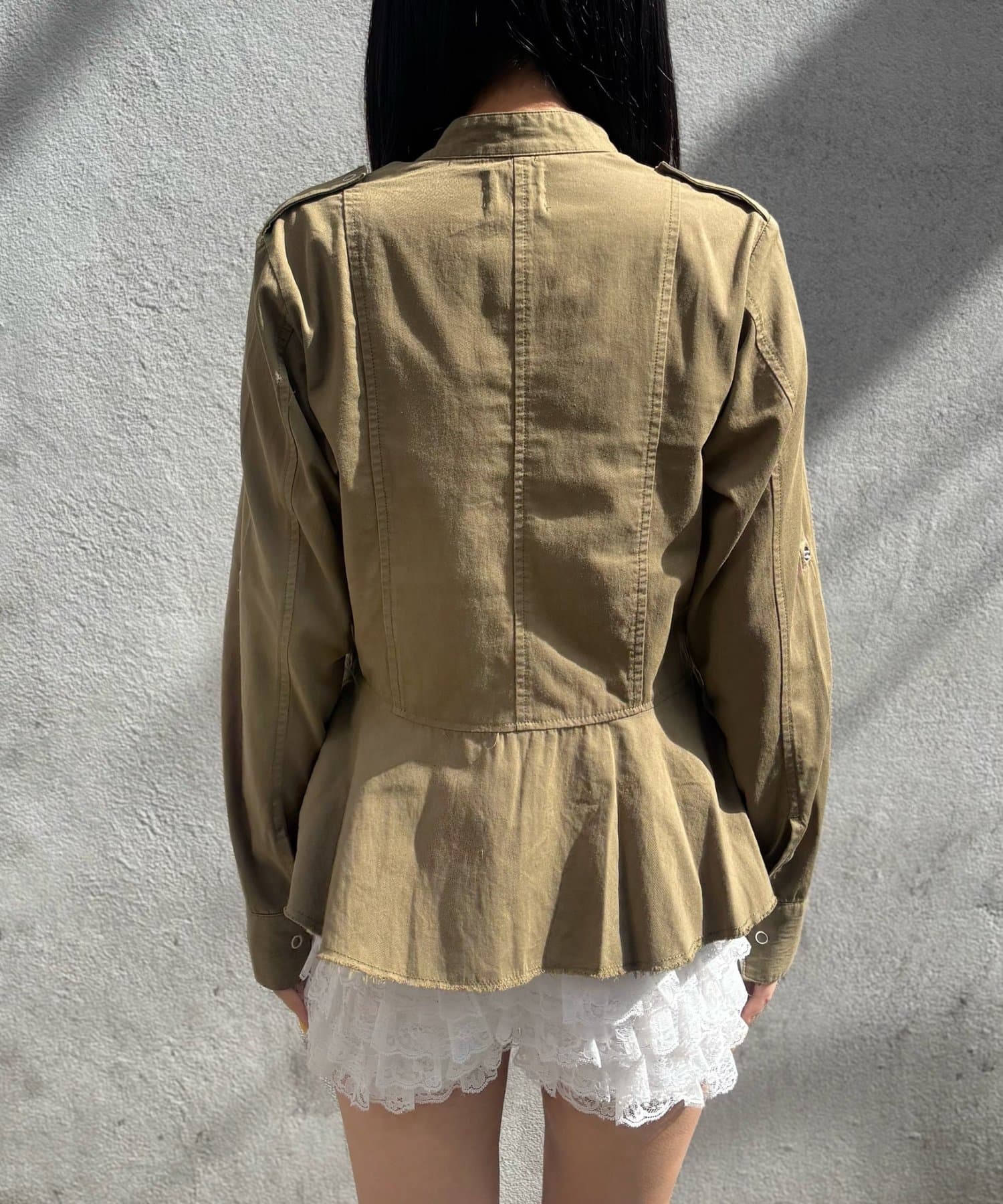 ・辛口なミリタリーデザインに、女性らしいペプラムシルエットを組み合わせることで、甘辛ミックスな着こなし!
