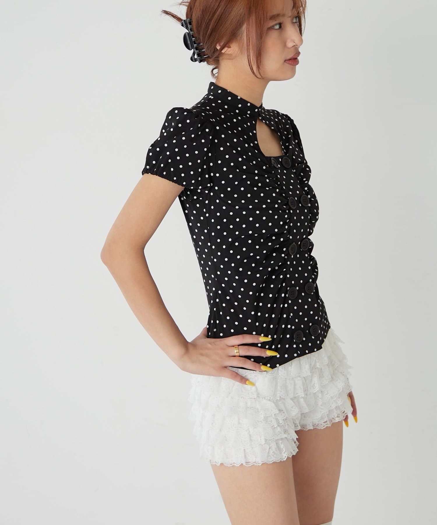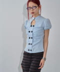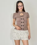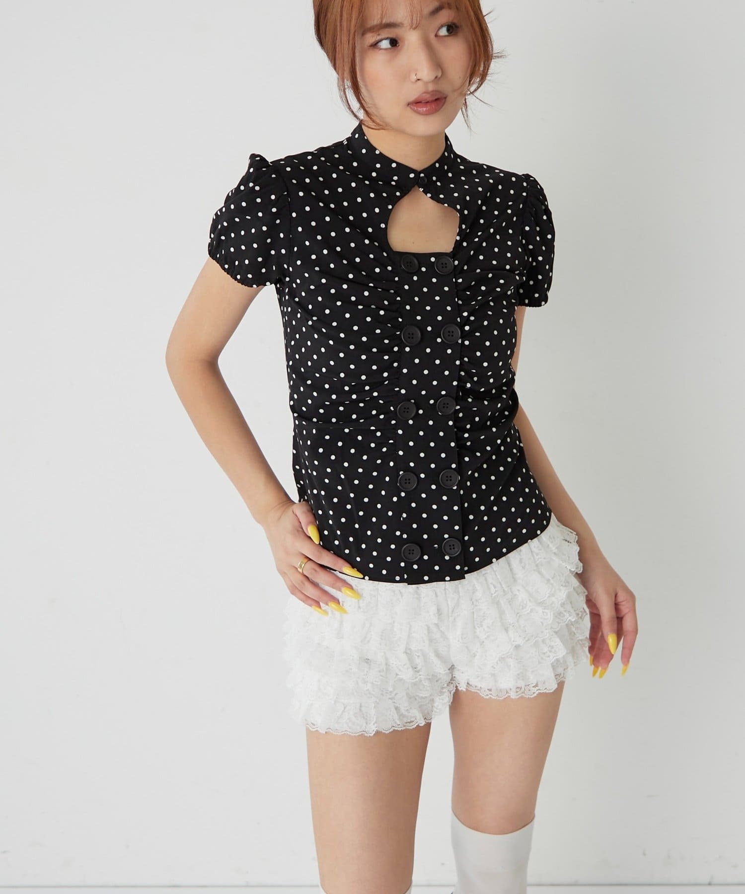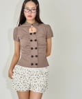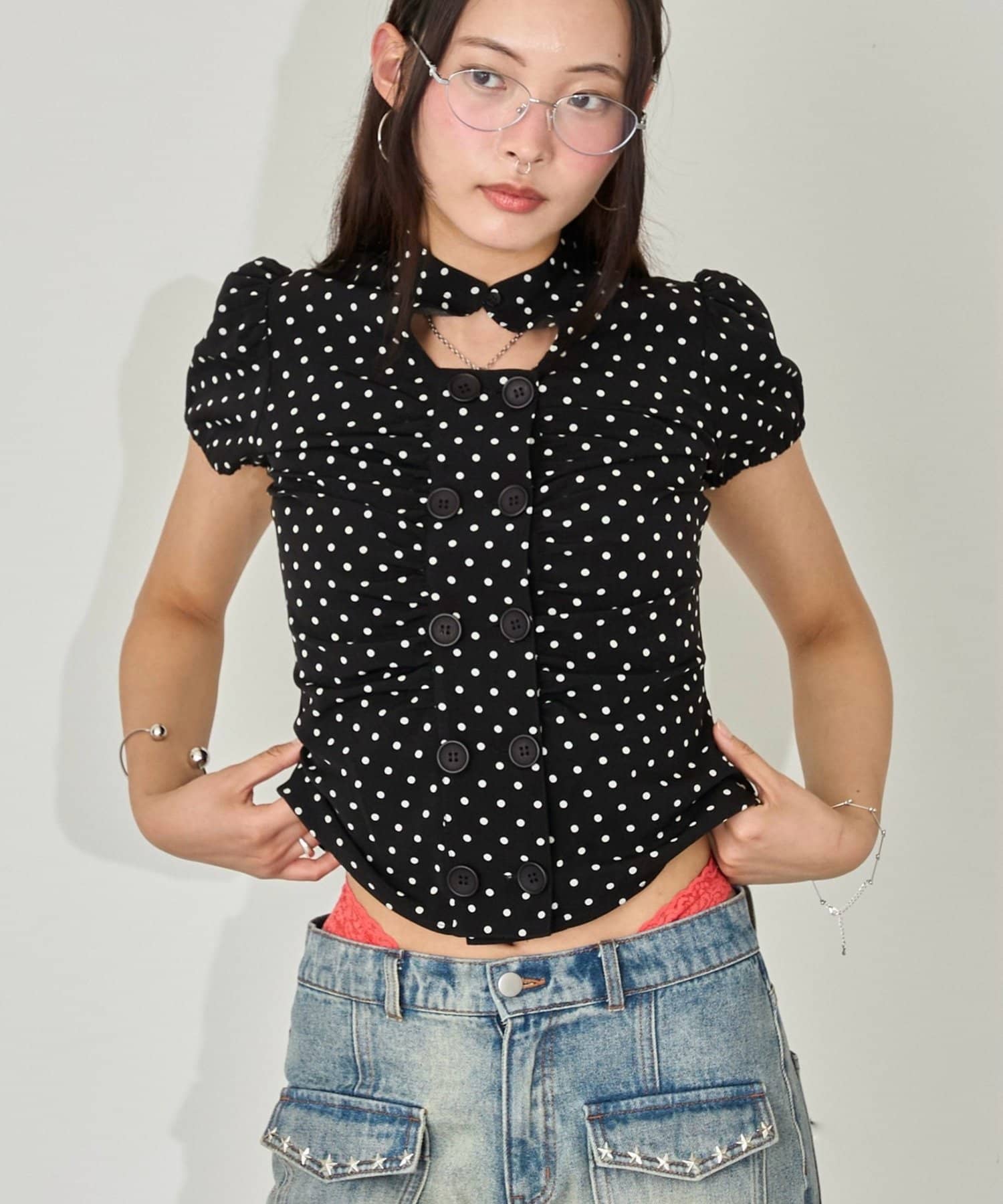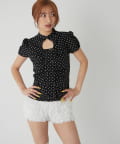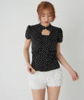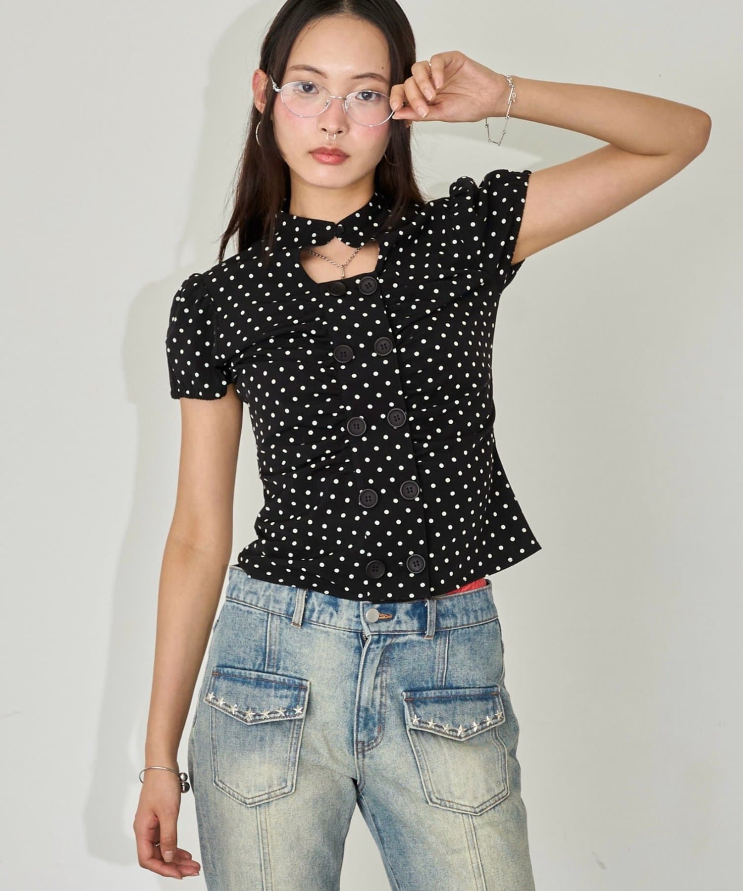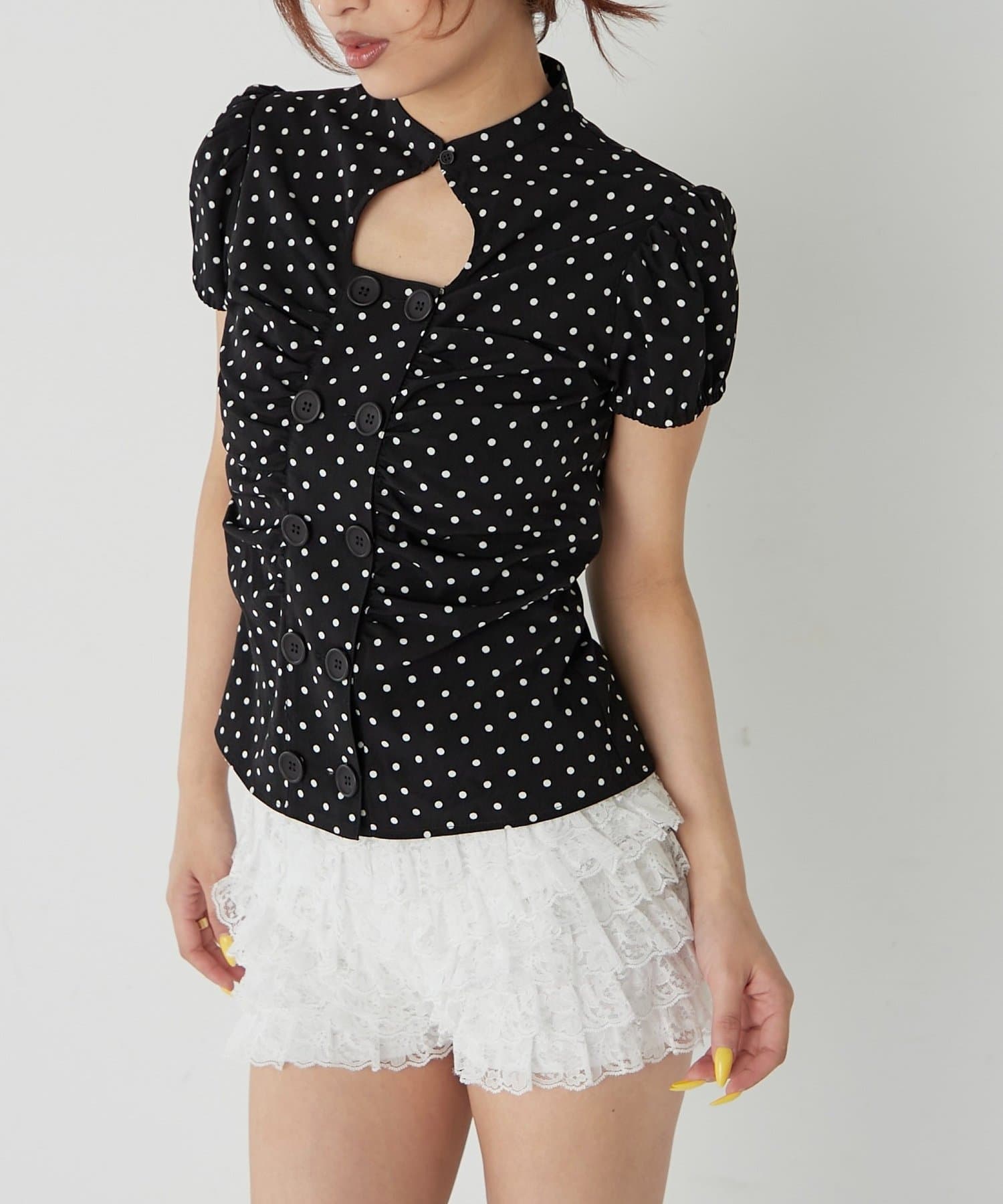 Wボタンギャザーブラウス(ドット柄・無地)